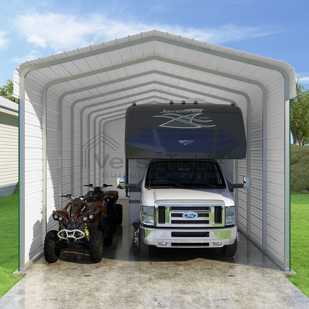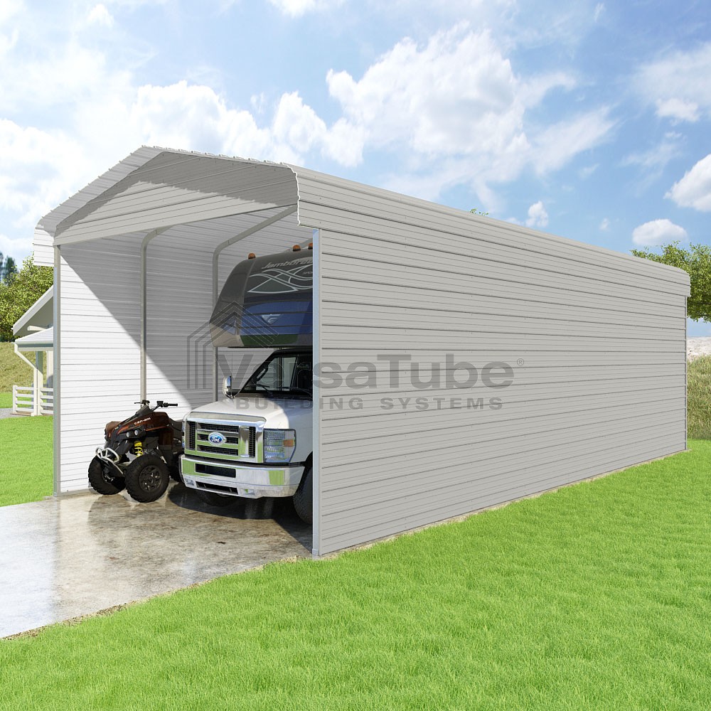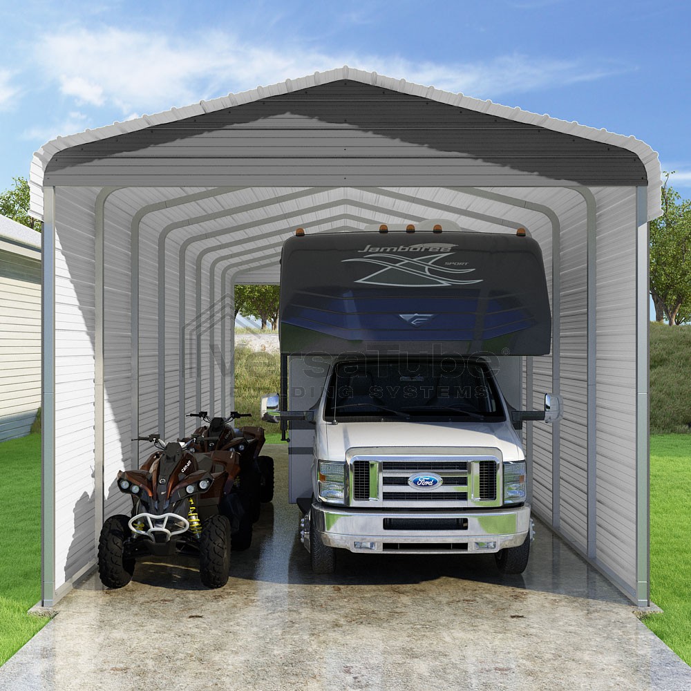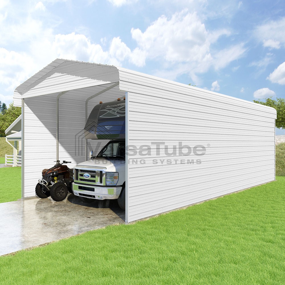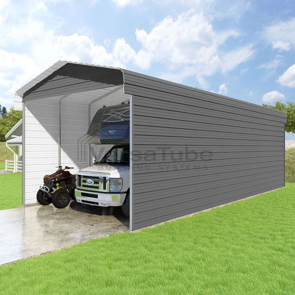 Classic Series DIY carport kit features horizontal application of sheet metal panels with the extra protection of rounded eaves.