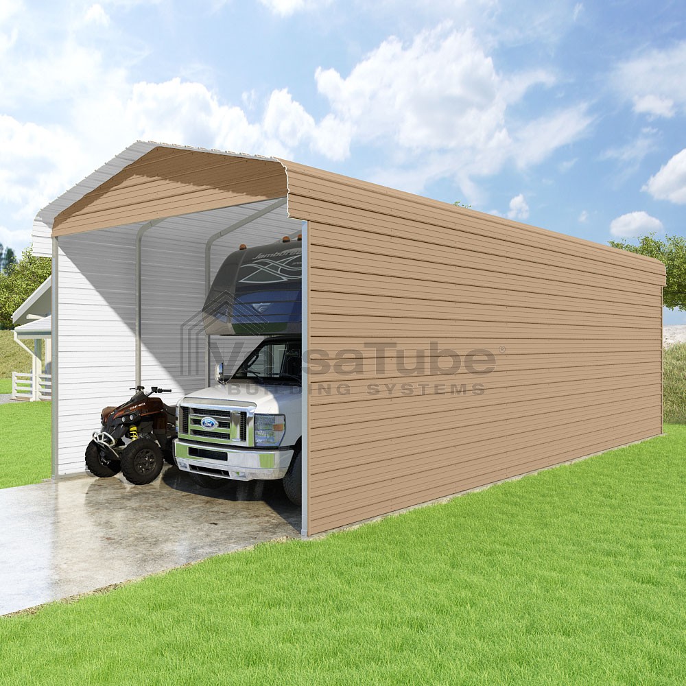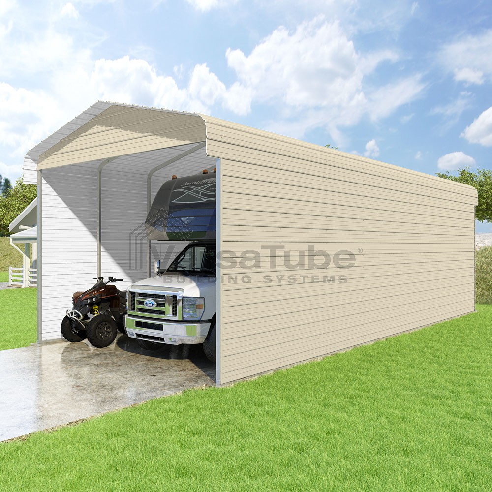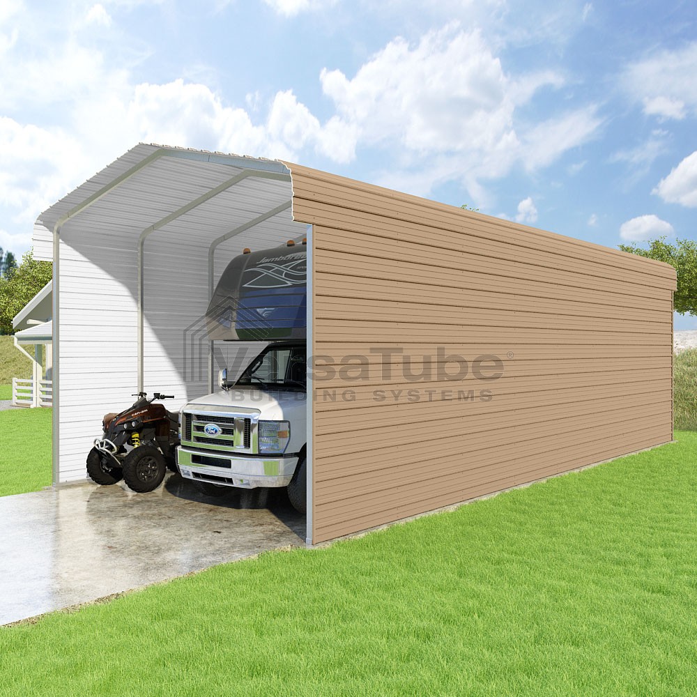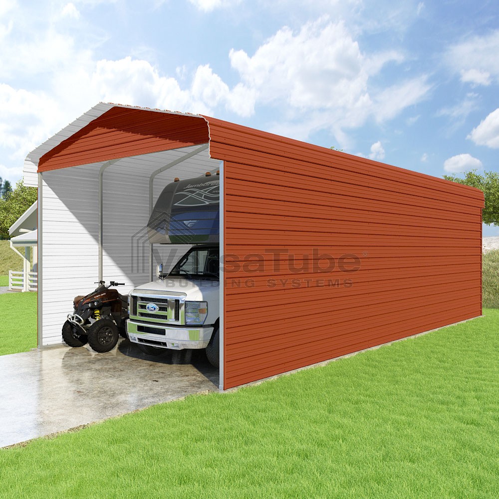 Classic Series DIY carport kit features horizontal application of sheet metal panels with the extra protection of rounded eaves.