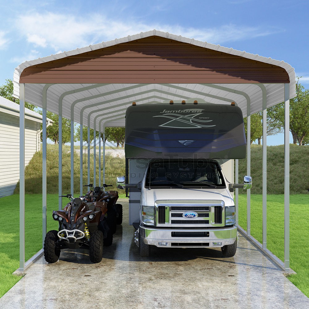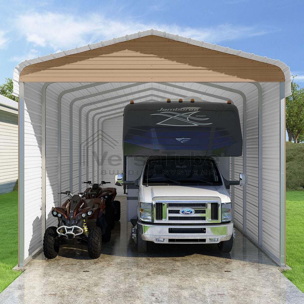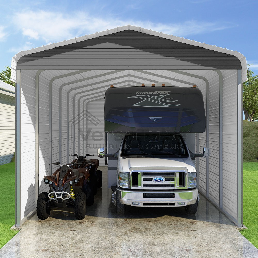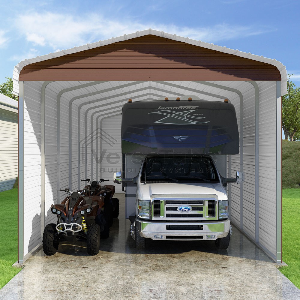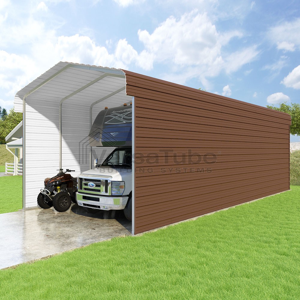 Classic Series DIY carport kit features horizontal application of sheet metal panels with the extra protection of rounded eaves.