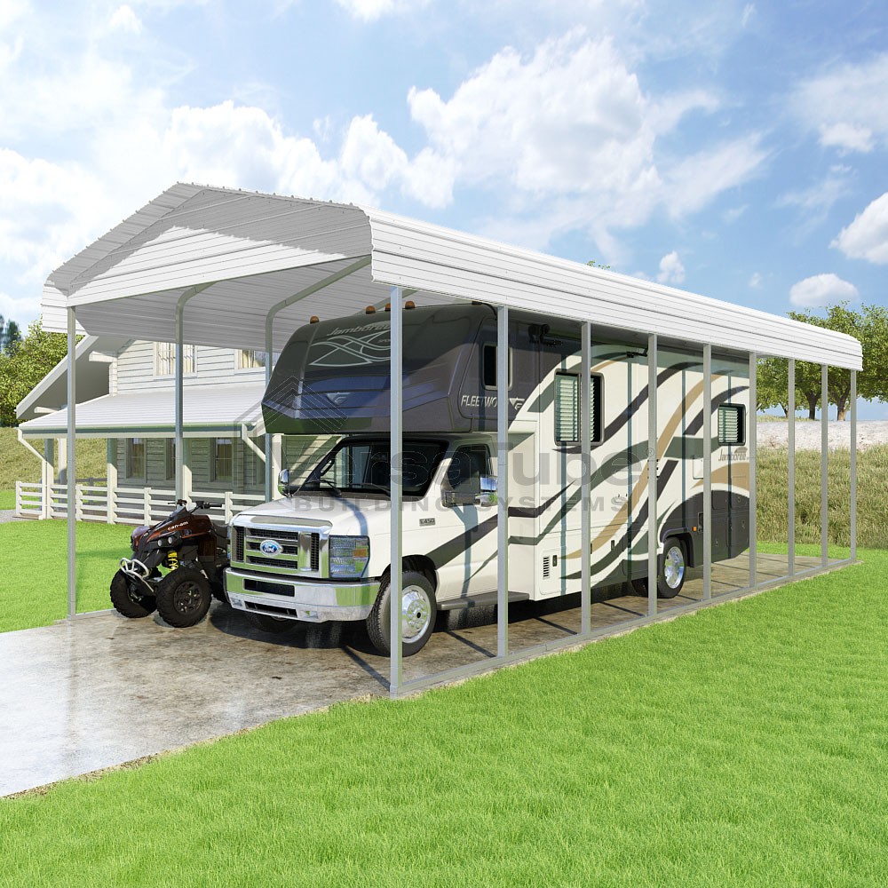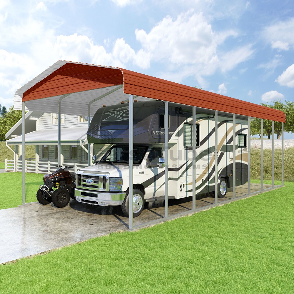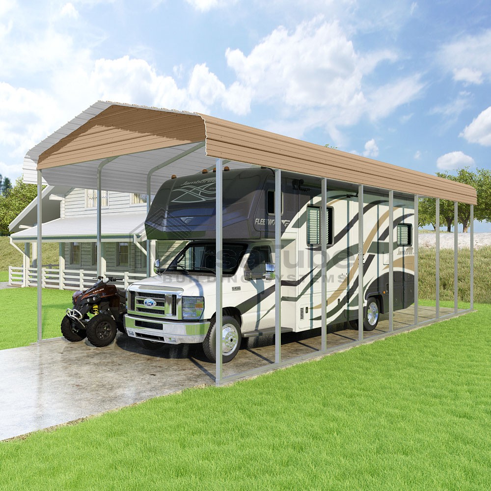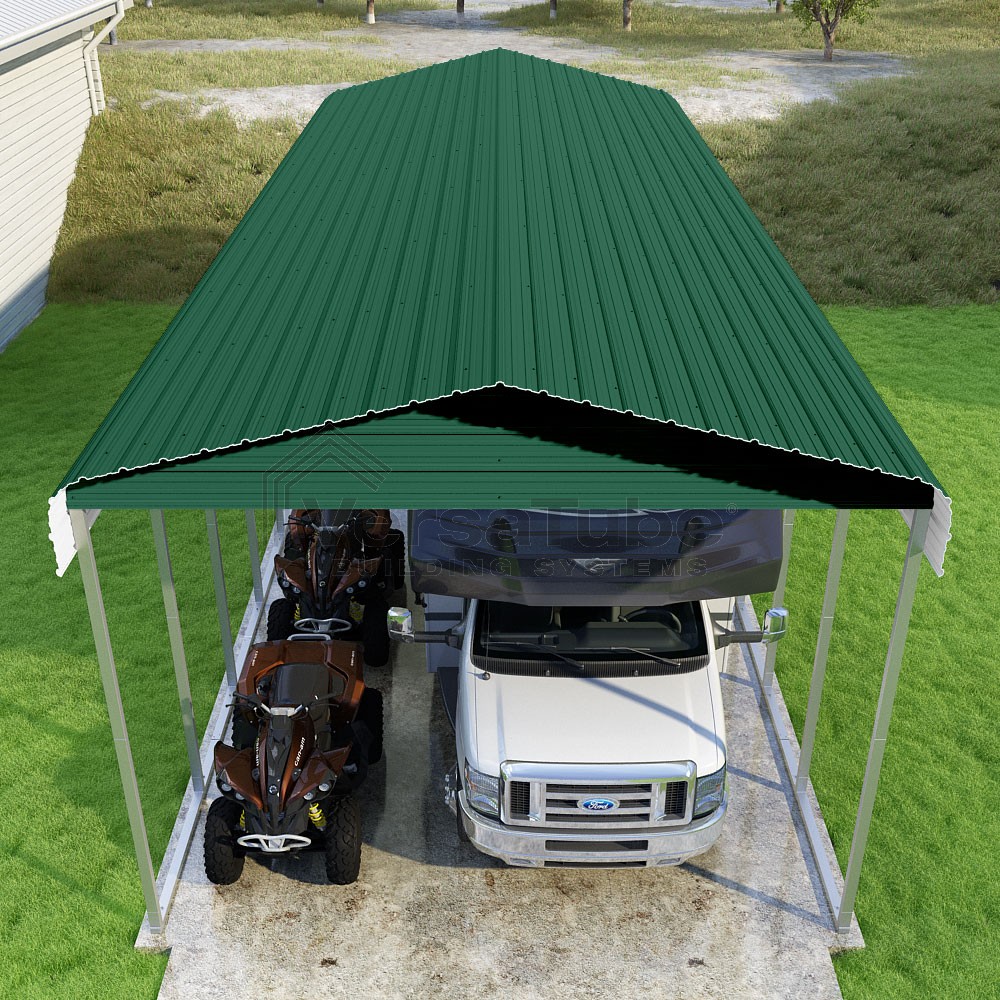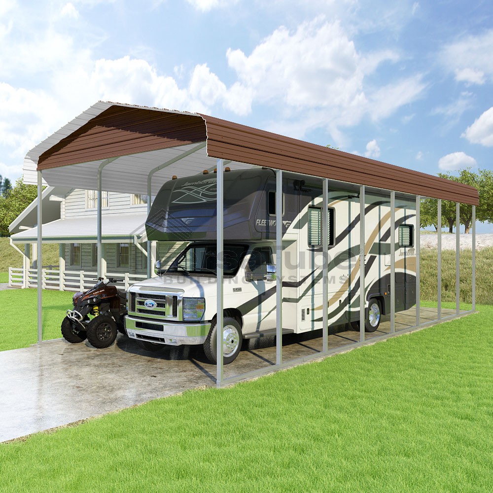 Classic Series DIY carport kit features horizontal application of sheet metal panels with the extra protection of rounded eaves.