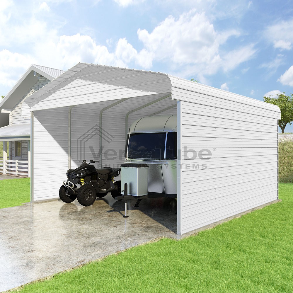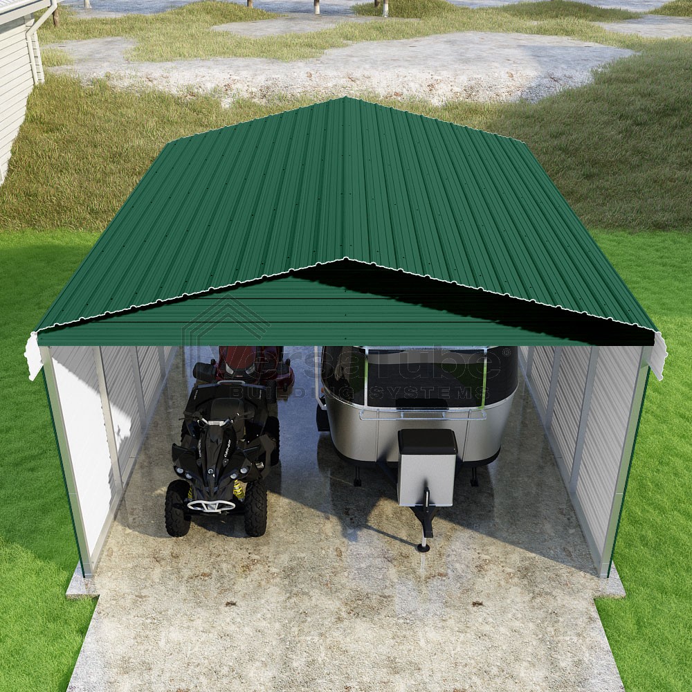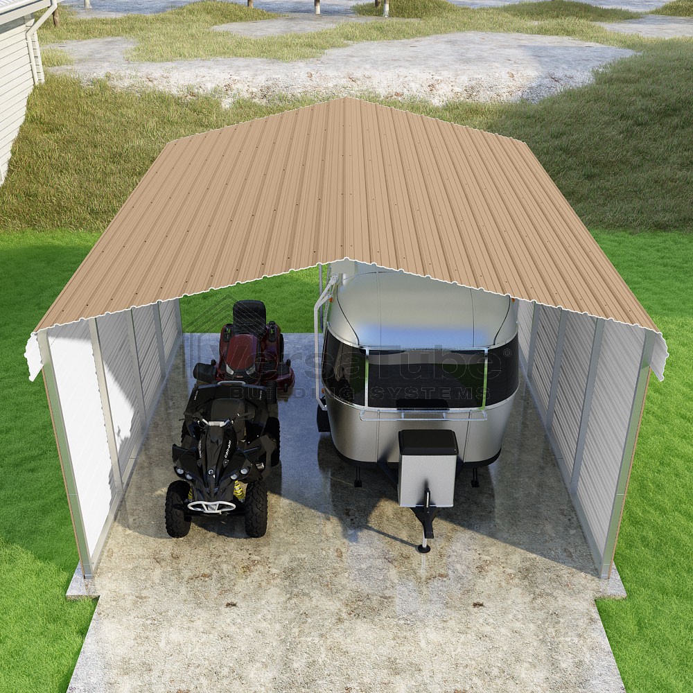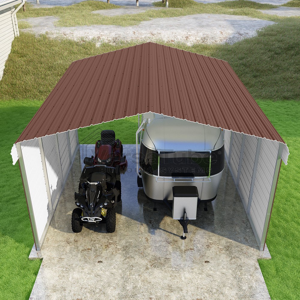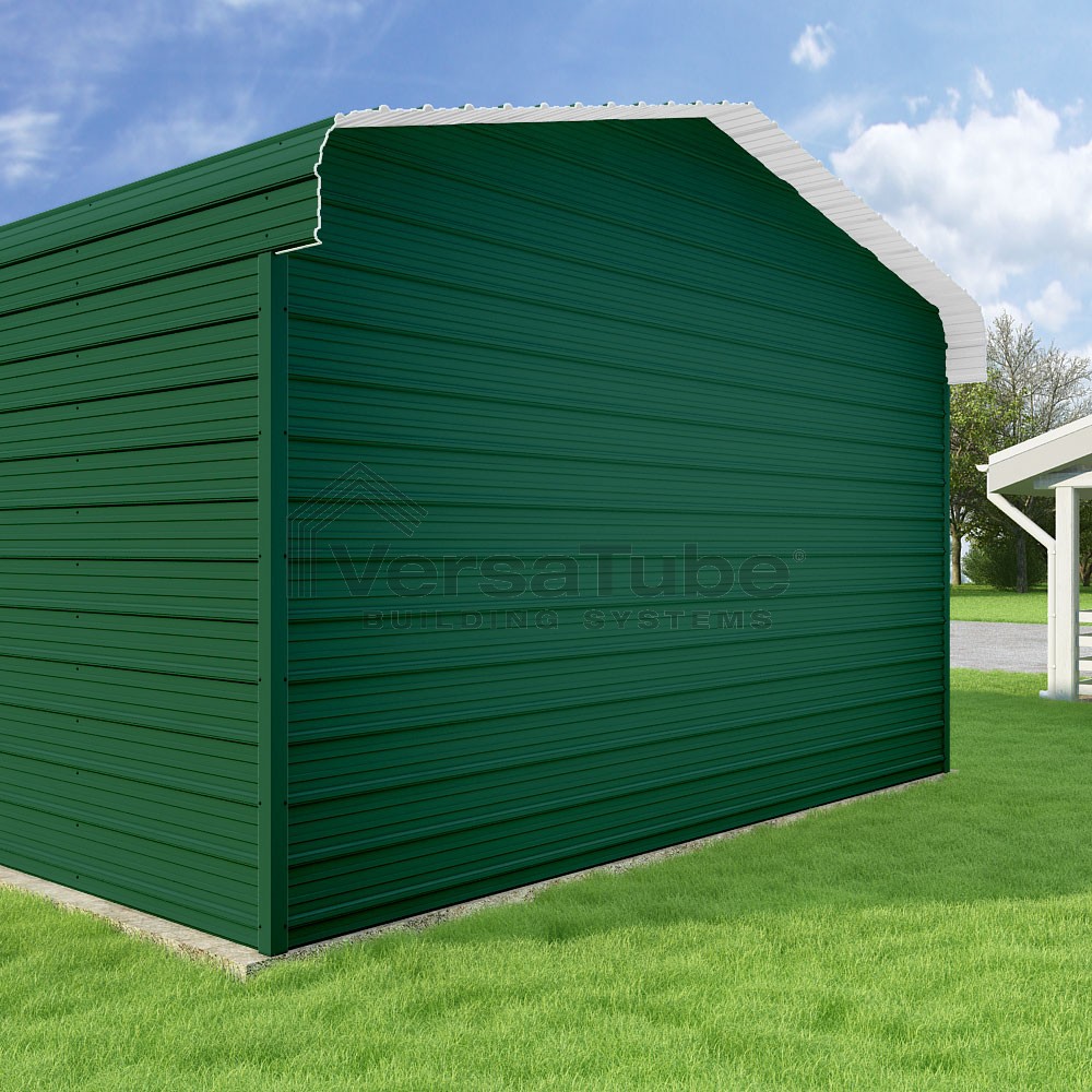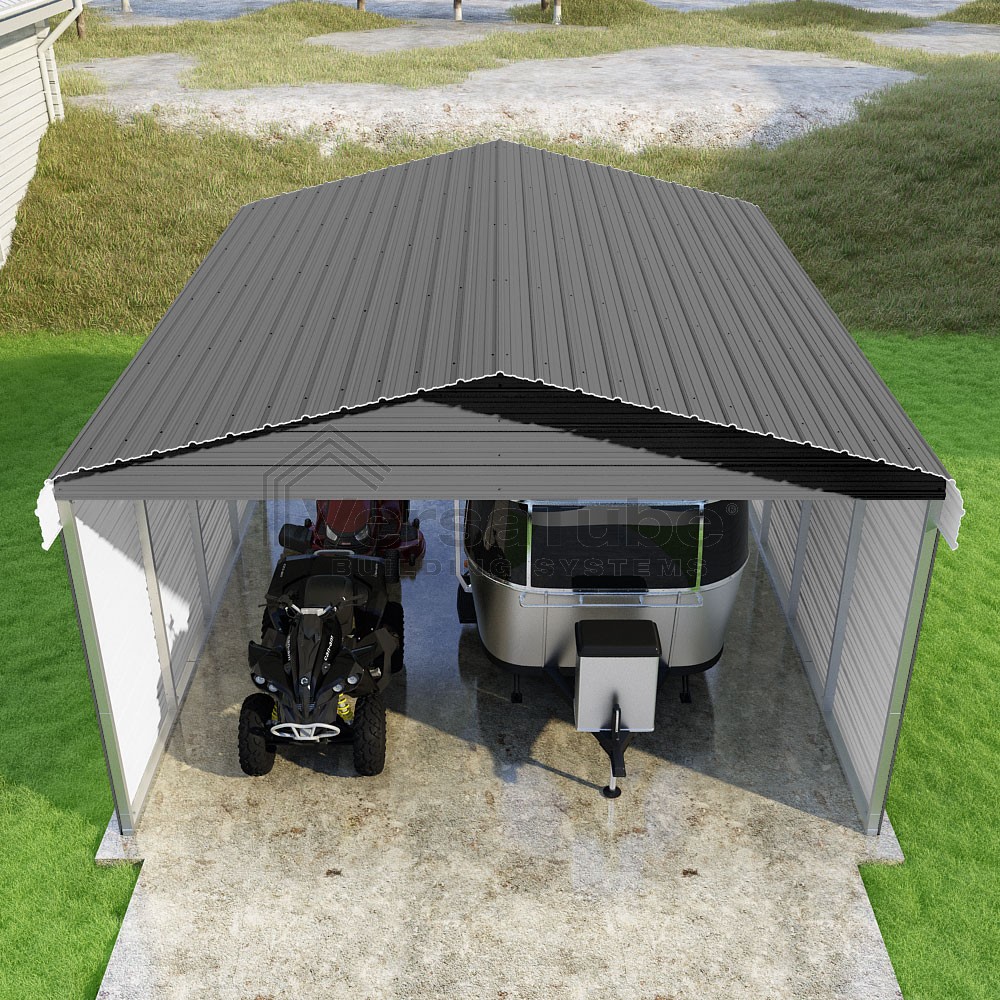 Classic Series DIY carport kit features horizontal application of sheet metal panels with the extra protection of rounded eaves.