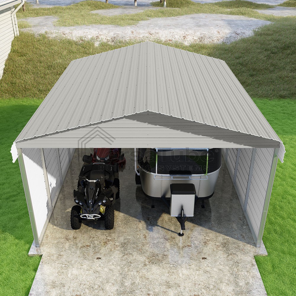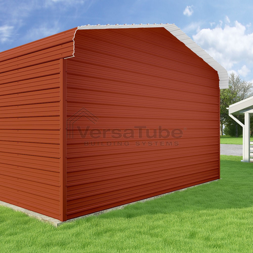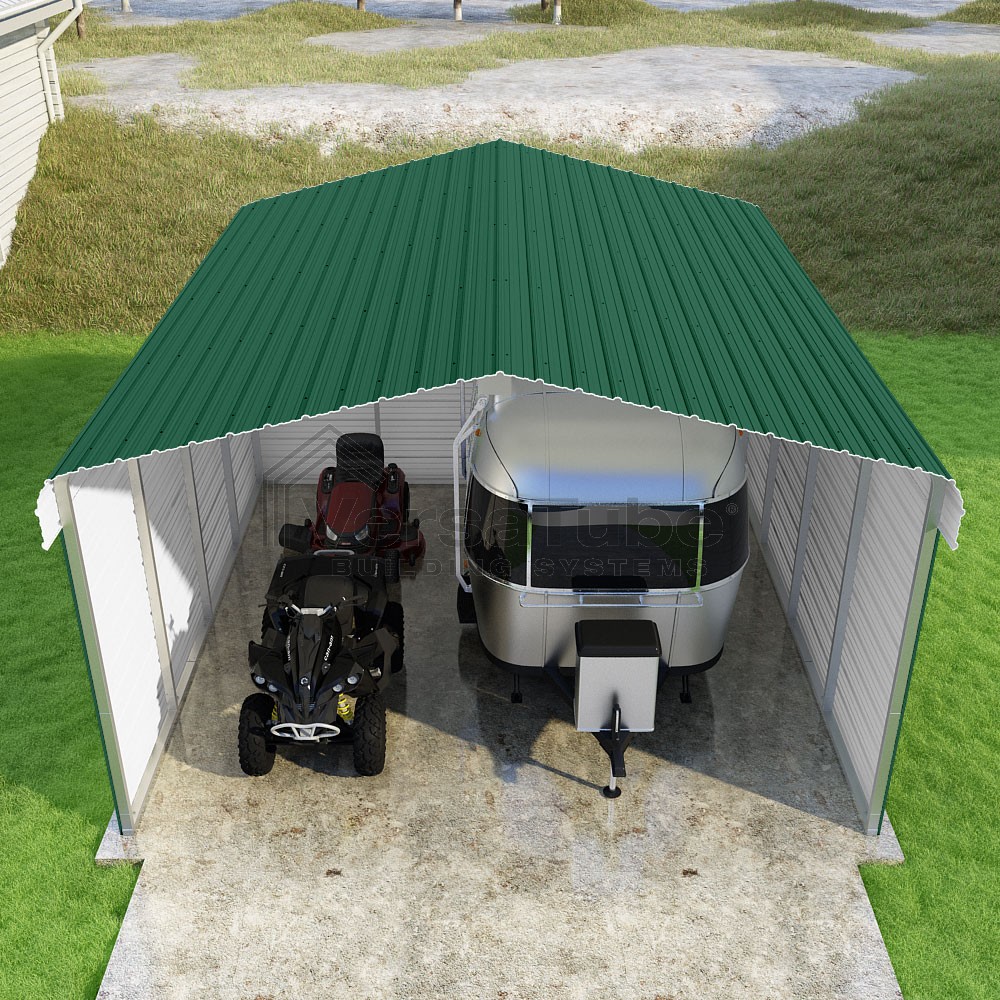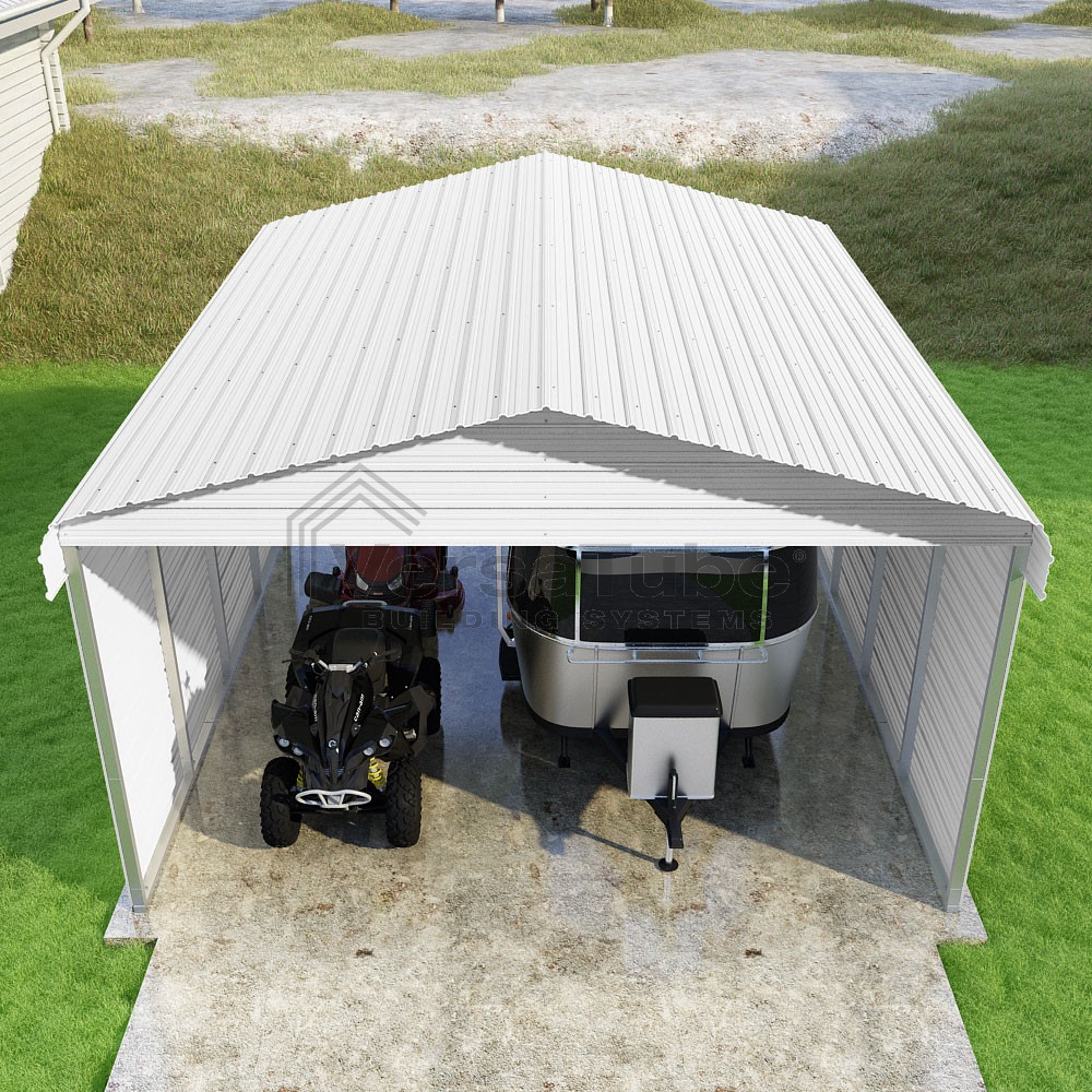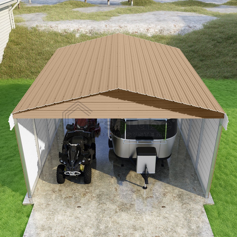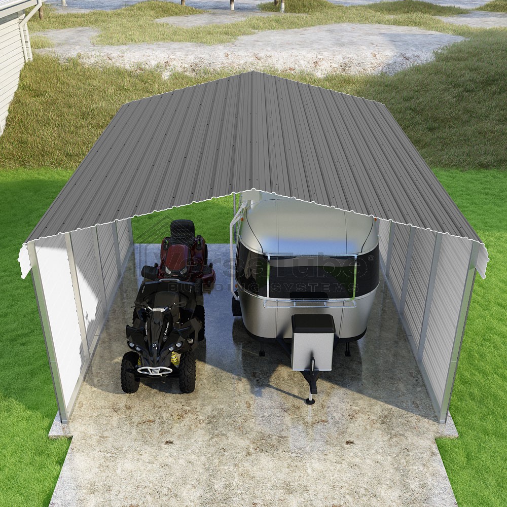 Classic Series DIY carport kit features horizontal application of sheet metal panels with the extra protection of rounded eaves.