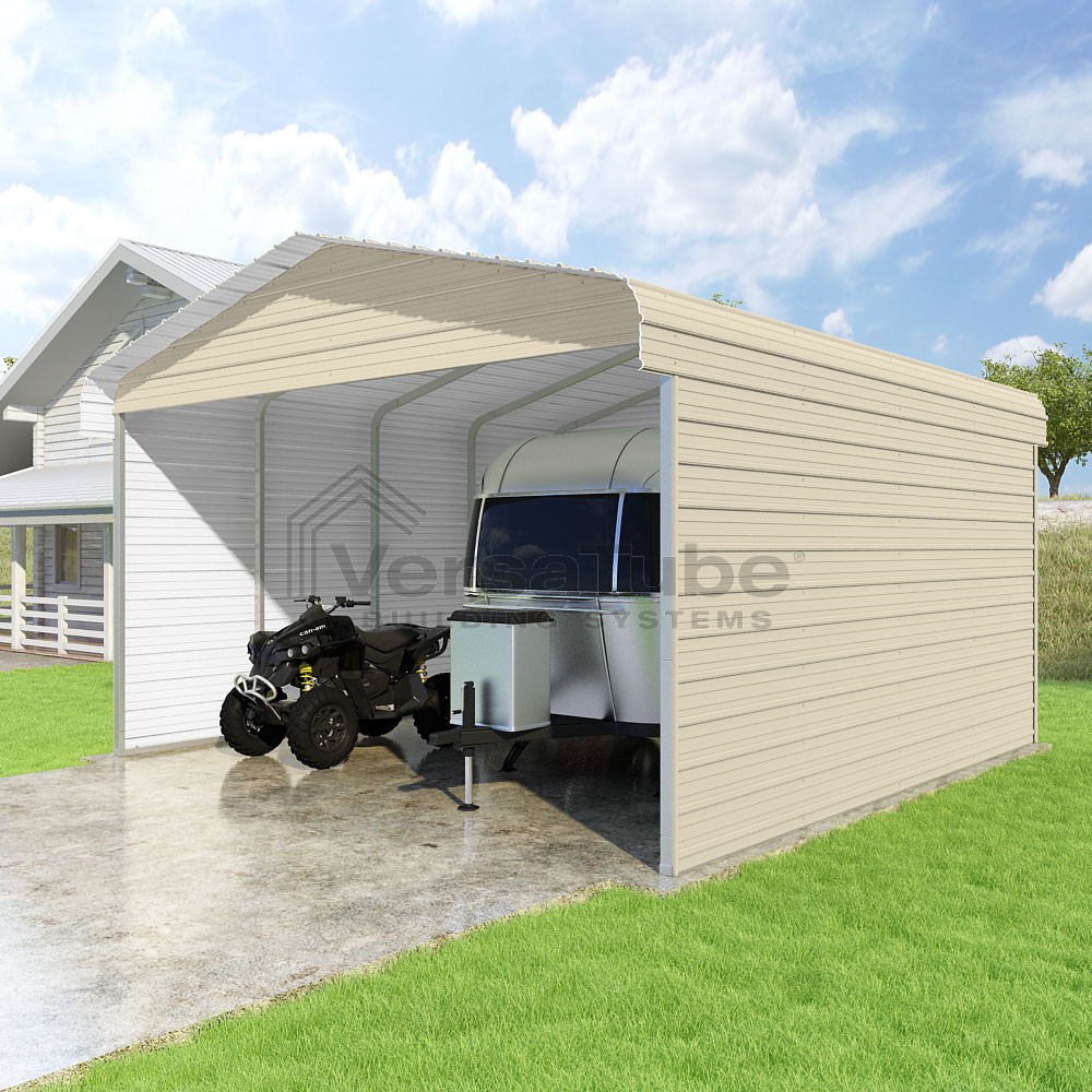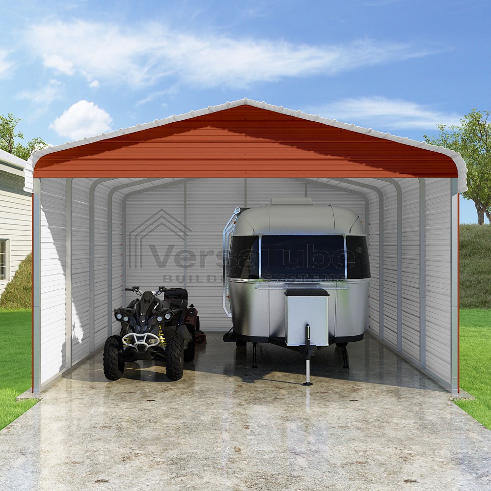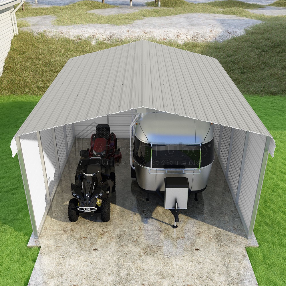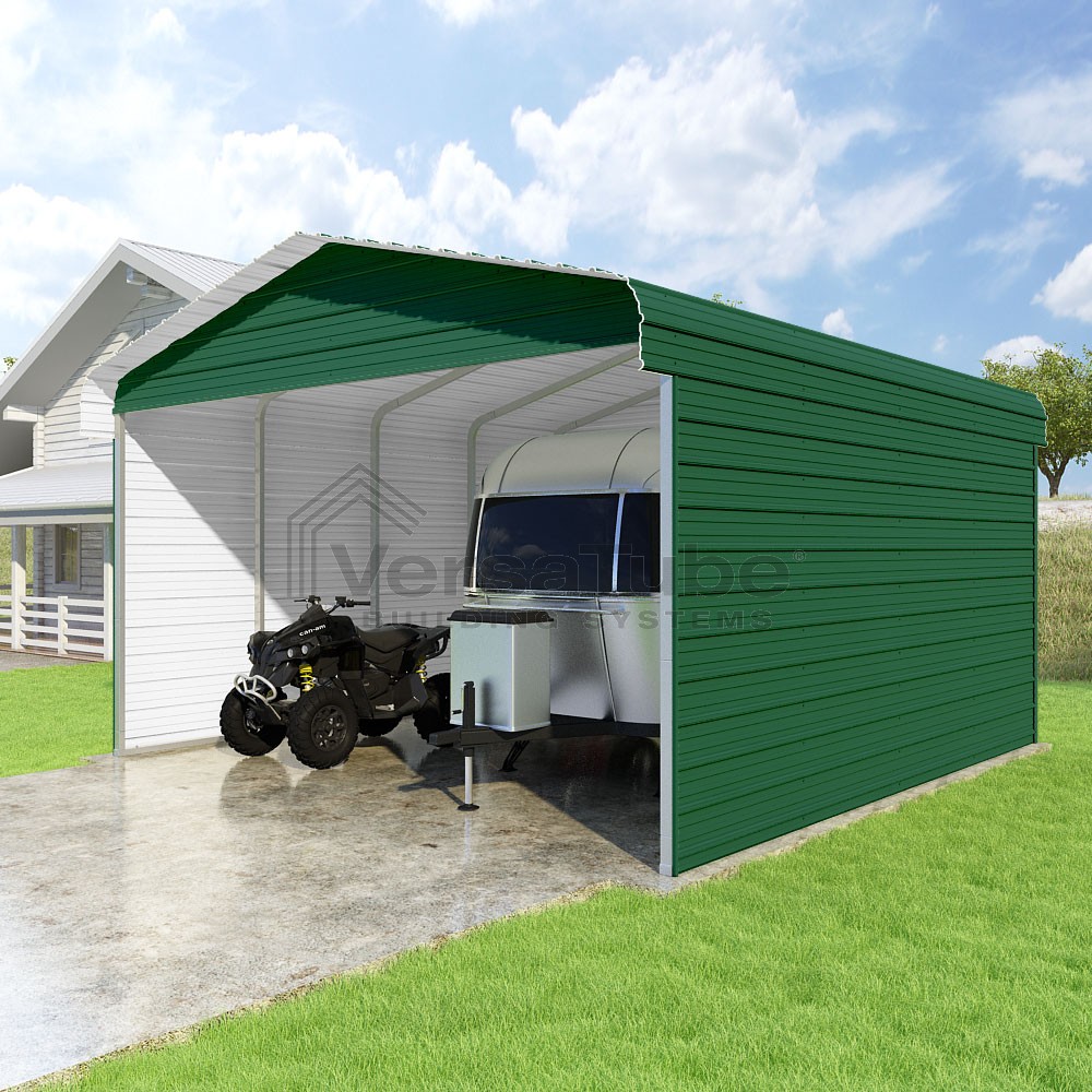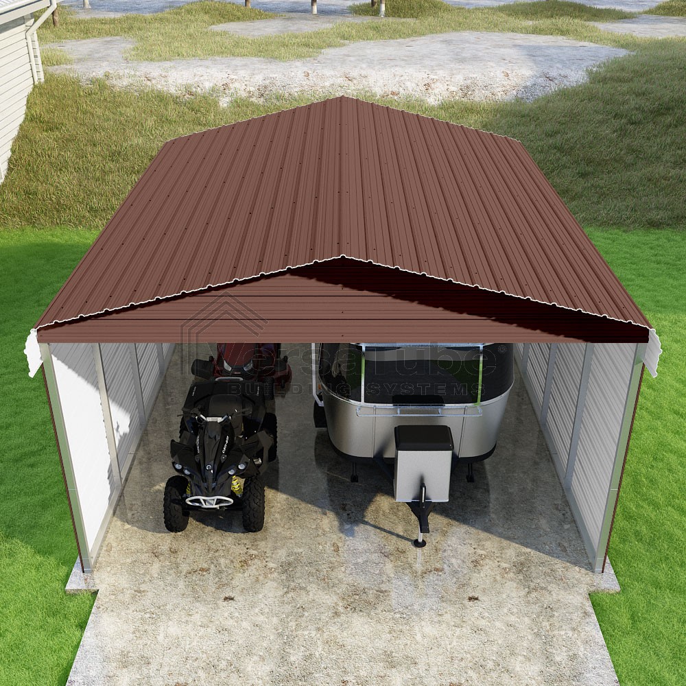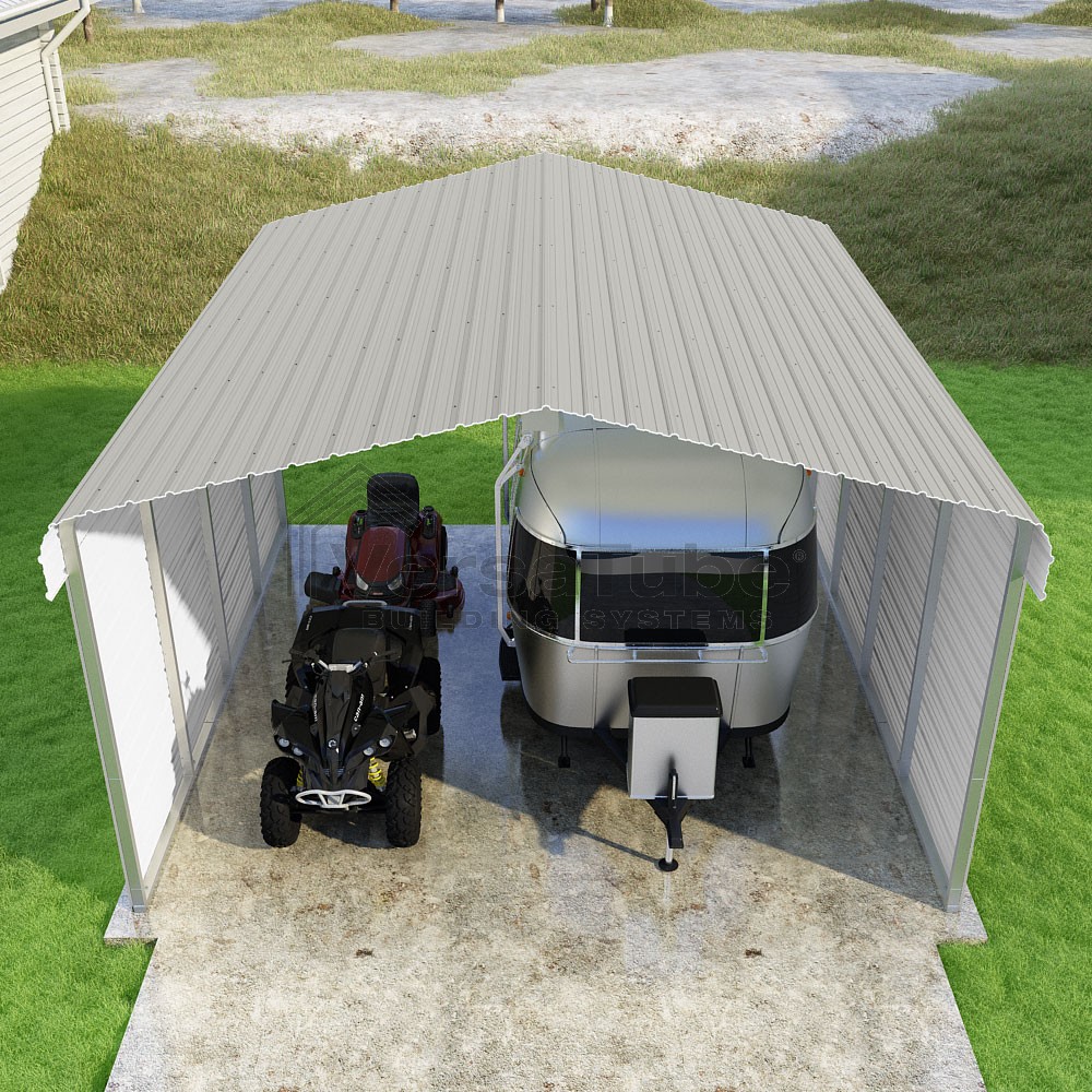 Classic Series DIY carport kit features horizontal application of sheet metal panels with the extra protection of rounded eaves.