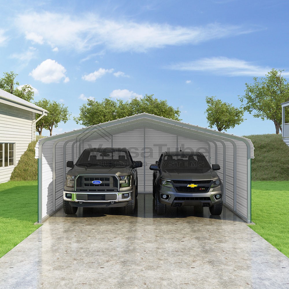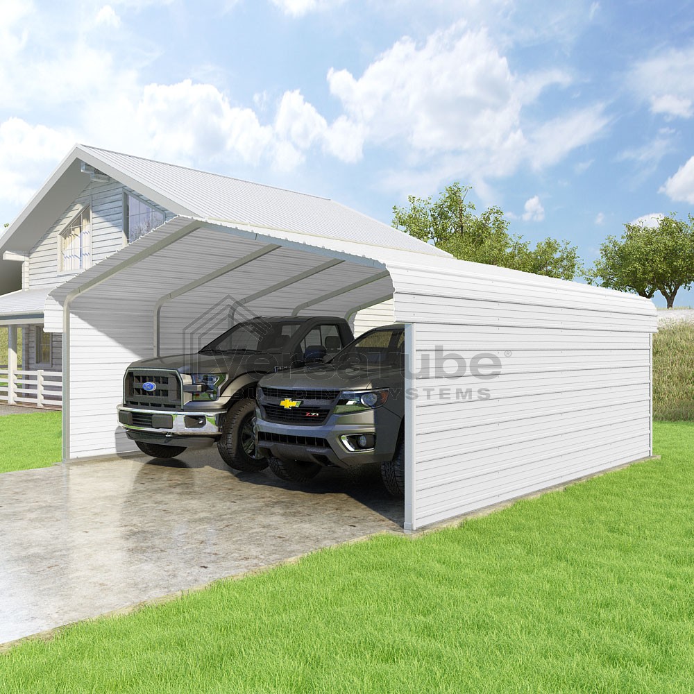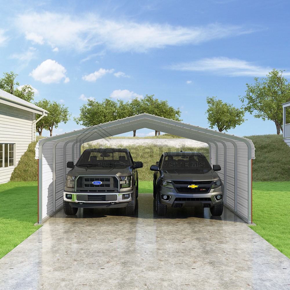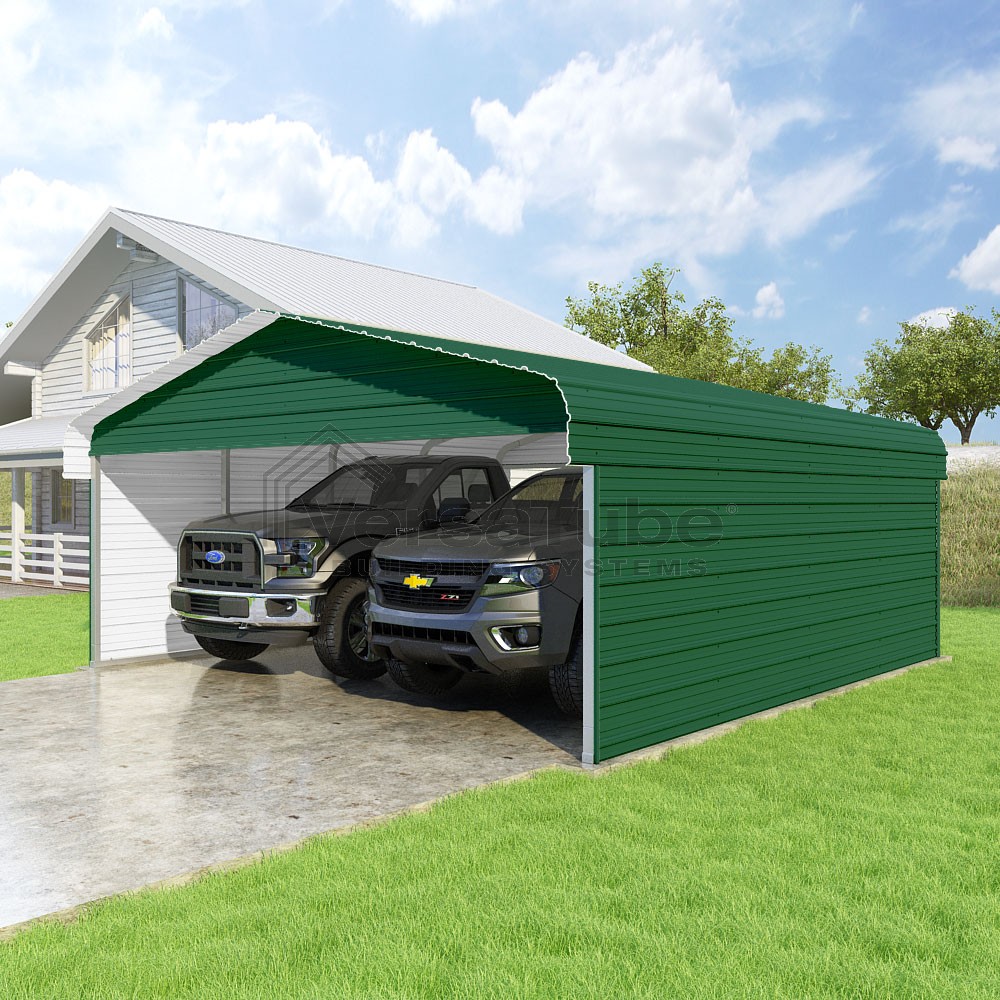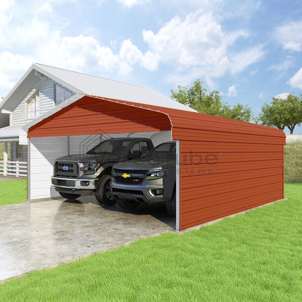 Classic Series DIY carport kit features horizontal application of sheet metal panels with the extra protection of rounded eaves.