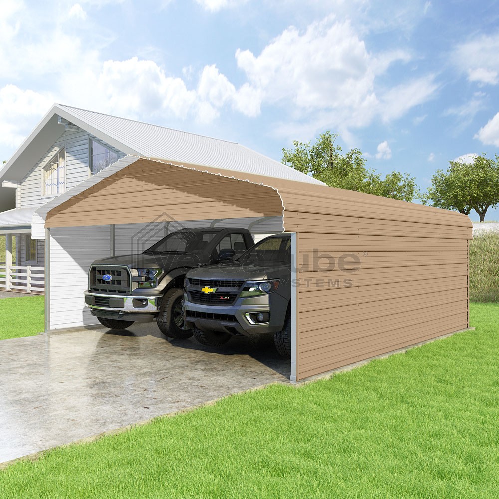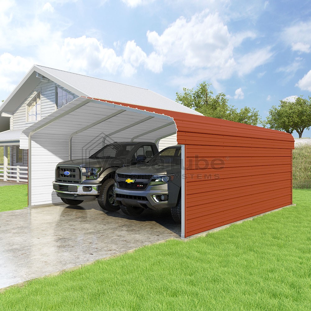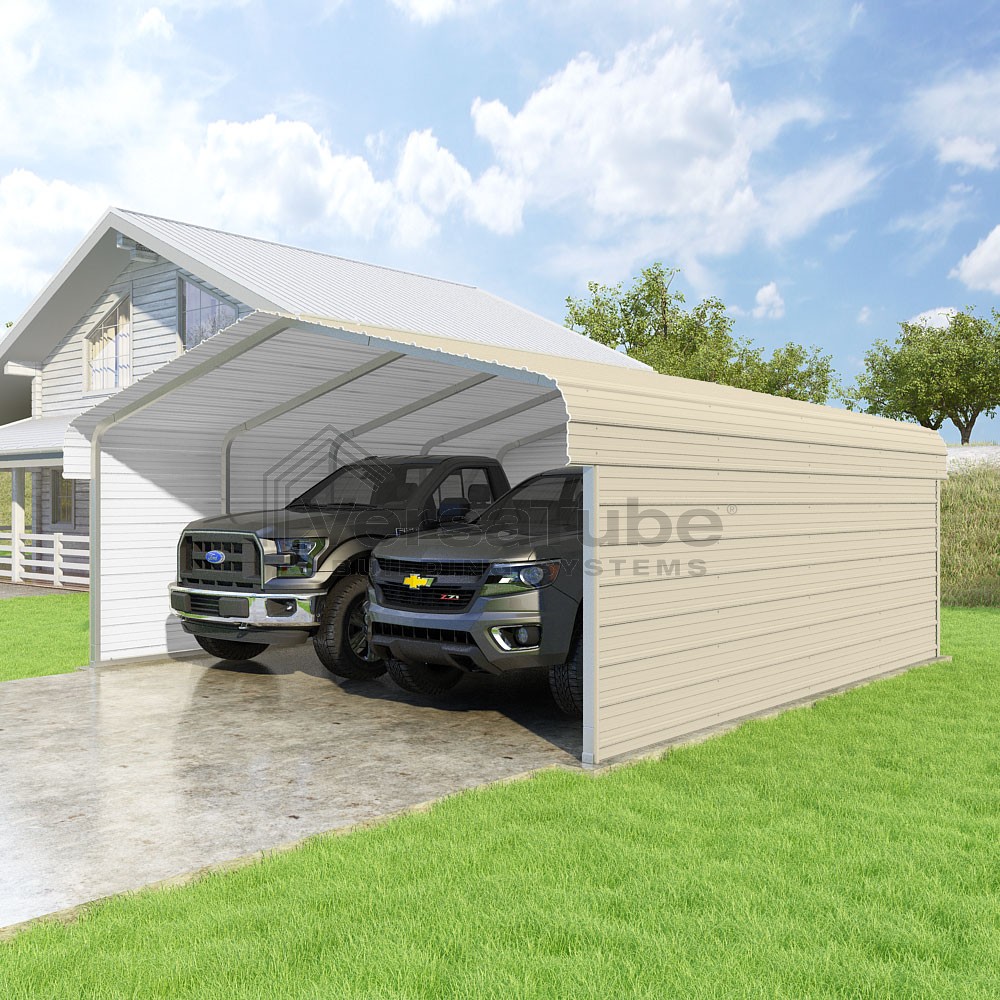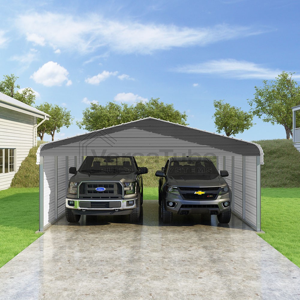 Classic Series DIY carport kit features horizontal application of sheet metal panels with the extra protection of rounded eaves.