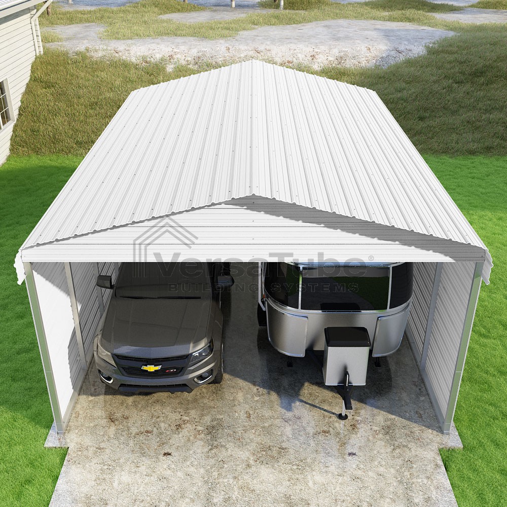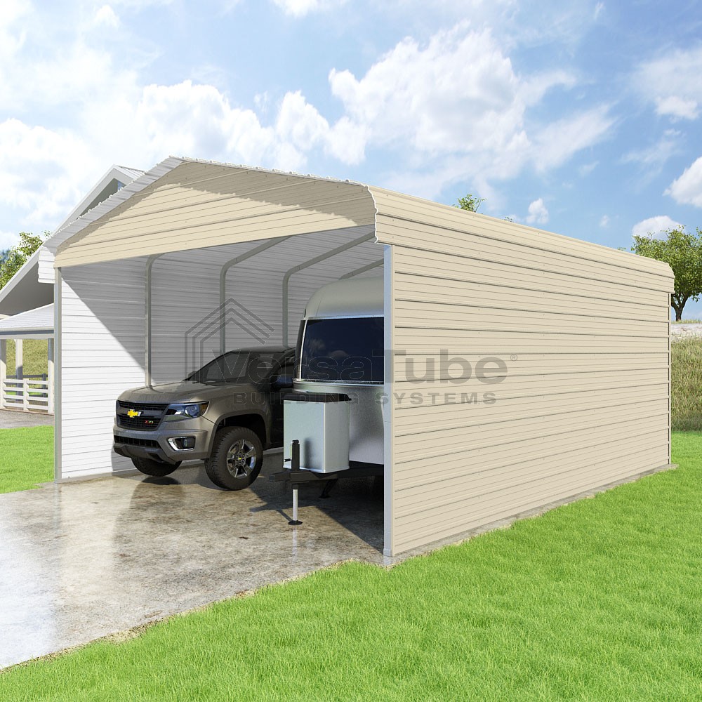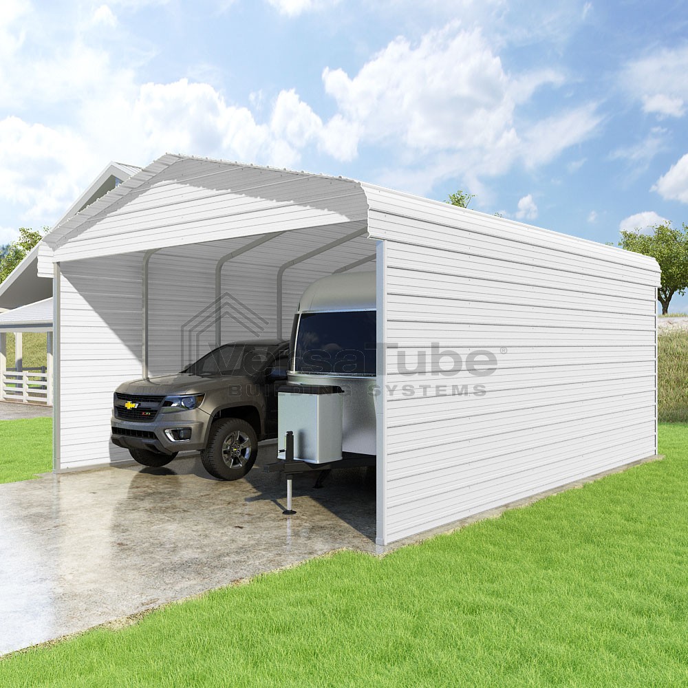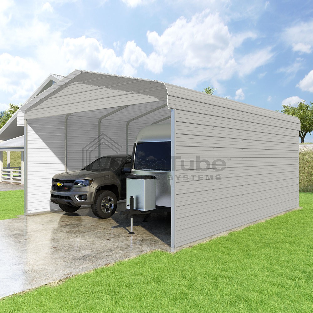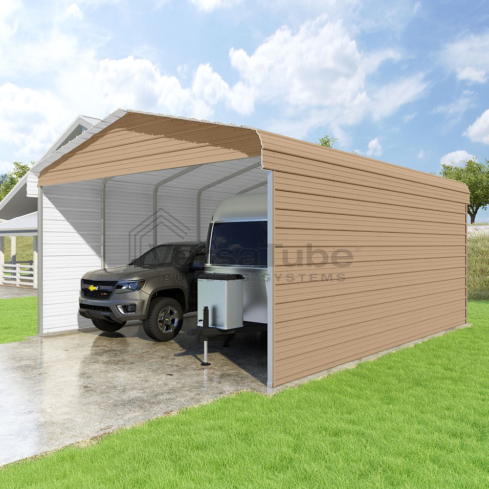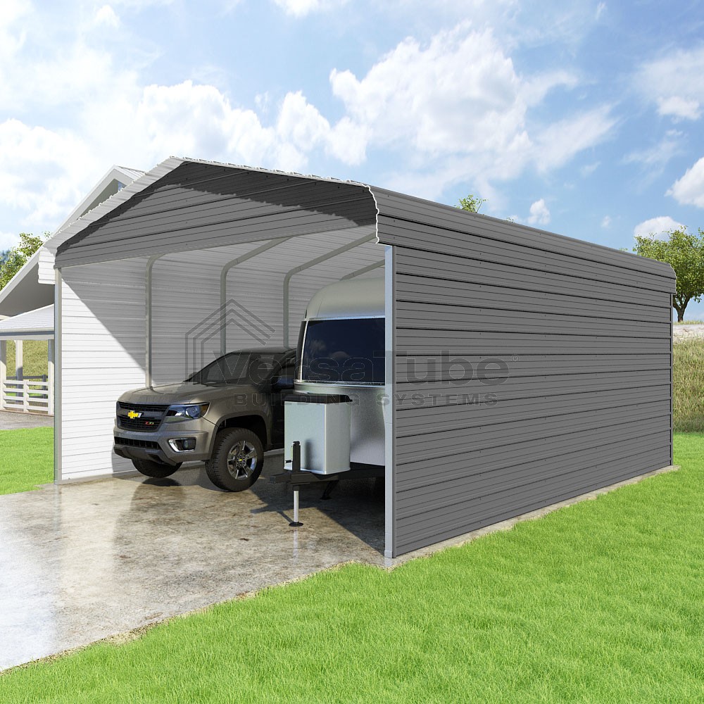 Classic Series DIY carport kit features horizontal application of sheet metal panels with the extra protection of rounded eaves.