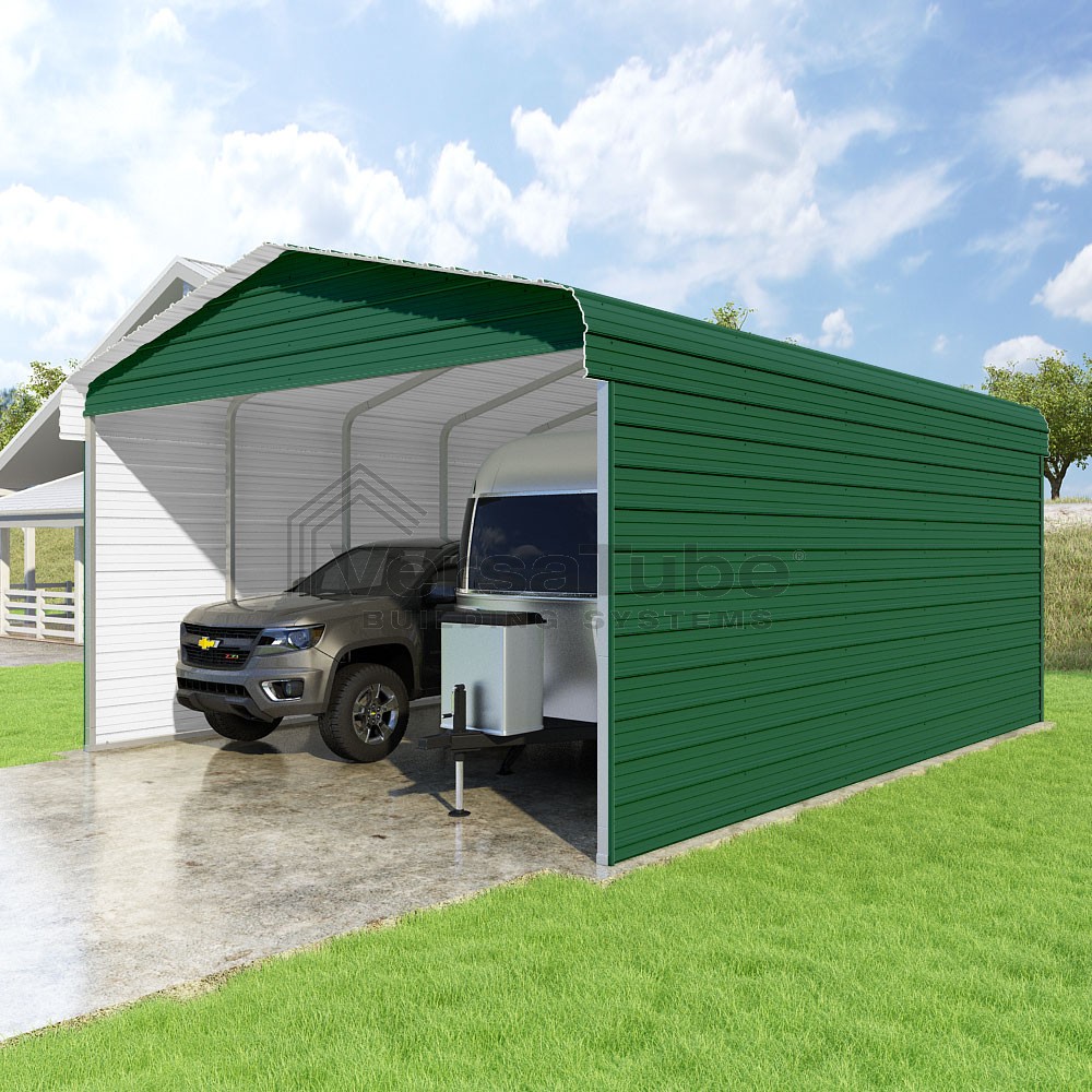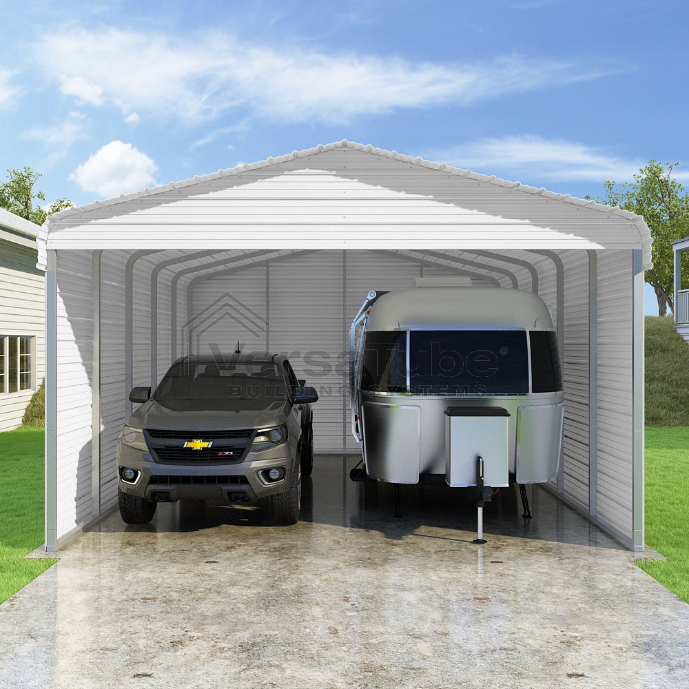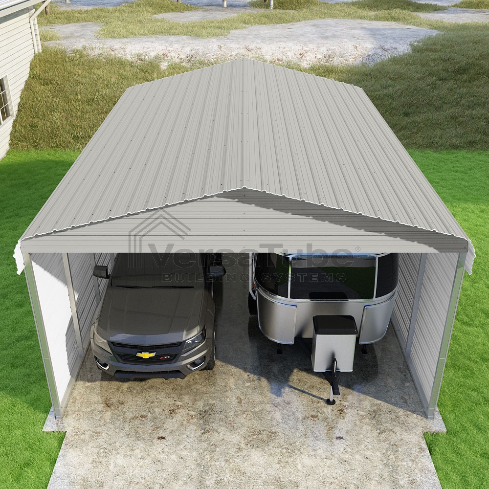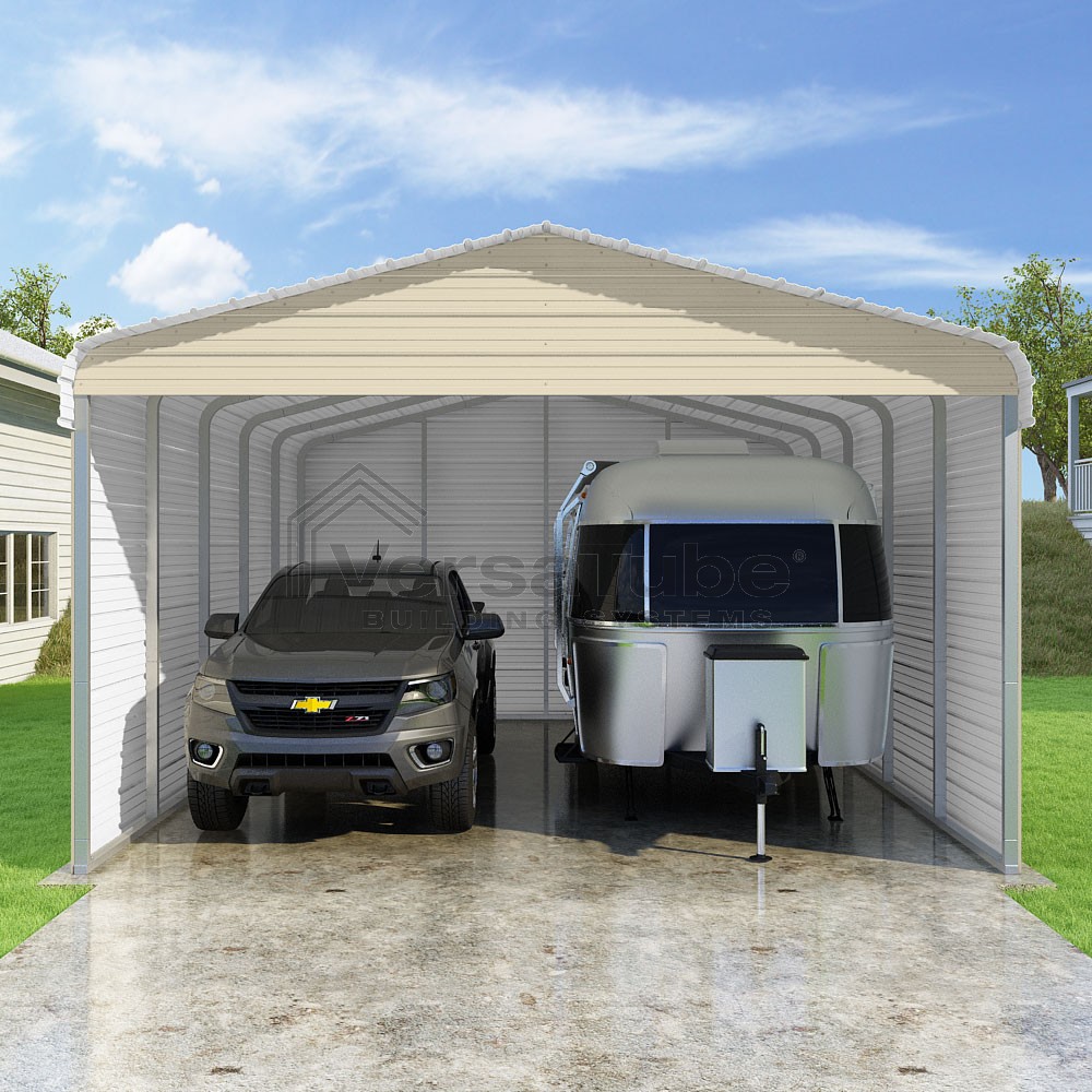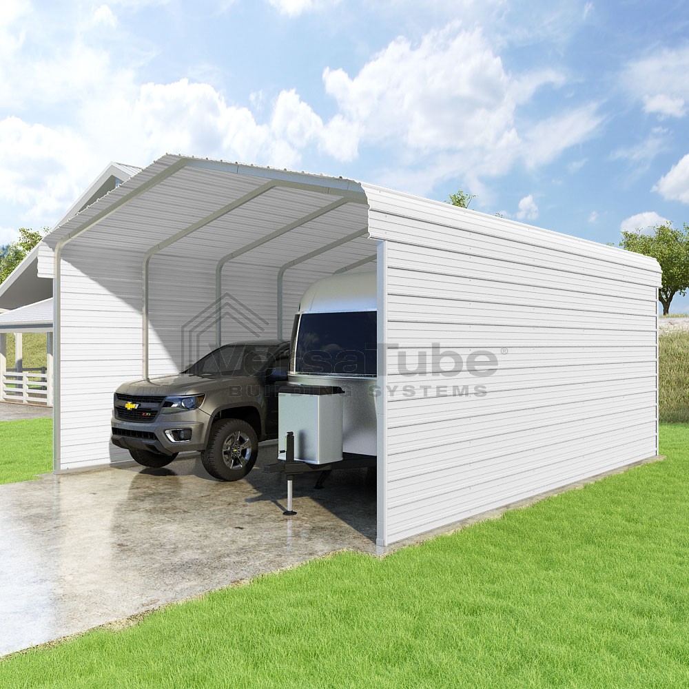 Classic Series DIY carport kit features horizontal application of sheet metal panels with the extra protection of rounded eaves.