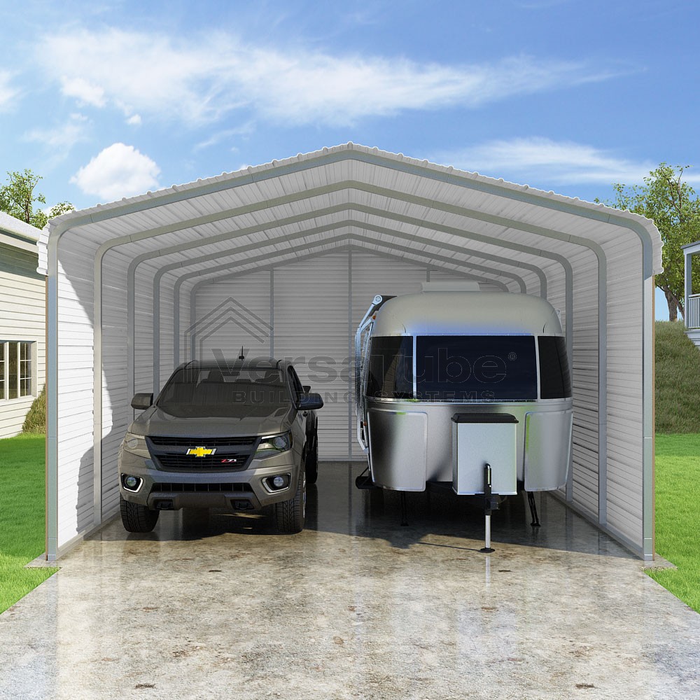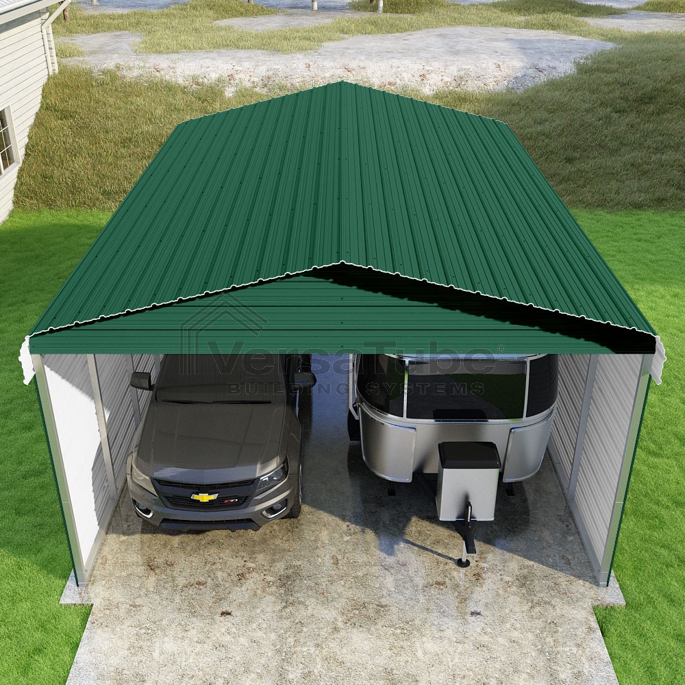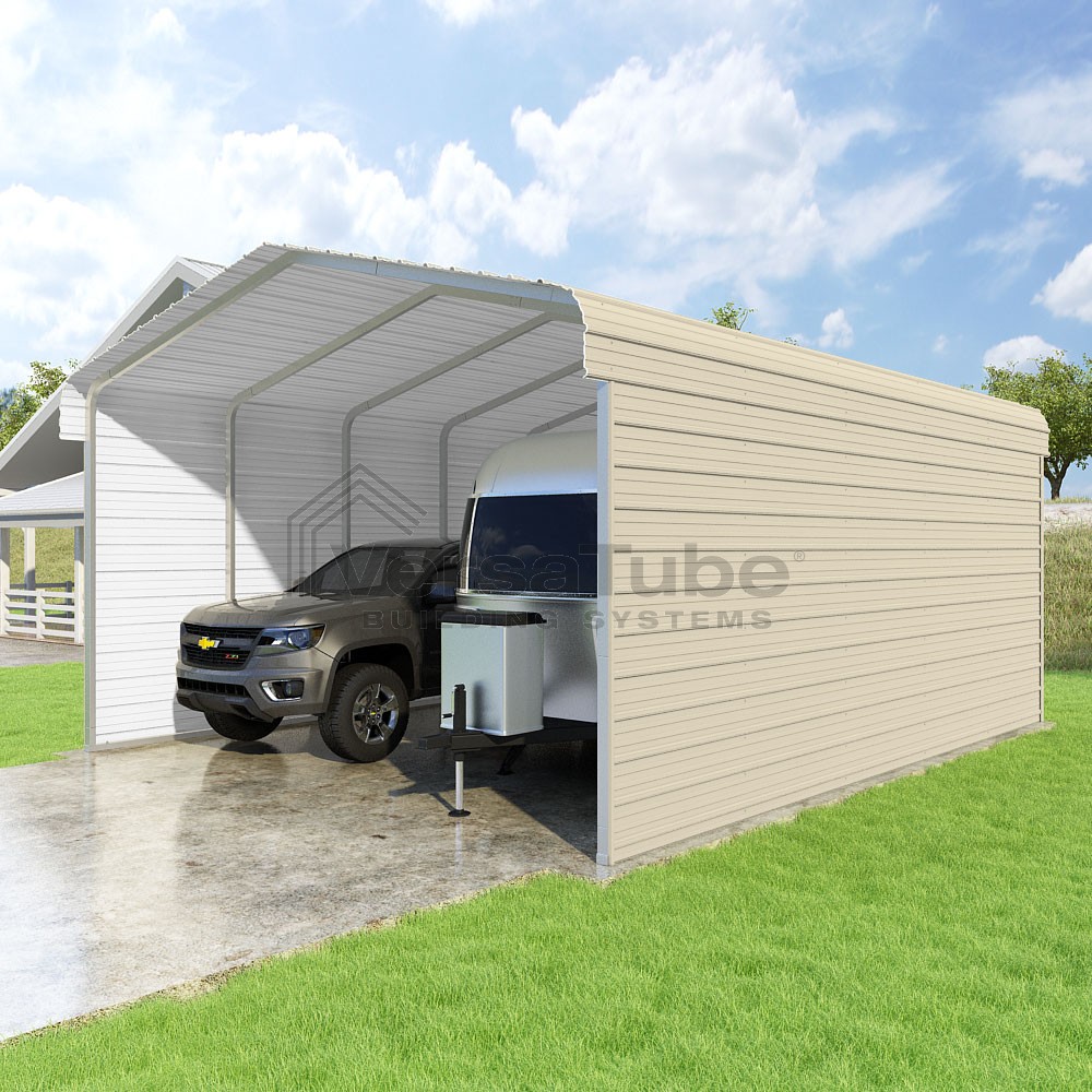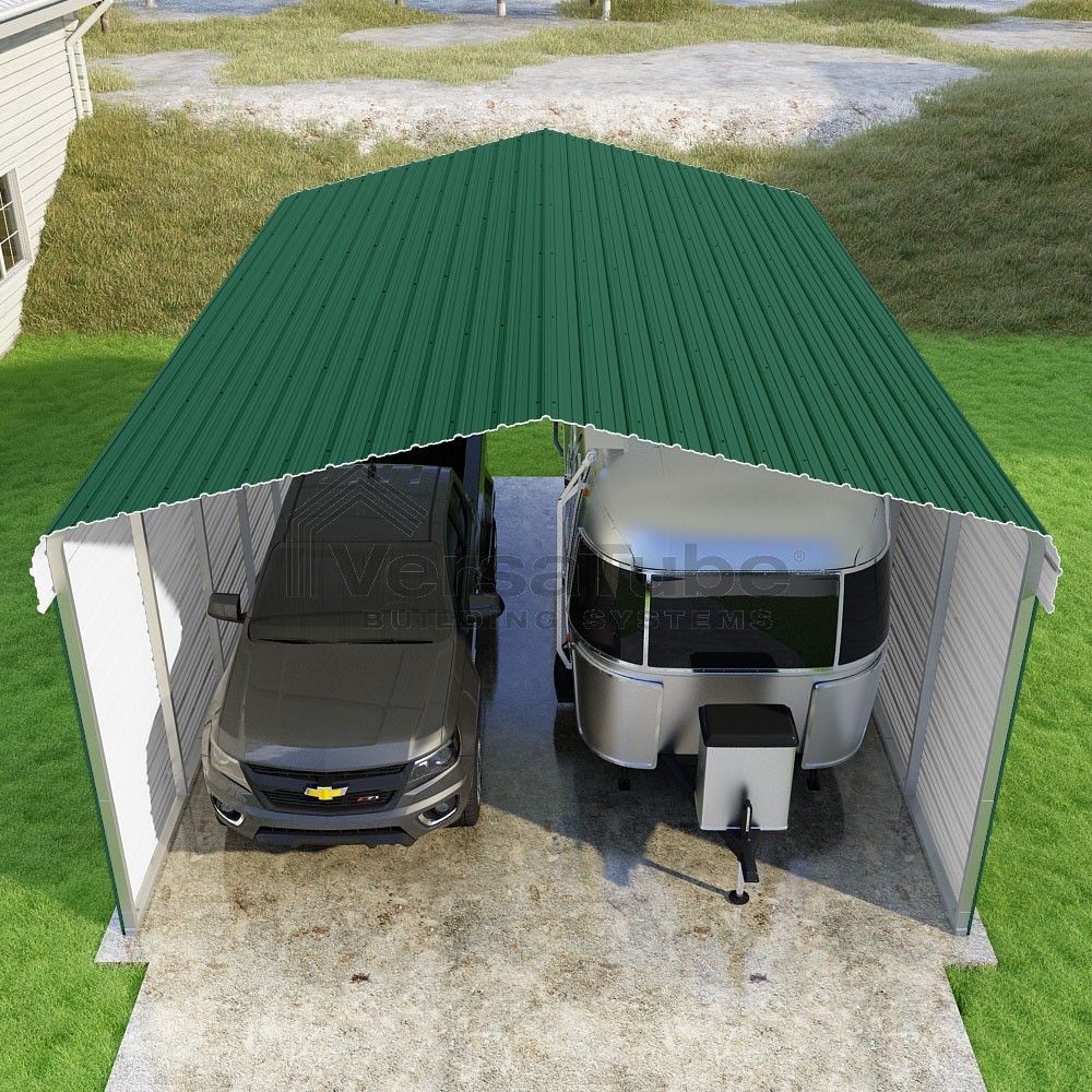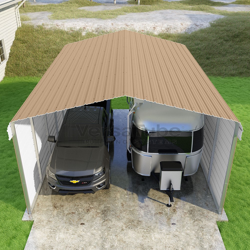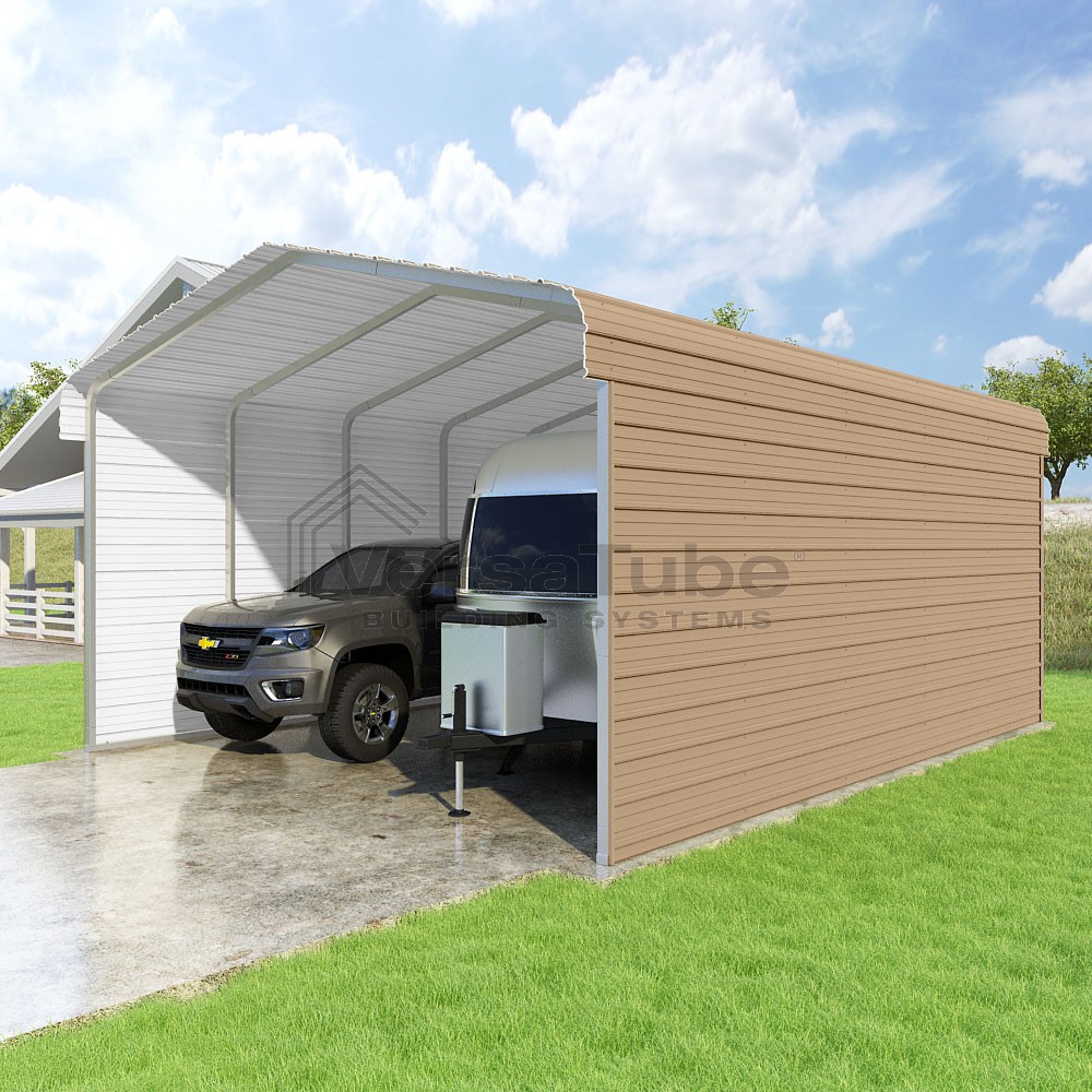 Classic Series DIY carport kit features horizontal application of sheet metal panels with the extra protection of rounded eaves.