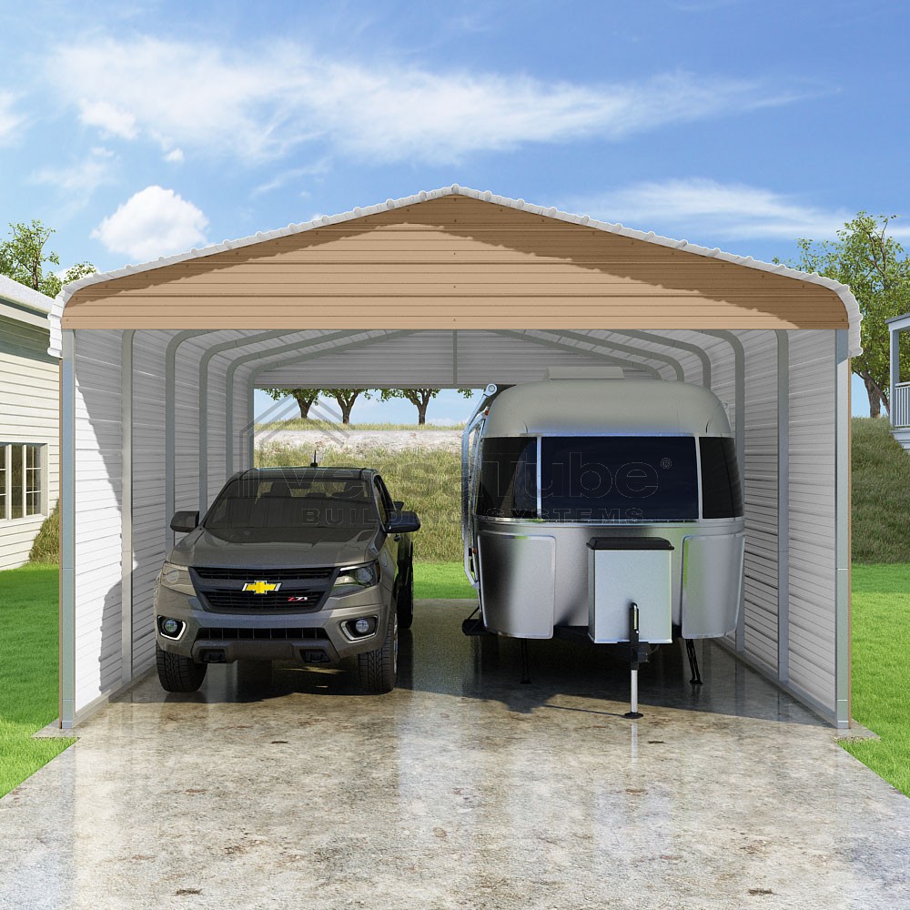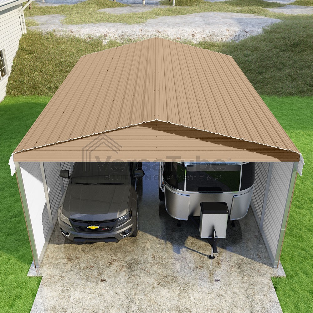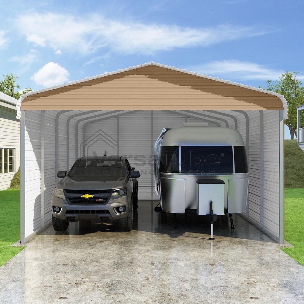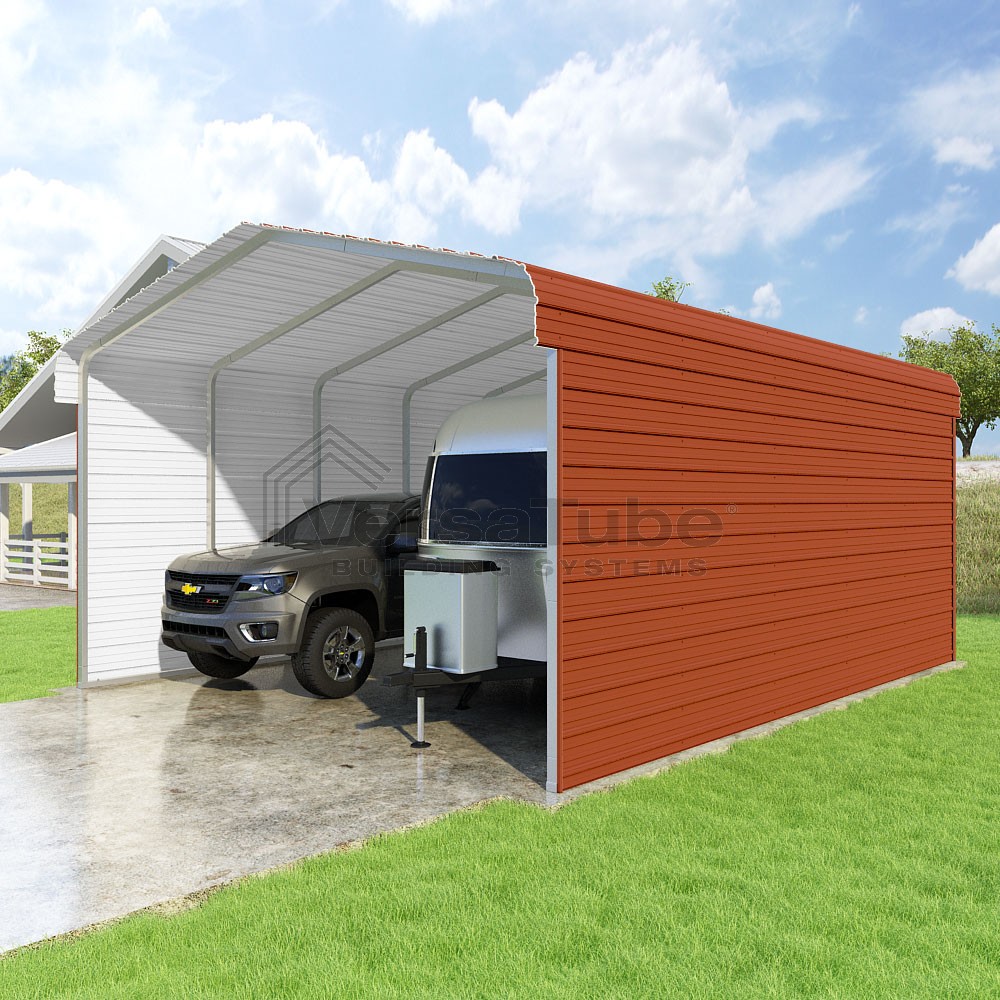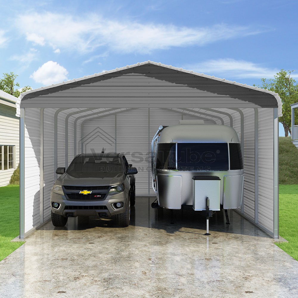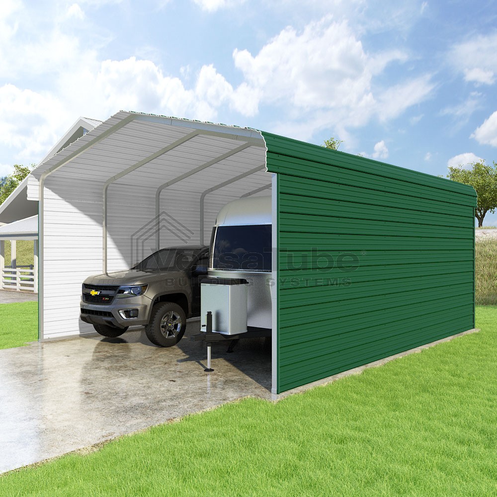 Classic Series DIY carport kit features horizontal application of sheet metal panels with the extra protection of rounded eaves.