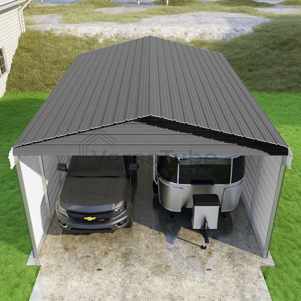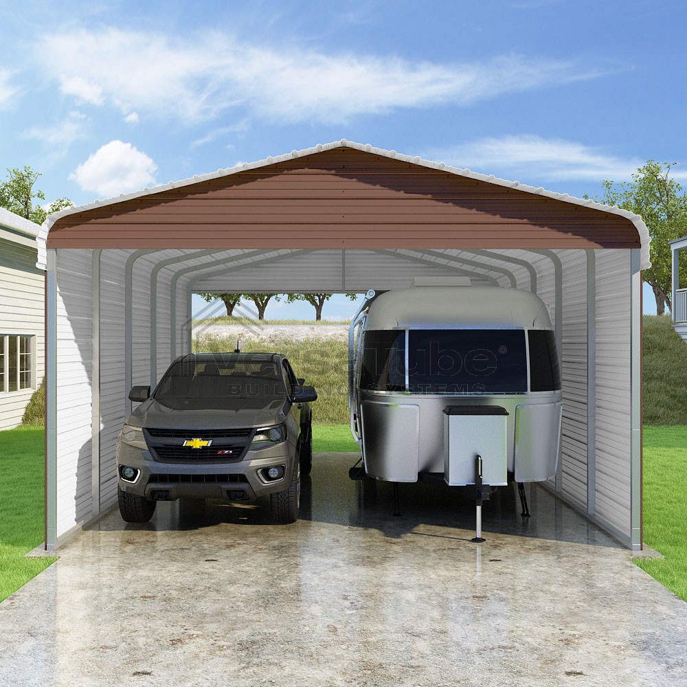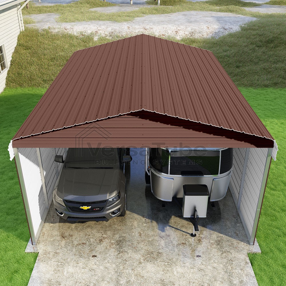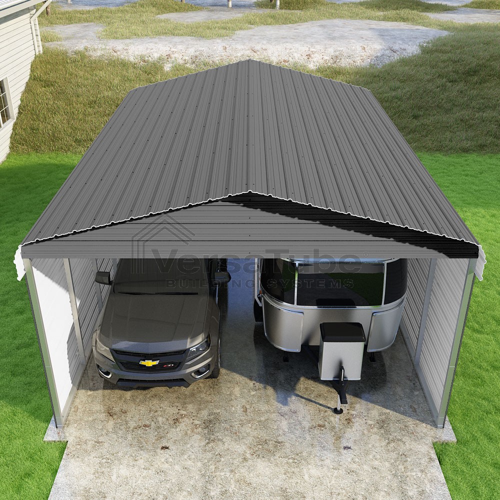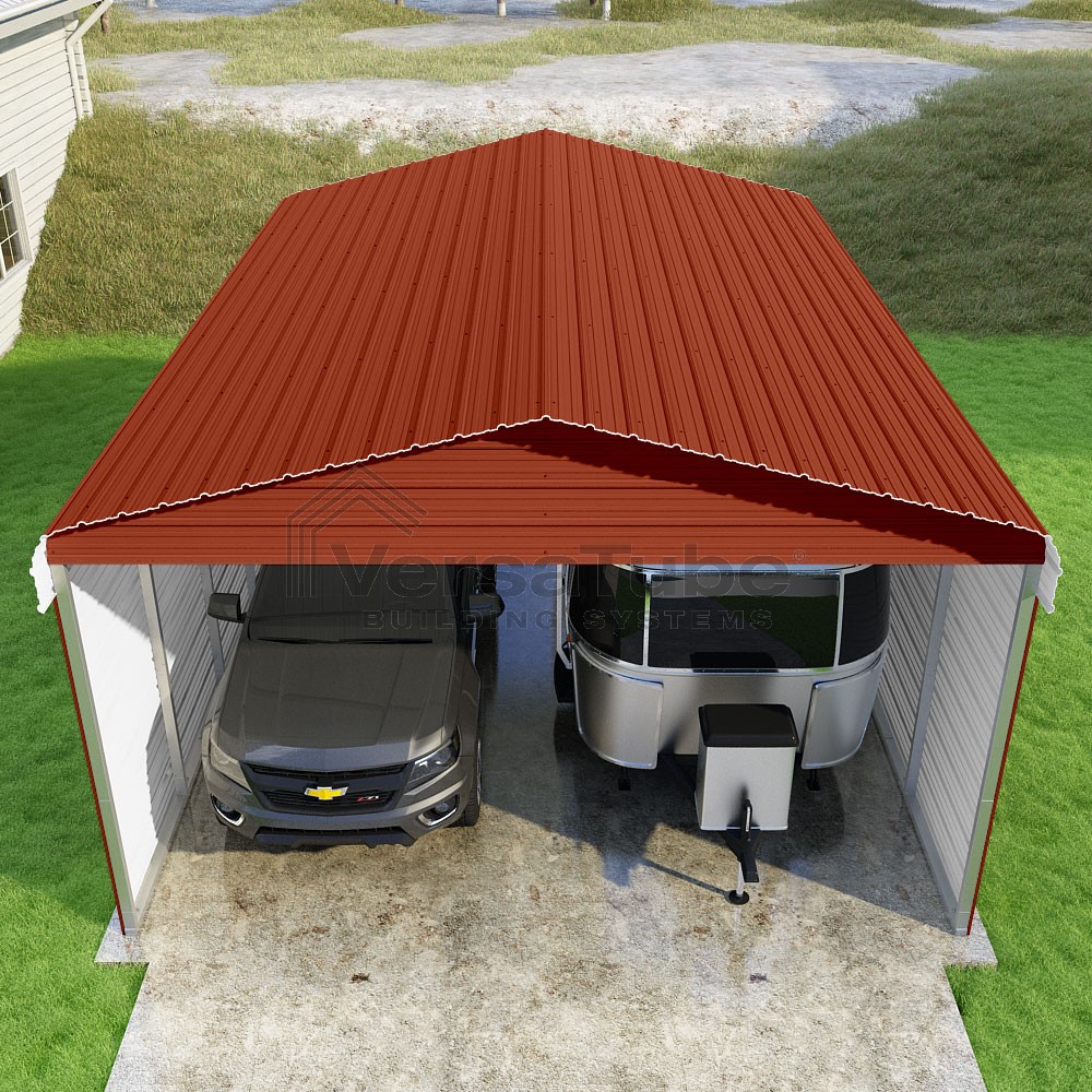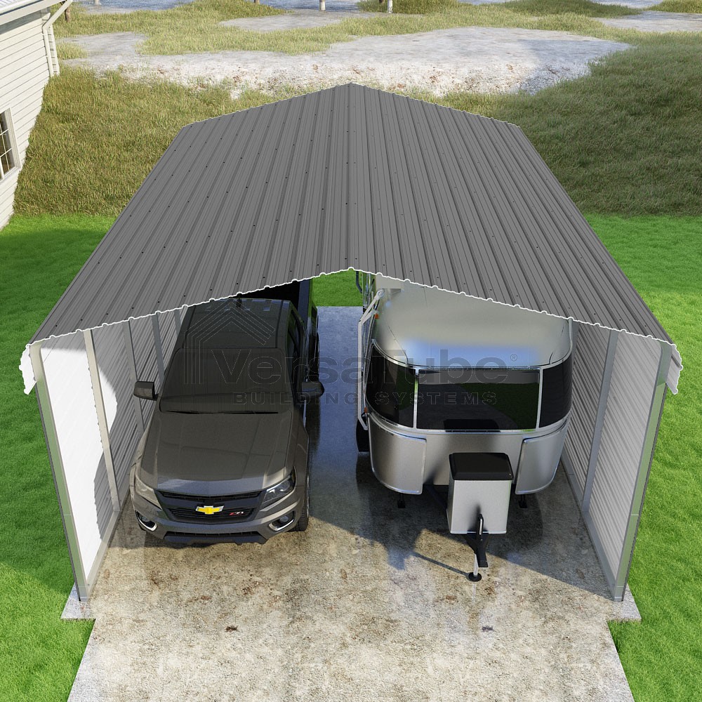 Classic Series DIY carport kit features horizontal application of sheet metal panels with the extra protection of rounded eaves.