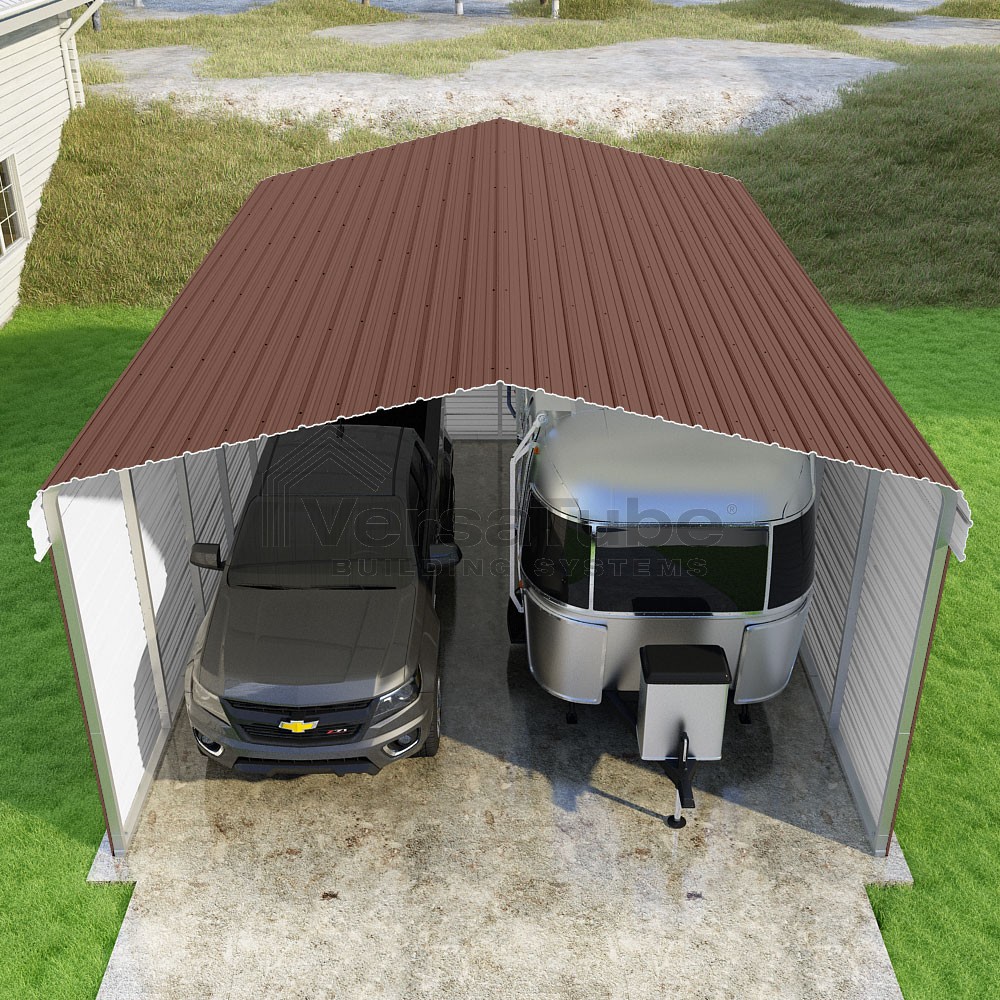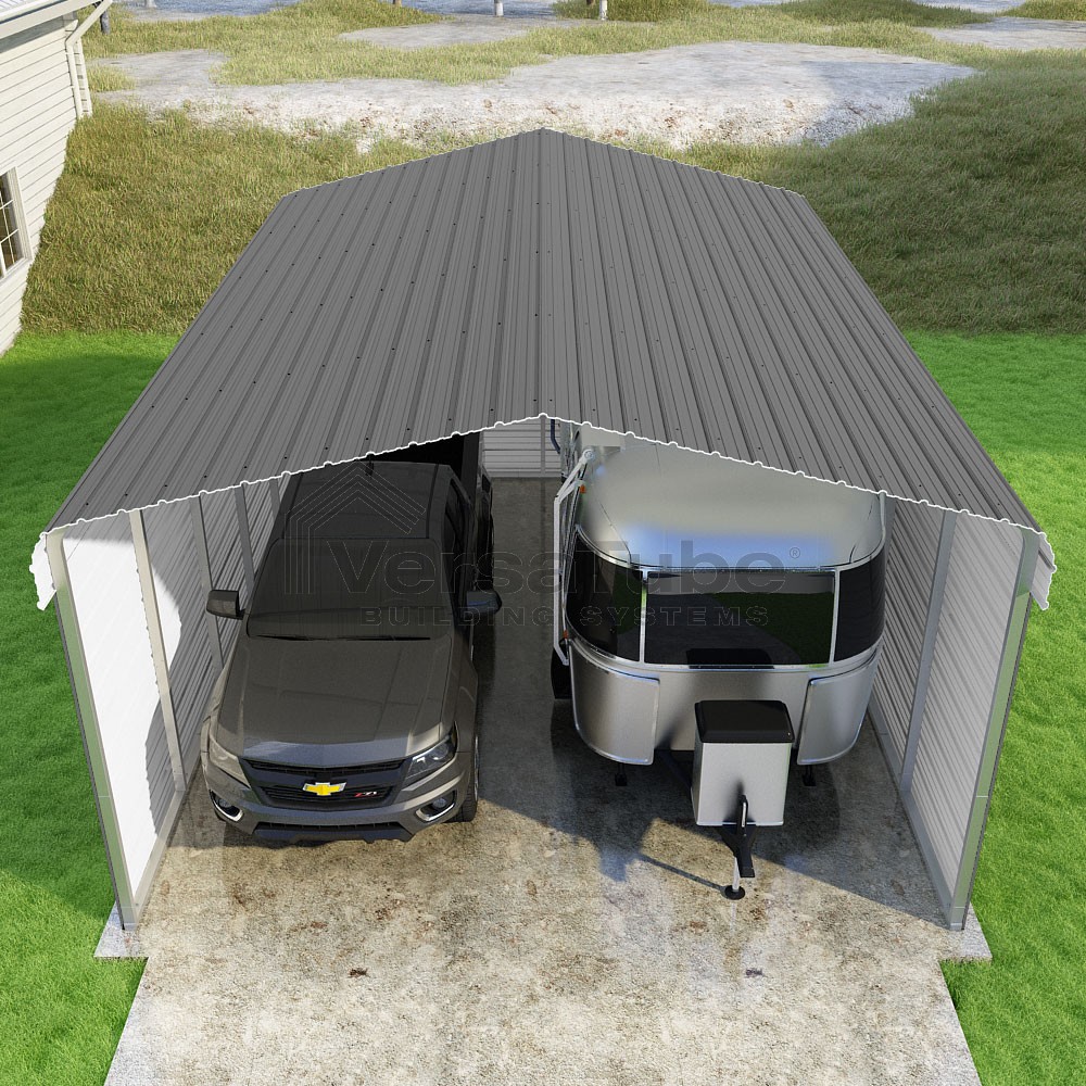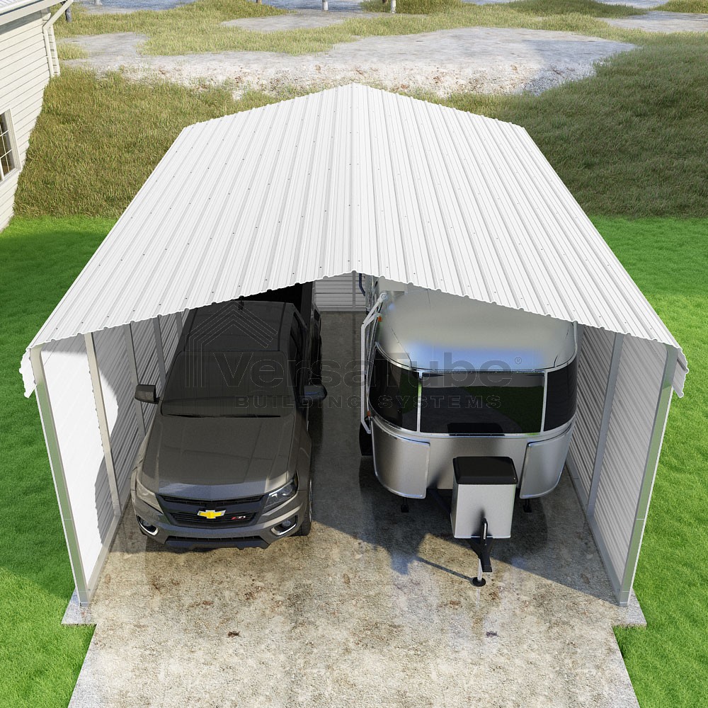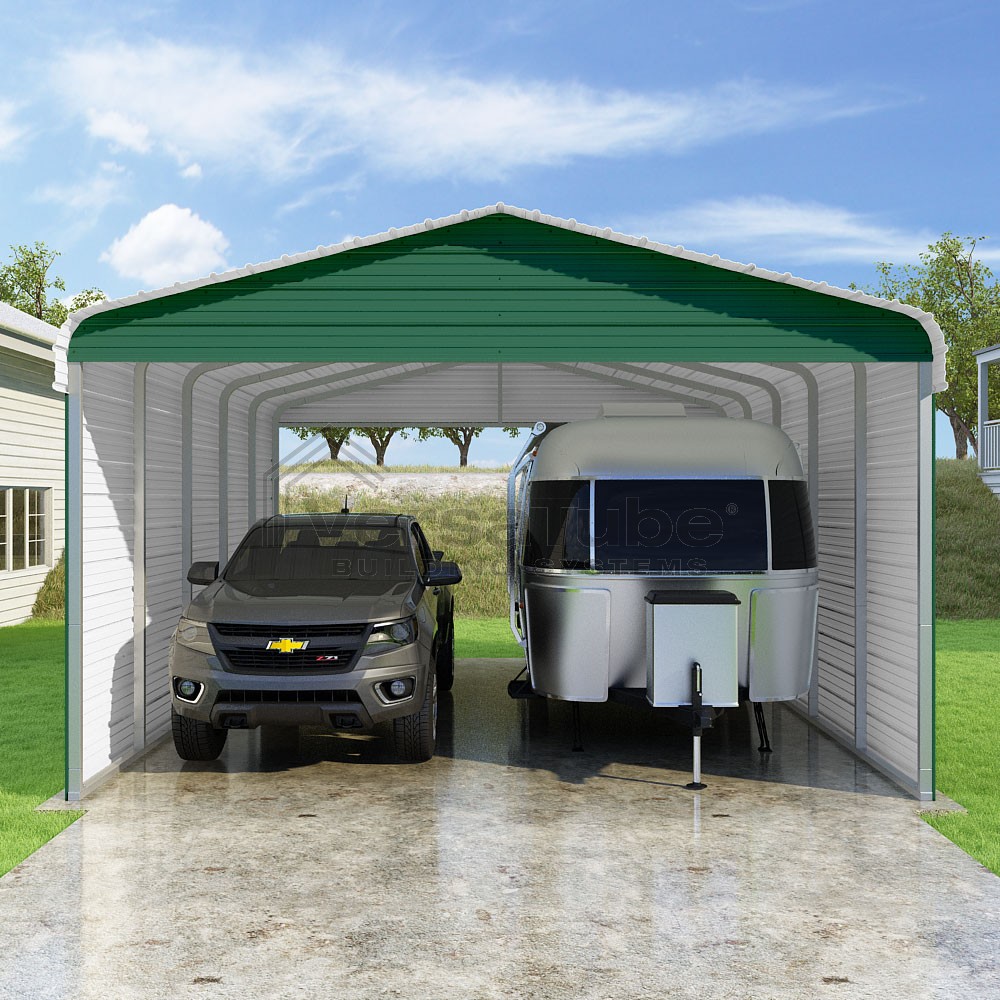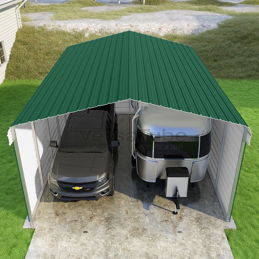 Classic Series DIY carport kit features horizontal application of sheet metal panels with the extra protection of rounded eaves.