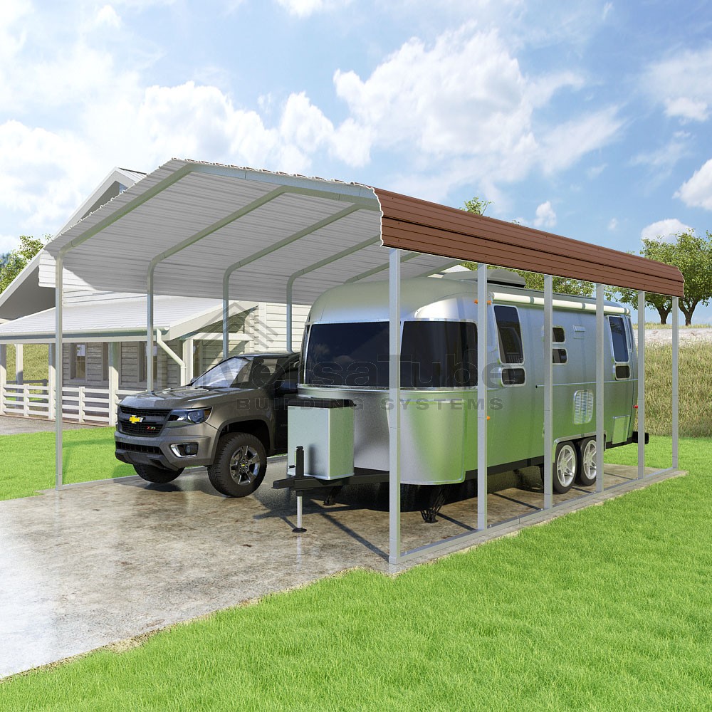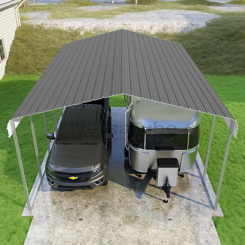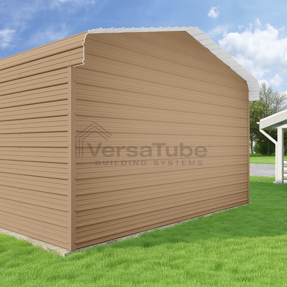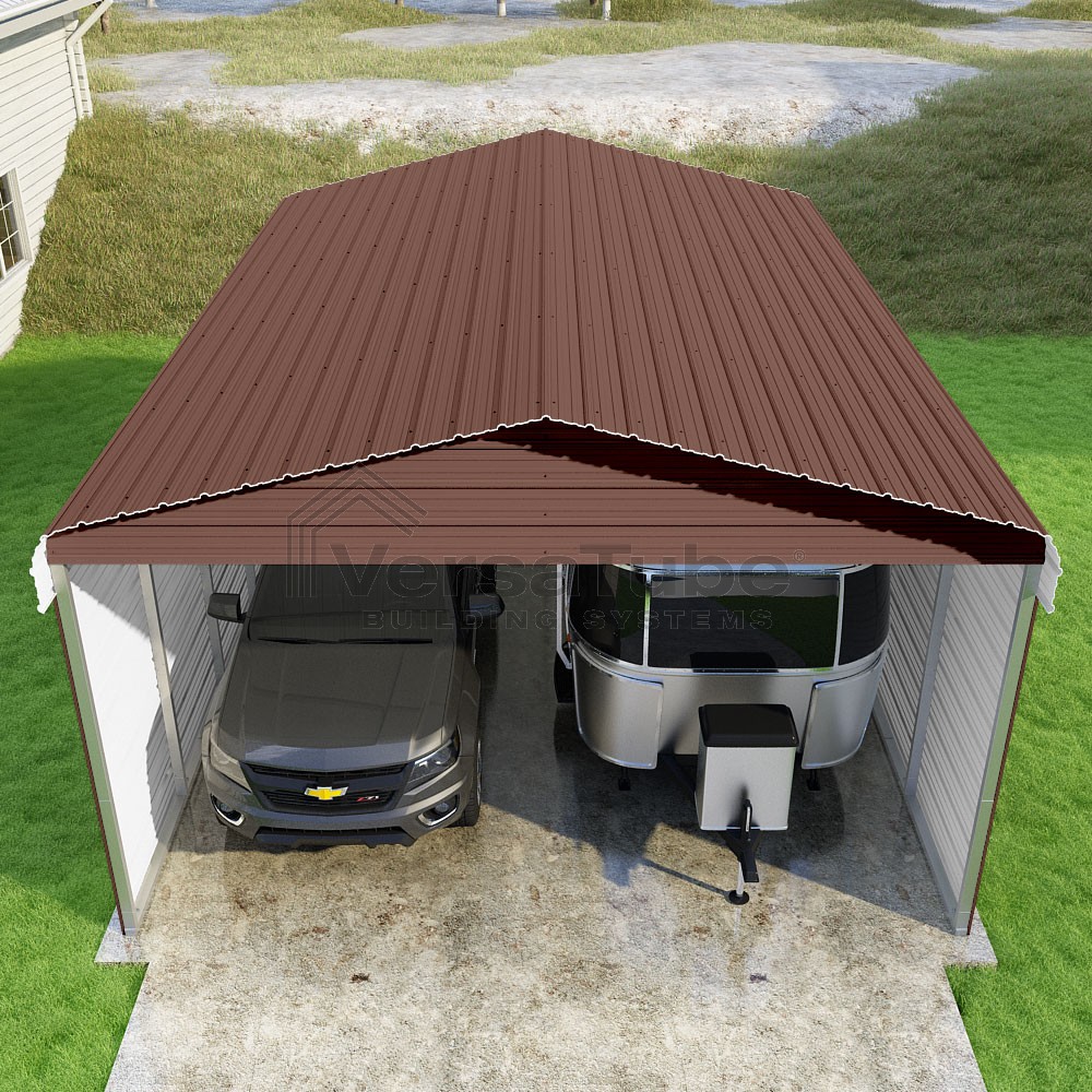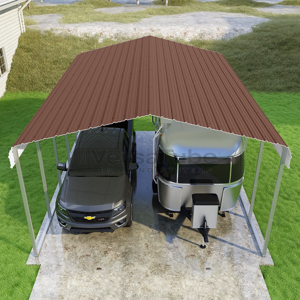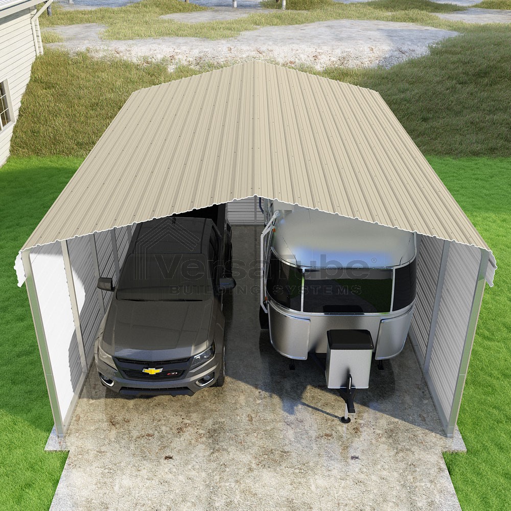Classic Series DIY carport kit features horizontal application of sheet metal panels with the extra protection of rounded eaves.