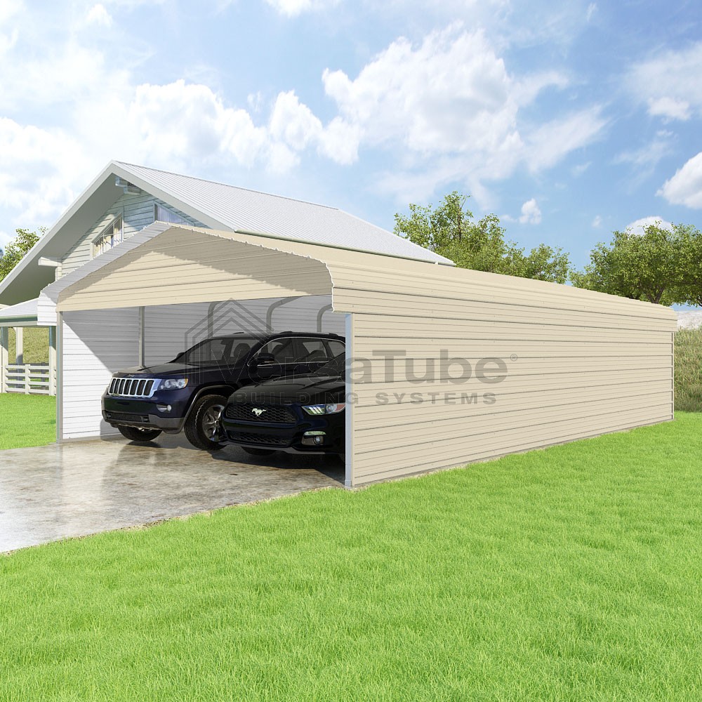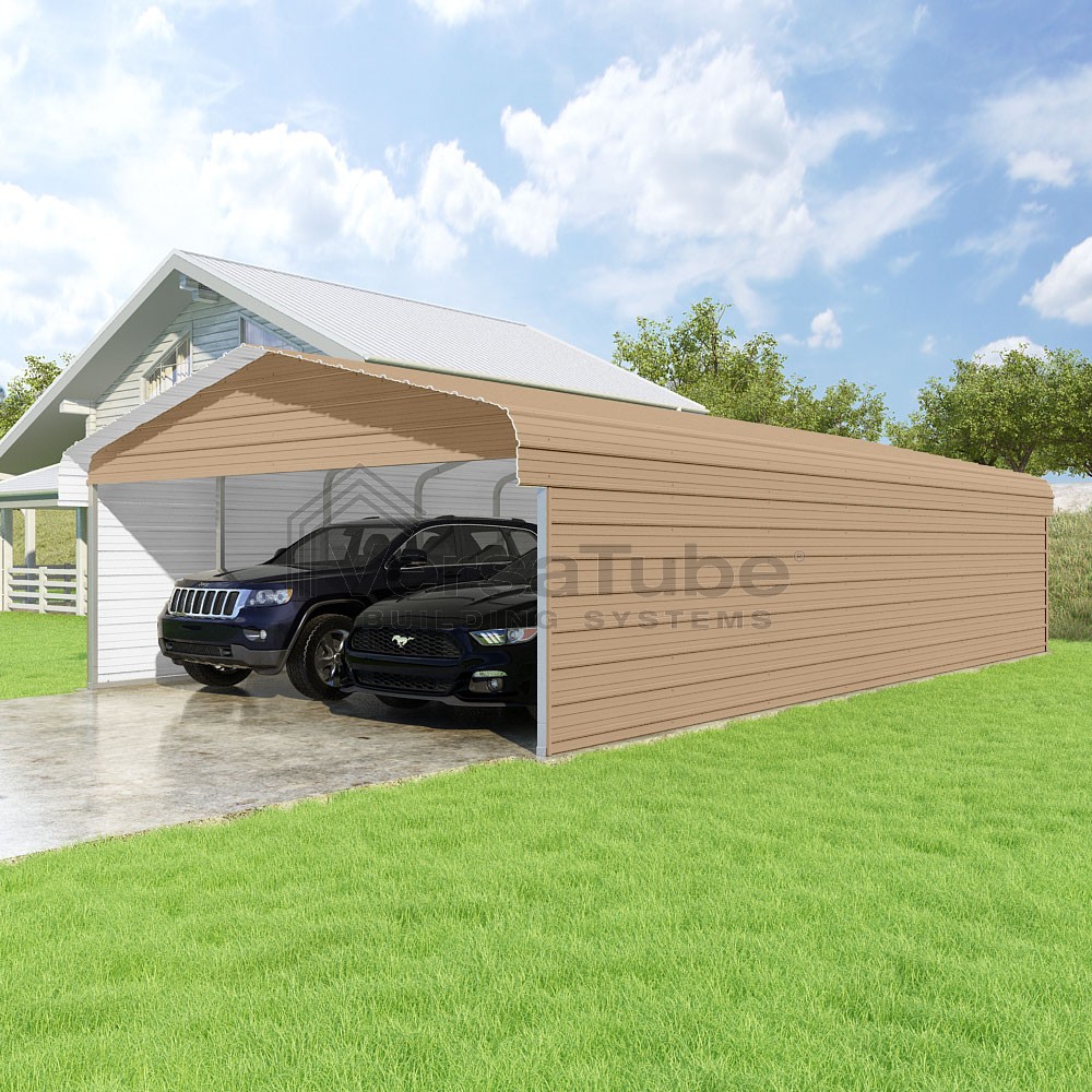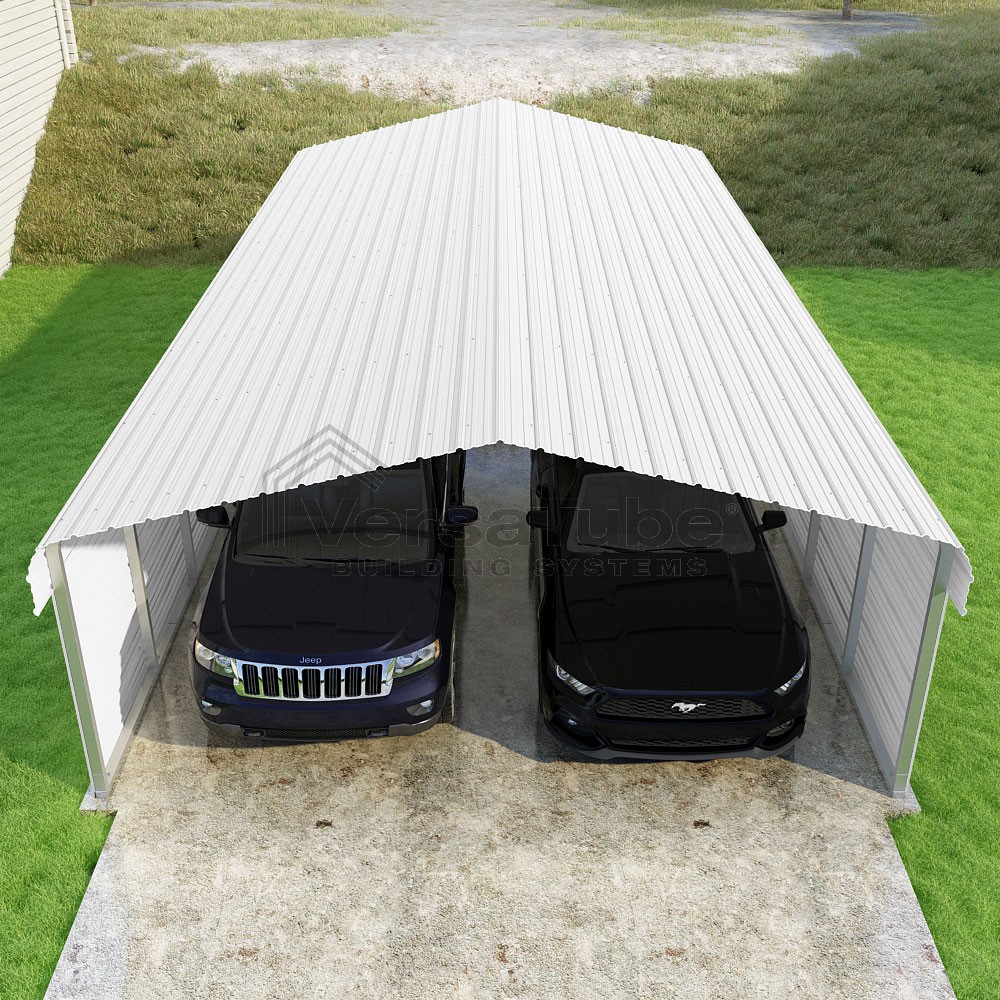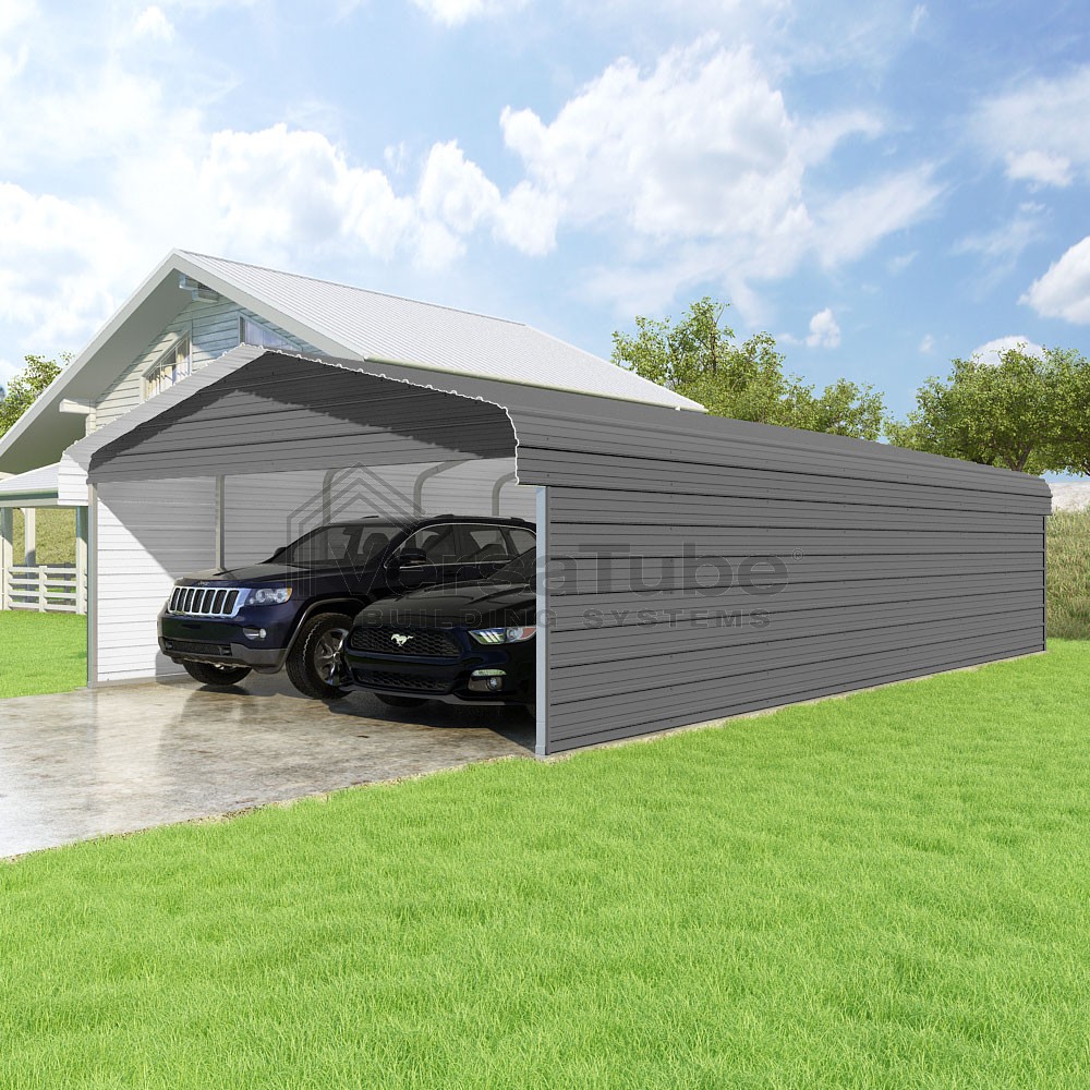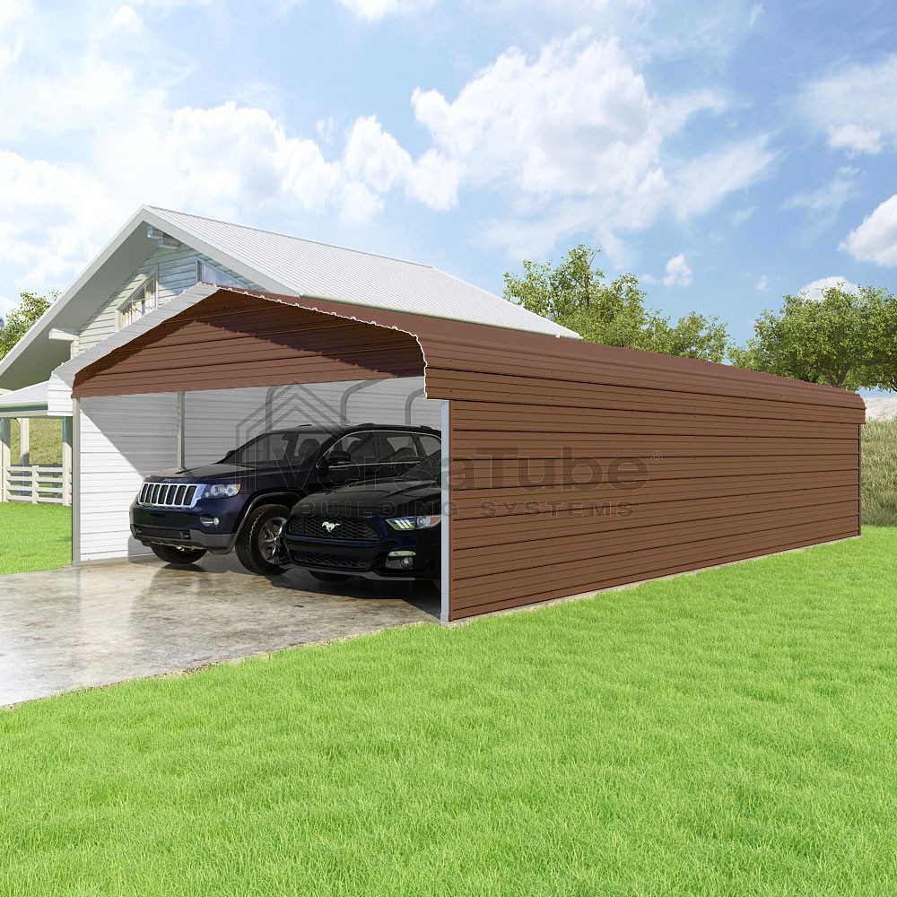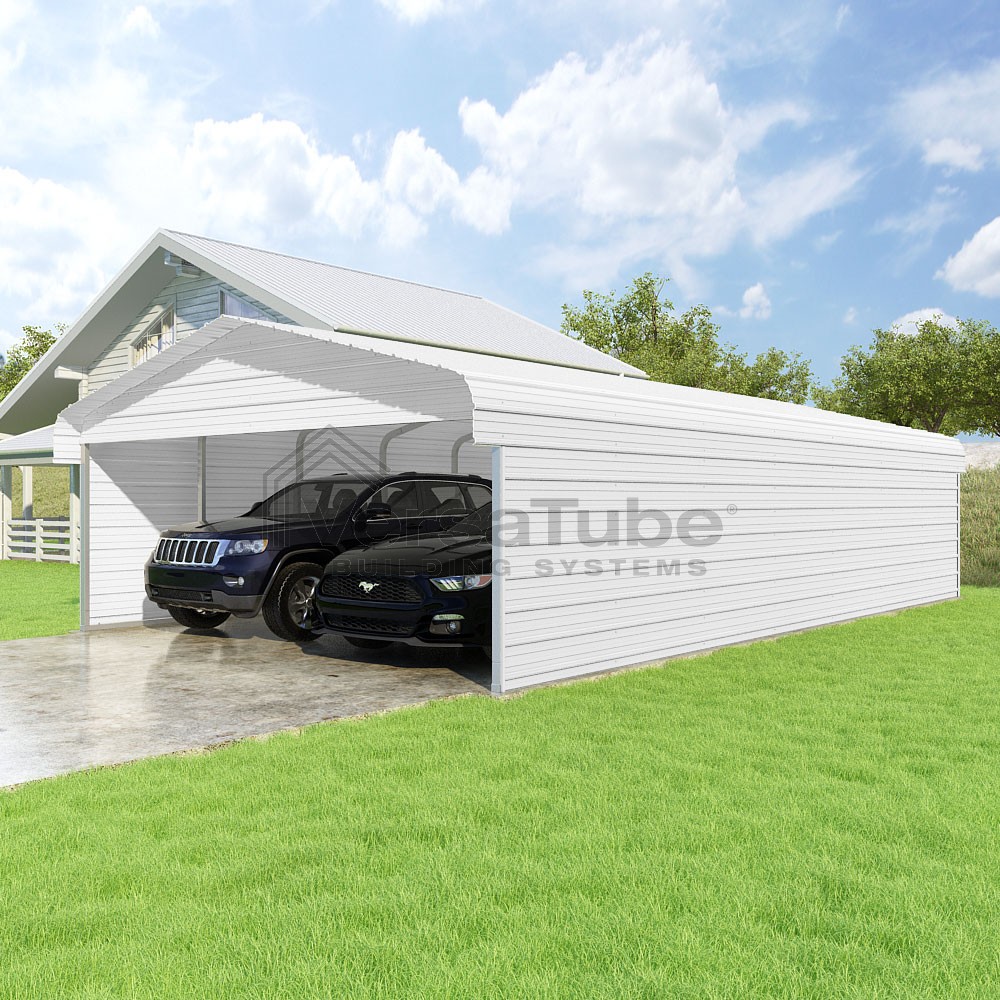 Classic Series DIY carport kit features horizontal application of sheet metal panels with the extra protection of rounded eaves.