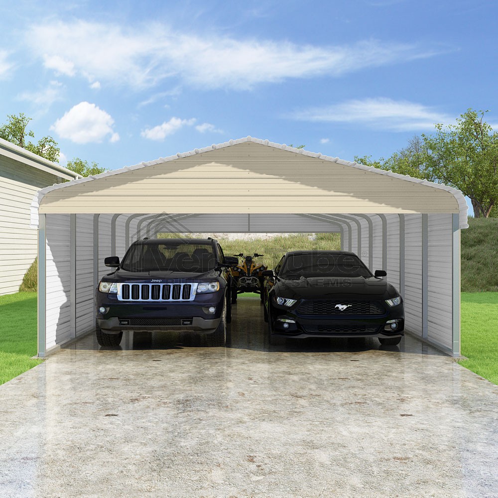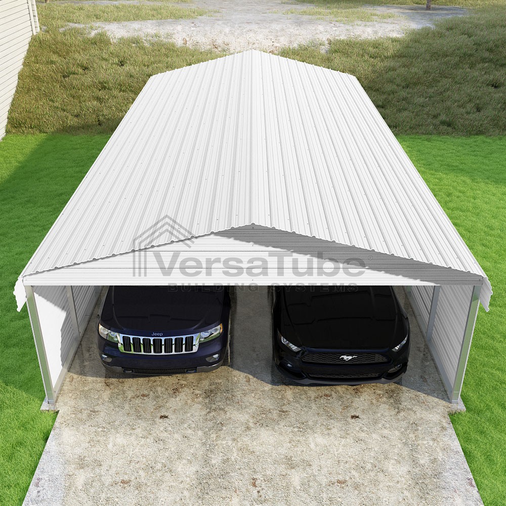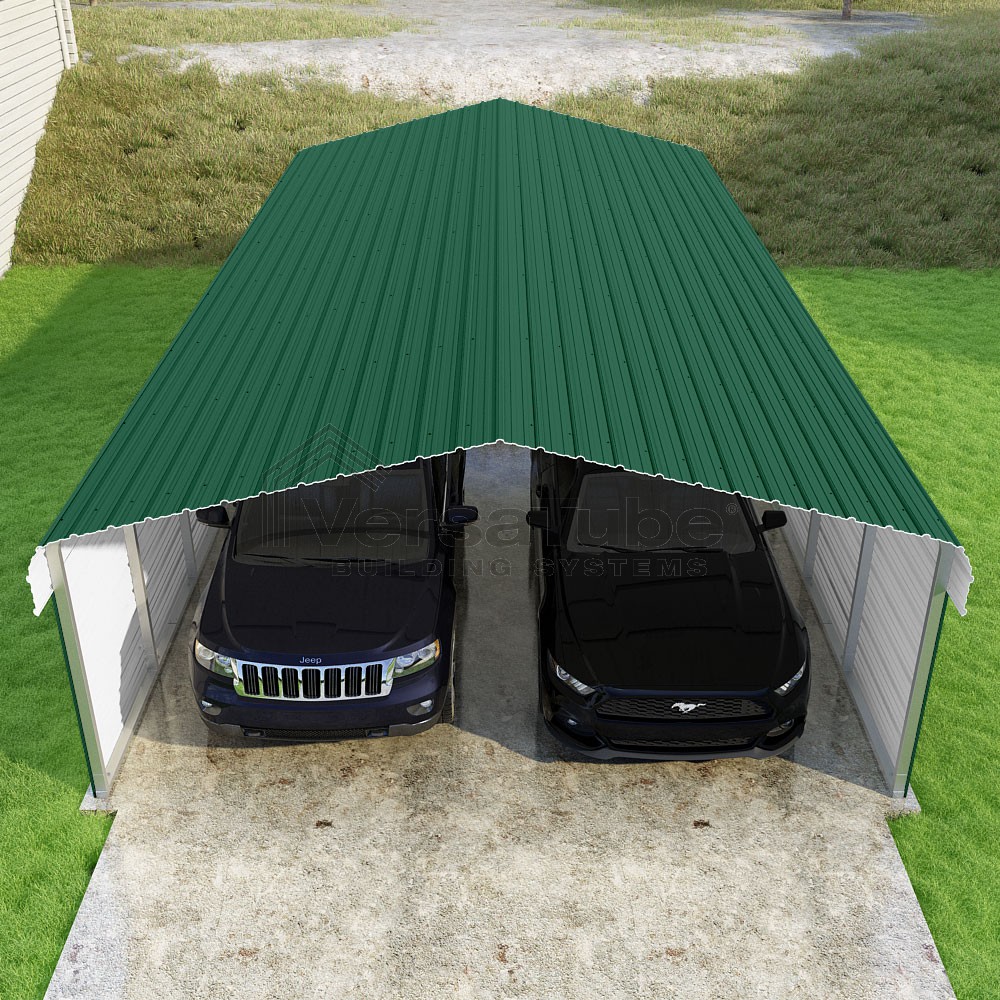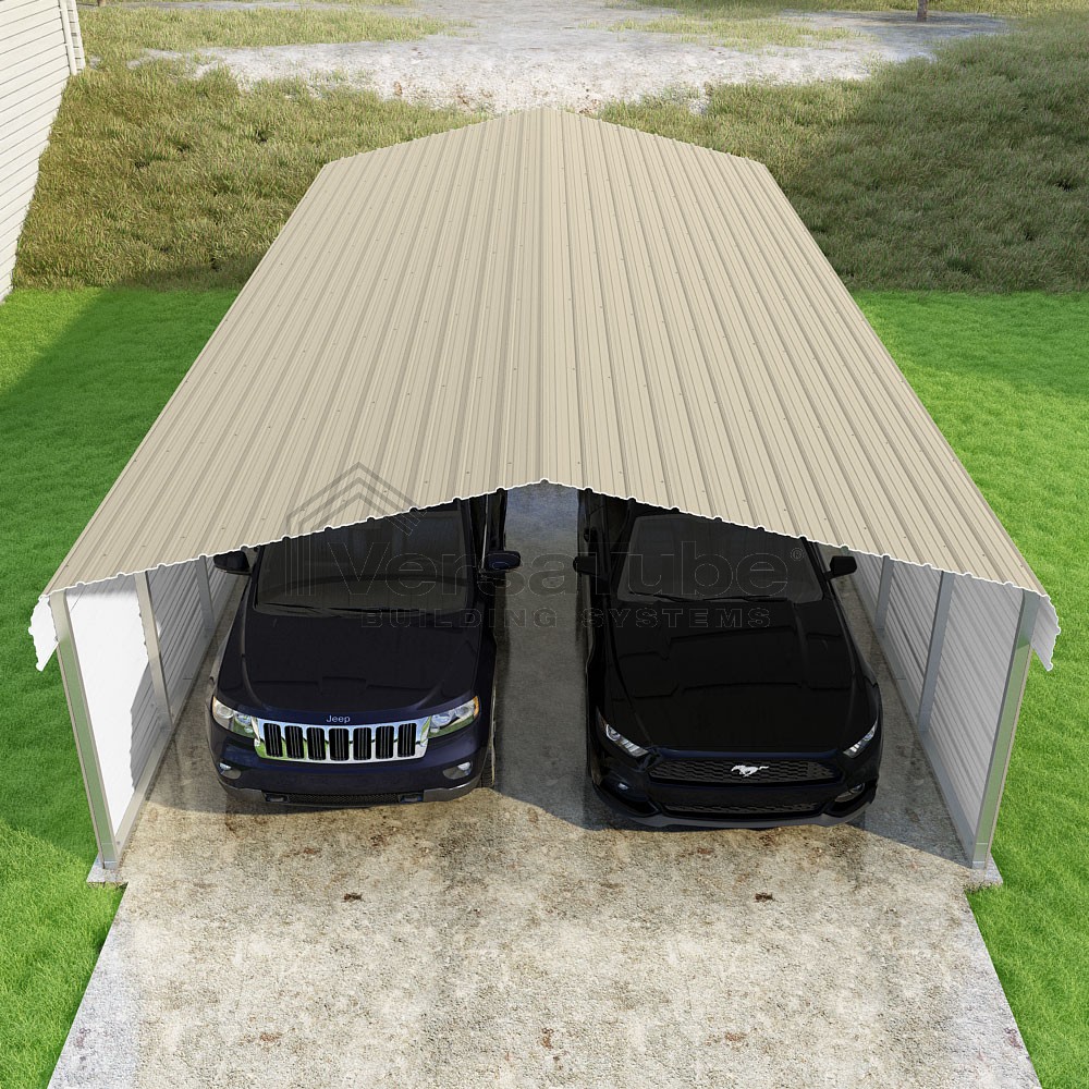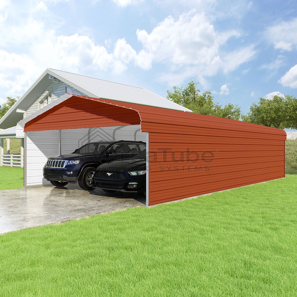 Classic Series DIY carport kit features horizontal application of sheet metal panels with the extra protection of rounded eaves.