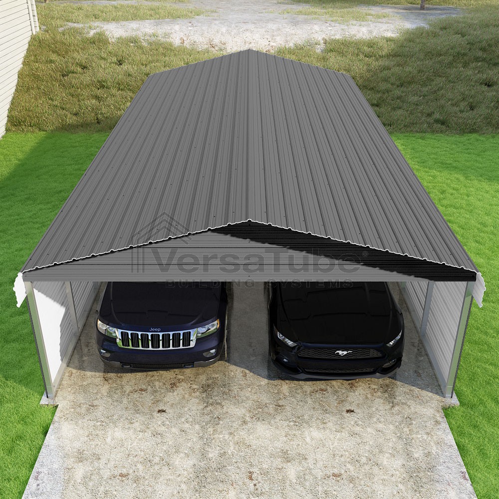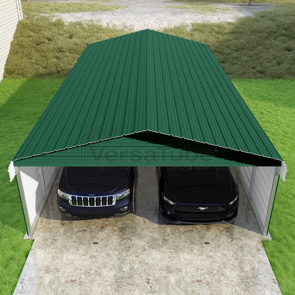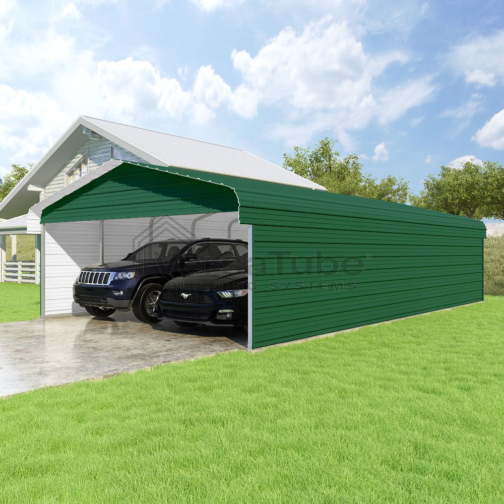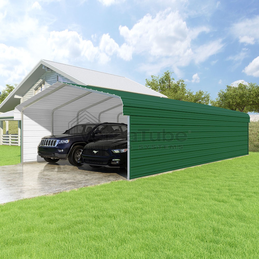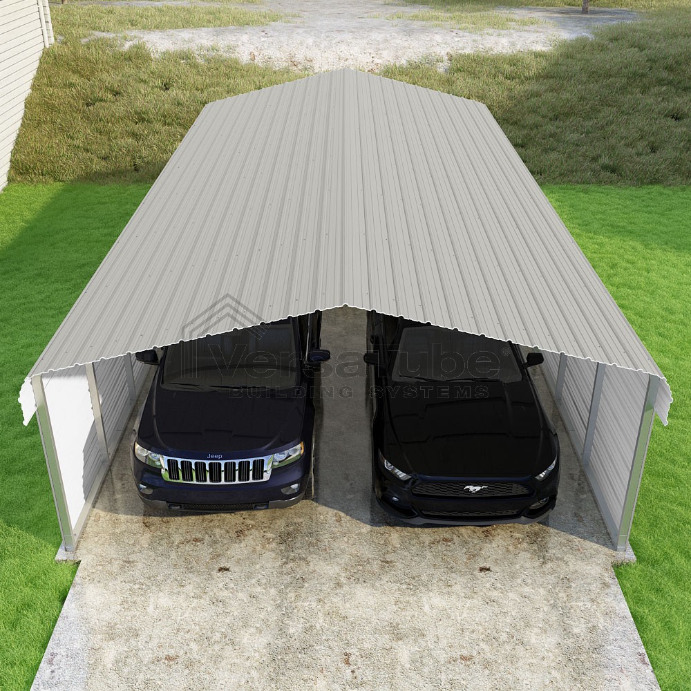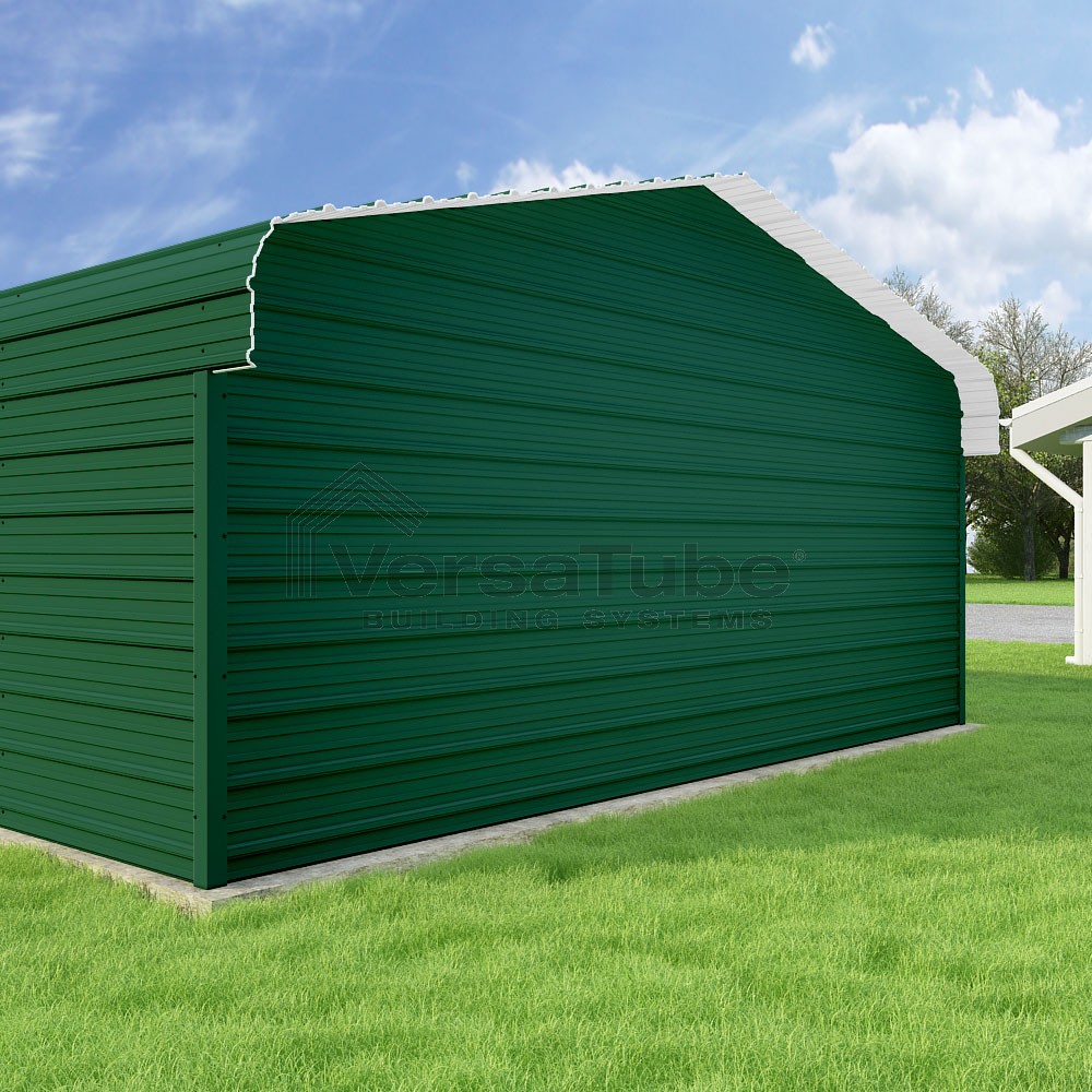 Classic Series DIY carport kit features horizontal application of sheet metal panels with the extra protection of rounded eaves.