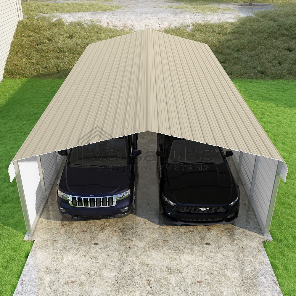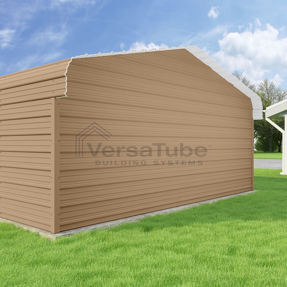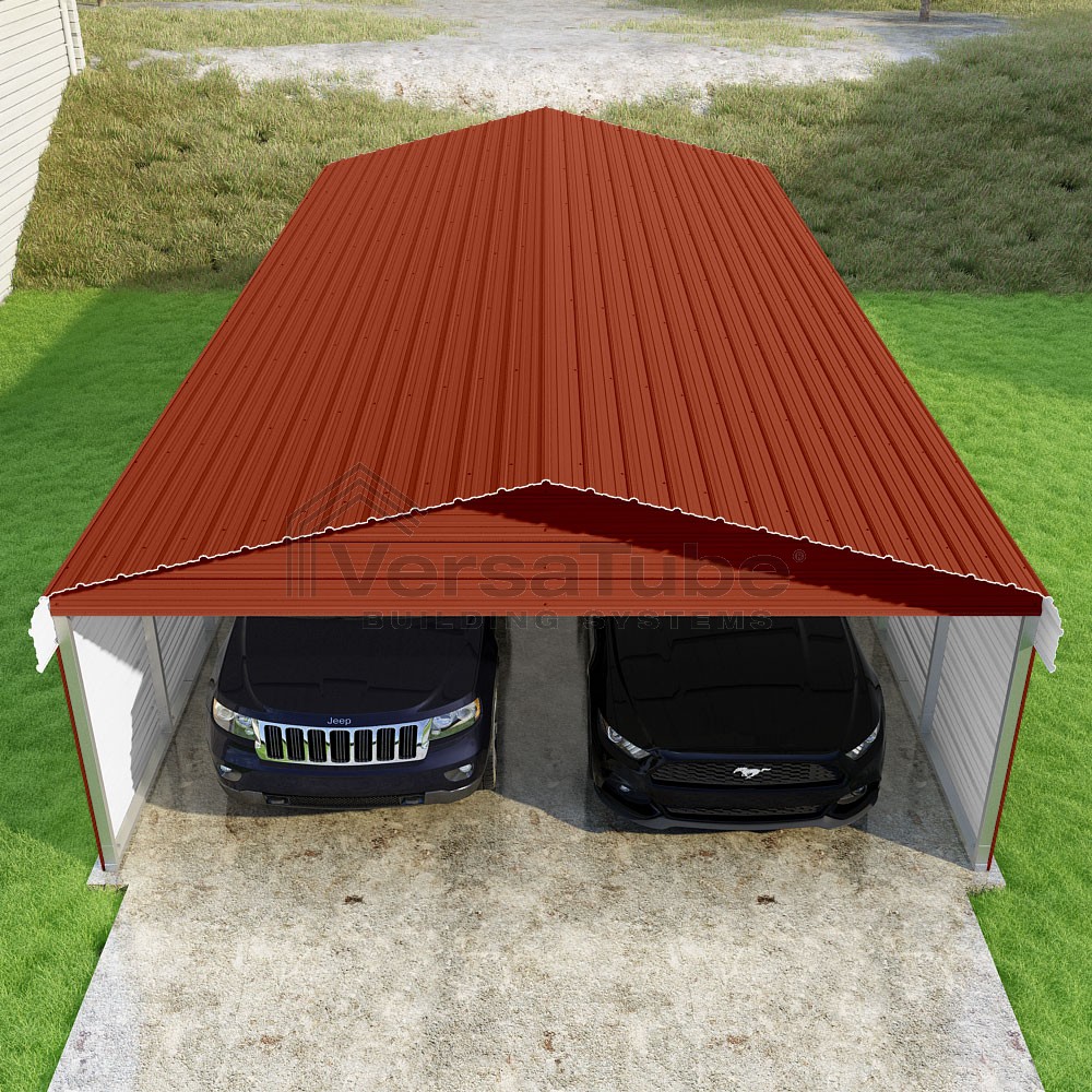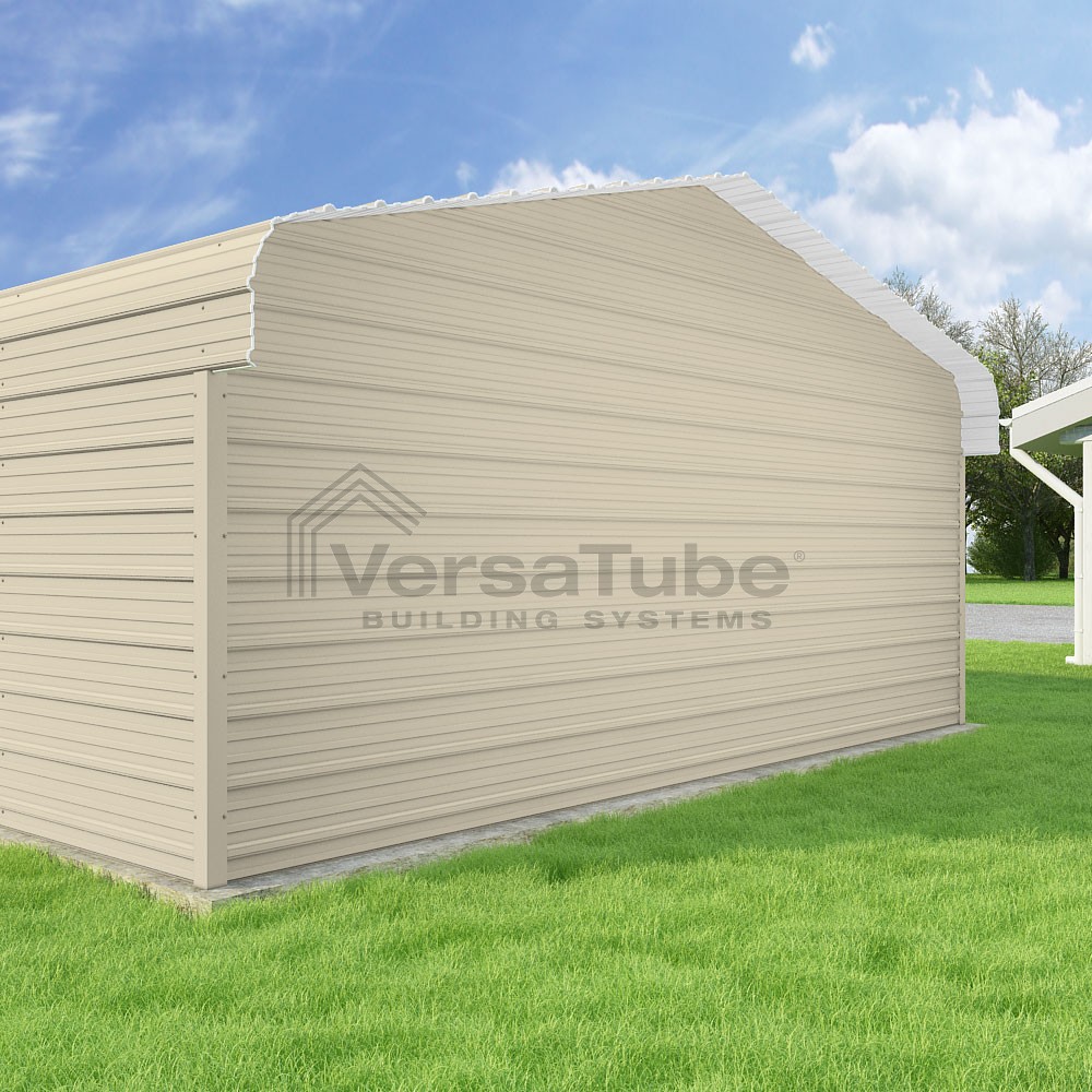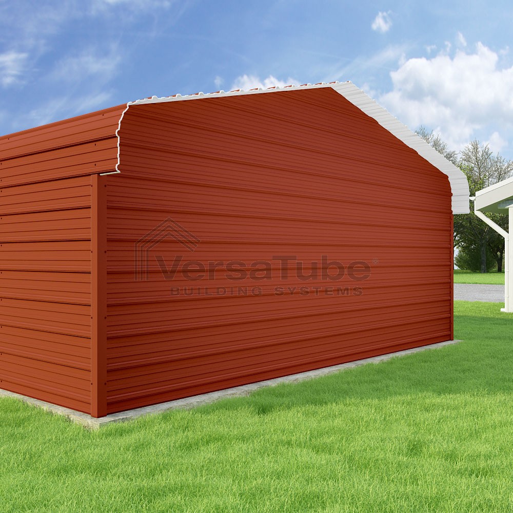 Classic Series DIY carport kit features horizontal application of sheet metal panels with the extra protection of rounded eaves.