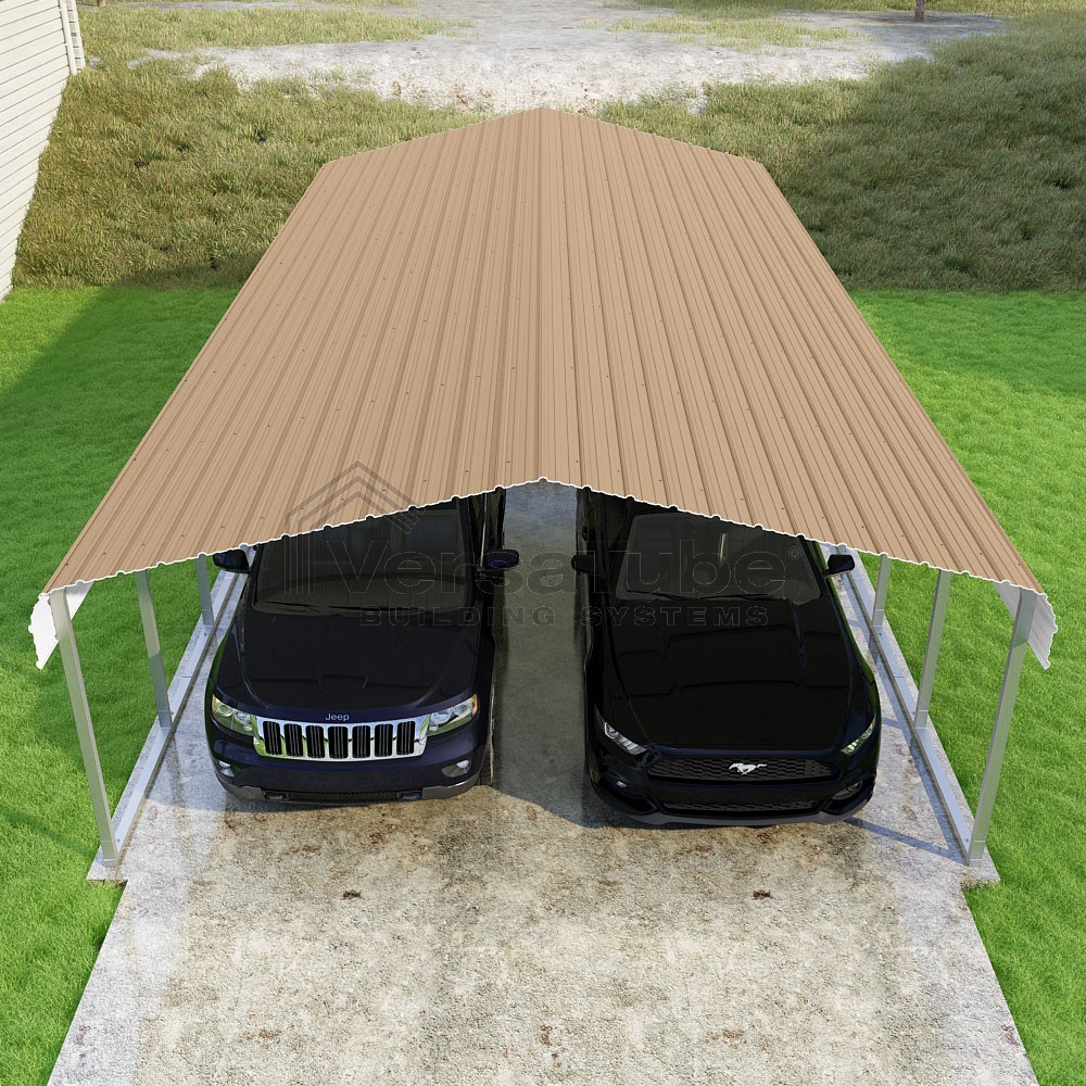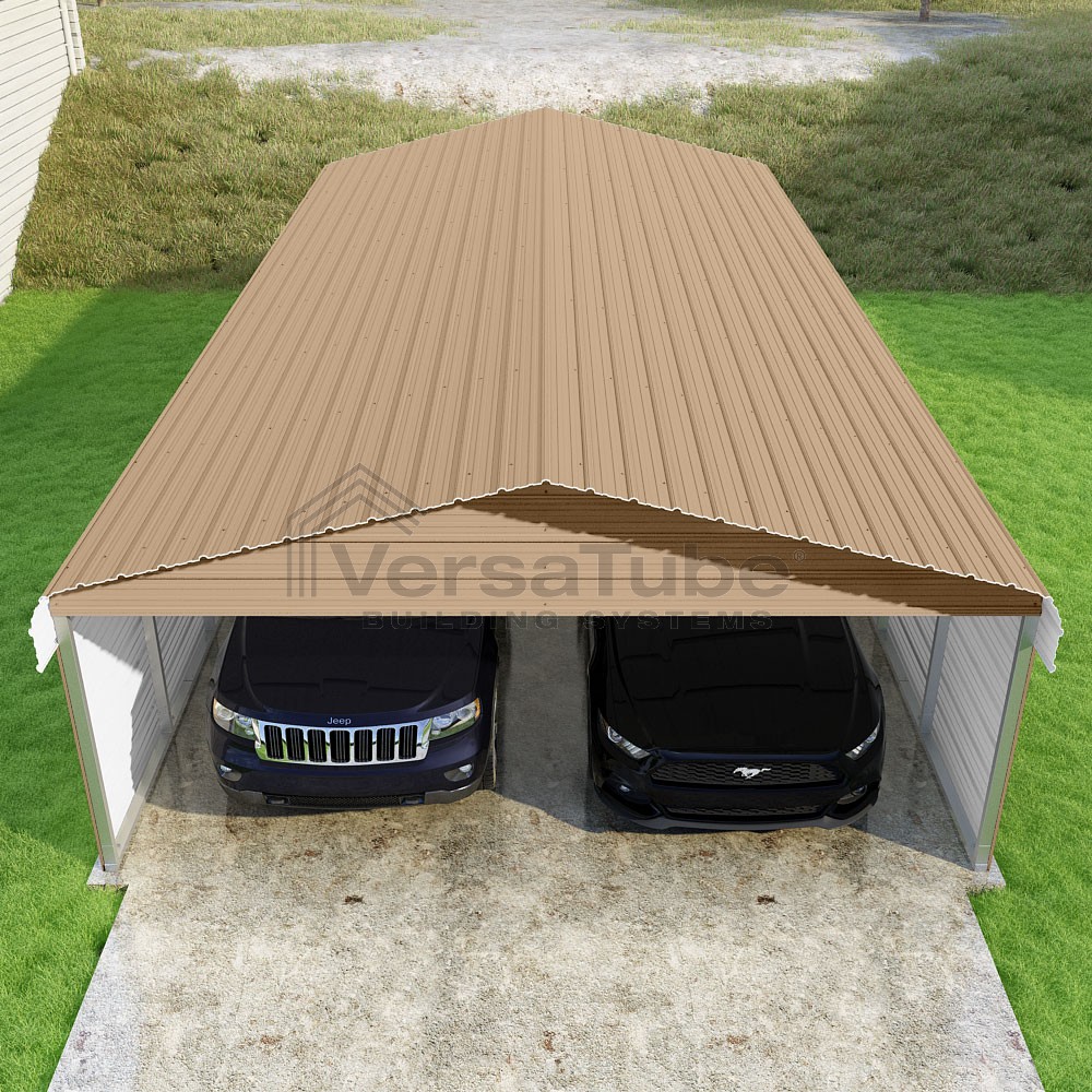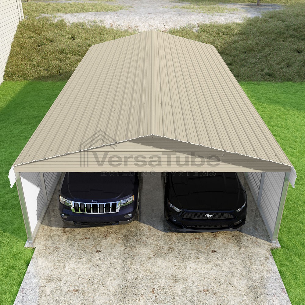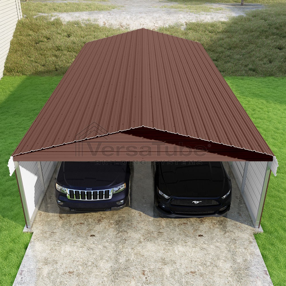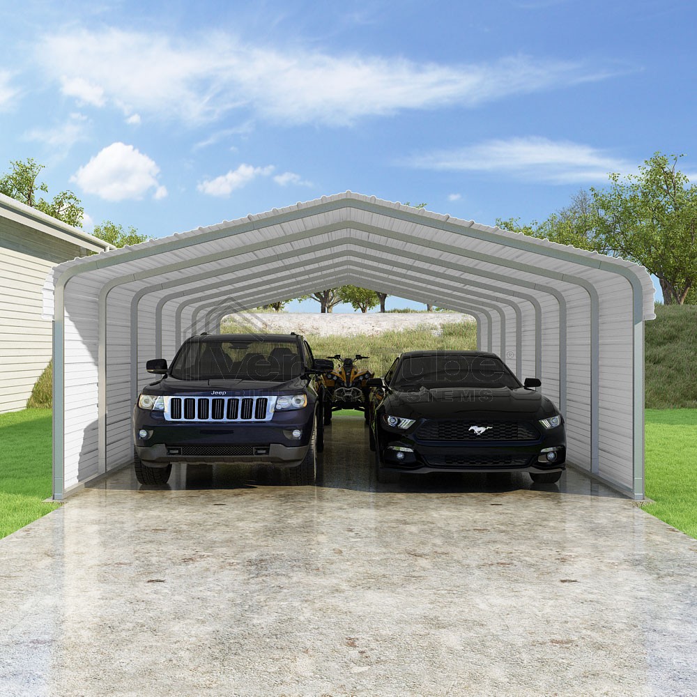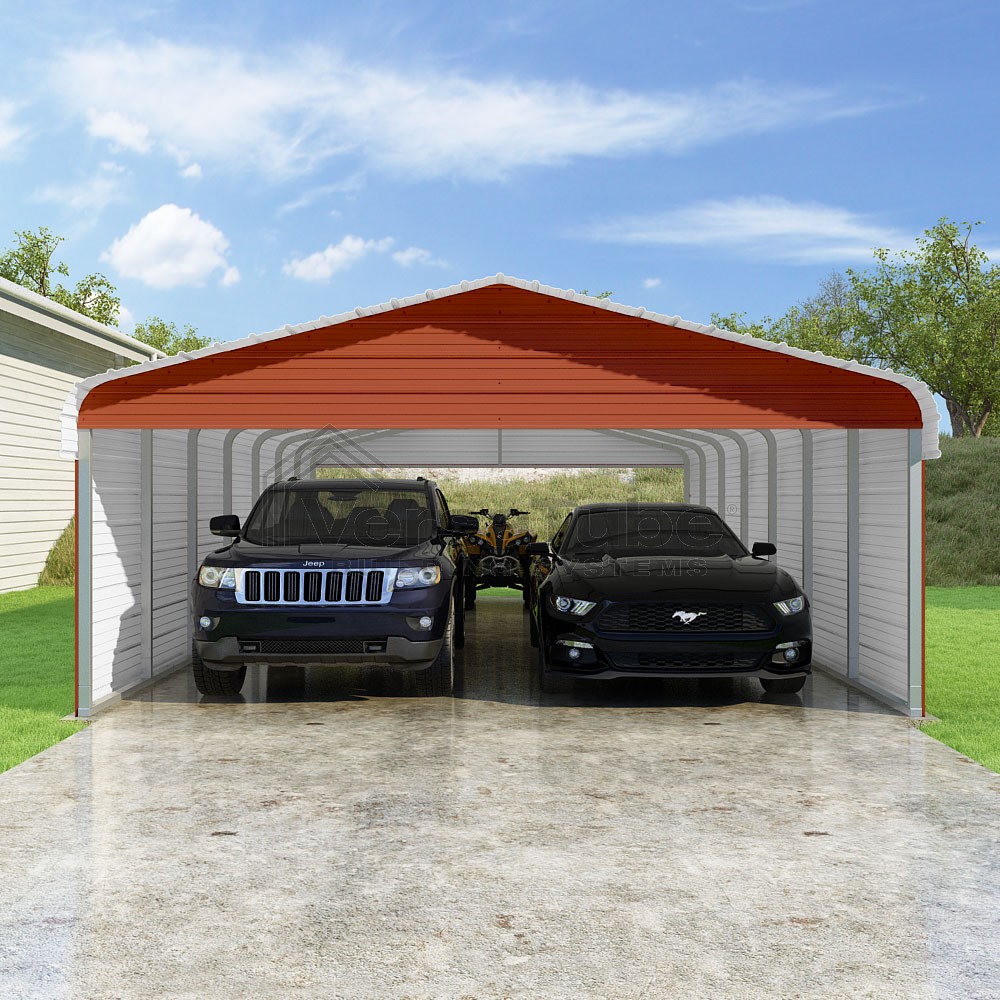 Classic Series DIY carport kit features horizontal application of sheet metal panels with the extra protection of rounded eaves.