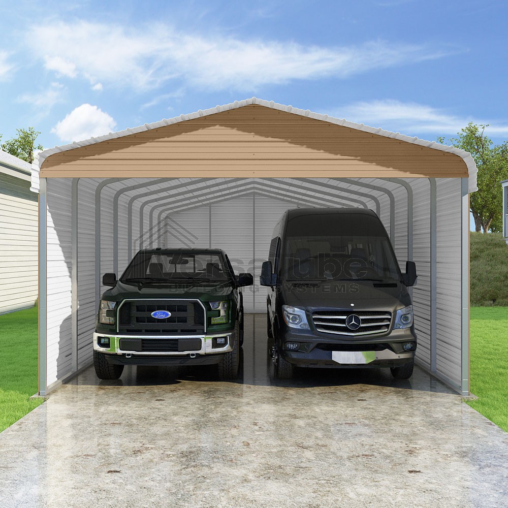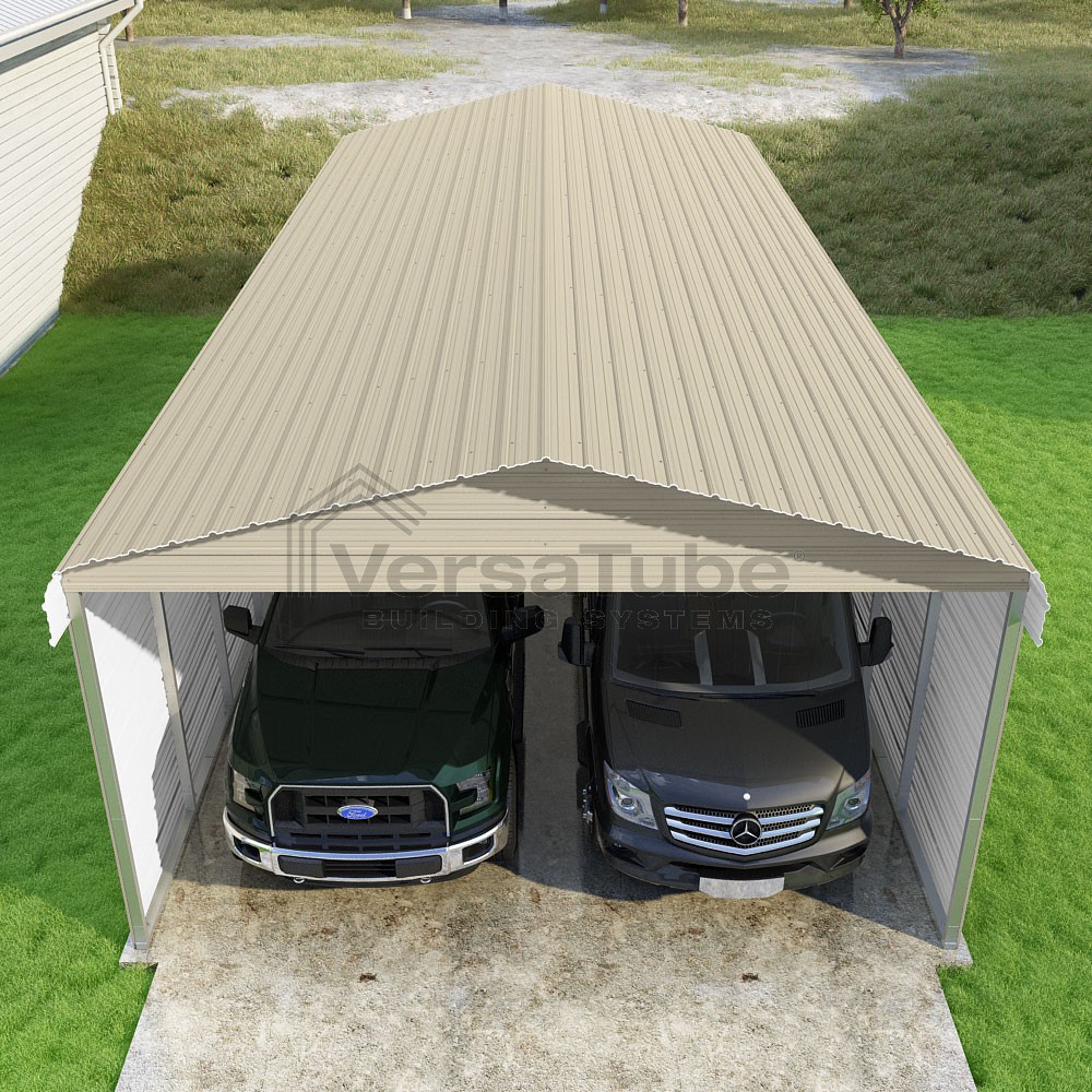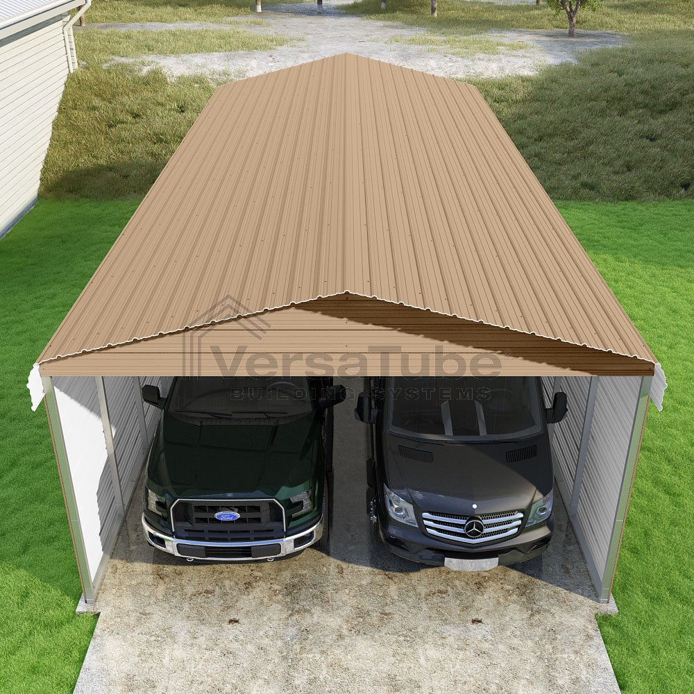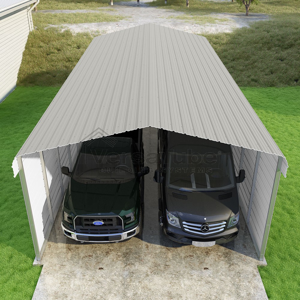 Classic Series DIY carport kit features horizontal application of sheet metal panels with the extra protection of rounded eaves.