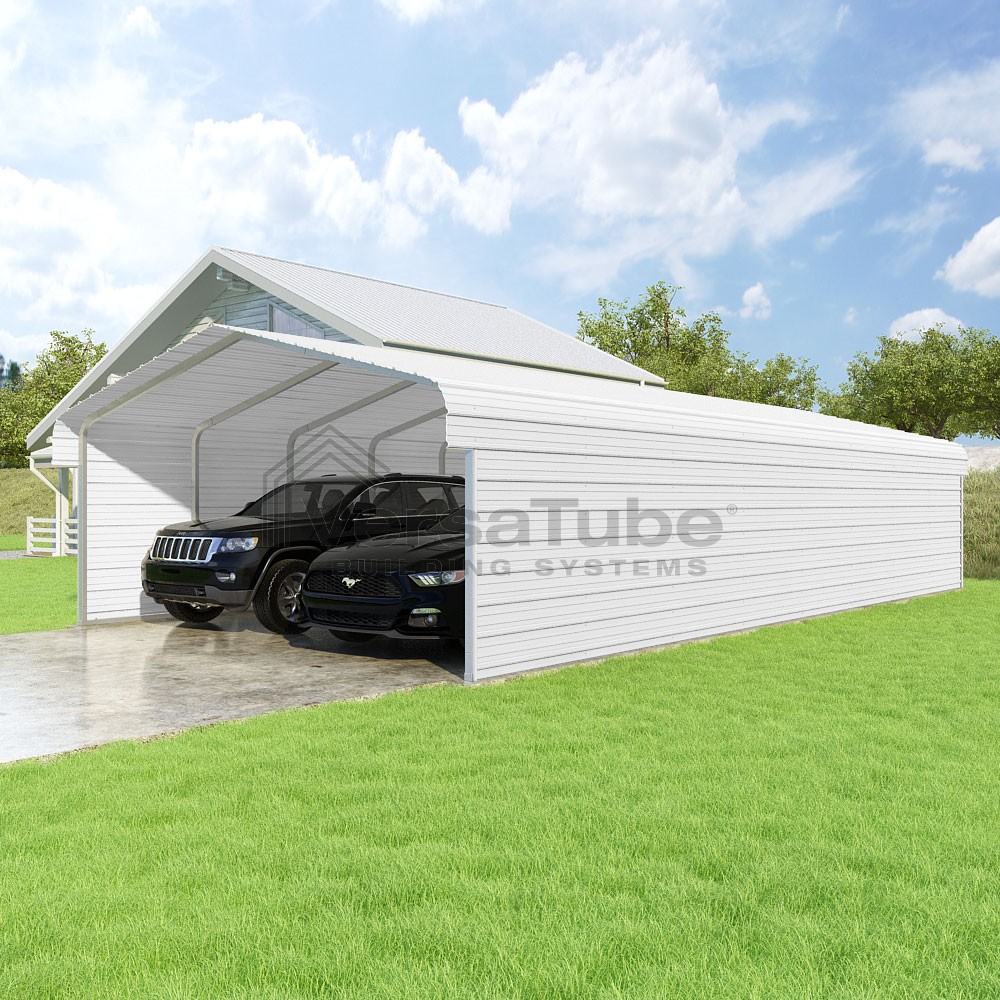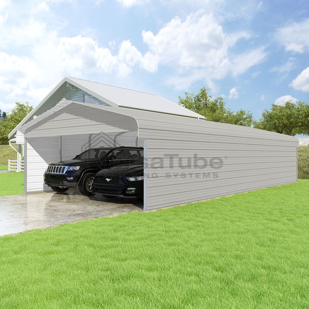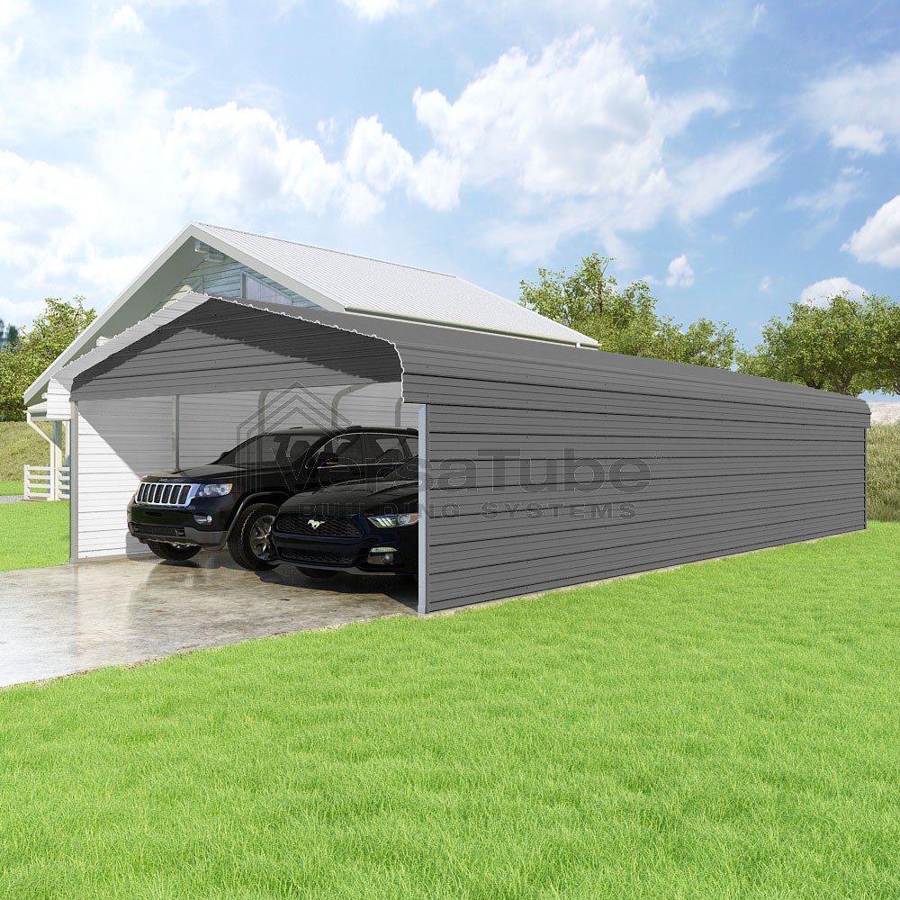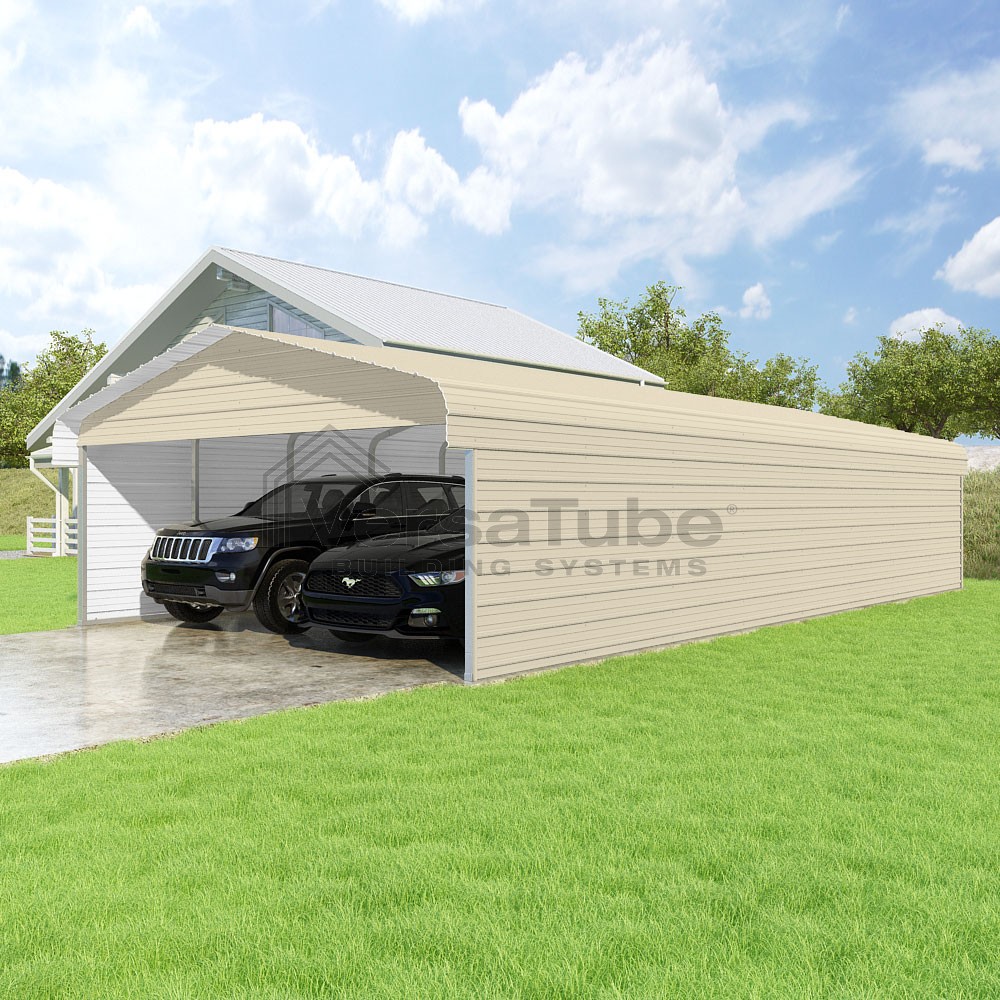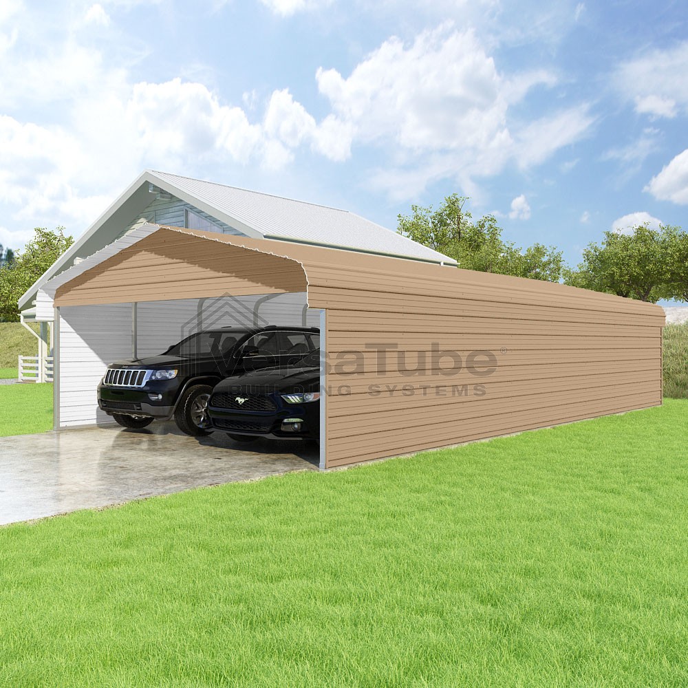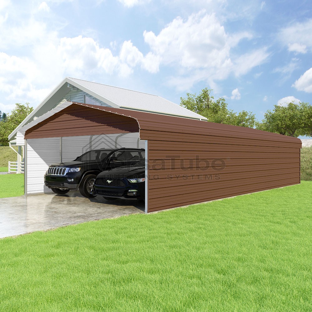 Classic Series DIY carport kit features horizontal application of sheet metal panels with the extra protection of rounded eaves.