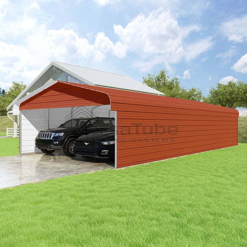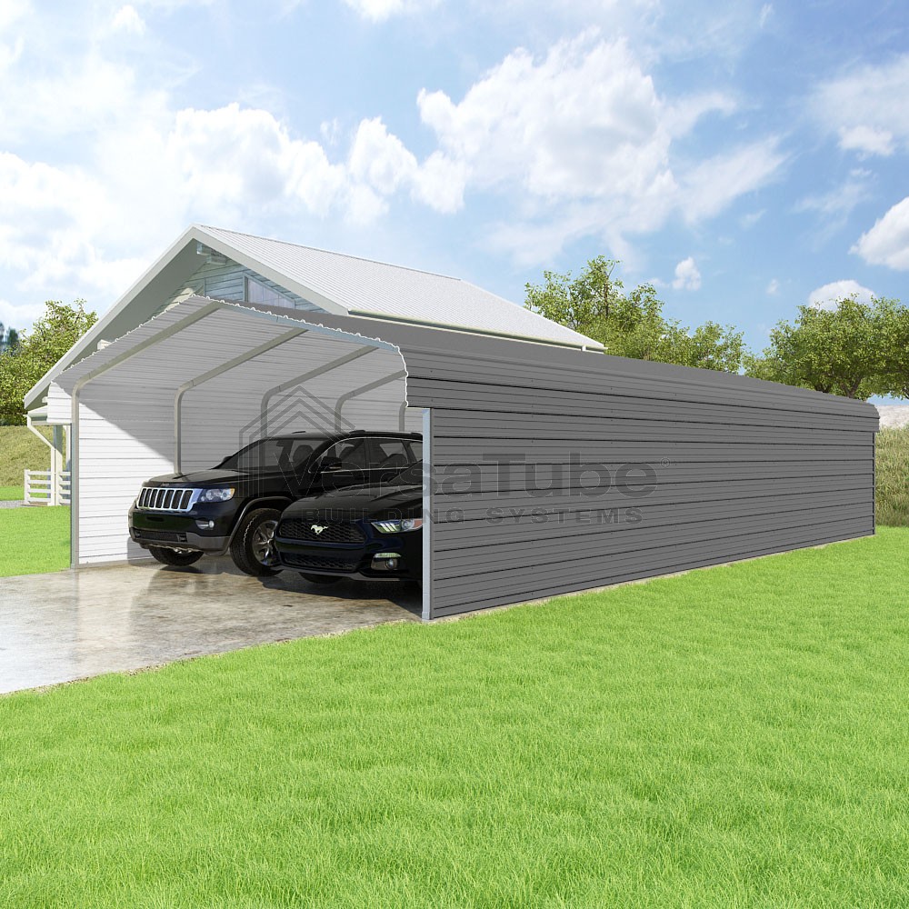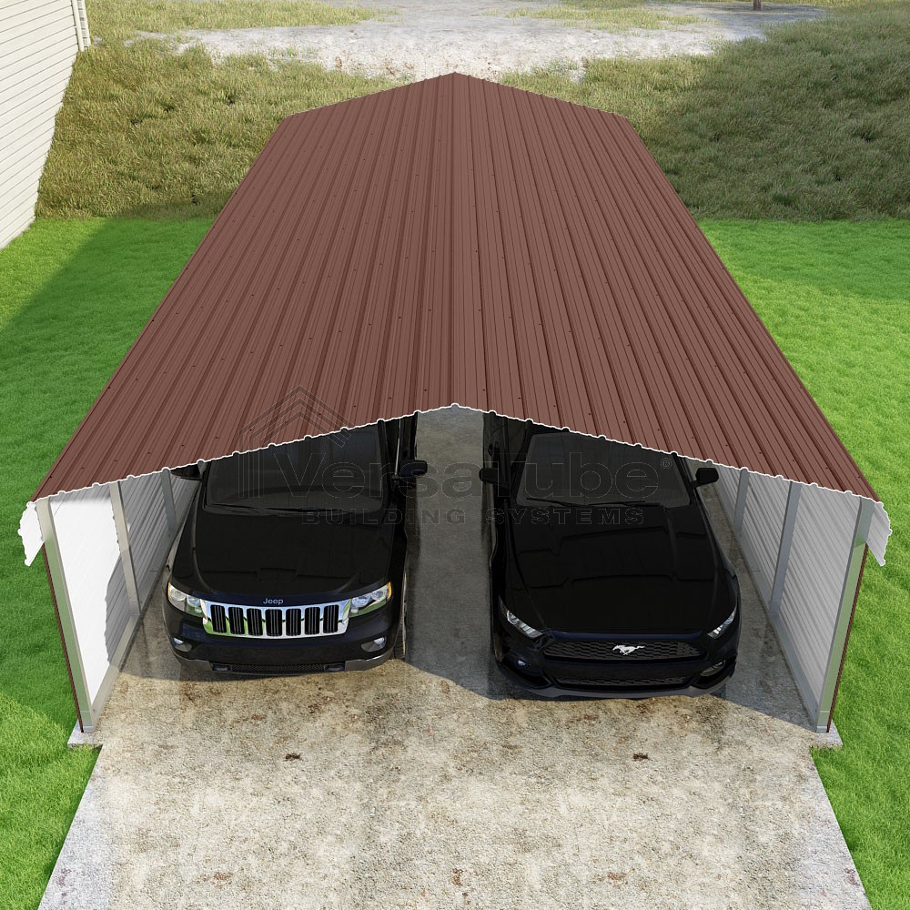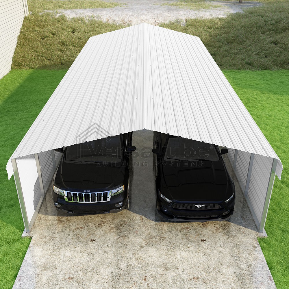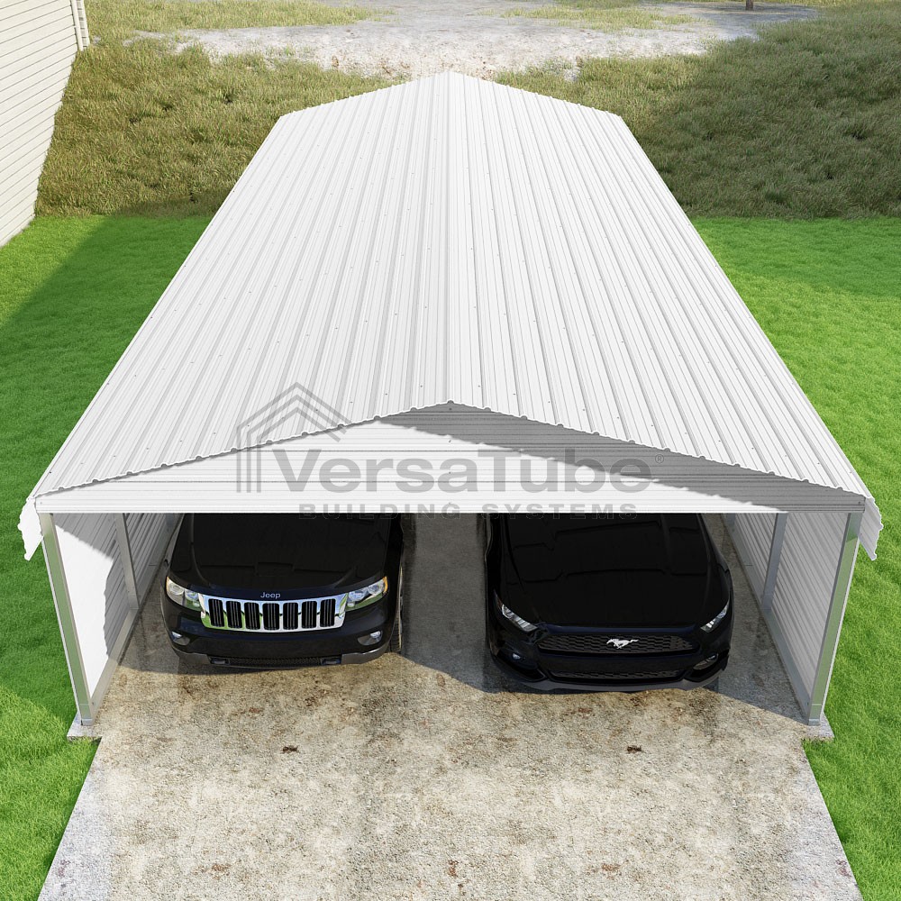 Classic Series DIY carport kit features horizontal application of sheet metal panels with the extra protection of rounded eaves.