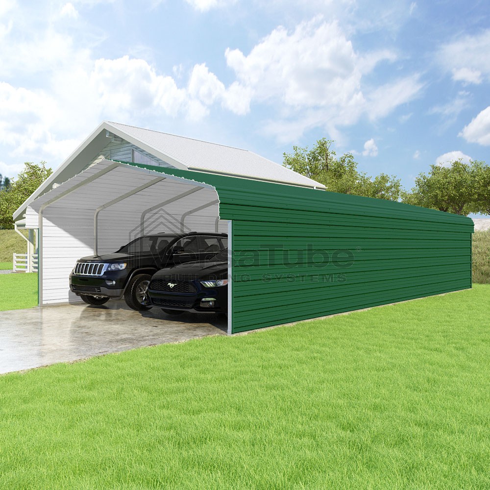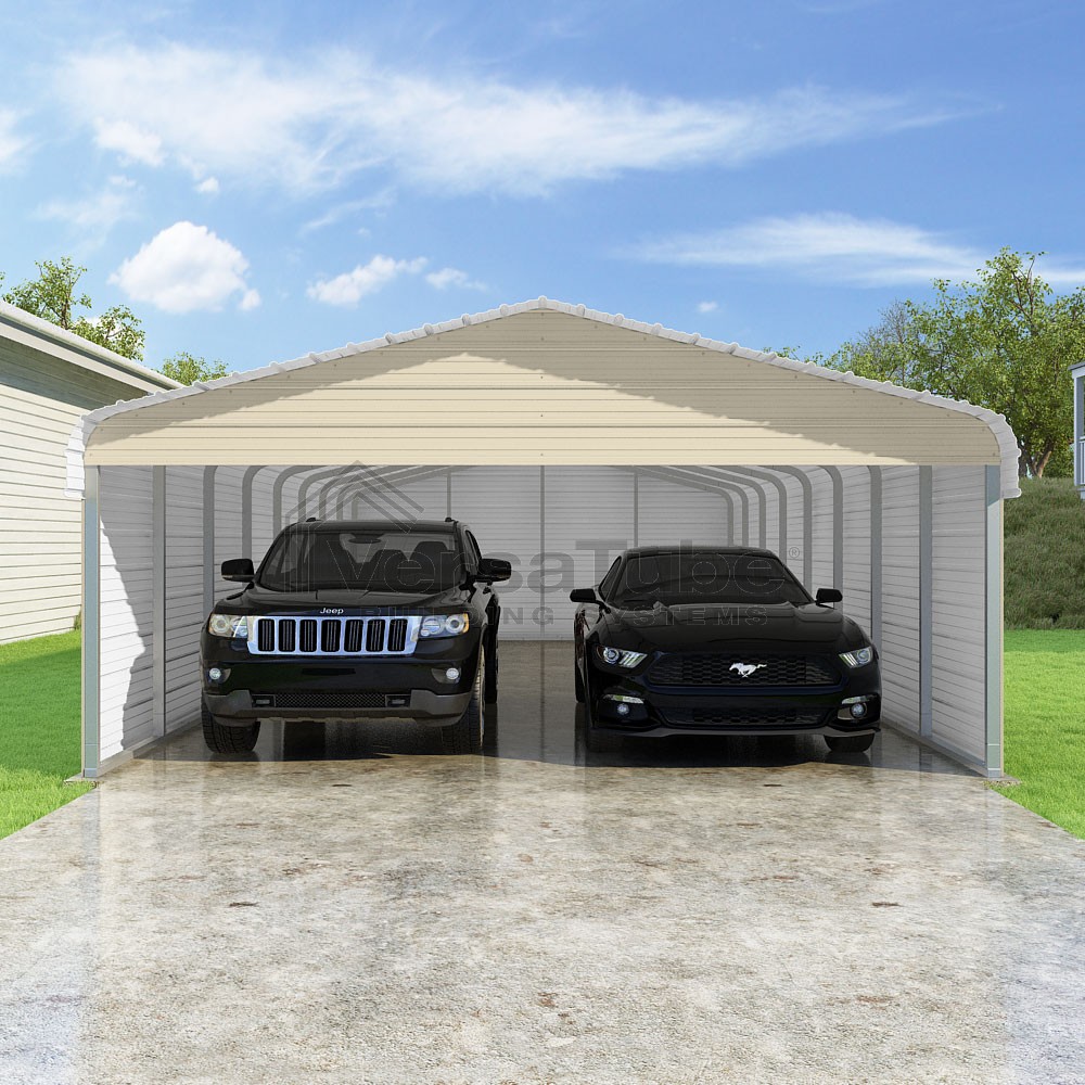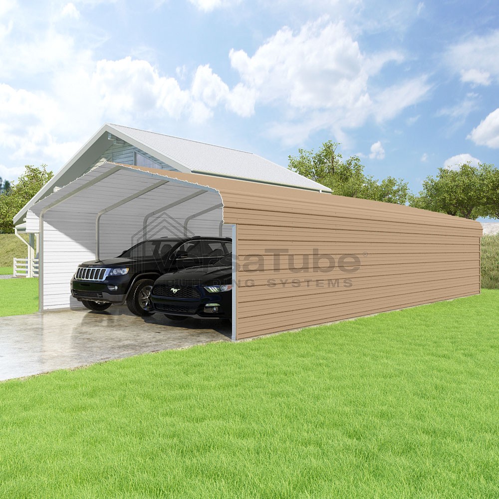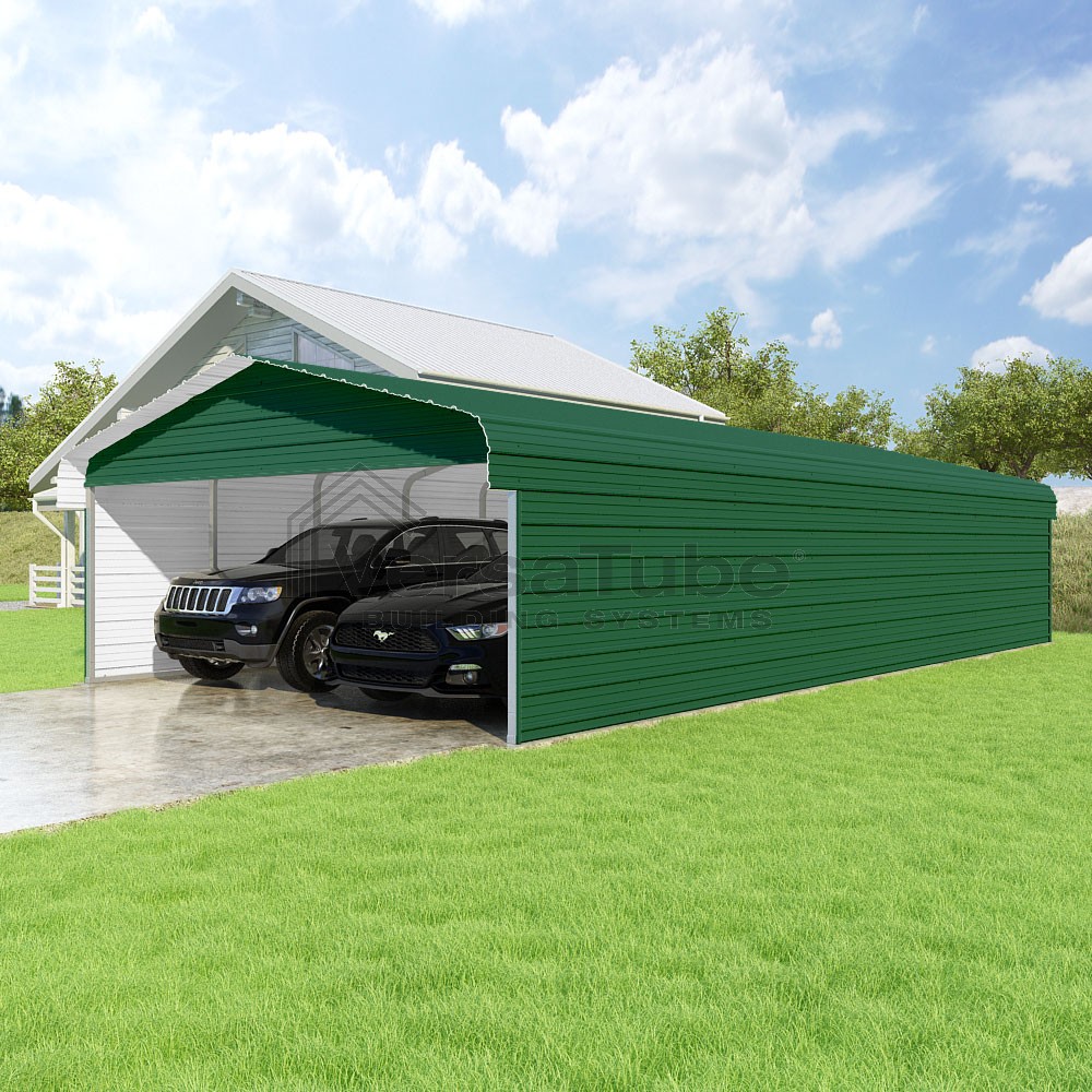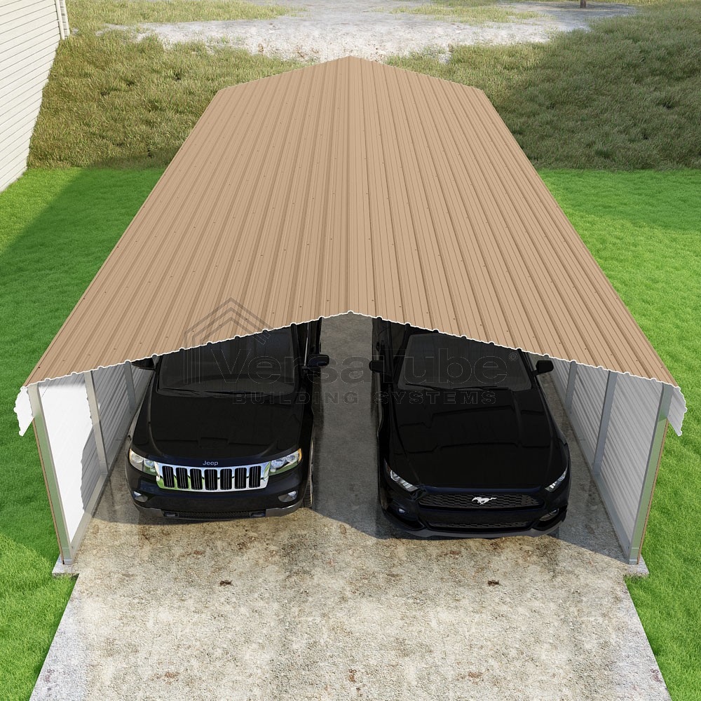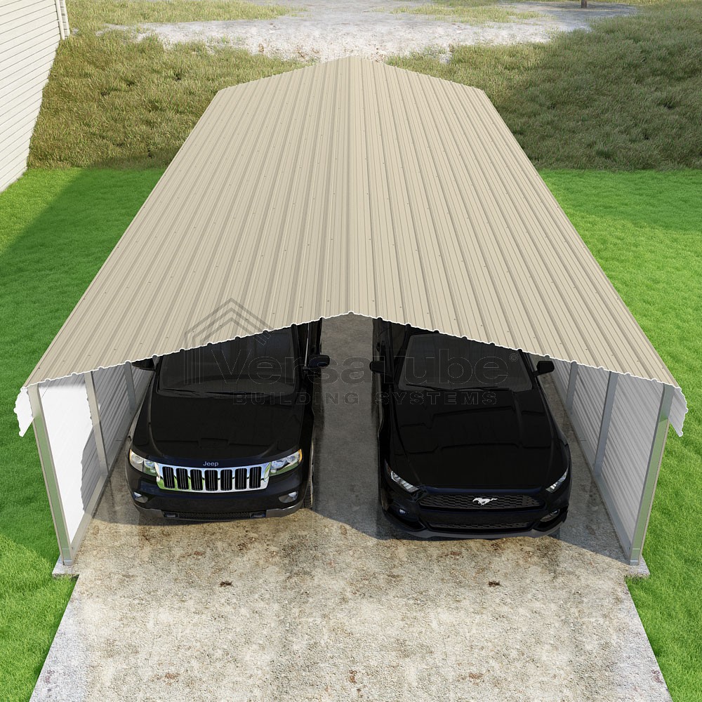 Classic Series DIY carport kit features horizontal application of sheet metal panels with the extra protection of rounded eaves.