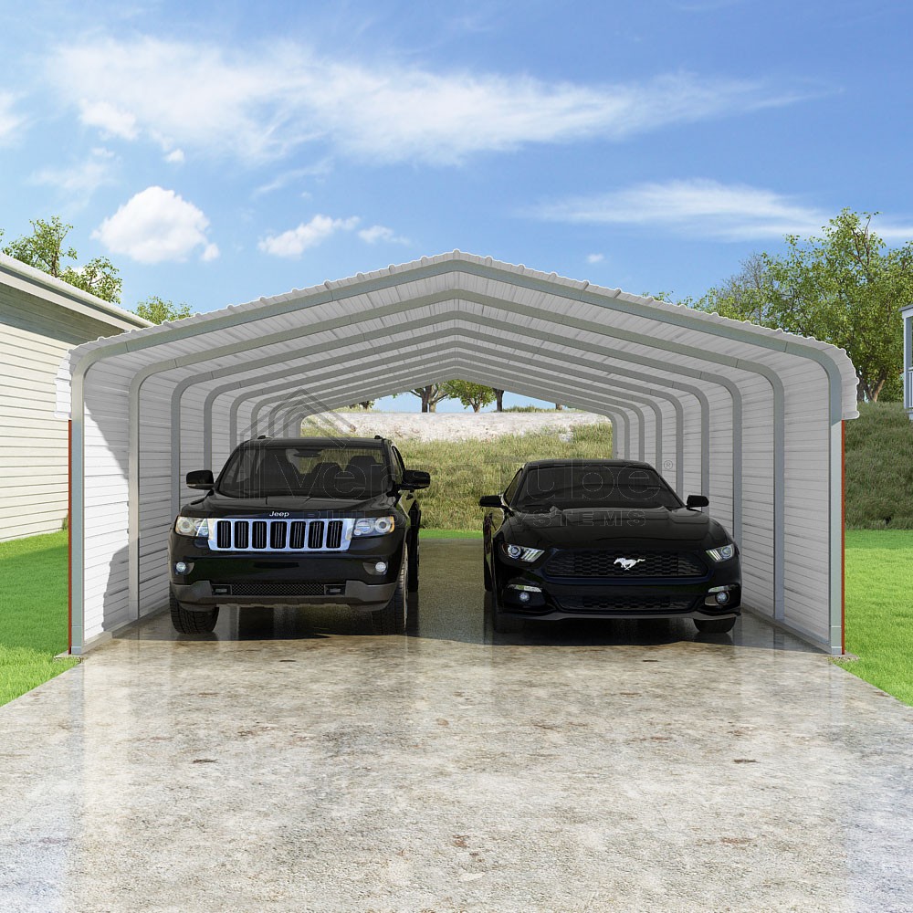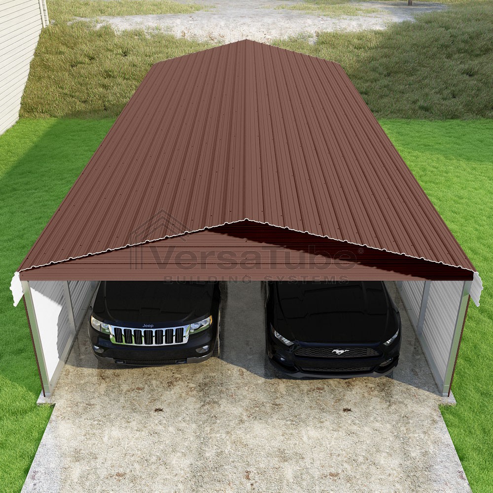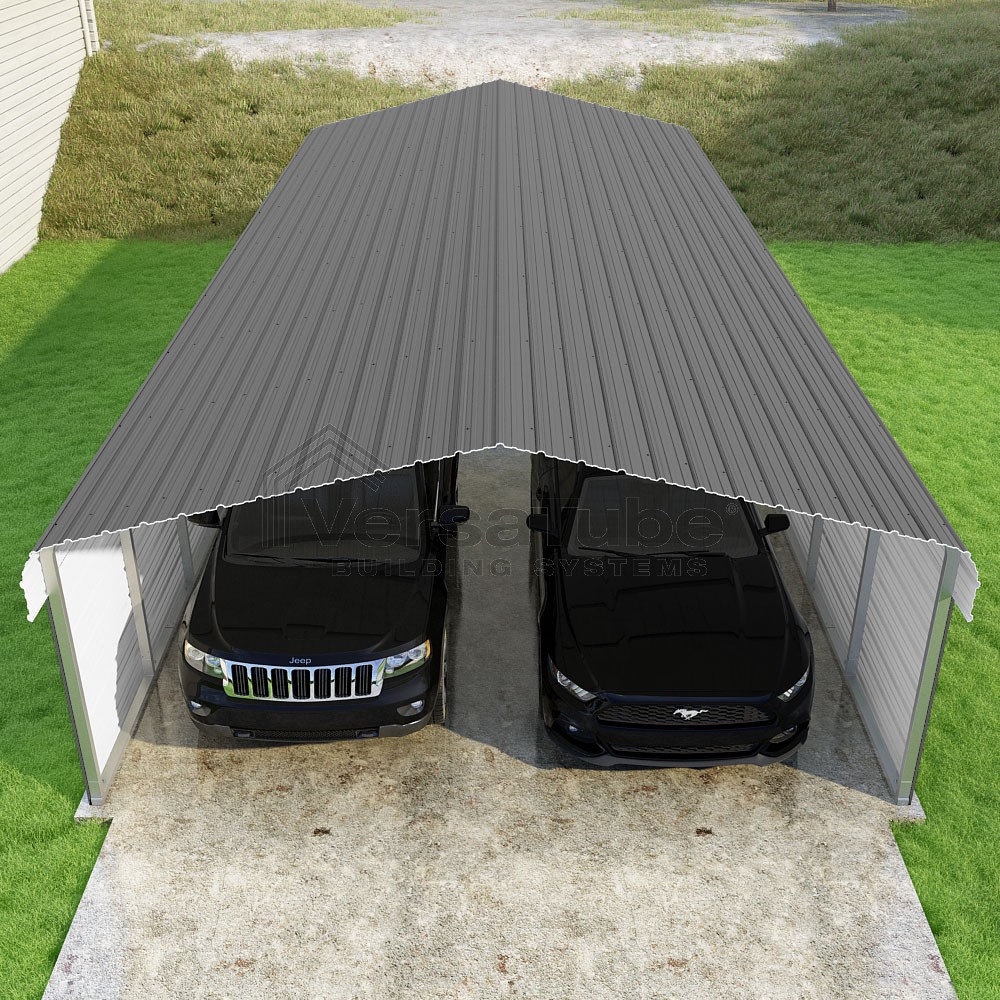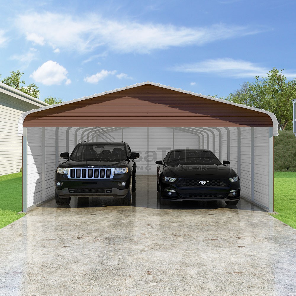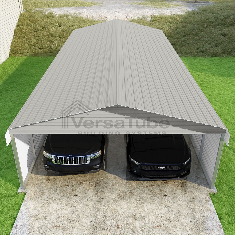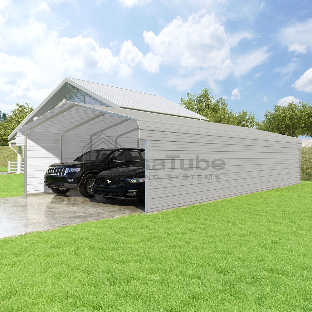 Classic Series DIY carport kit features horizontal application of sheet metal panels with the extra protection of rounded eaves.
