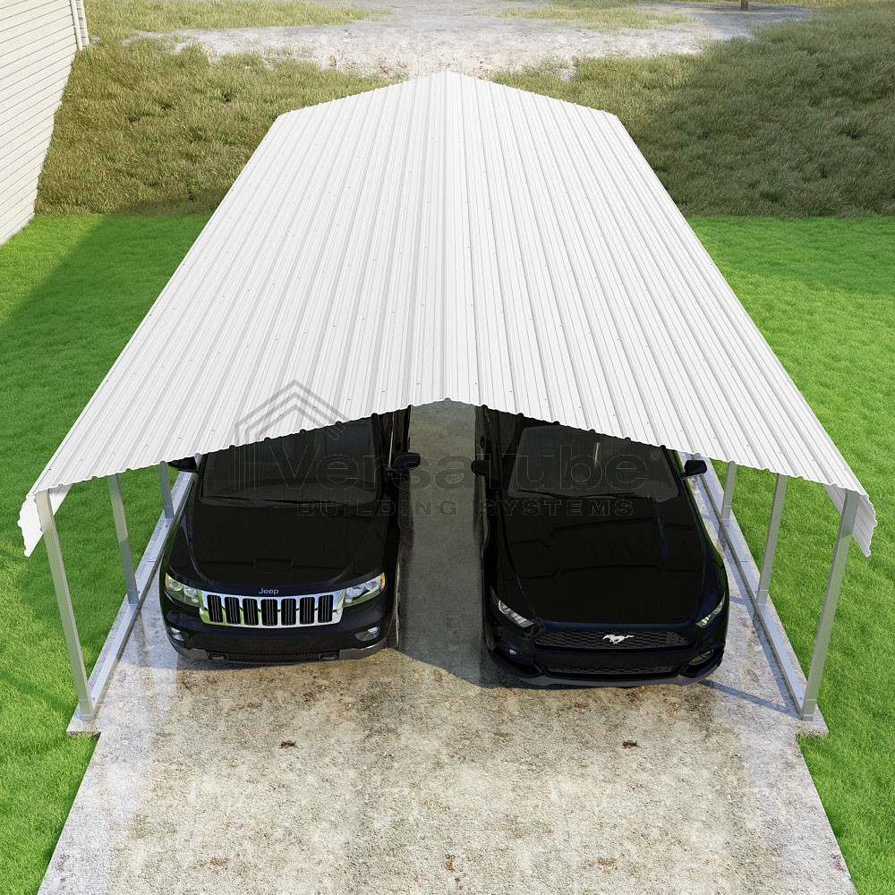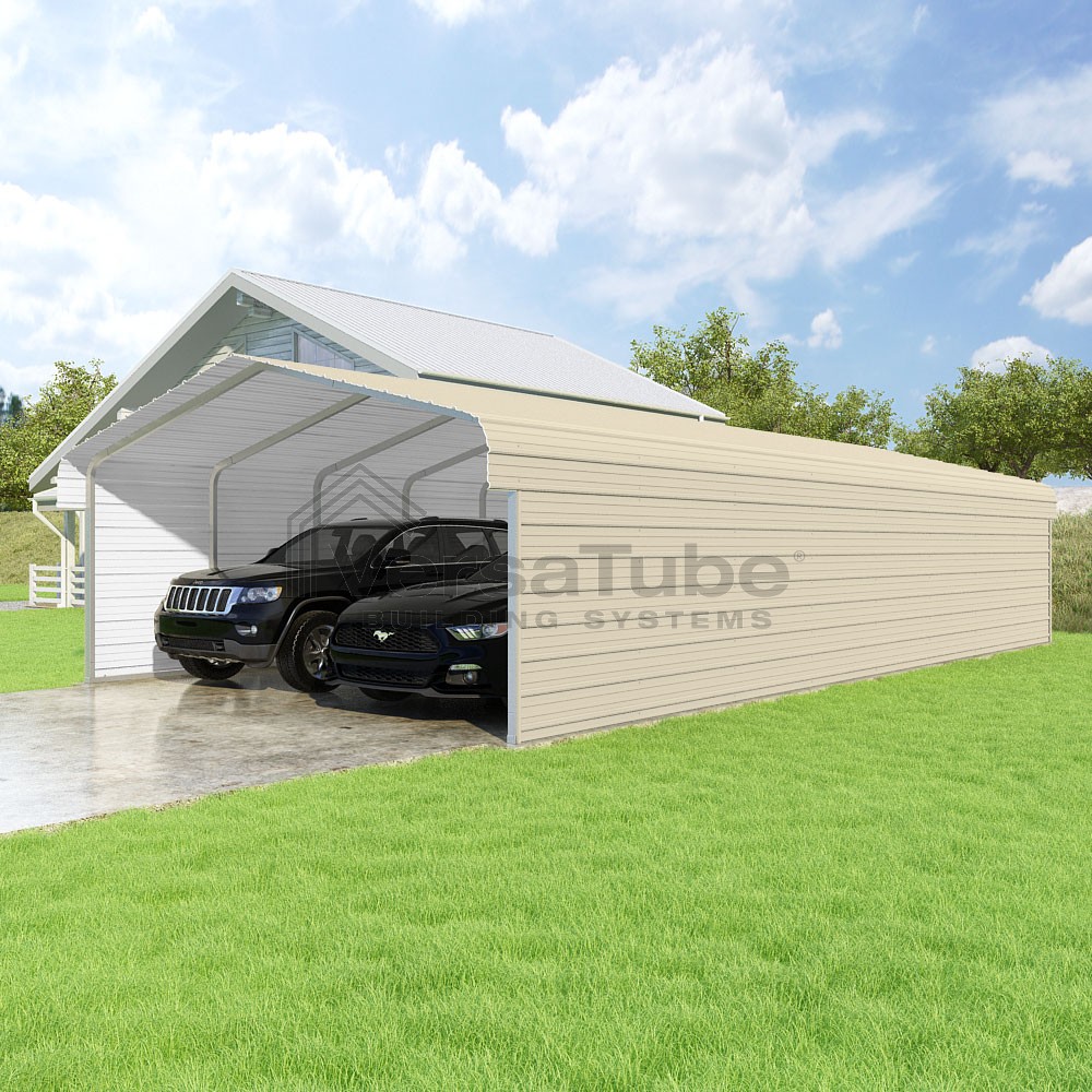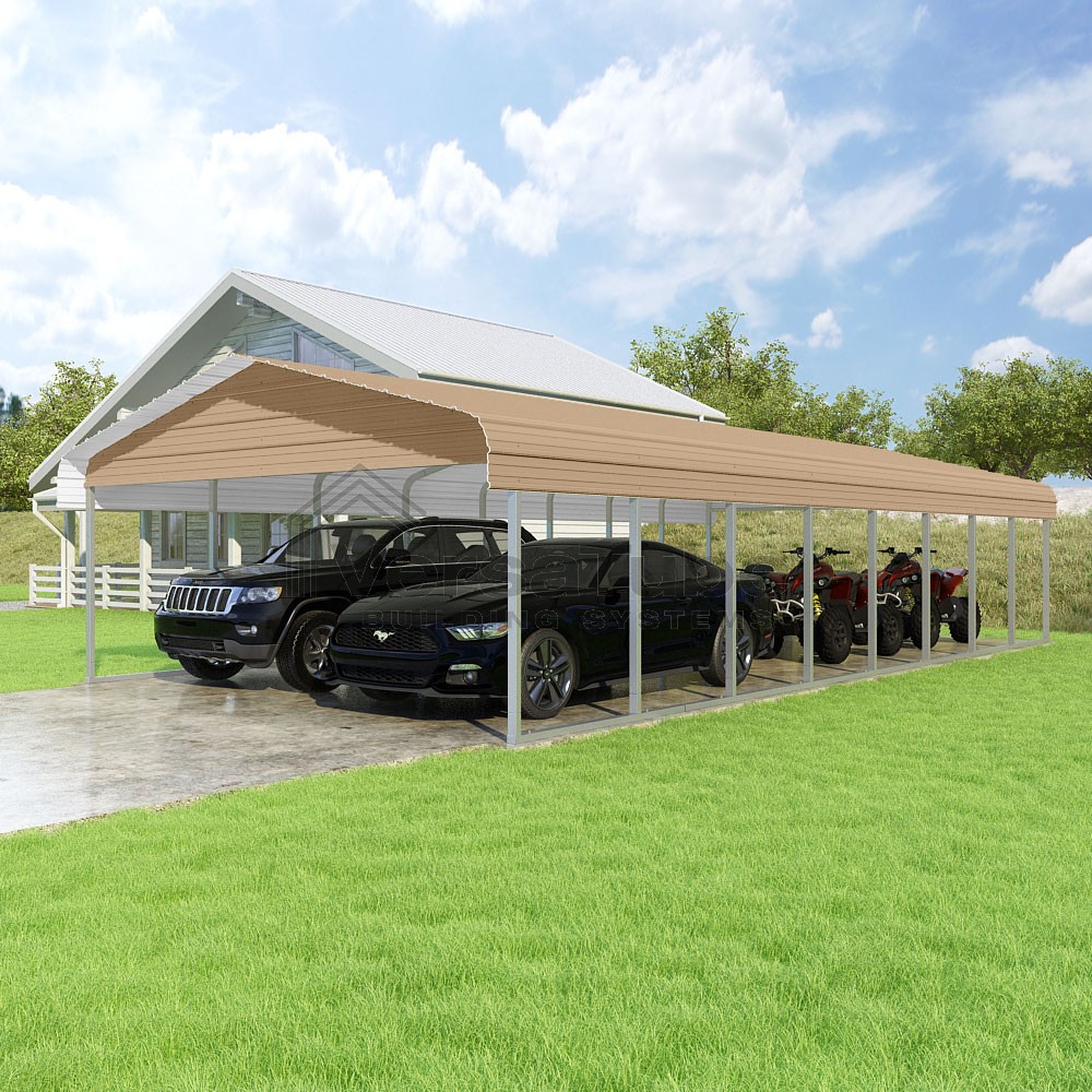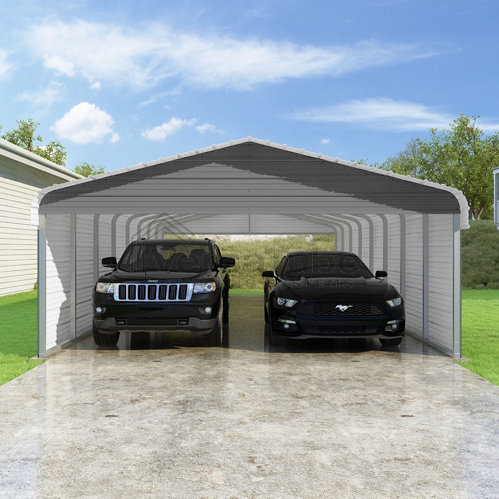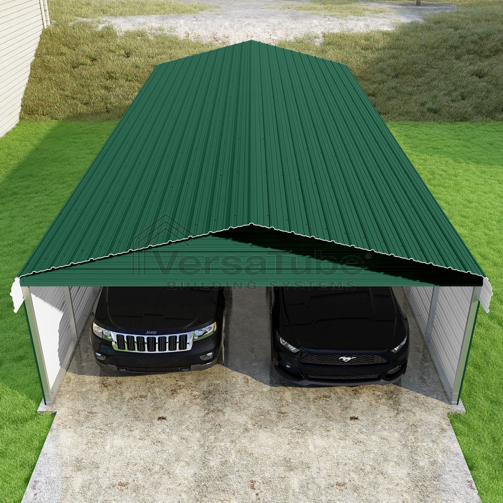 Classic Series DIY carport kit features horizontal application of sheet metal panels with the extra protection of rounded eaves.