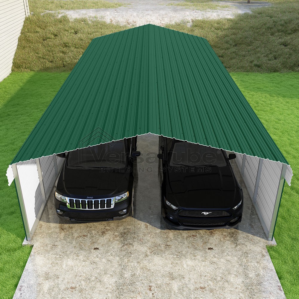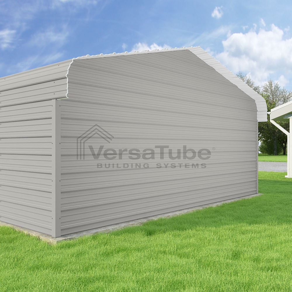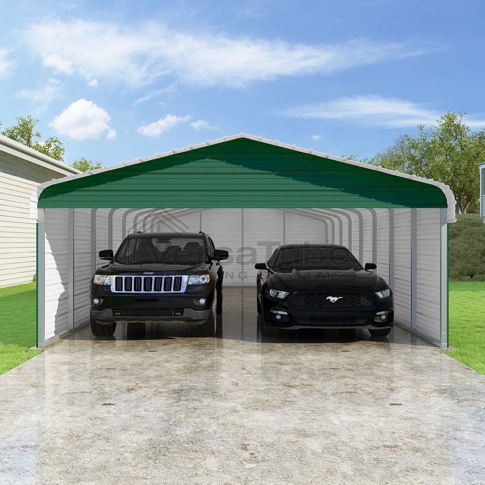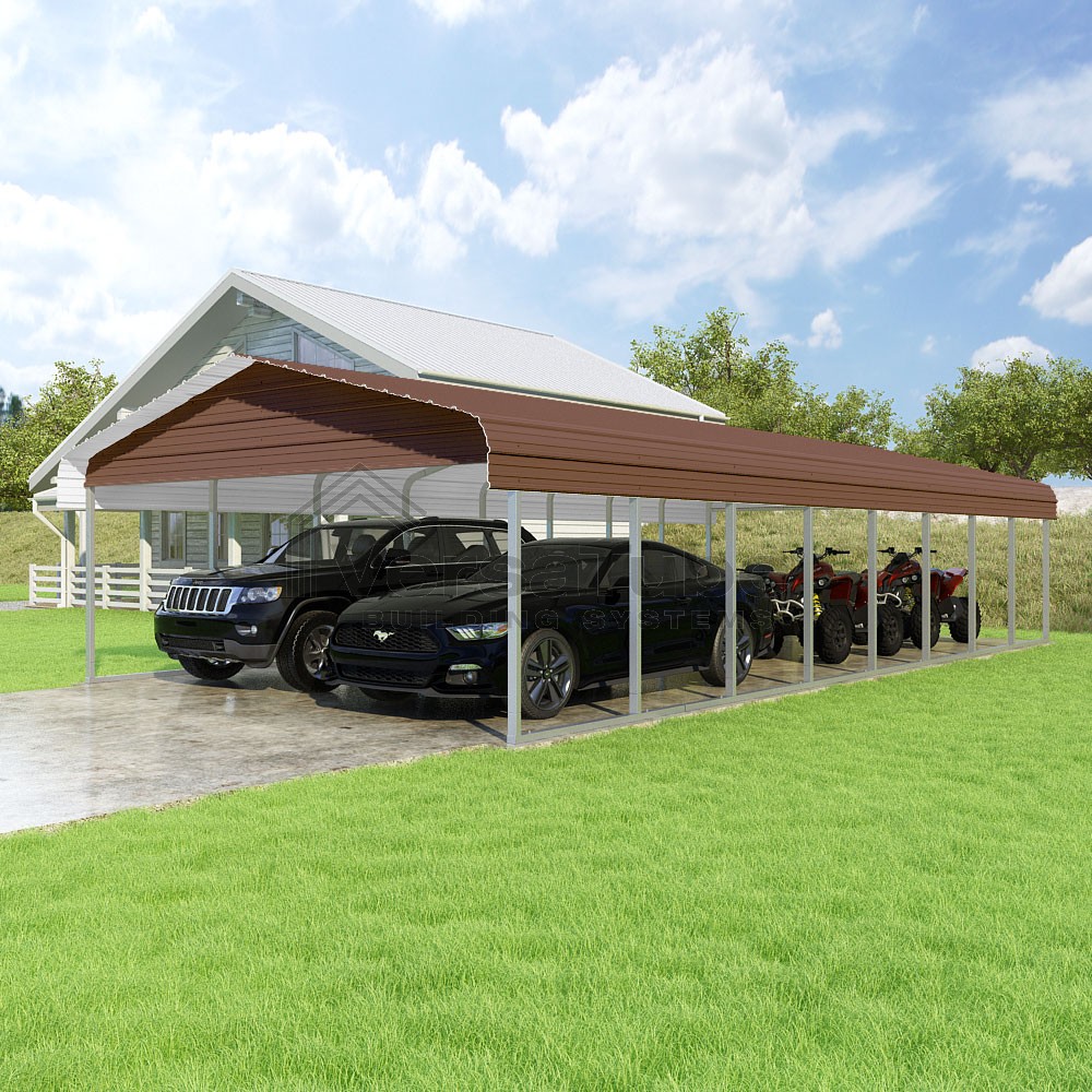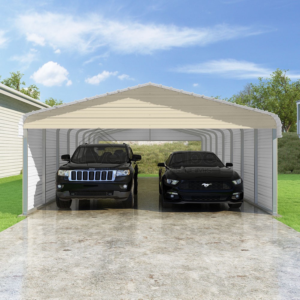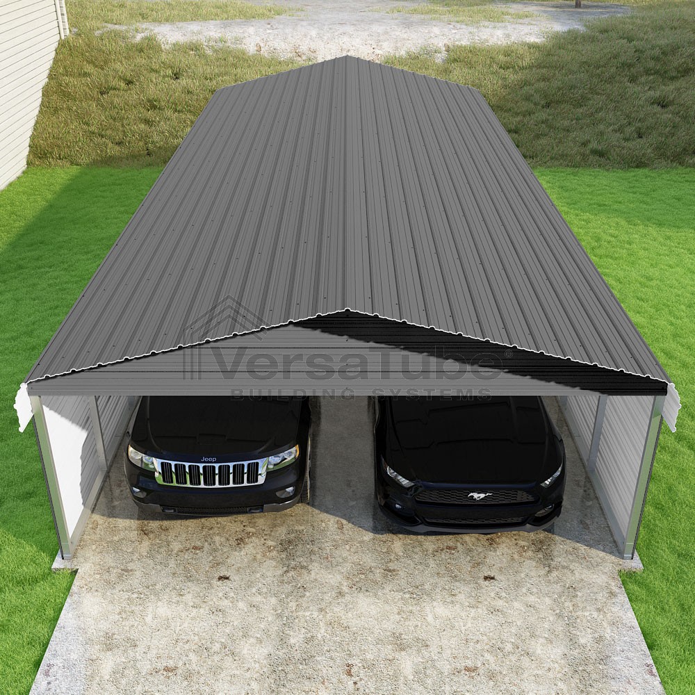 Classic Series DIY carport kit features horizontal application of sheet metal panels with the extra protection of rounded eaves.