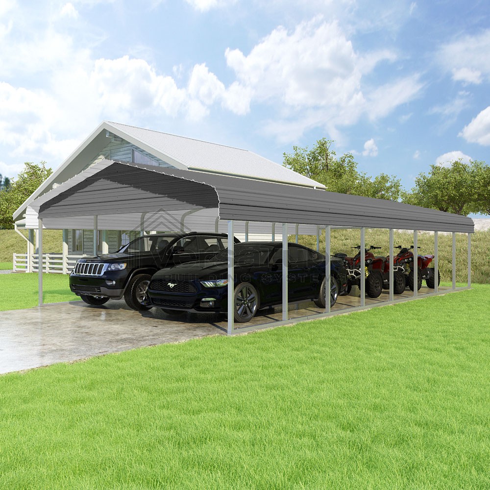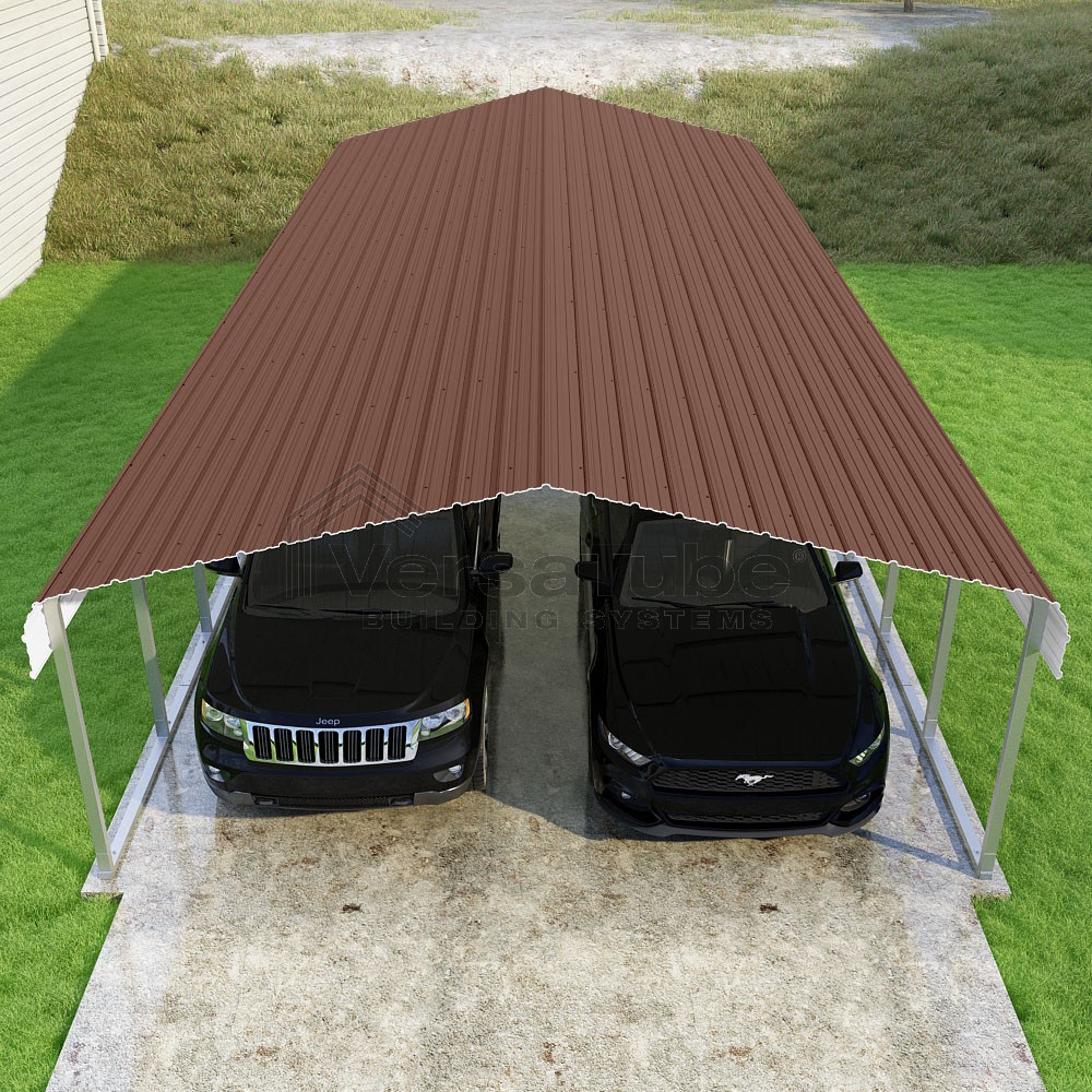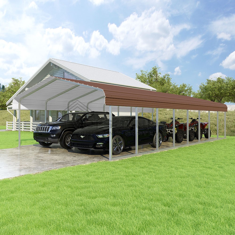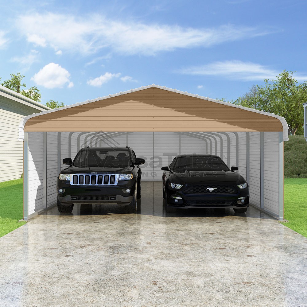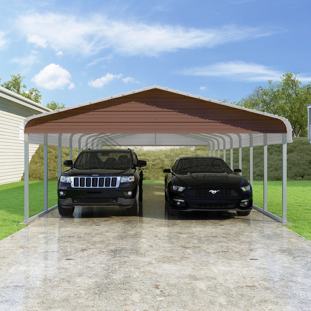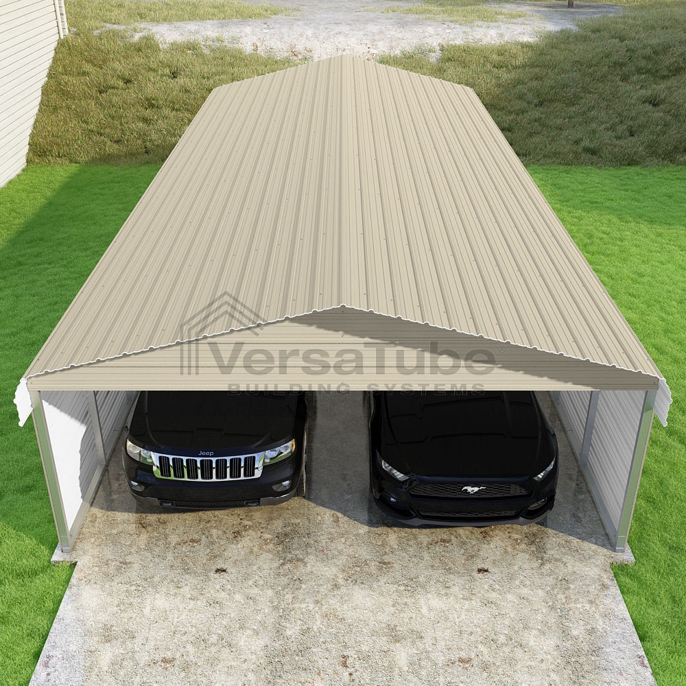 Classic Series DIY carport kit features horizontal application of sheet metal panels with the extra protection of rounded eaves.