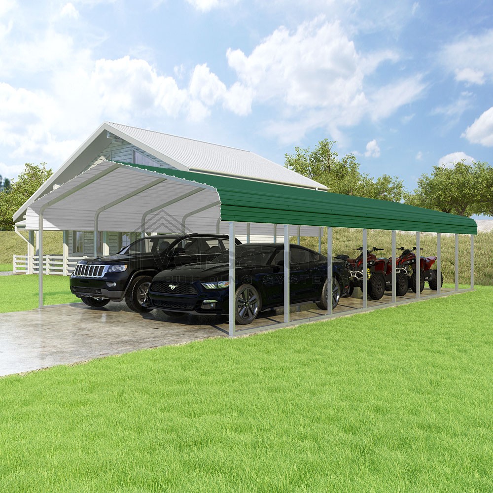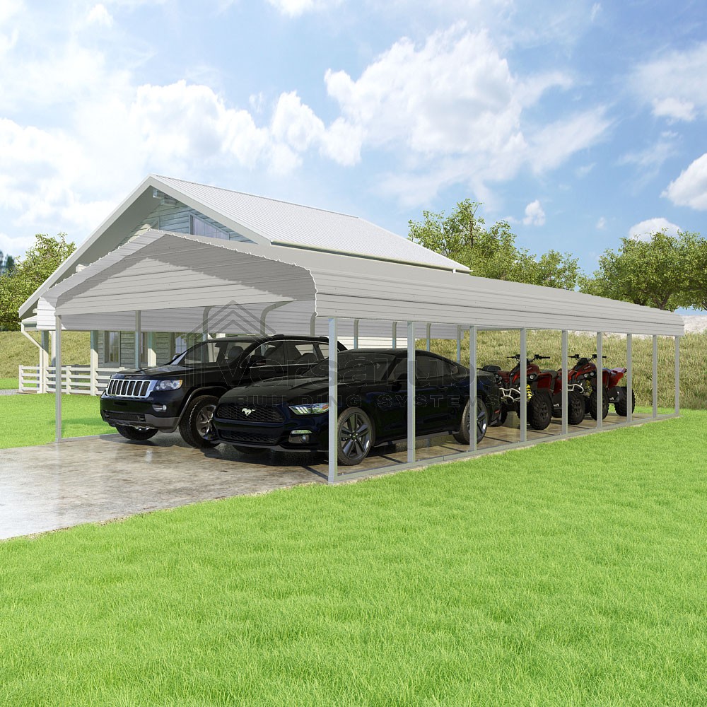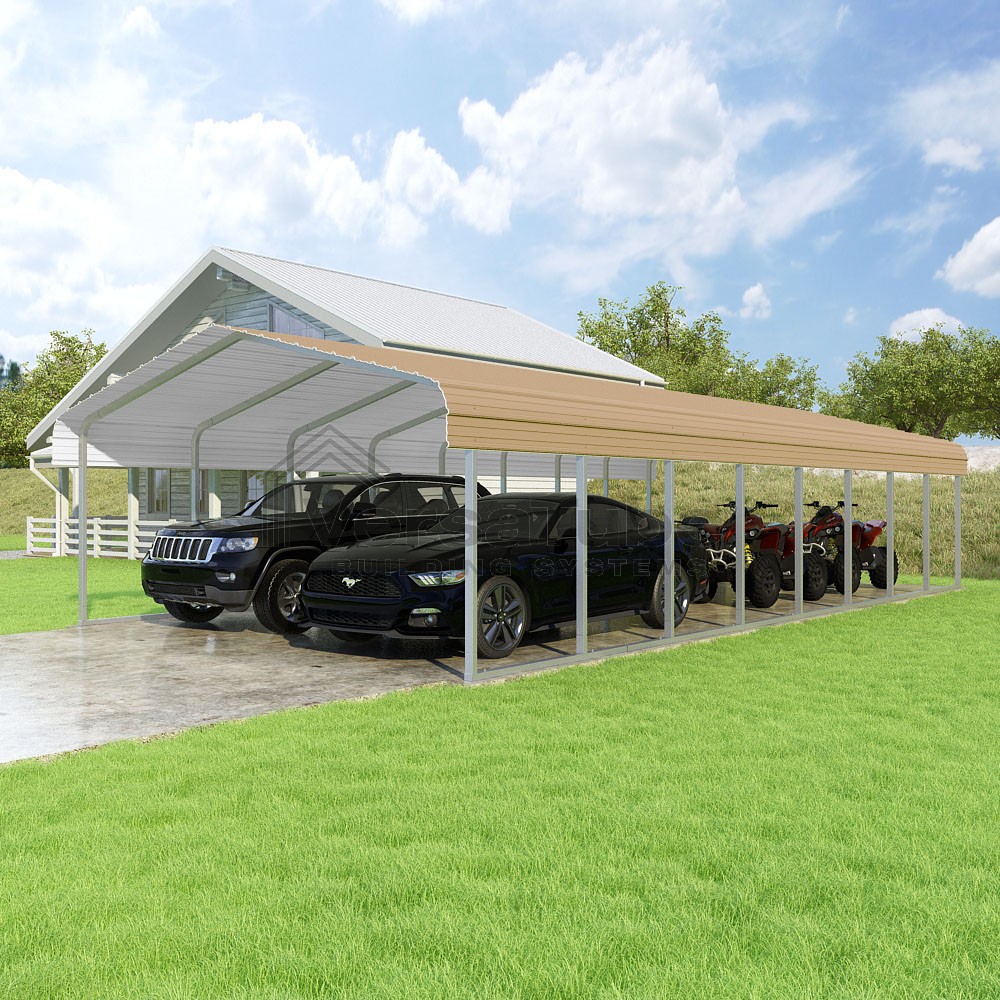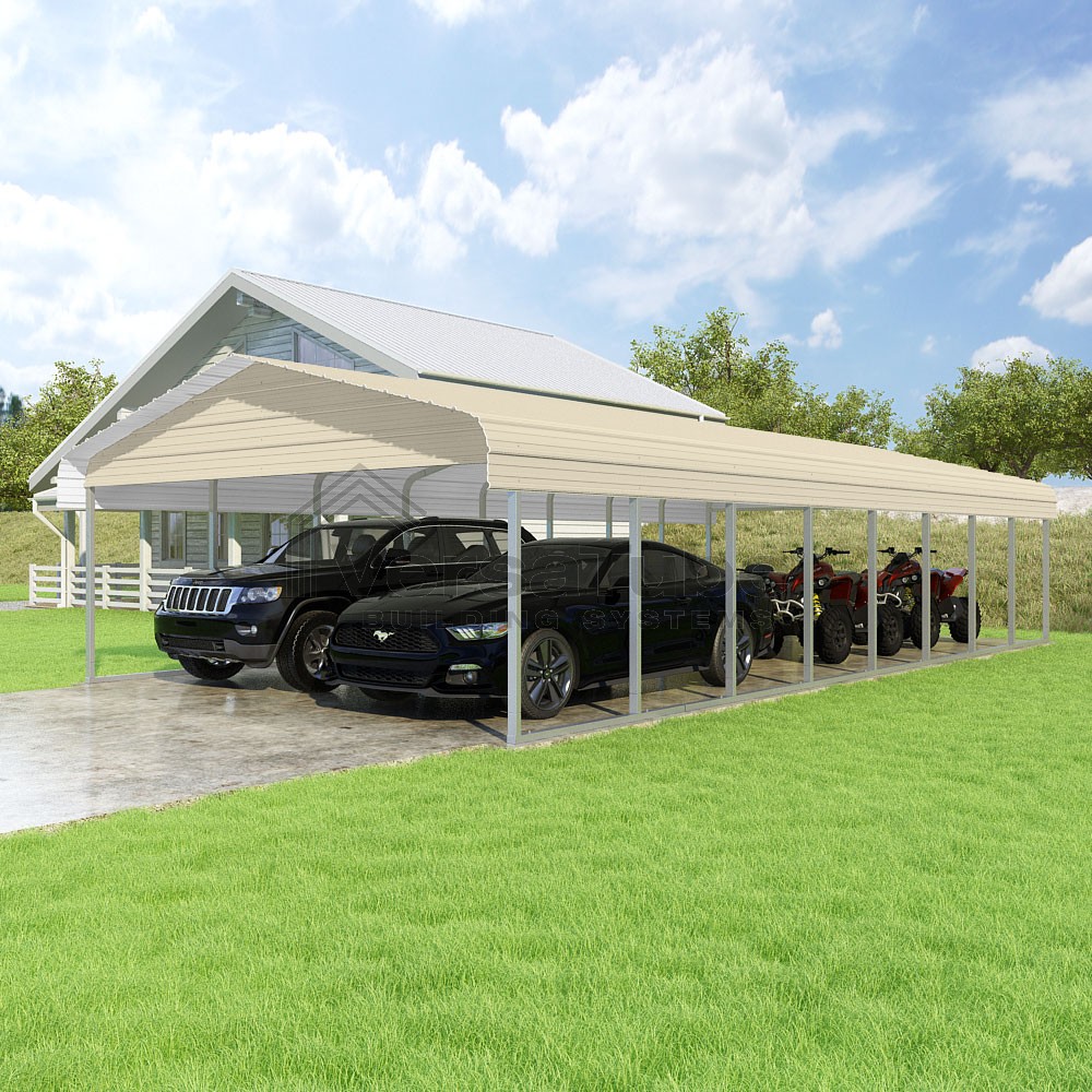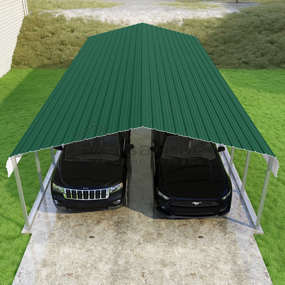 Classic Series DIY carport kit features horizontal application of sheet metal panels with the extra protection of rounded eaves.