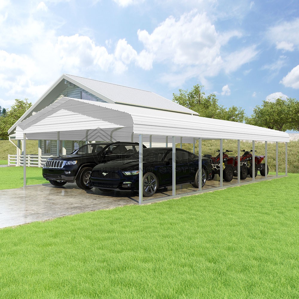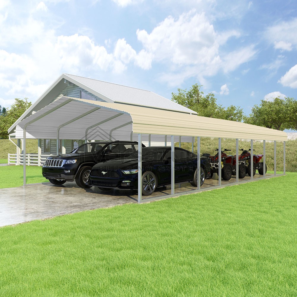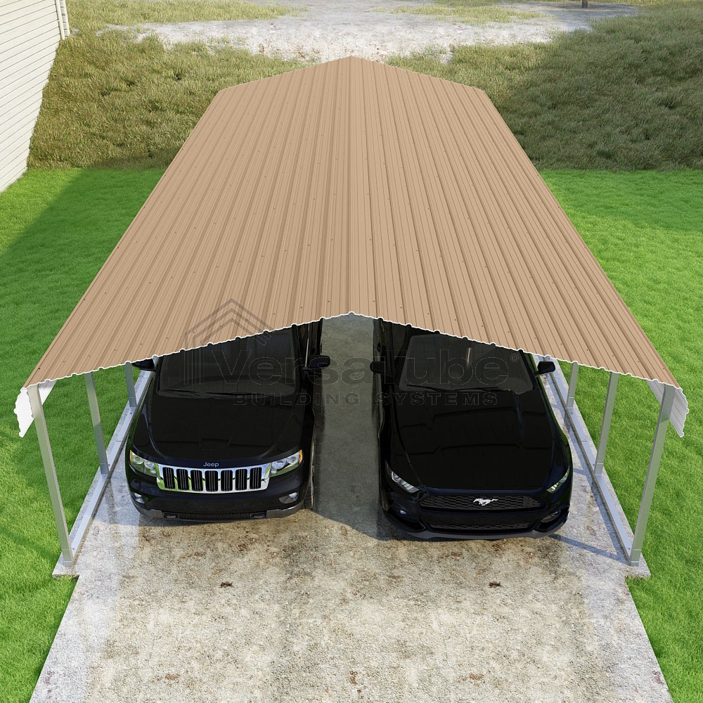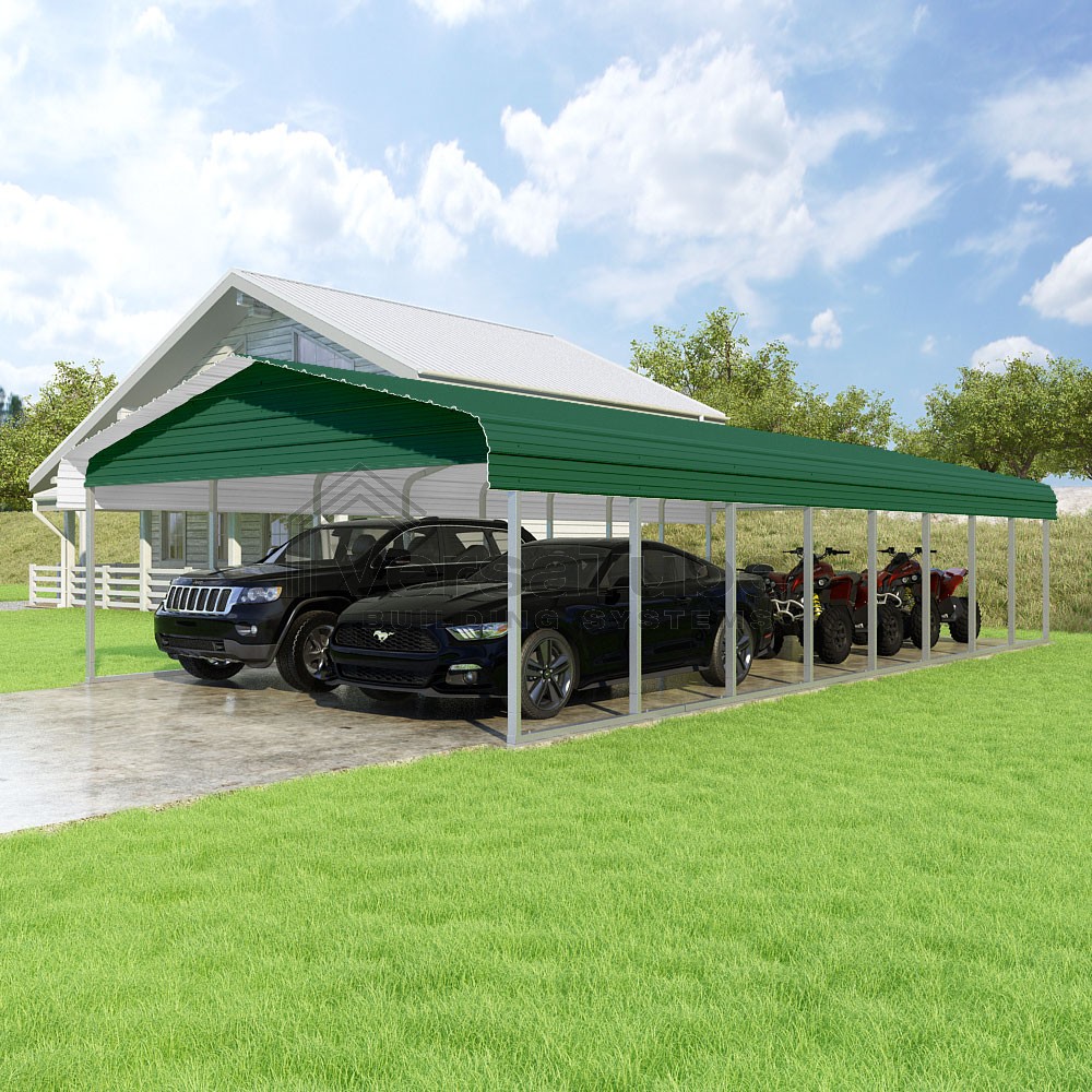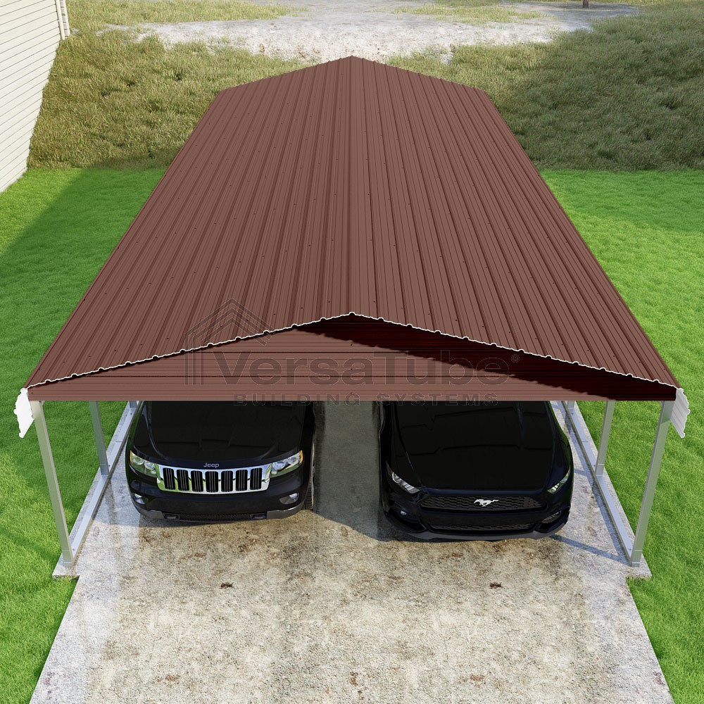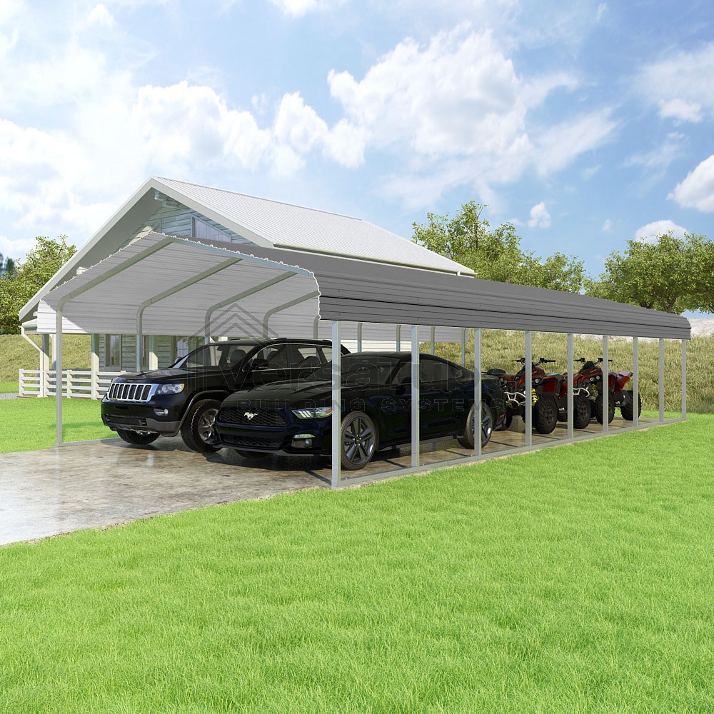 Classic Series DIY carport kit features horizontal application of sheet metal panels with the extra protection of rounded eaves.