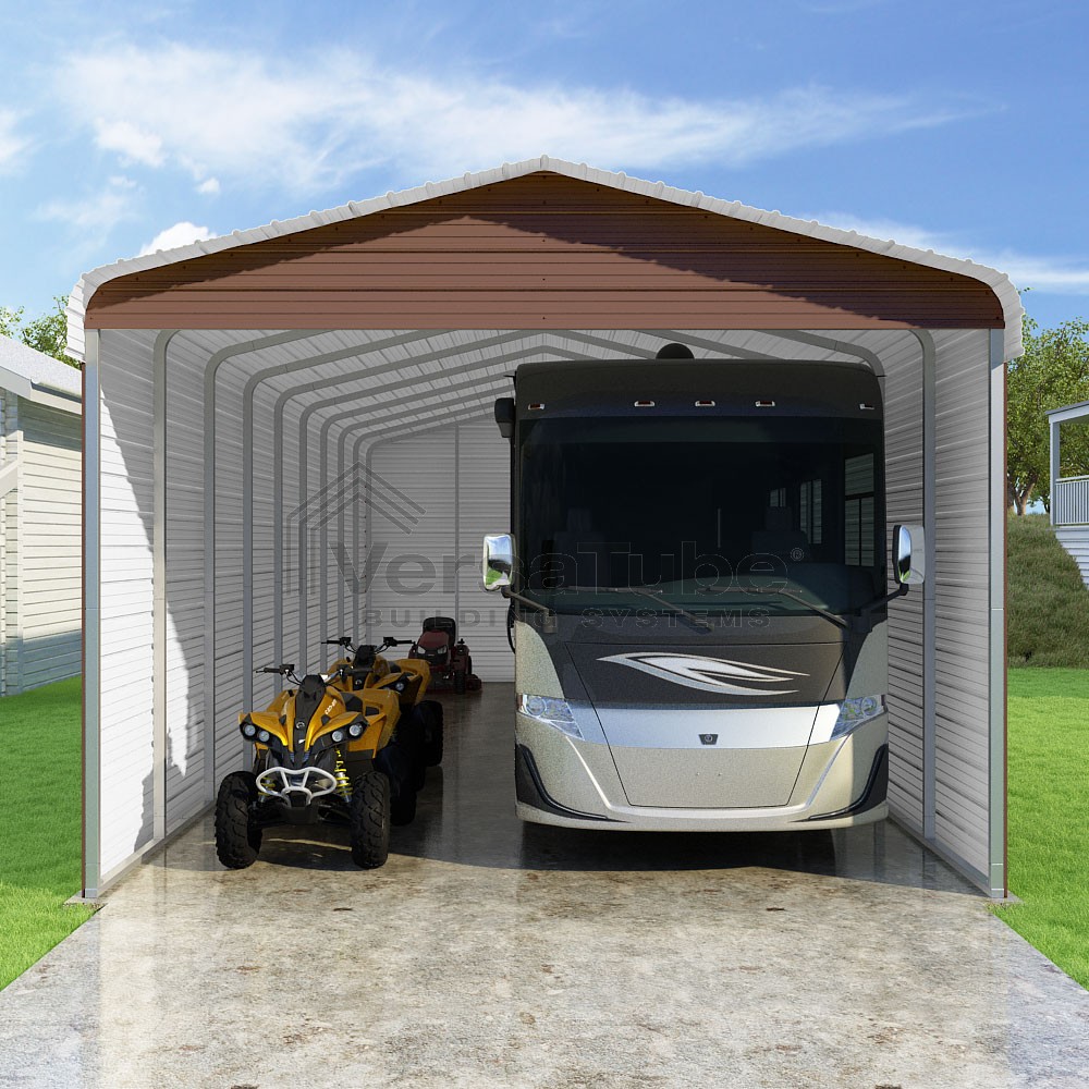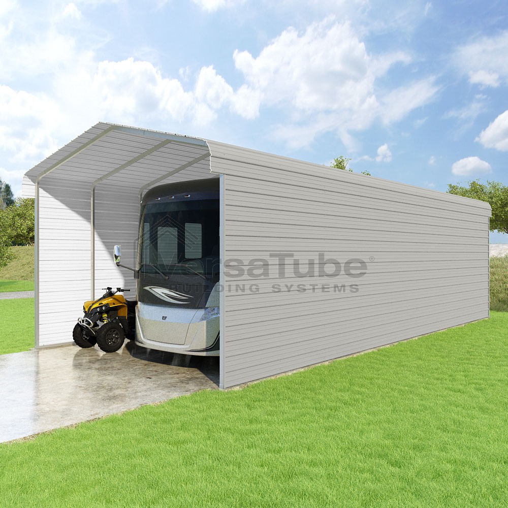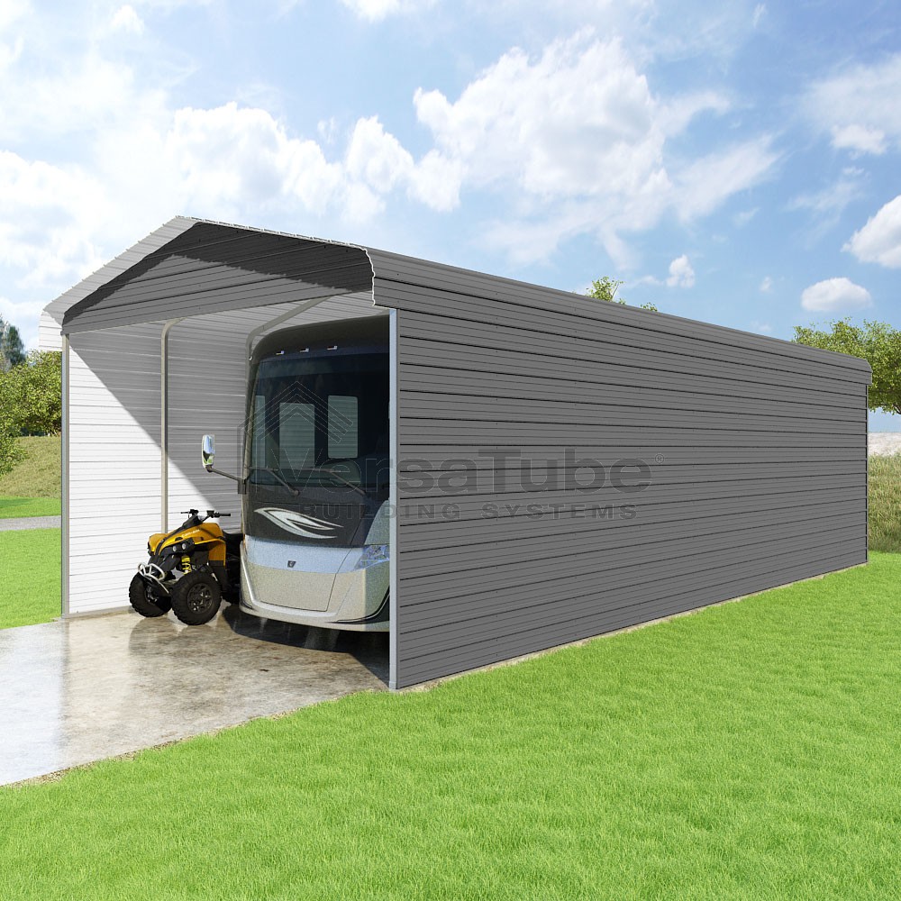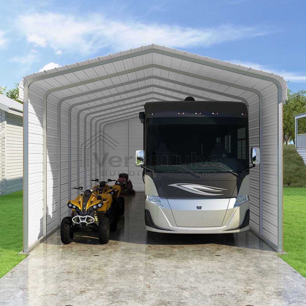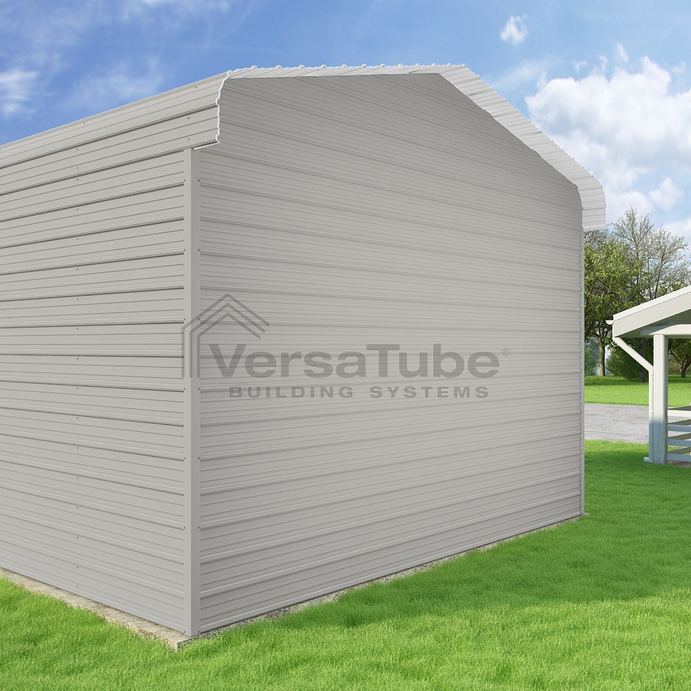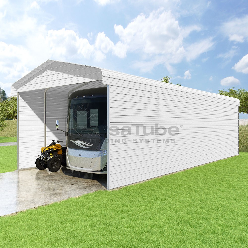Classic Series DIY carport kit features horizontal application of sheet metal panels with the extra protection of rounded eaves.