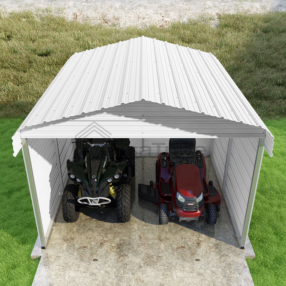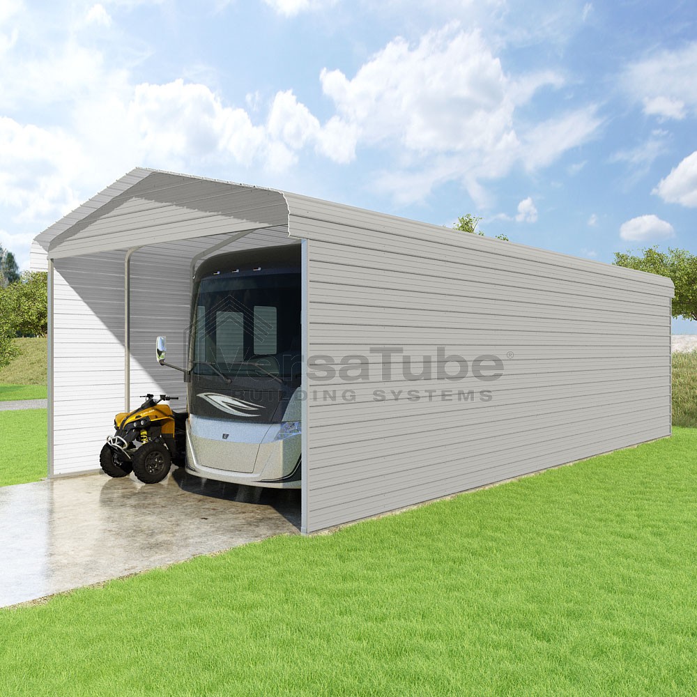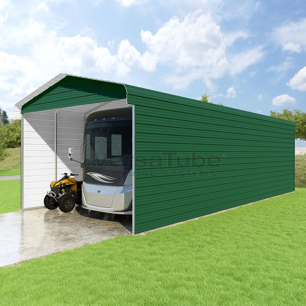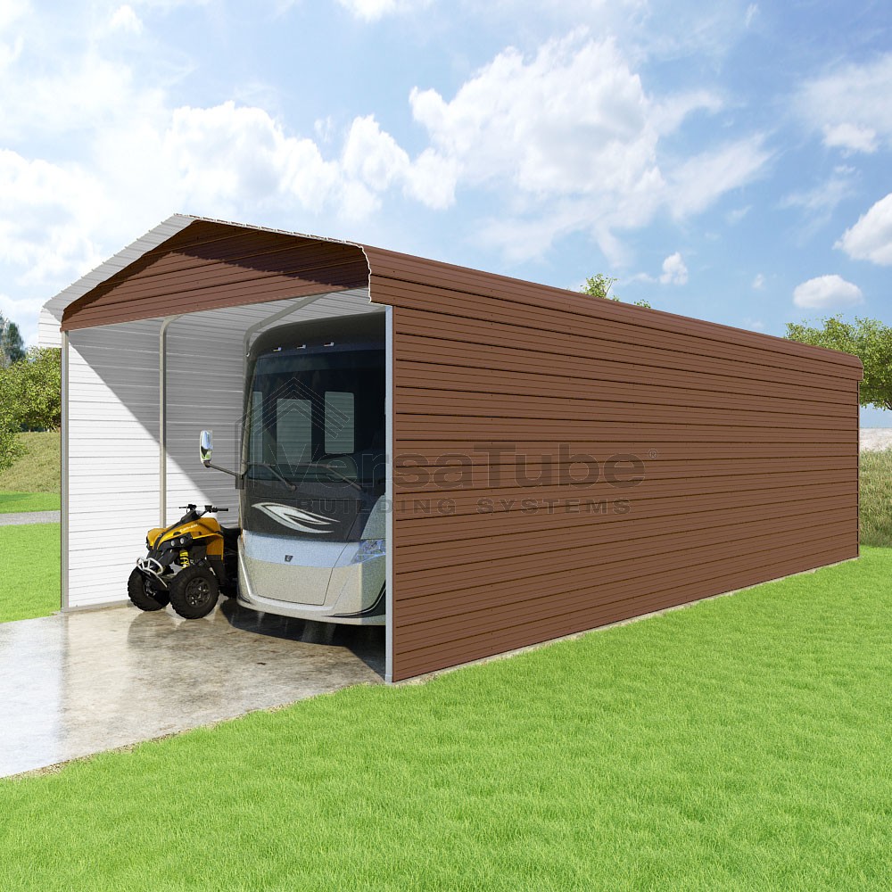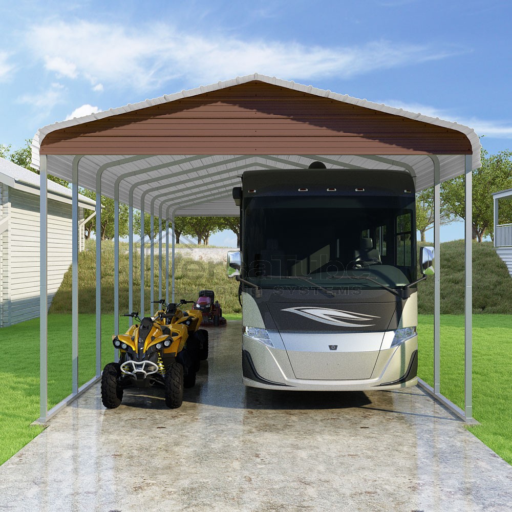 Classic Series DIY carport kit features horizontal application of sheet metal panels with the extra protection of rounded eaves.