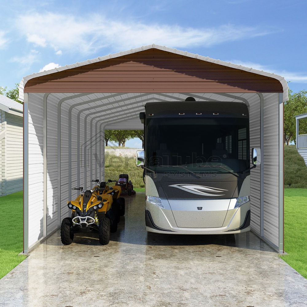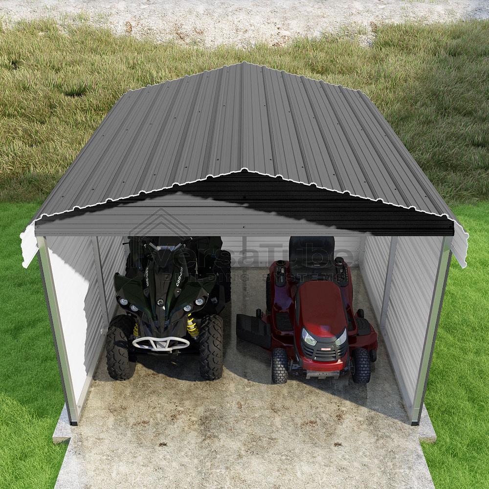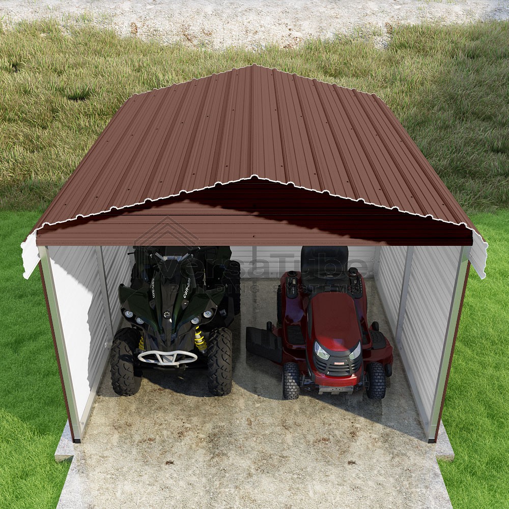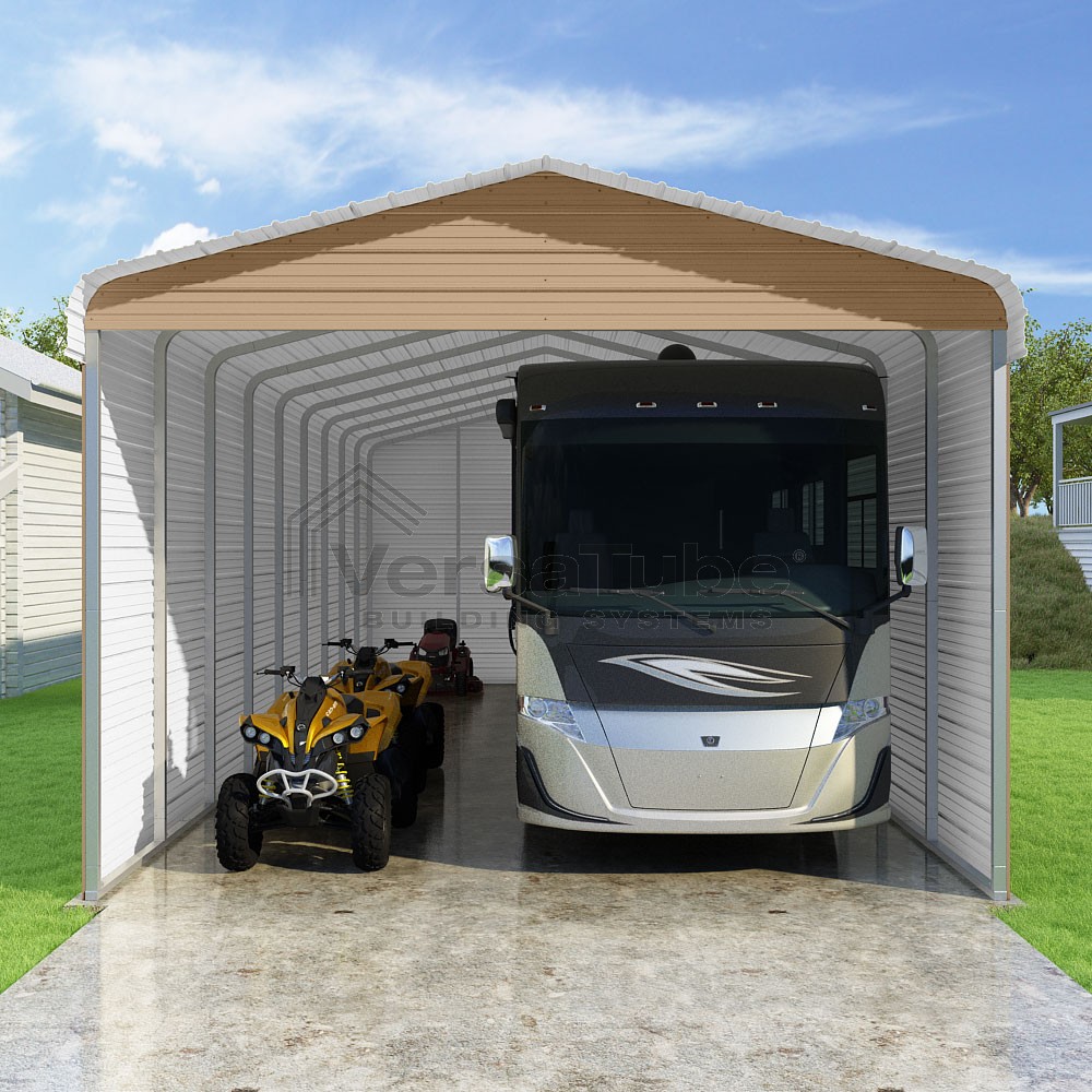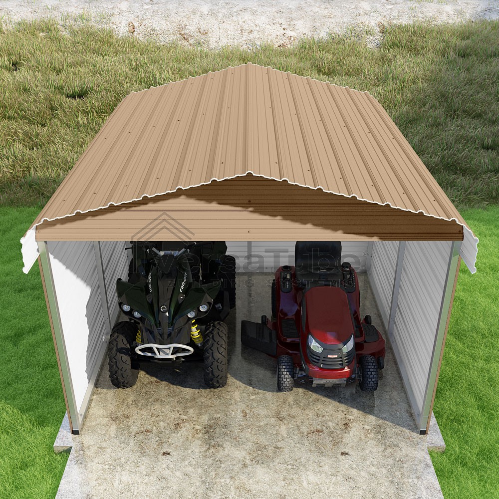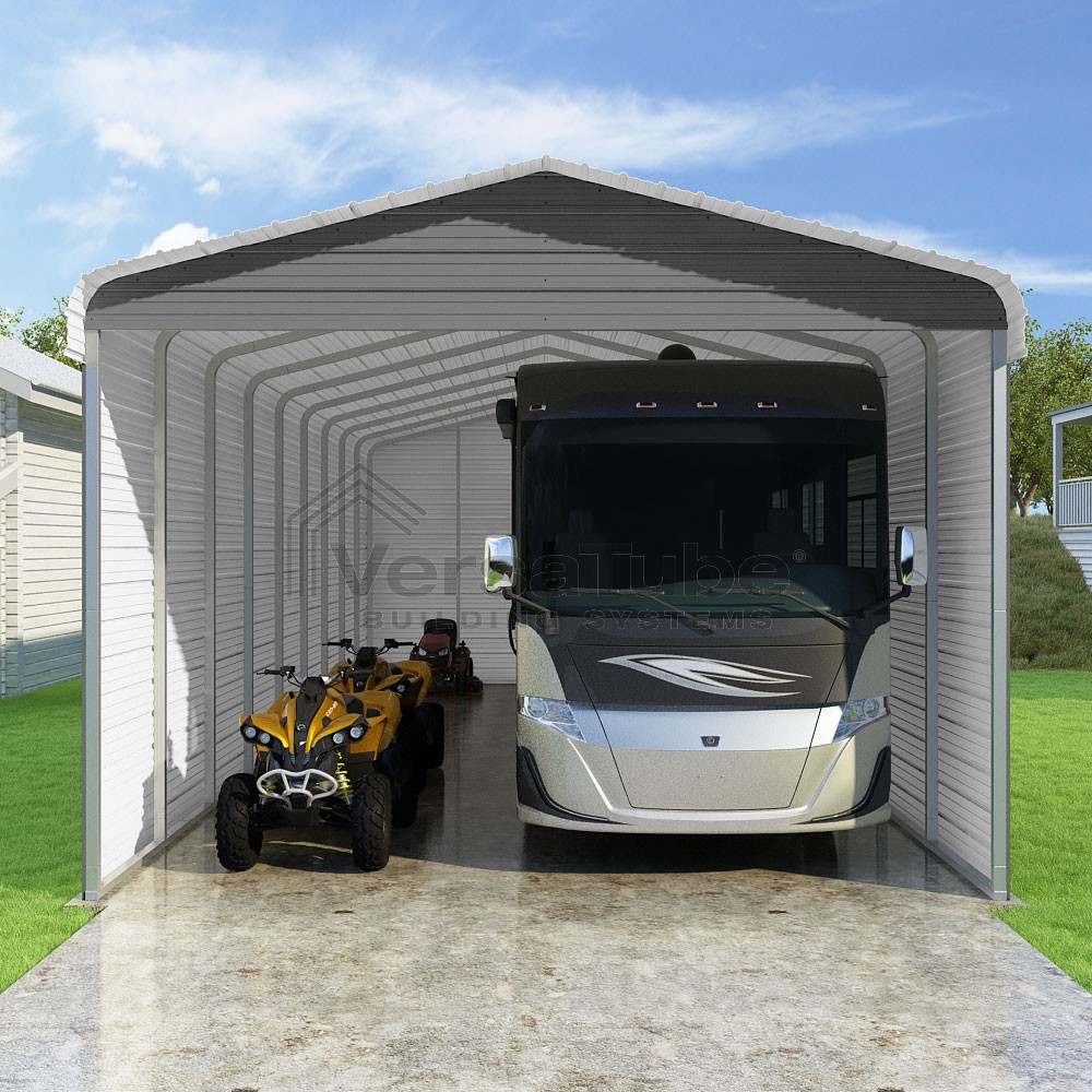 Classic Series DIY carport kit features horizontal application of sheet metal panels with the extra protection of rounded eaves.