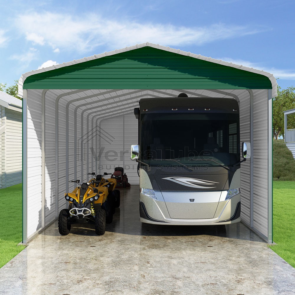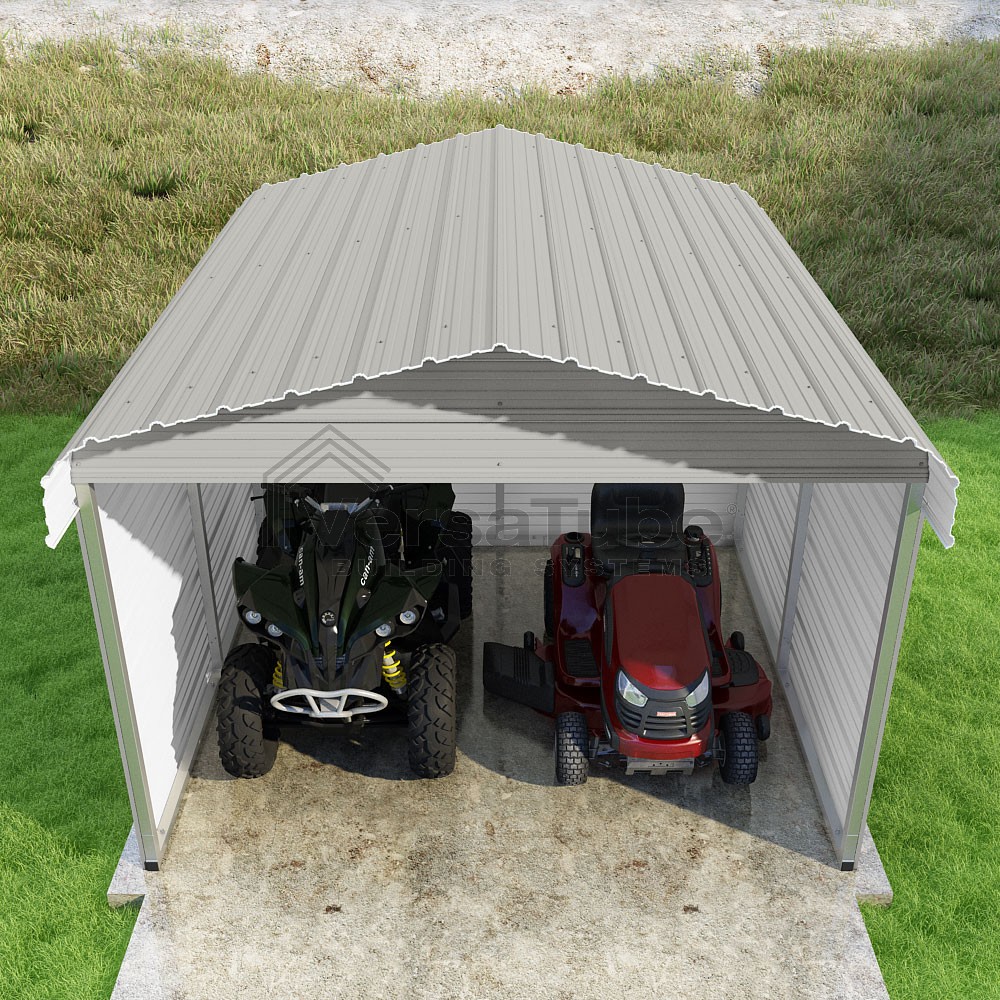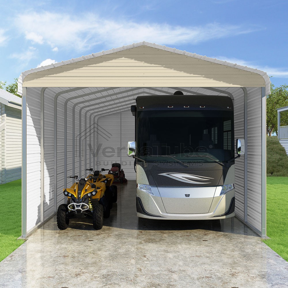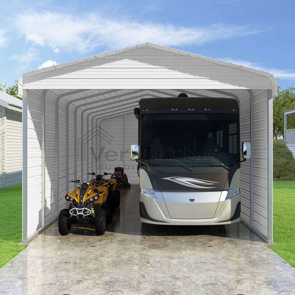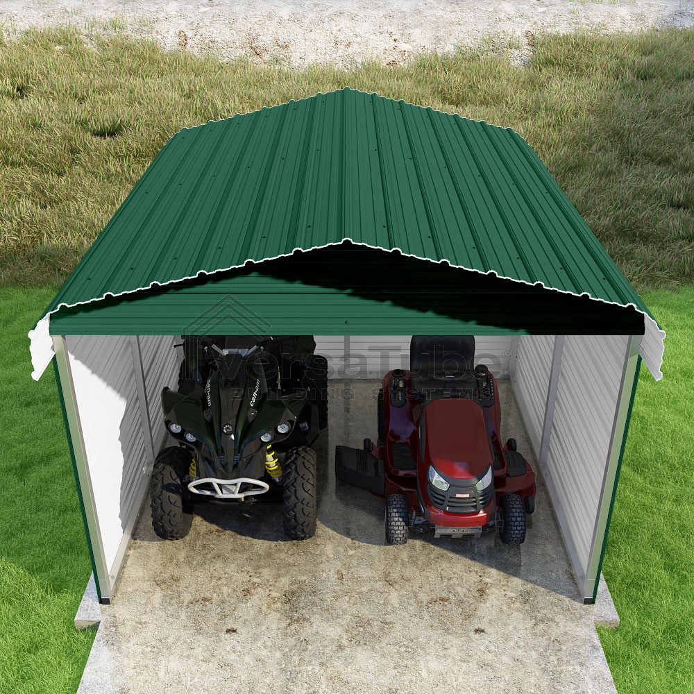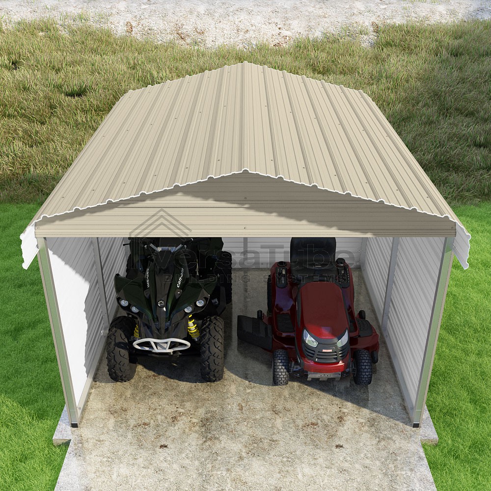 Classic Series DIY carport kit features horizontal application of sheet metal panels with the extra protection of rounded eaves.