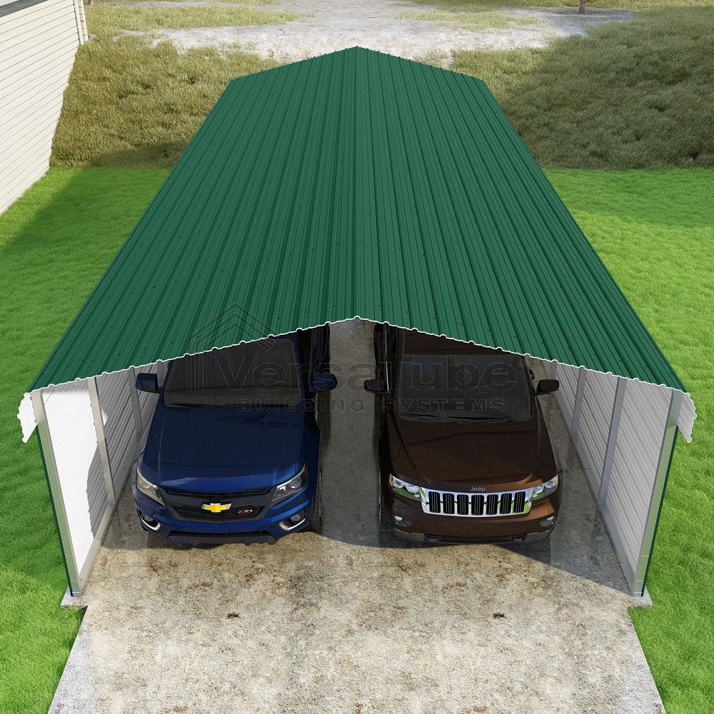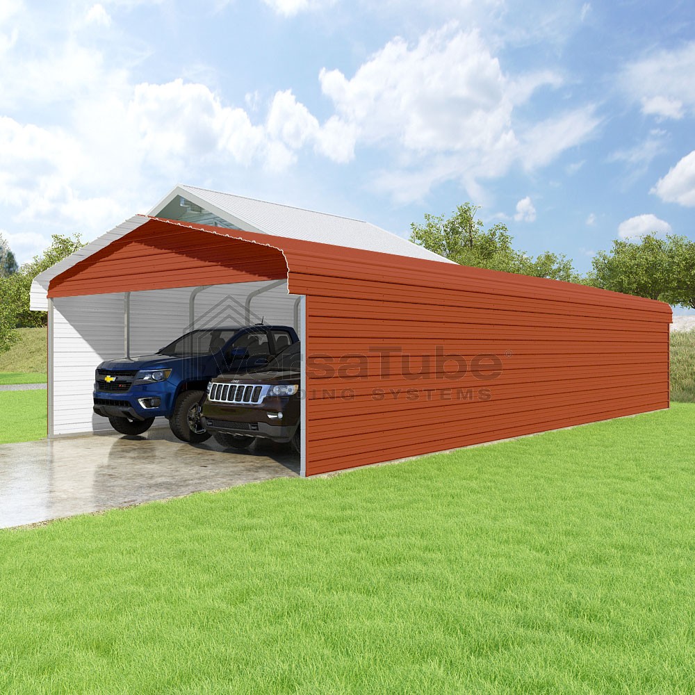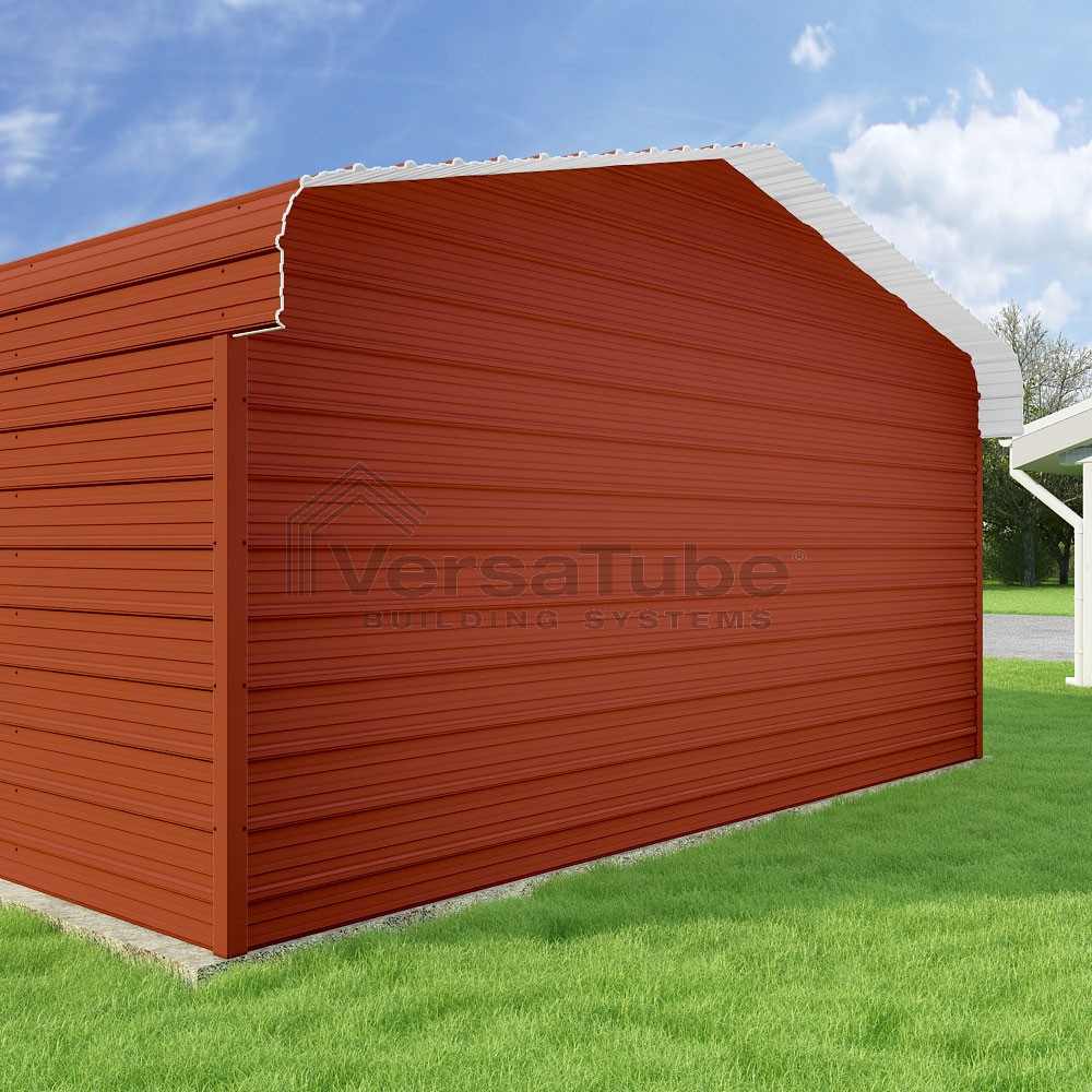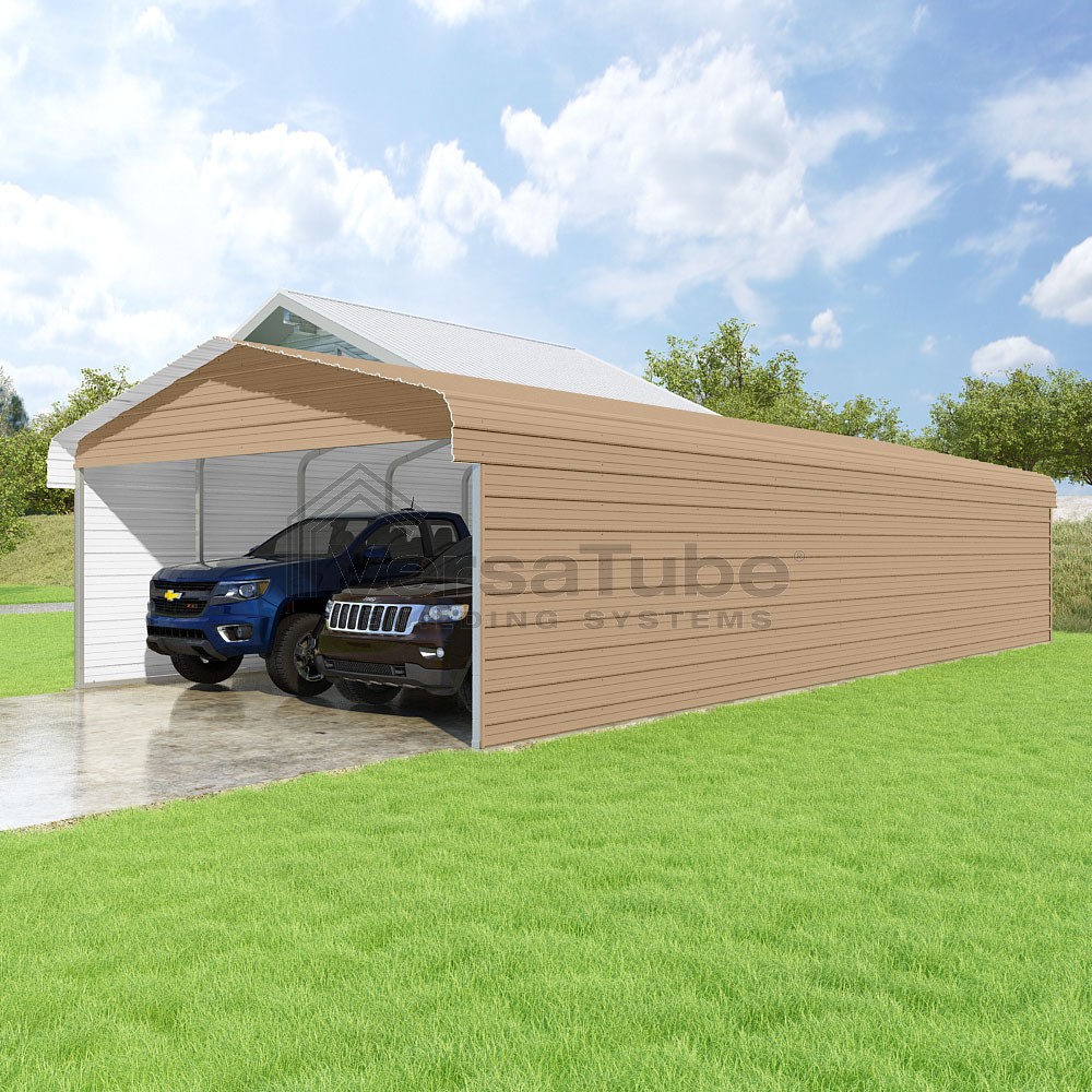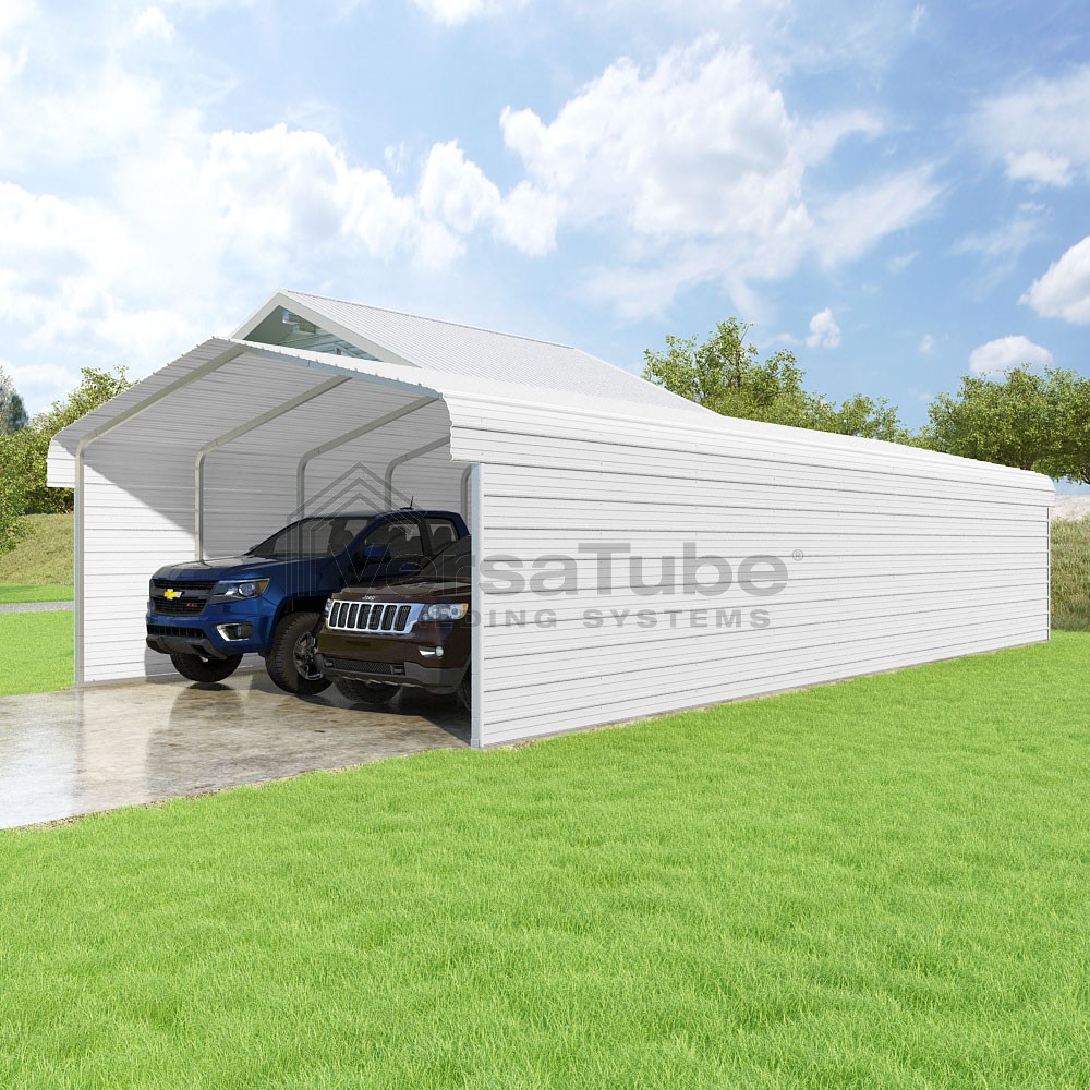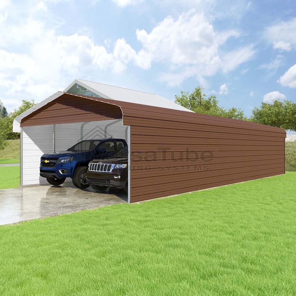 Classic Series DIY carport kit features horizontal application of sheet metal panels with the extra protection of rounded eaves.