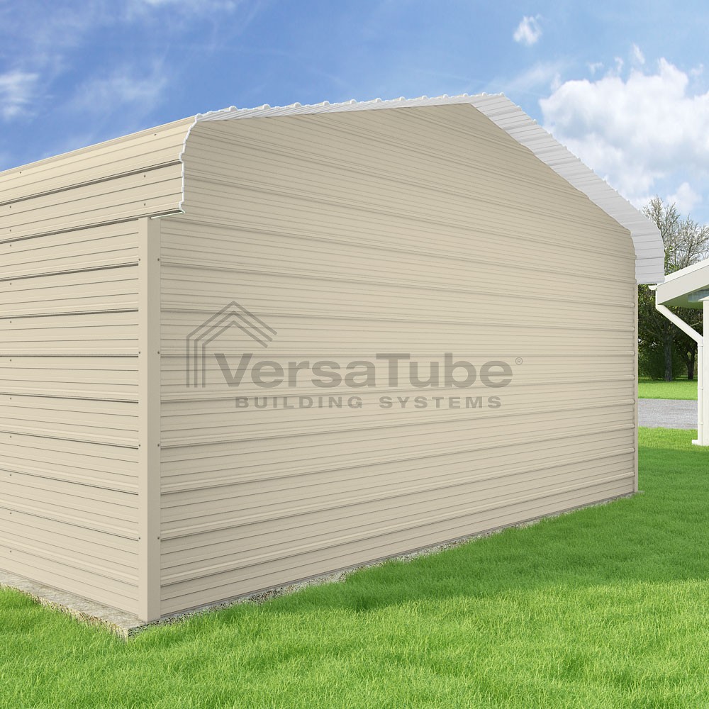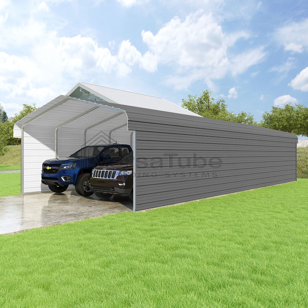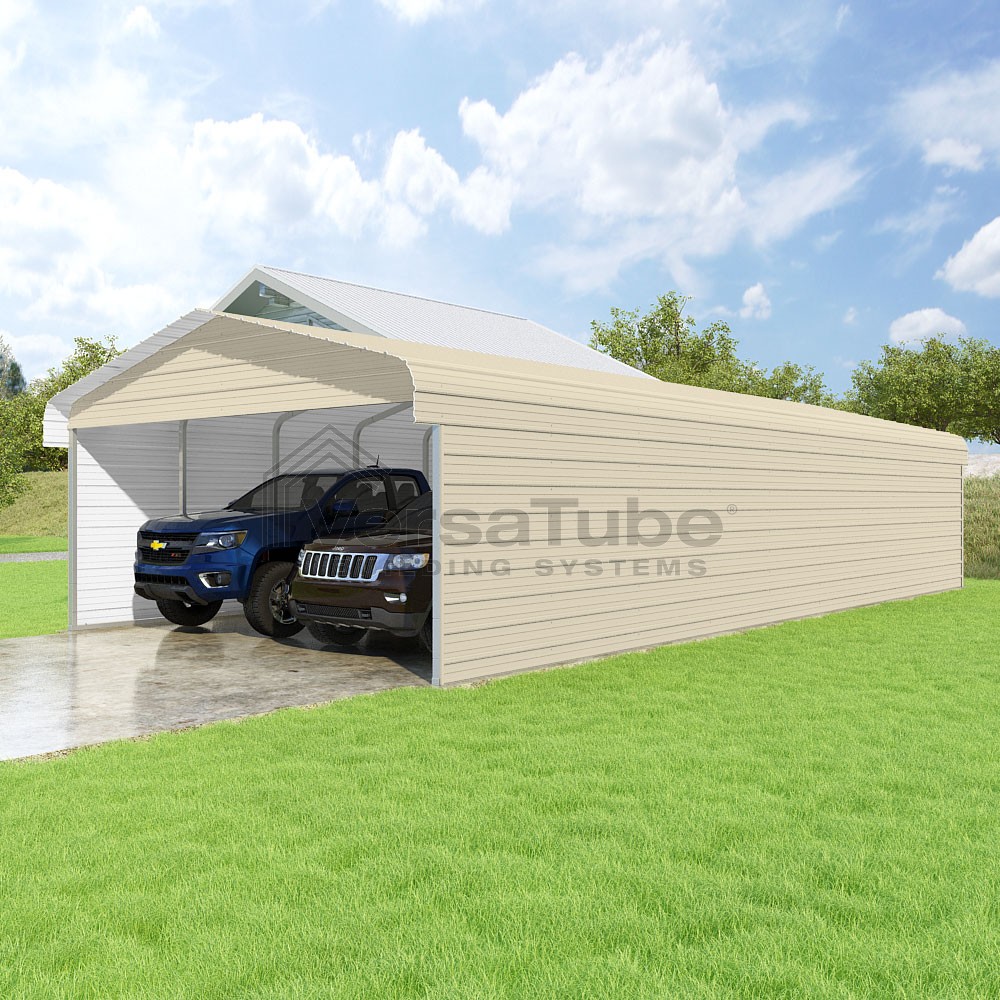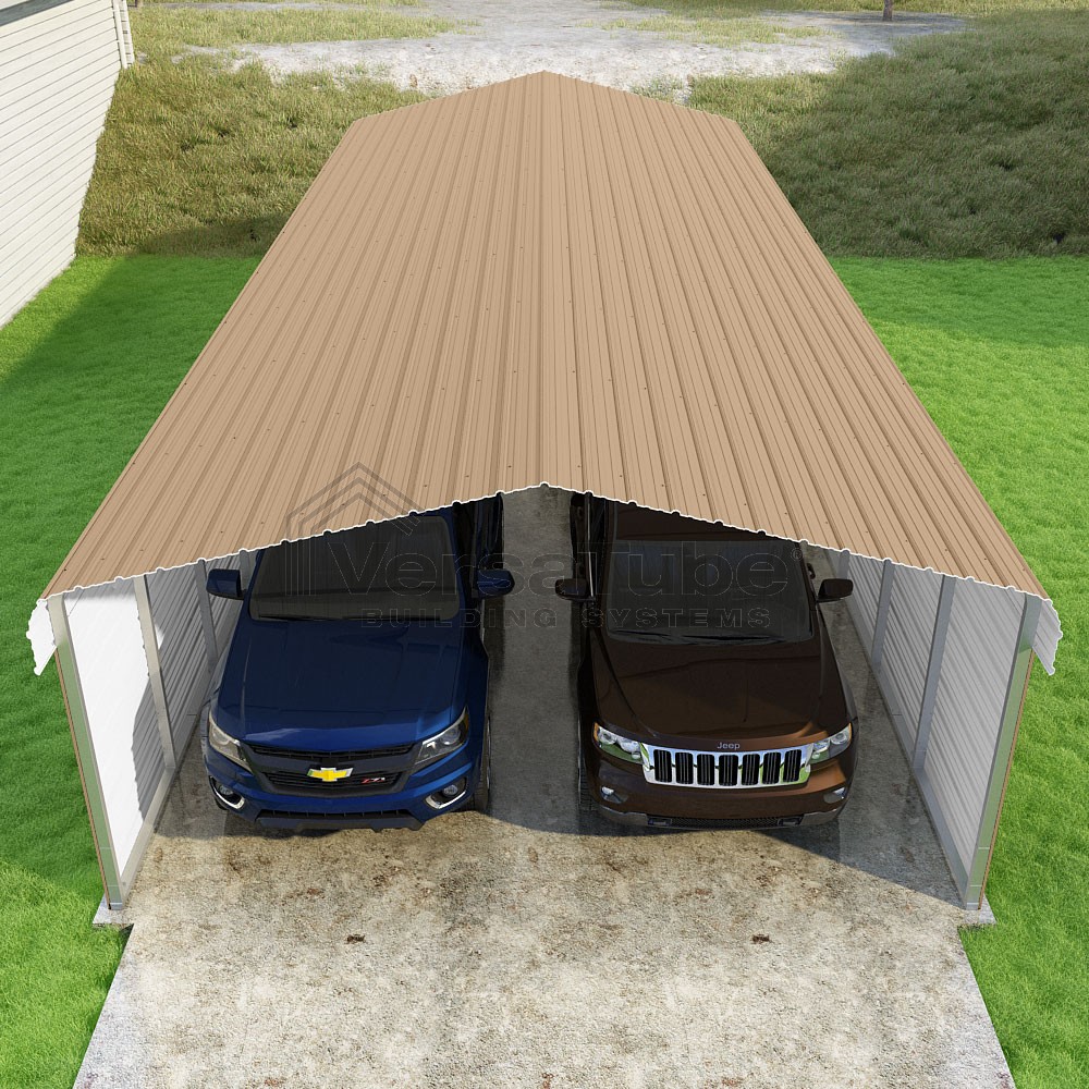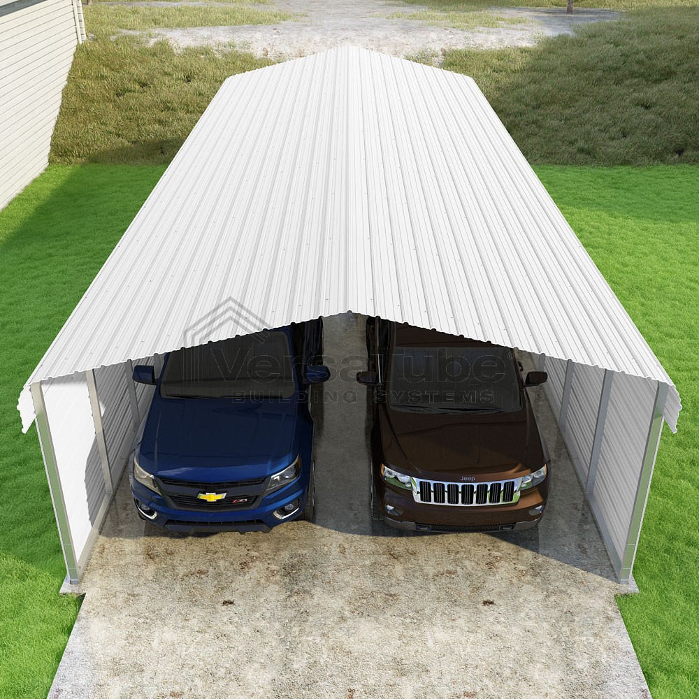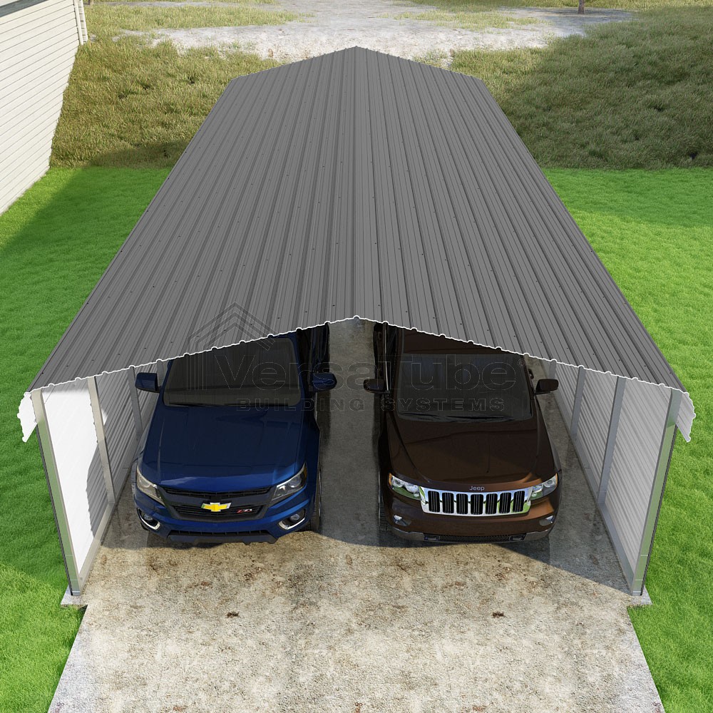 Classic Series DIY carport kit features horizontal application of sheet metal panels with the extra protection of rounded eaves.