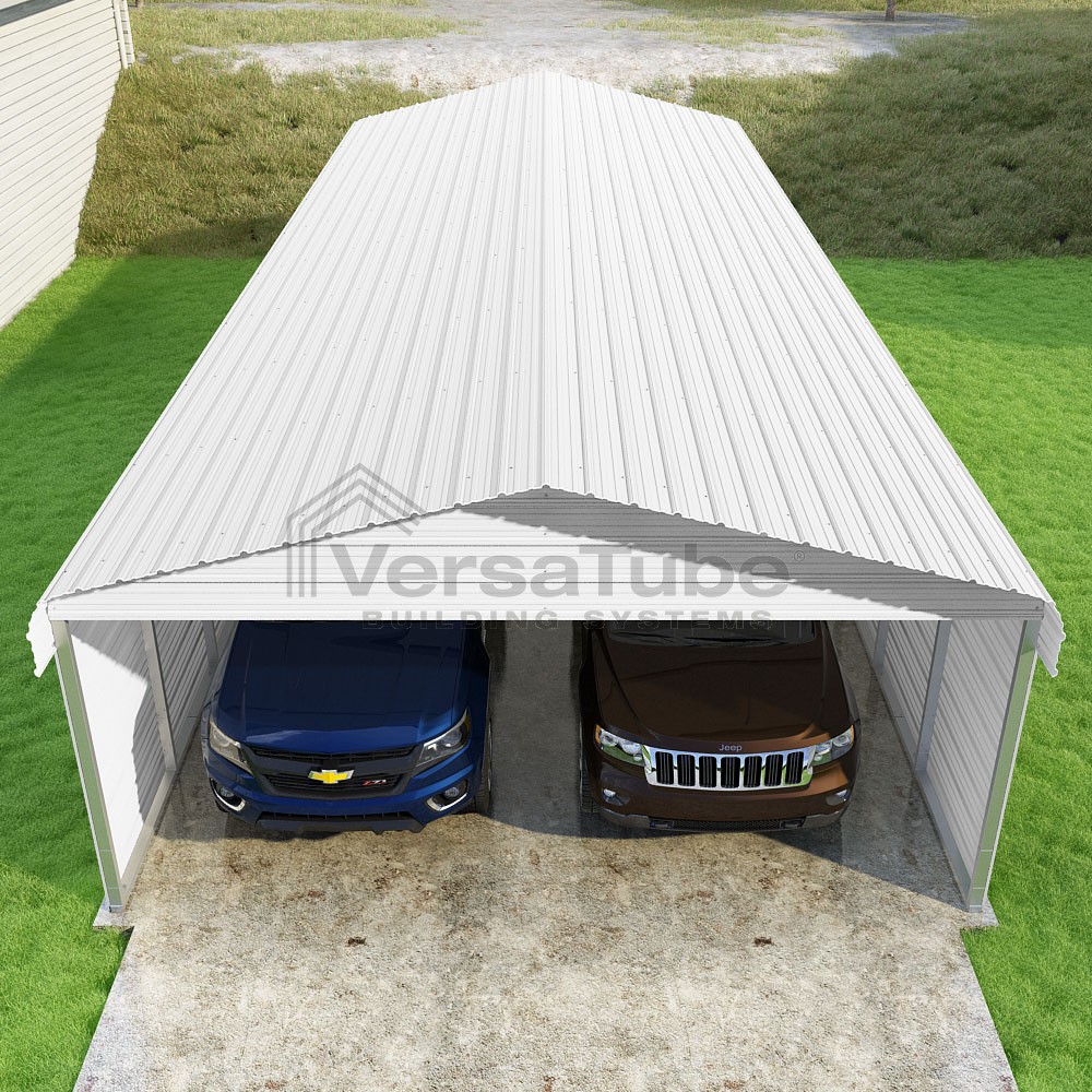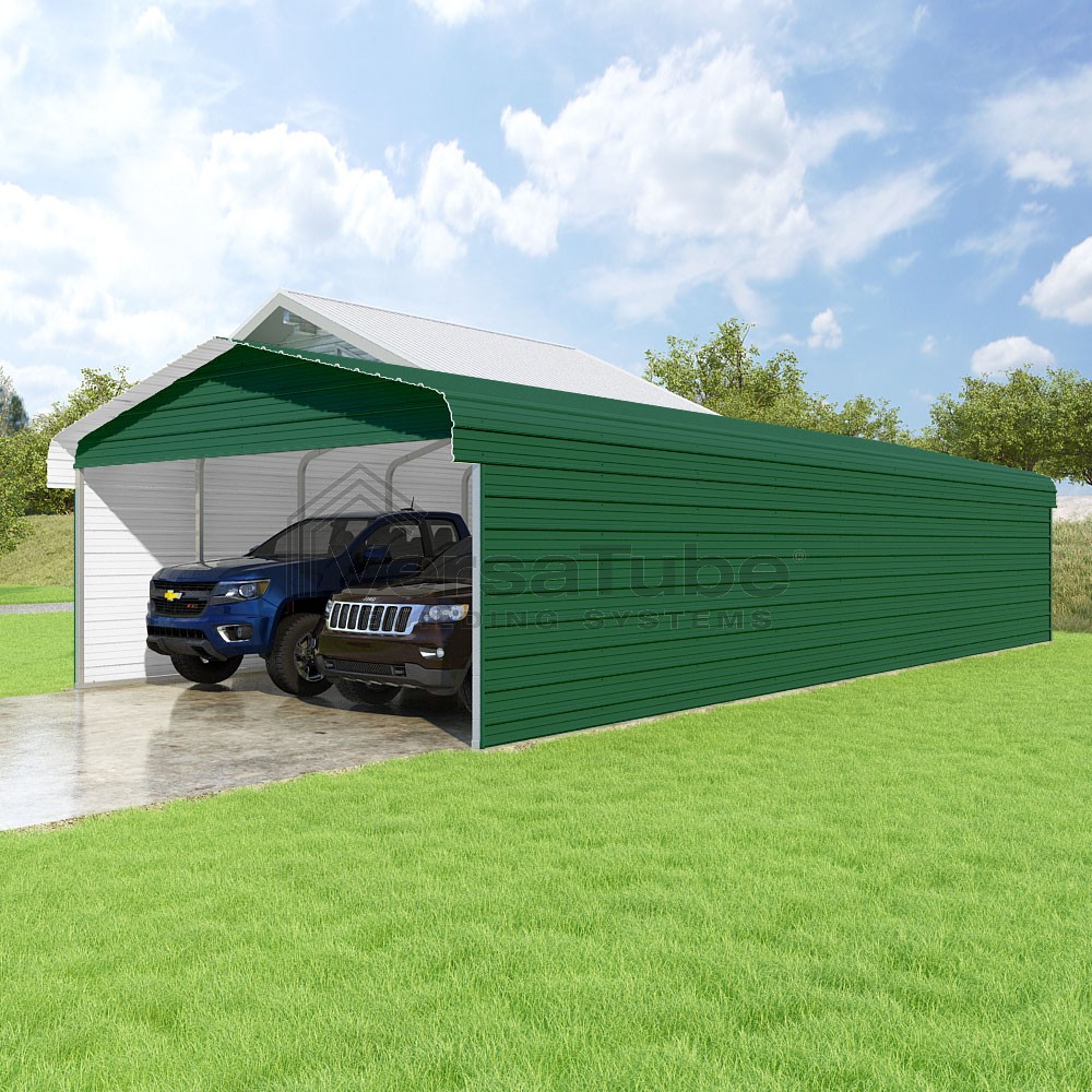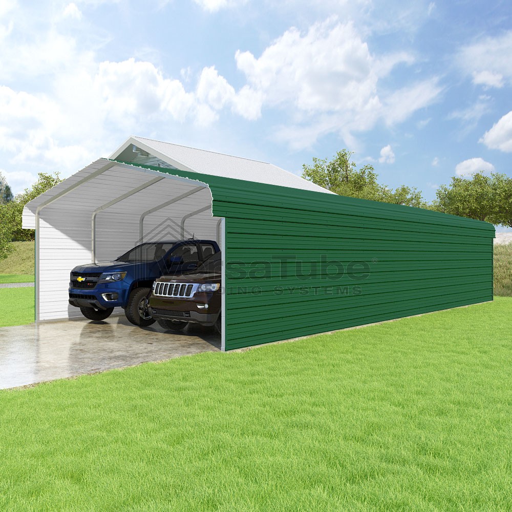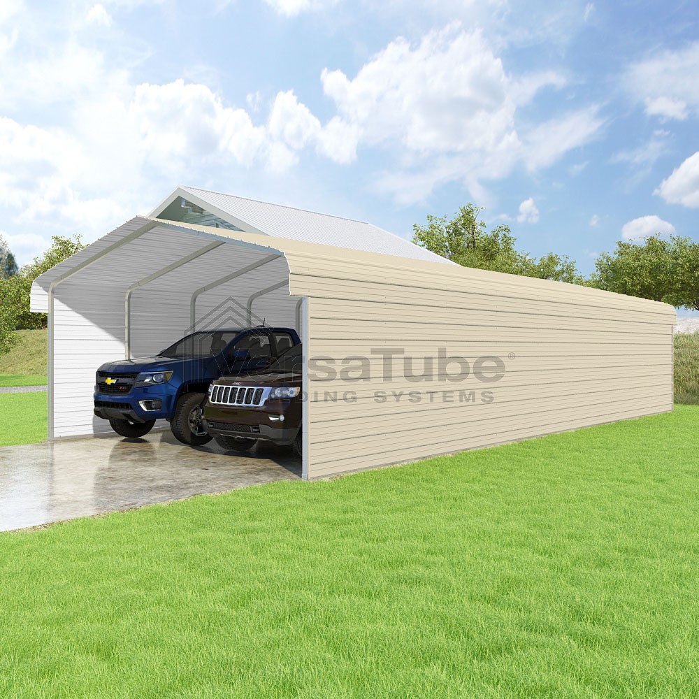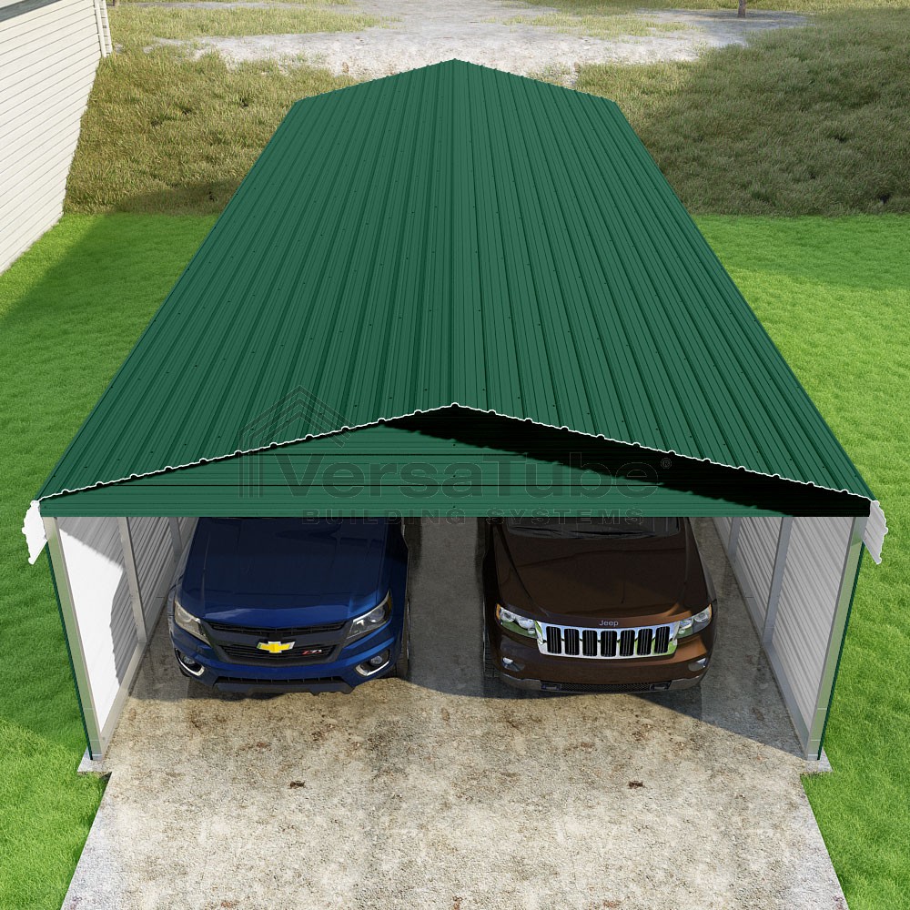 Classic Series DIY carport kit features horizontal application of sheet metal panels with the extra protection of rounded eaves.