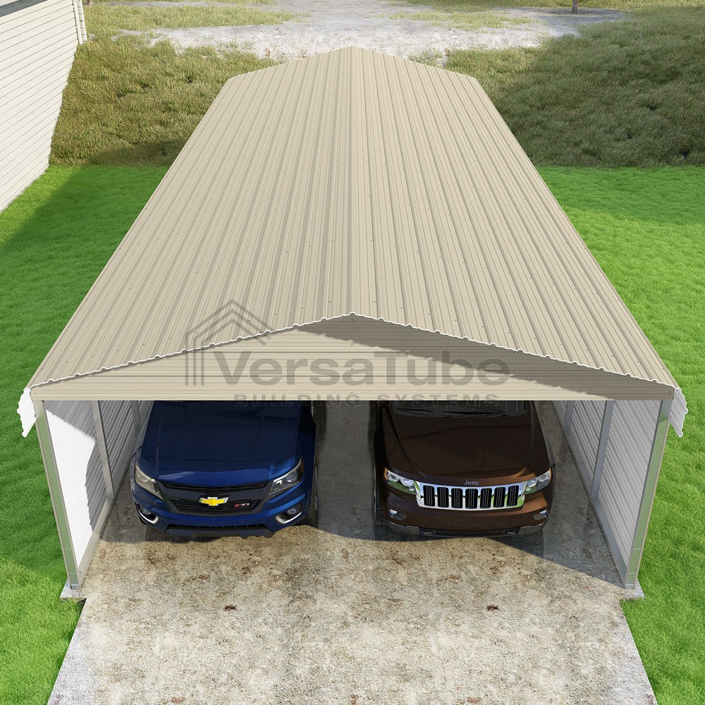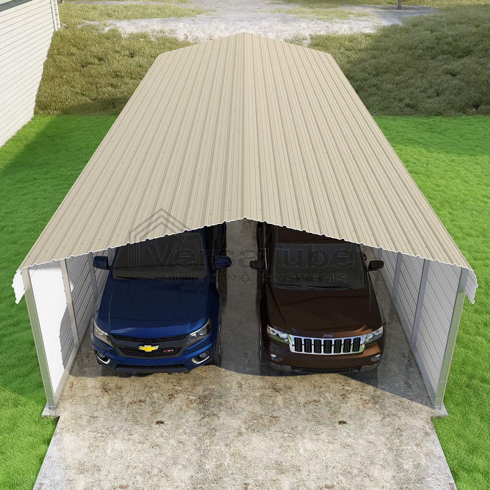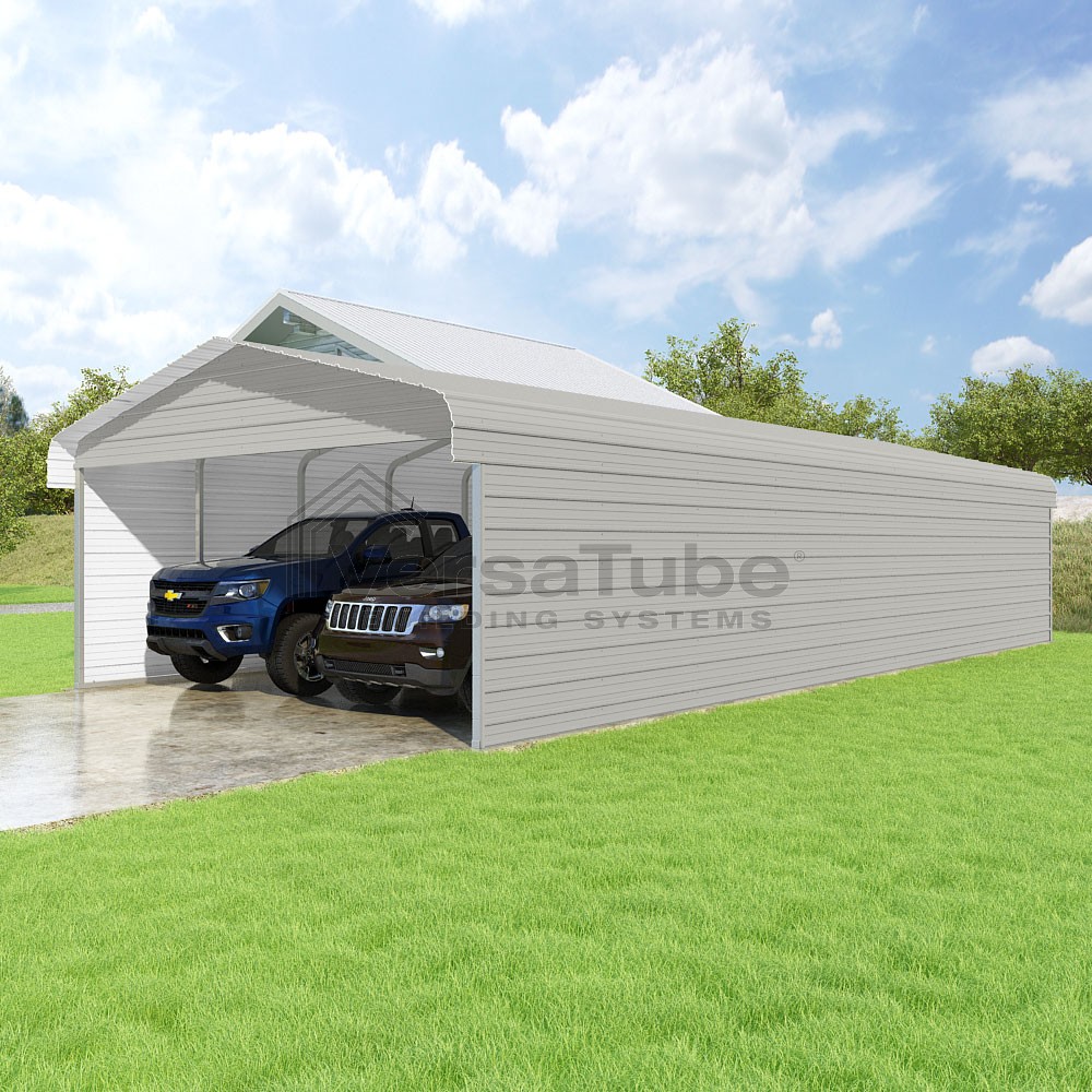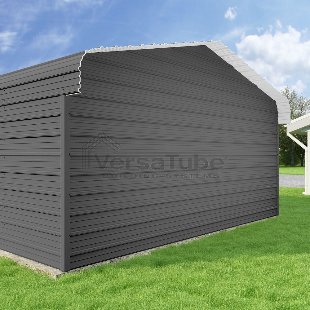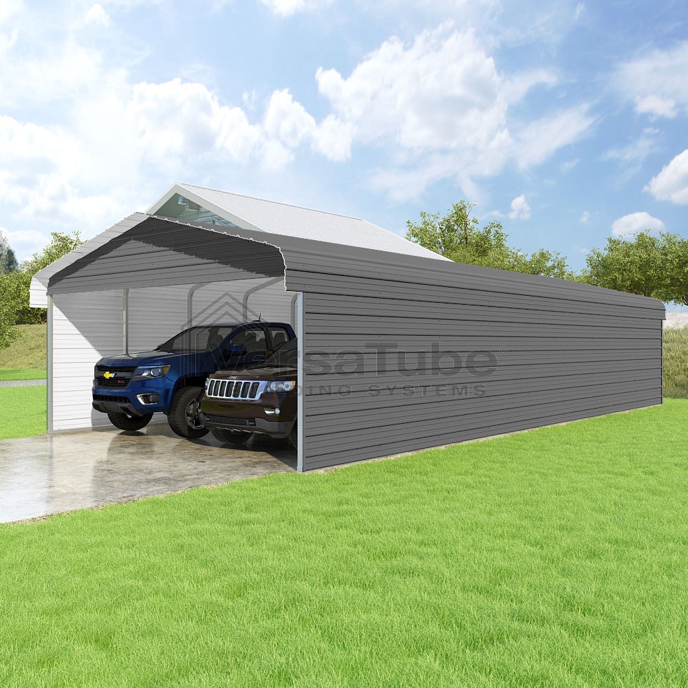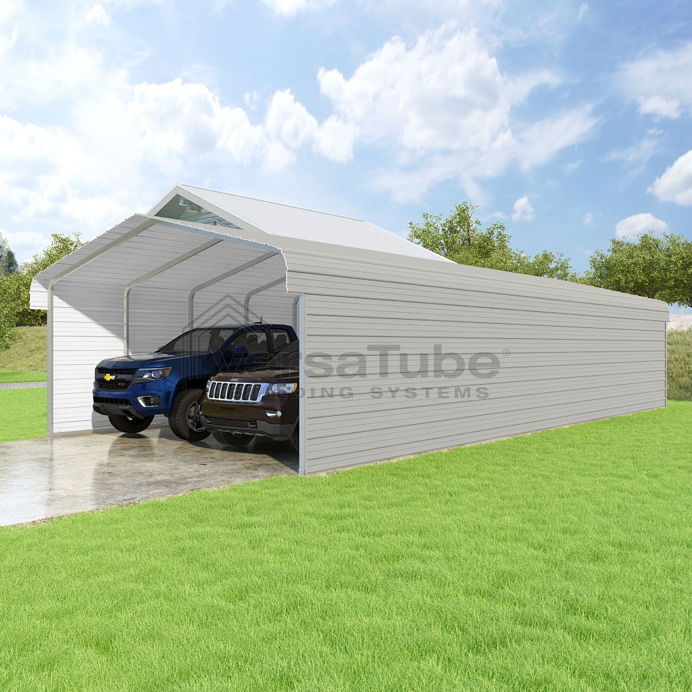 Classic Series DIY carport kit features horizontal application of sheet metal panels with the extra protection of rounded eaves.