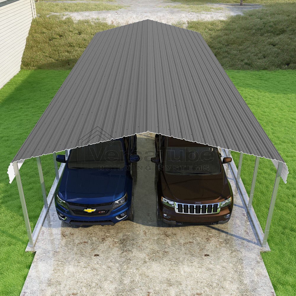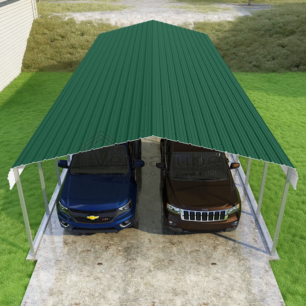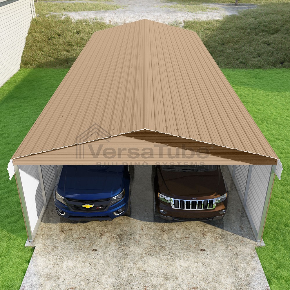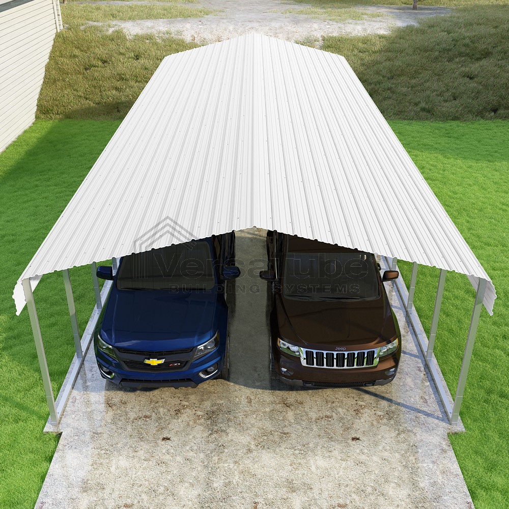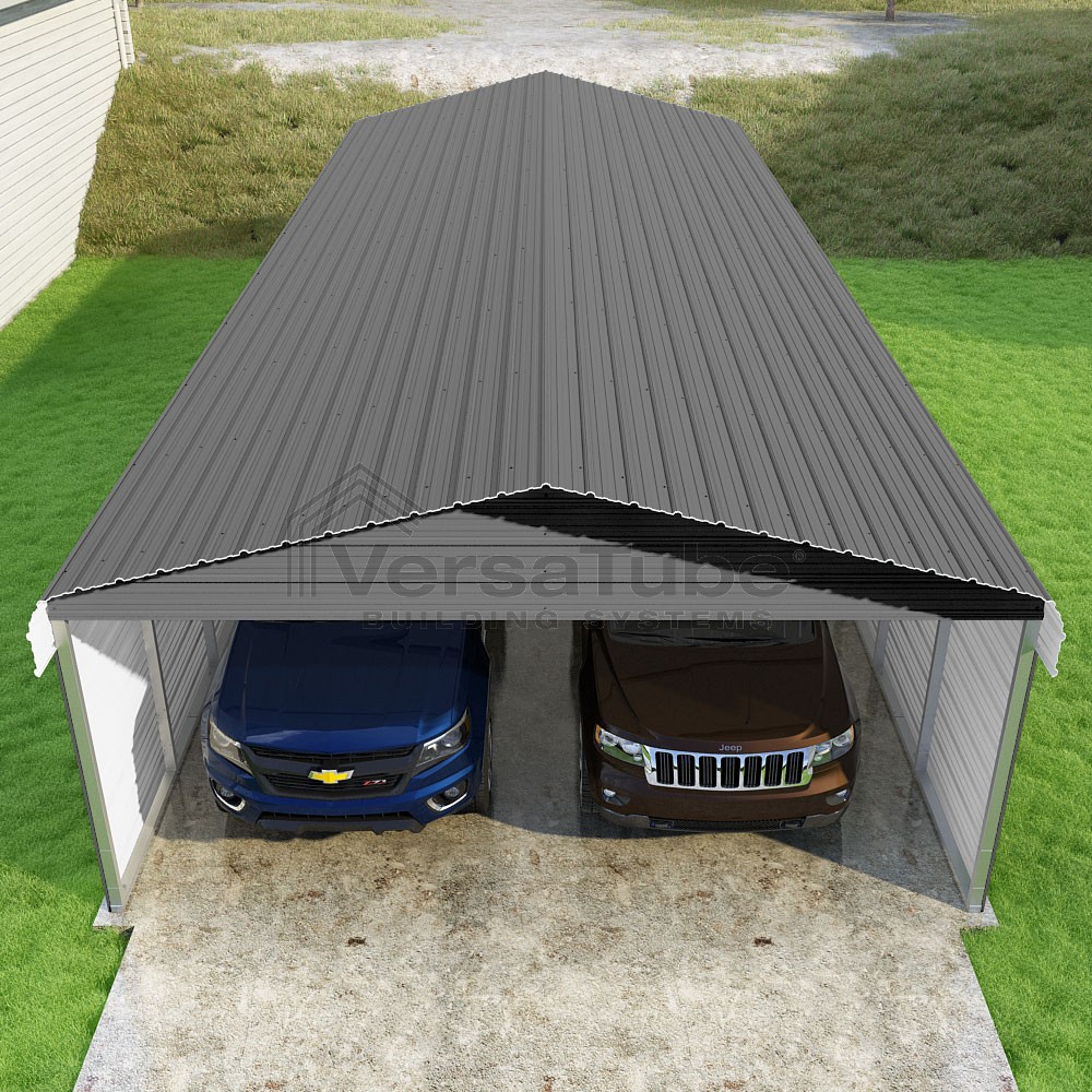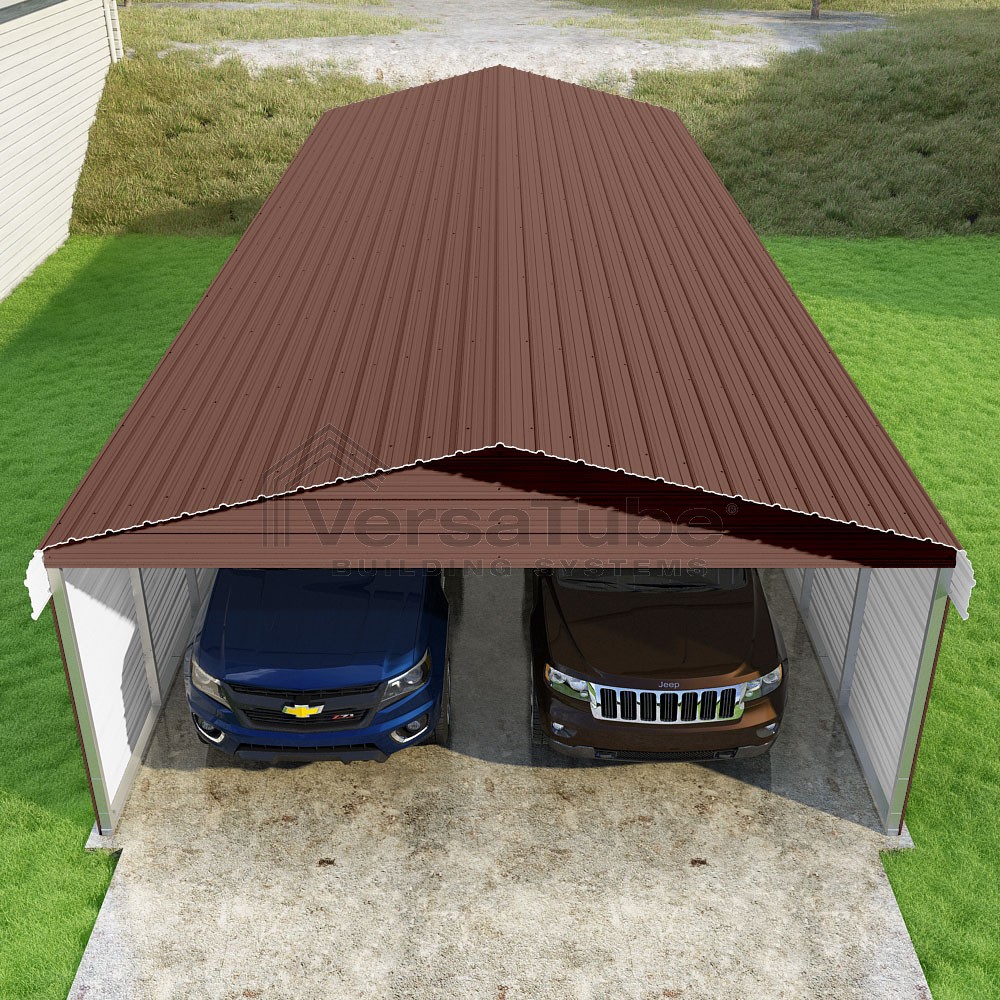 Classic Series DIY carport kit features horizontal application of sheet metal panels with the extra protection of rounded eaves.