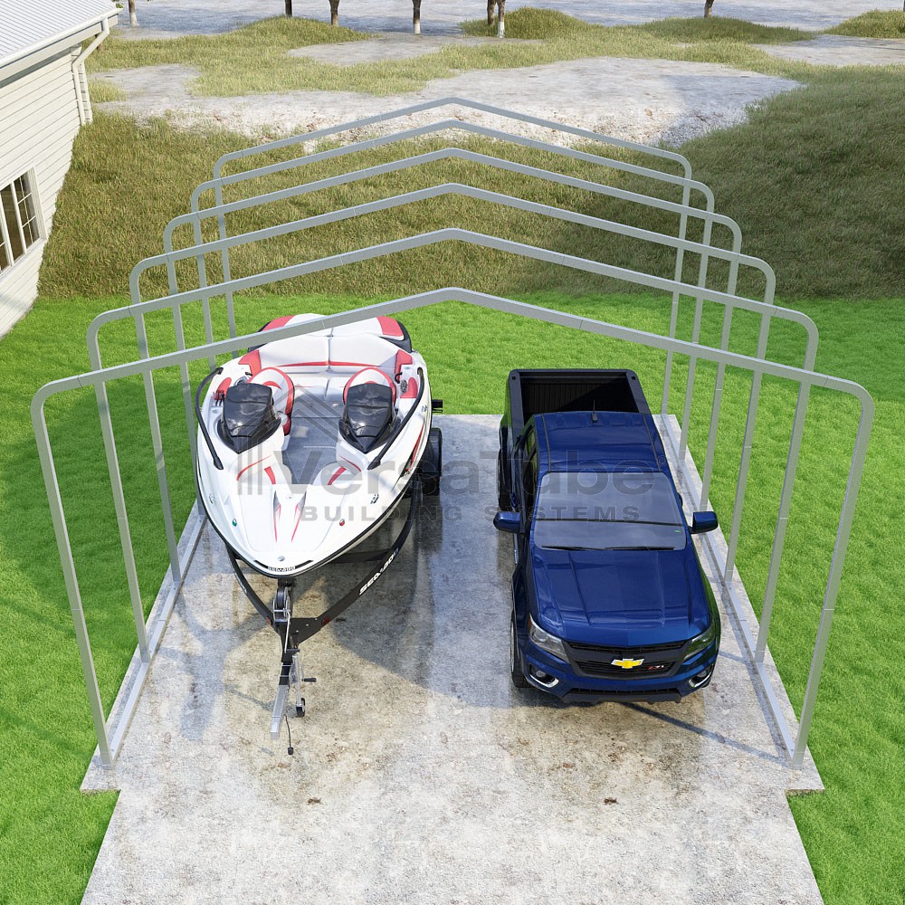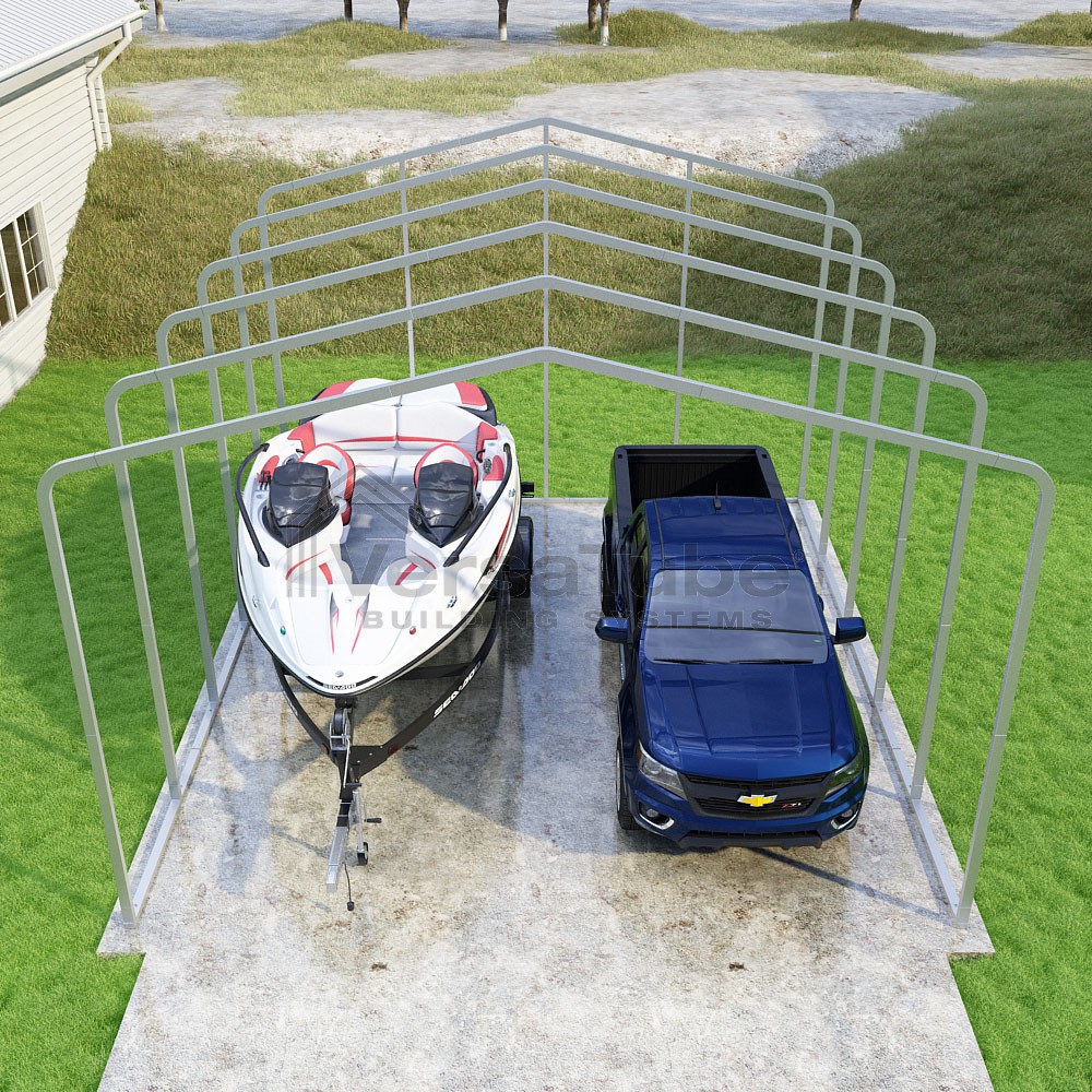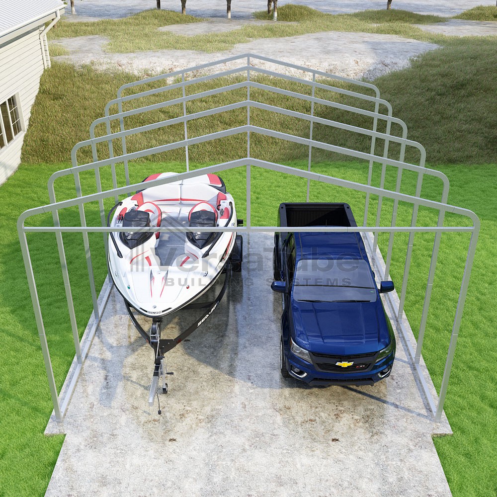 The Classic design utilizes a horizontal sheet metal roof application which has become a popular mainstay for accommodating carport or shelters solutions in a more affordable manner by eliminating the need for roof purlins and ridge cap trim. And with the VersaTube Slip-Fit frame system, you can get your carport frame kit assembled in a single afternoon using common tools.