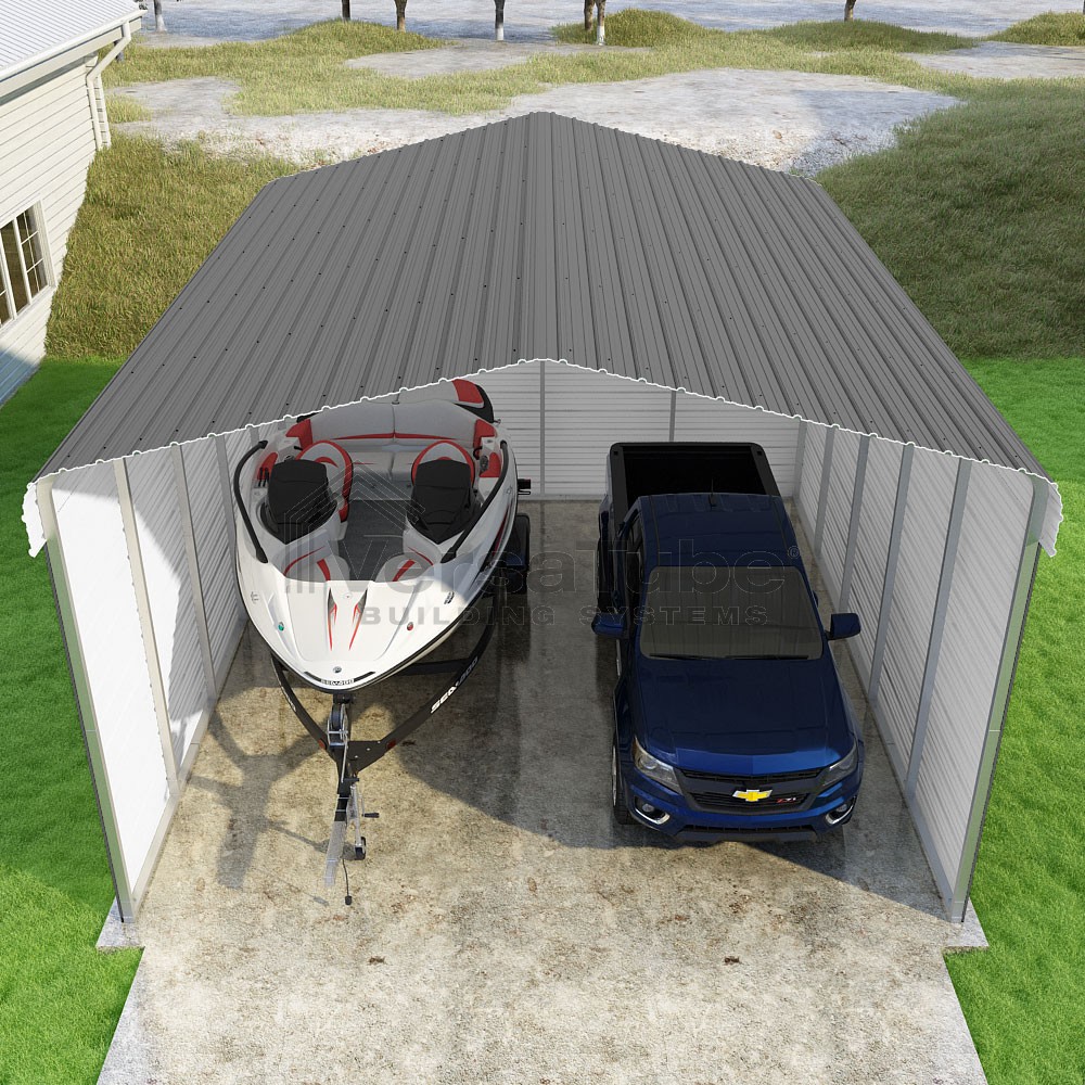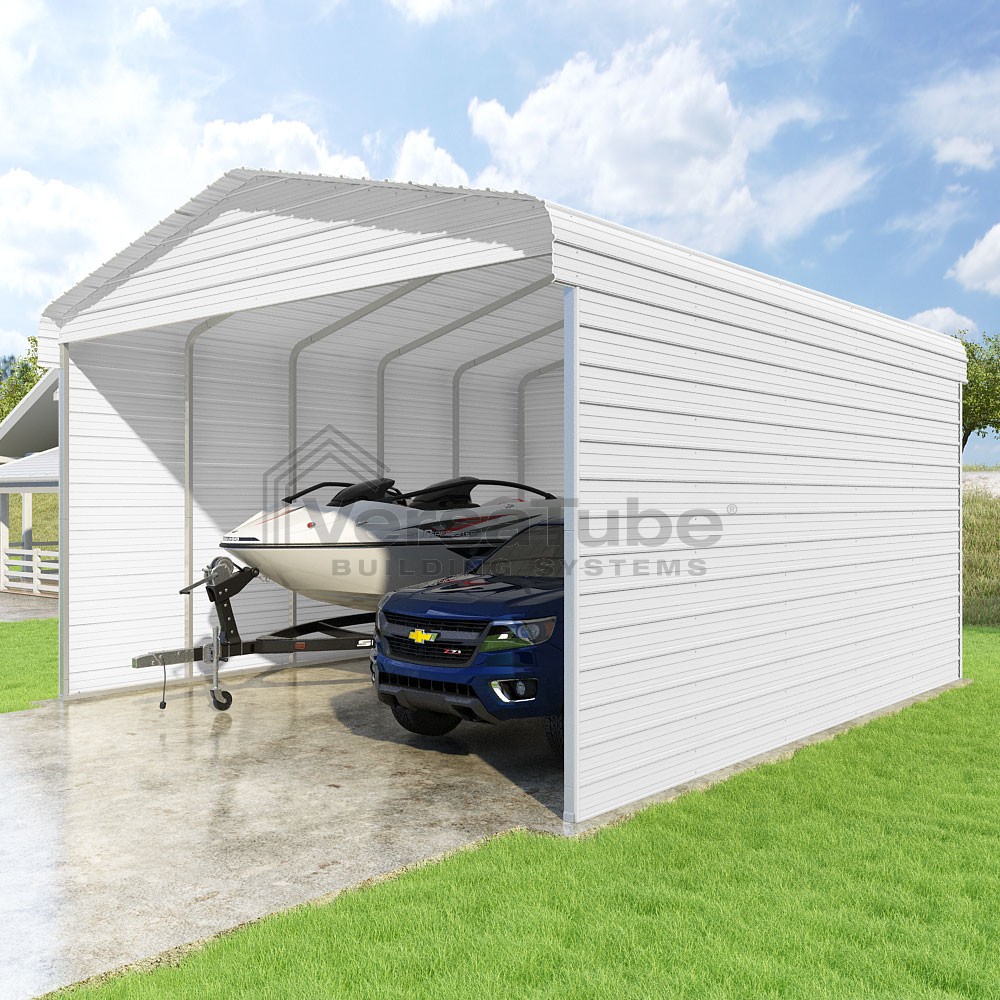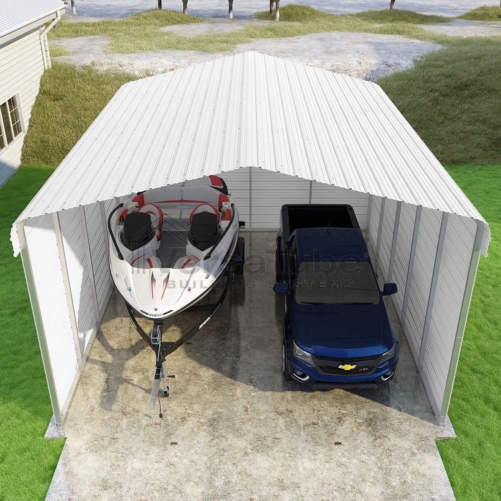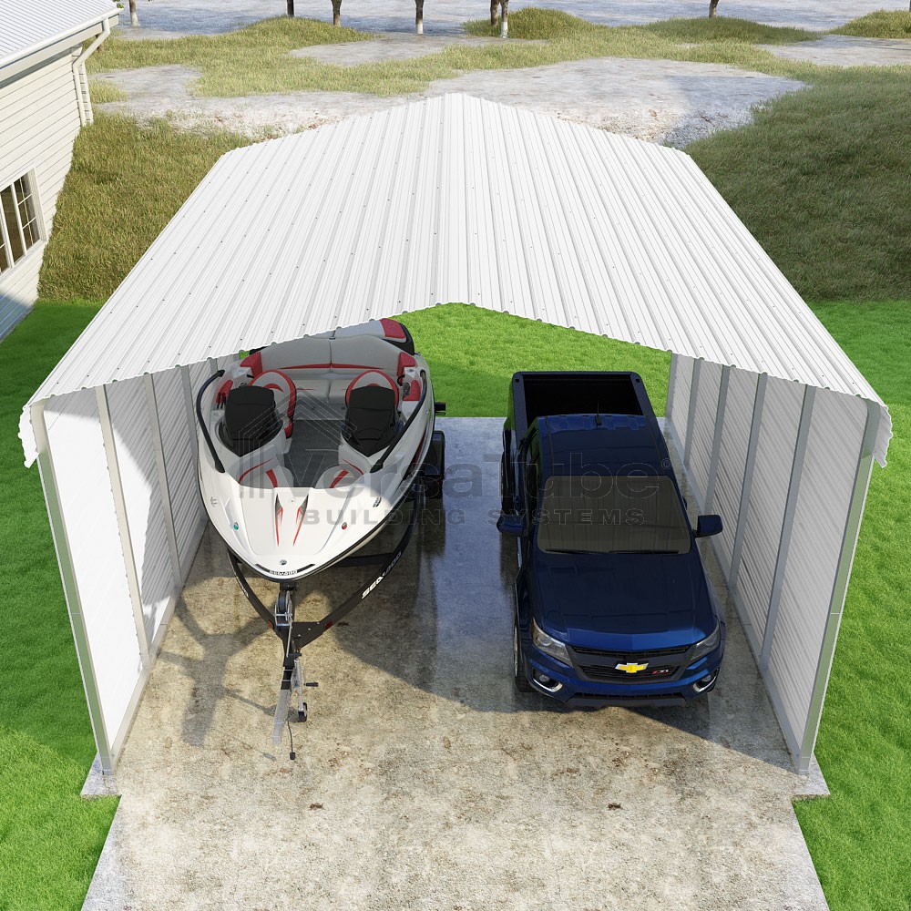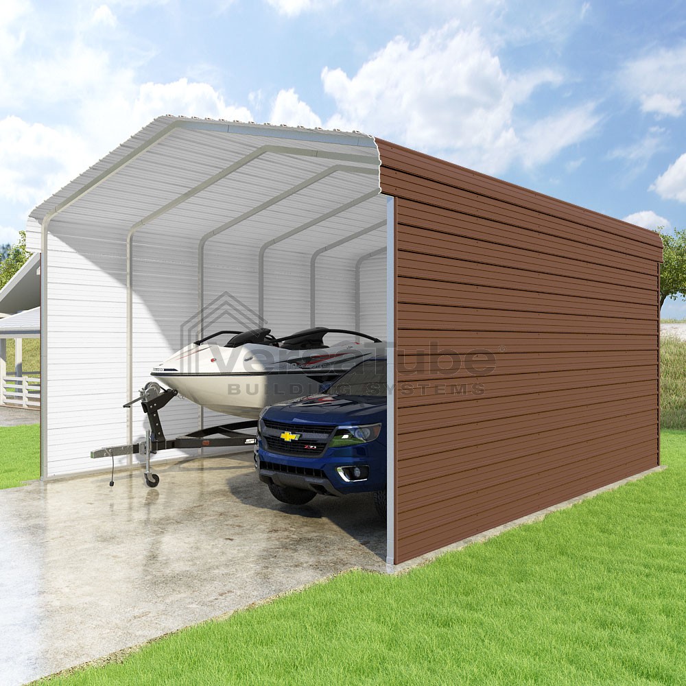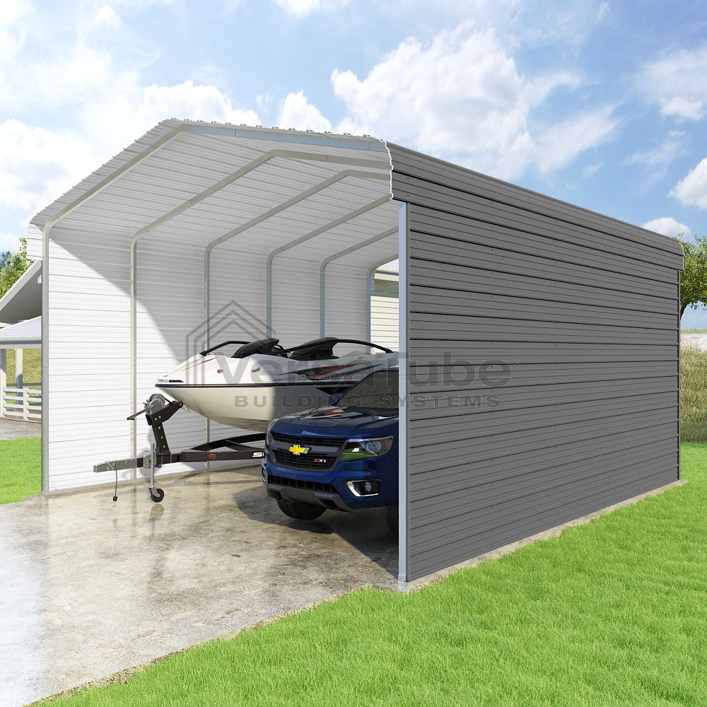 Classic Series DIY carport kit features horizontal application of sheet metal panels with the extra protection of rounded eaves.