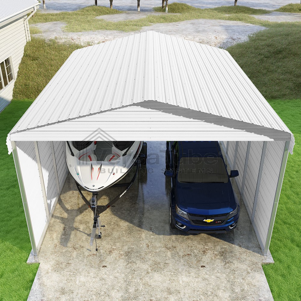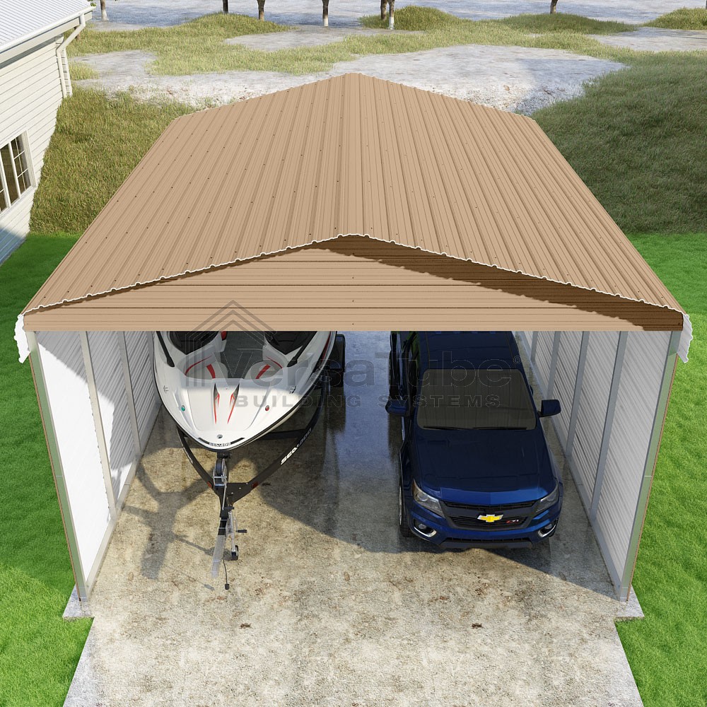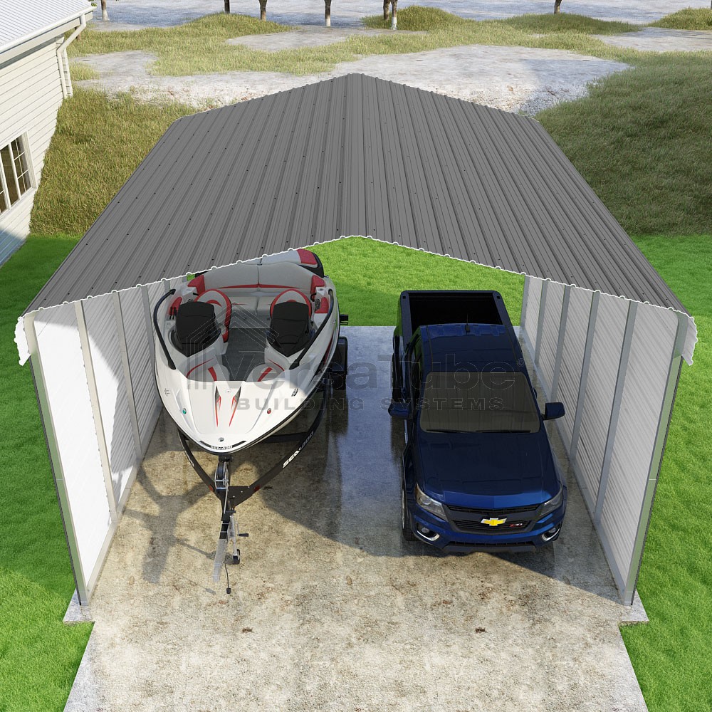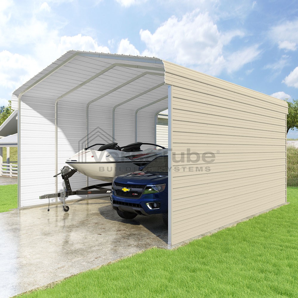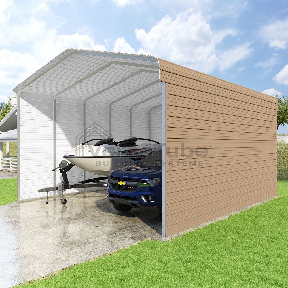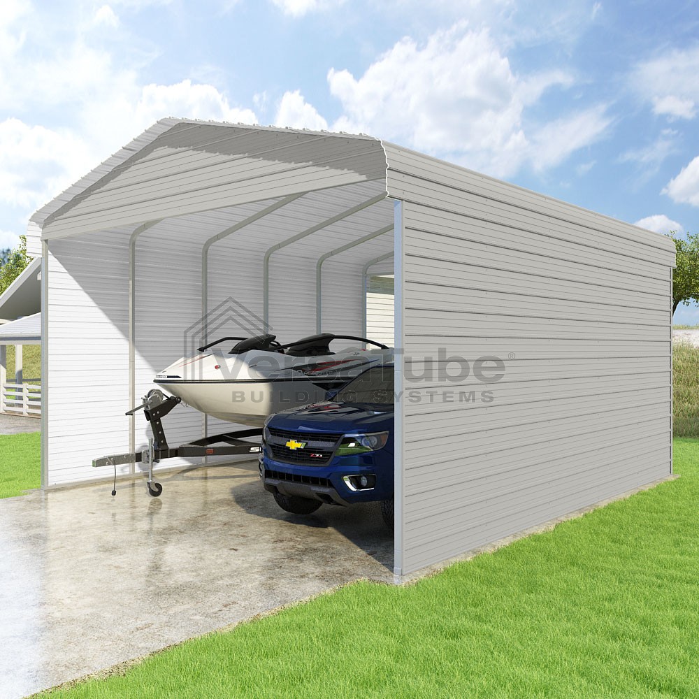 Classic Series DIY carport kit features horizontal application of sheet metal panels with the extra protection of rounded eaves.