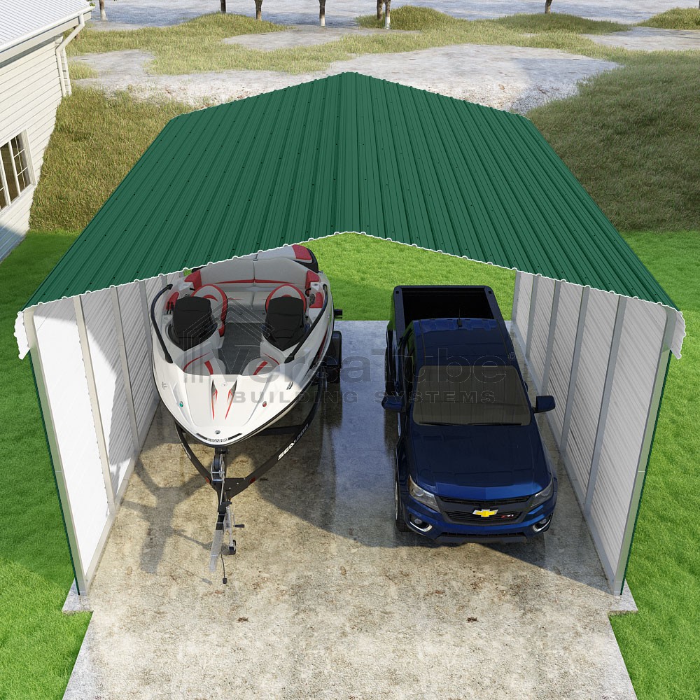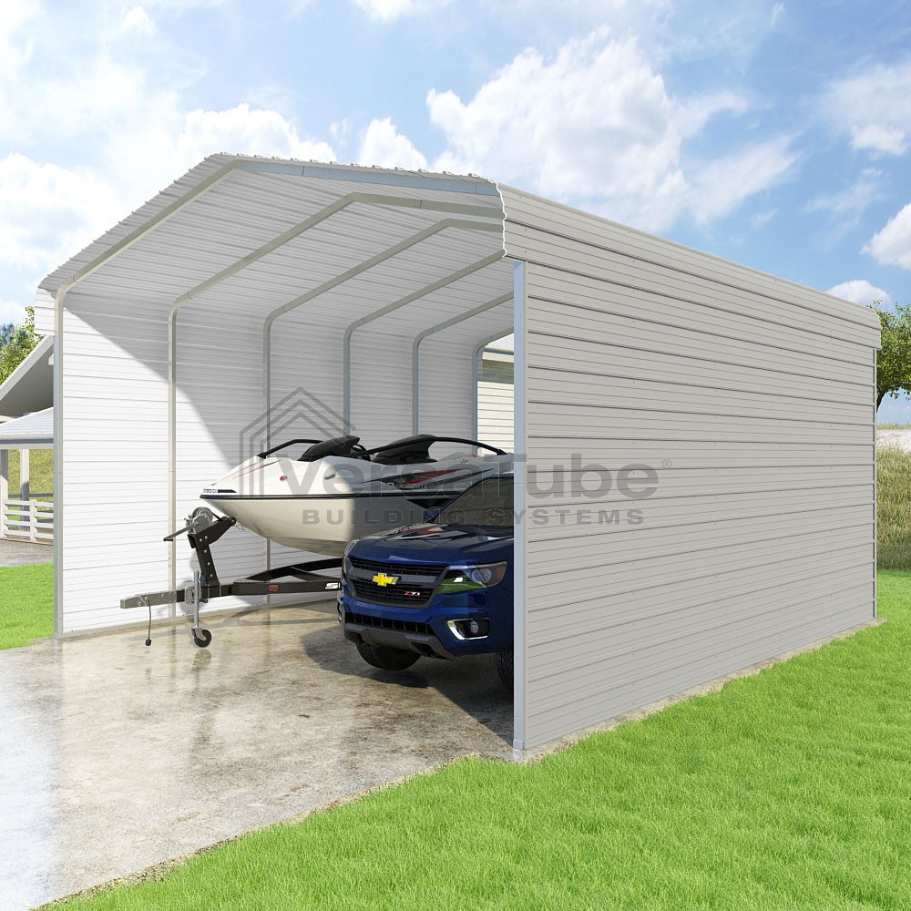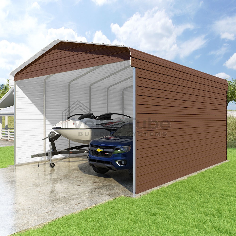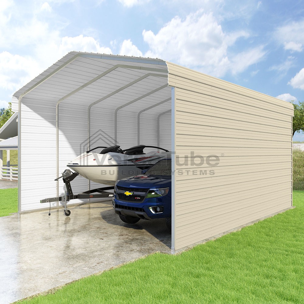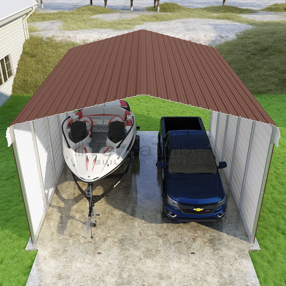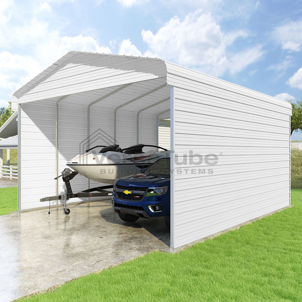 Classic Series DIY carport kit features horizontal application of sheet metal panels with the extra protection of rounded eaves.