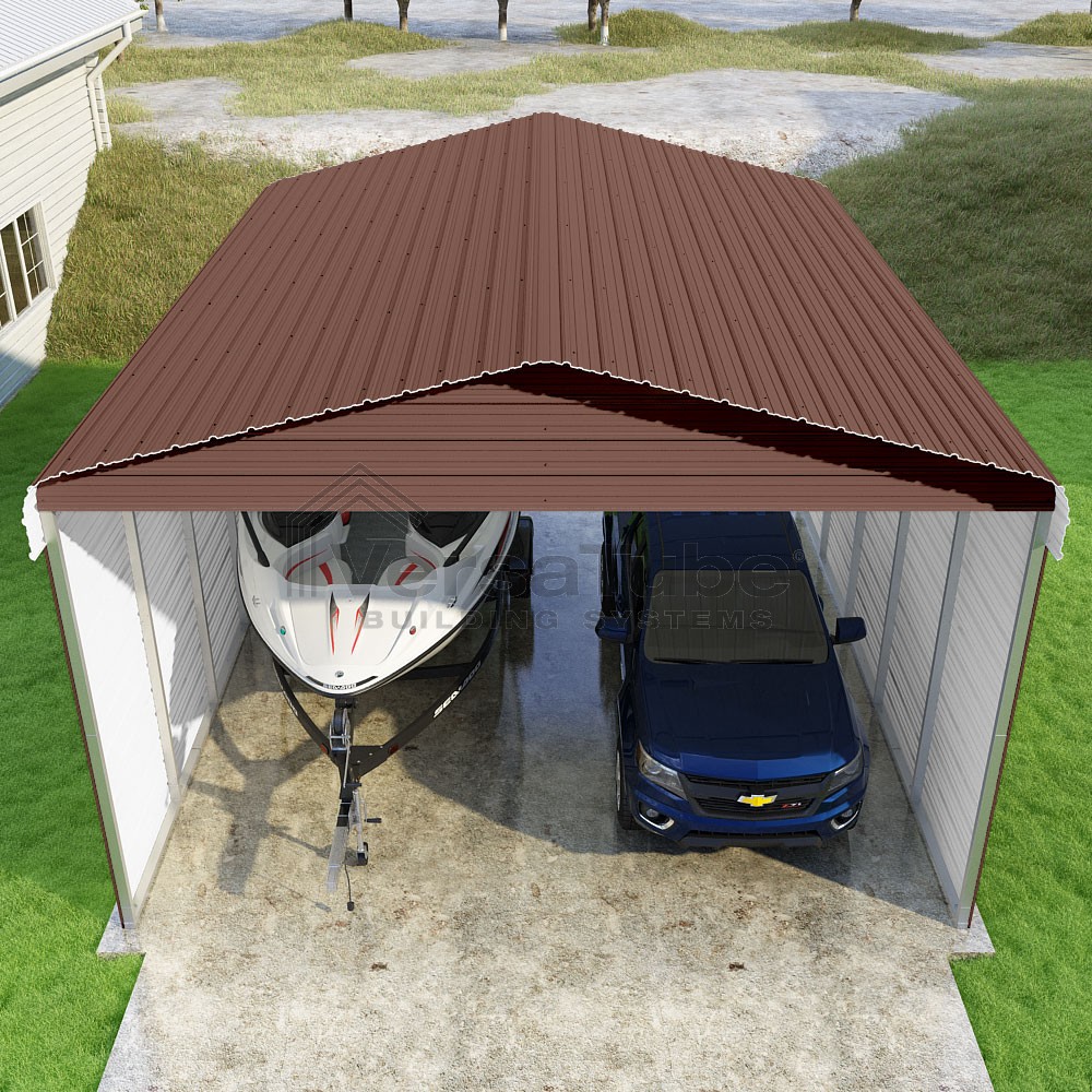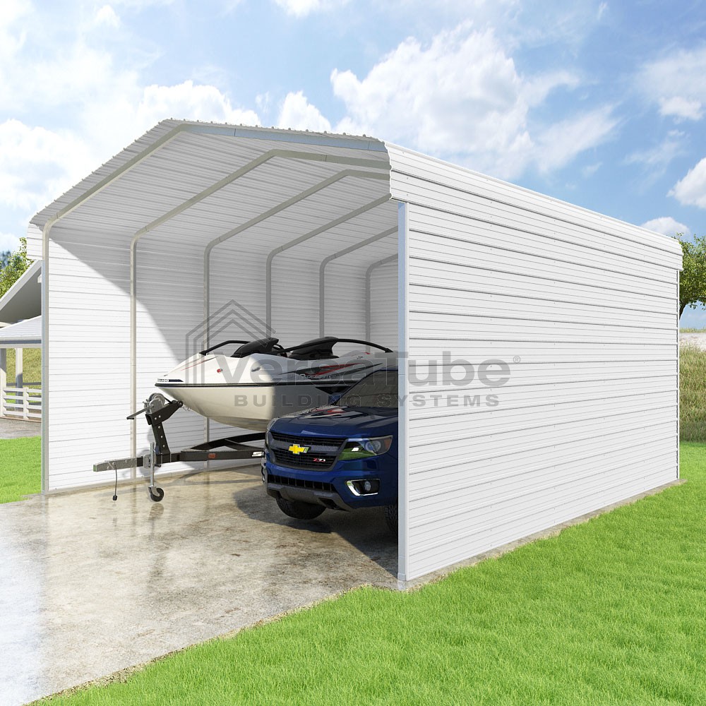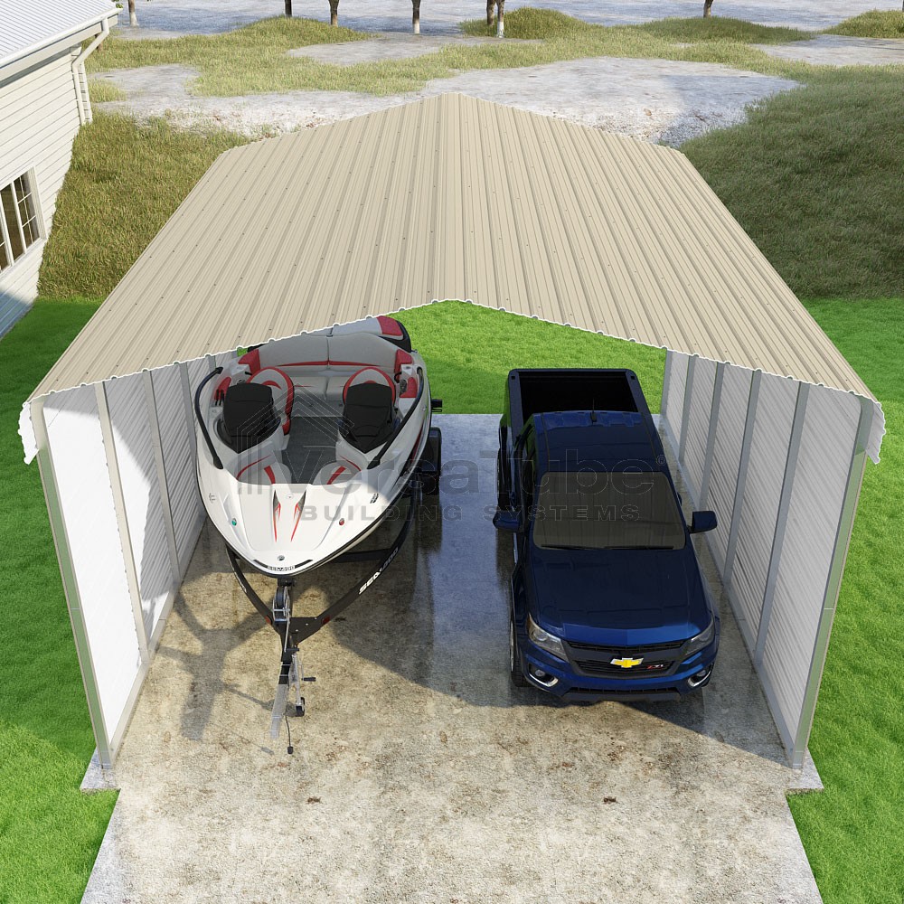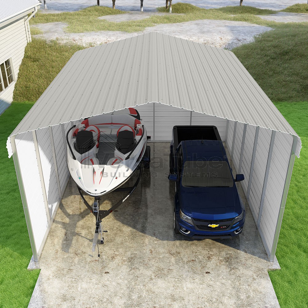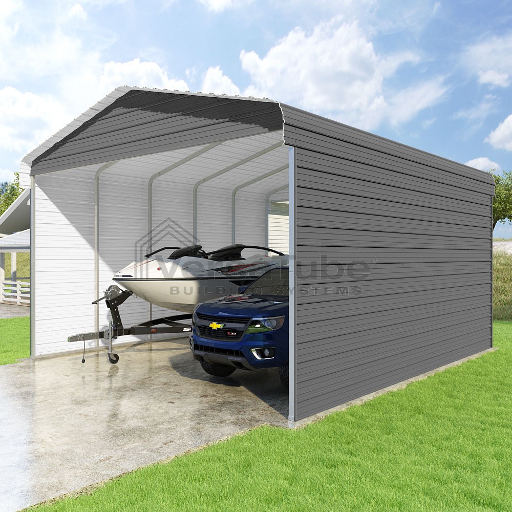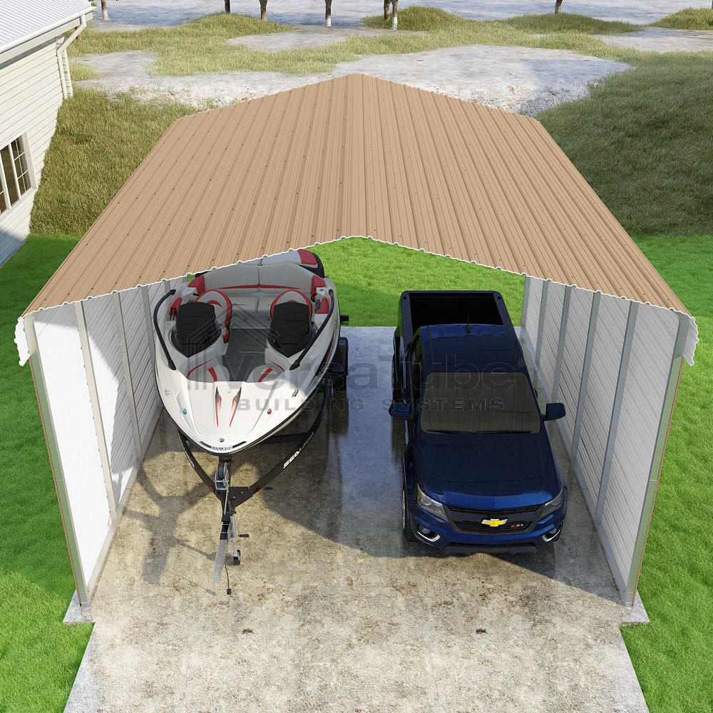 Classic Series DIY carport kit features horizontal application of sheet metal panels with the extra protection of rounded eaves.