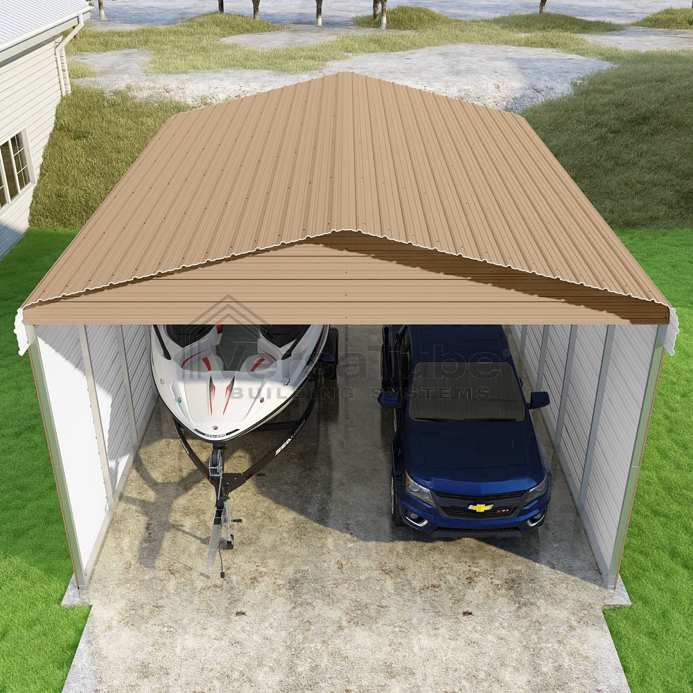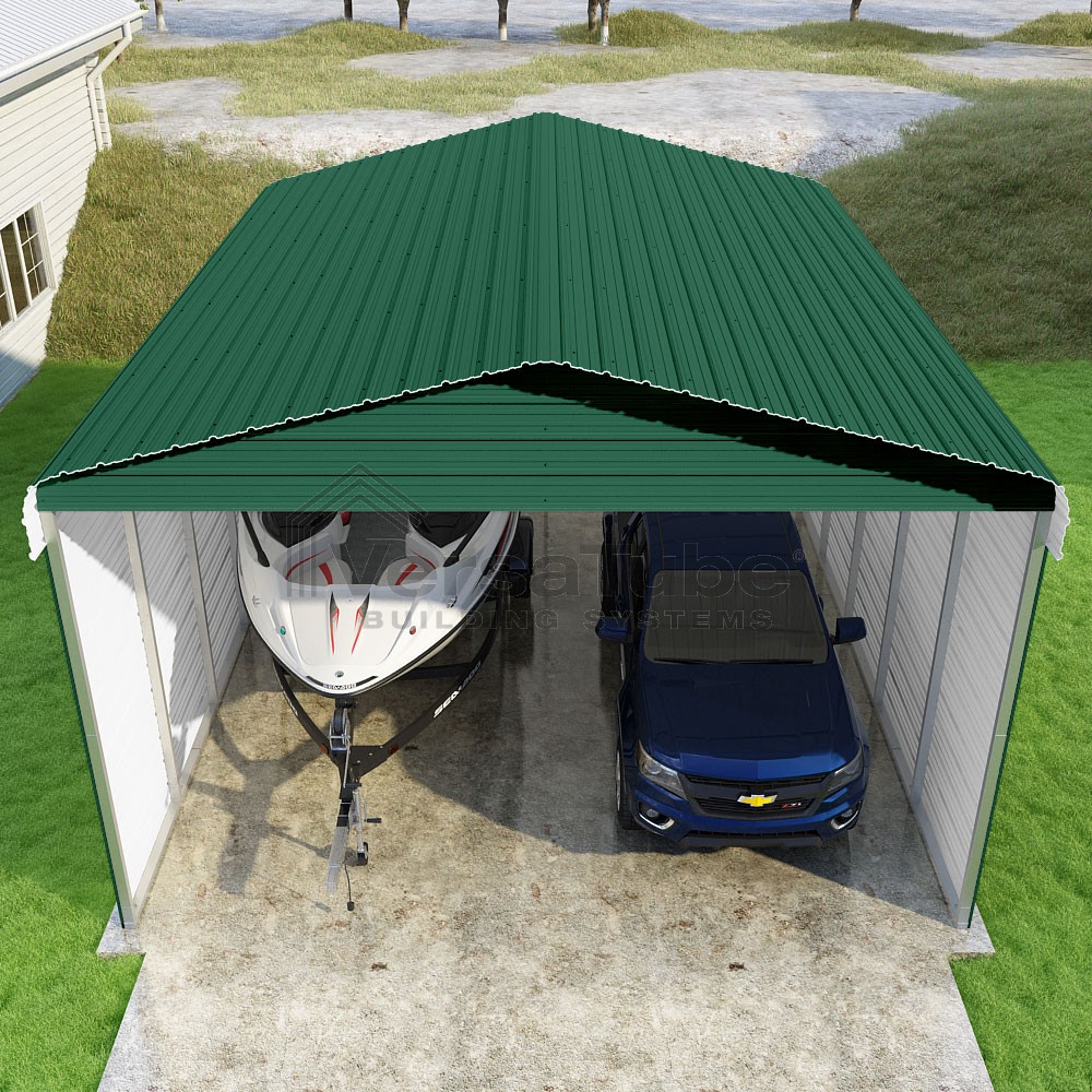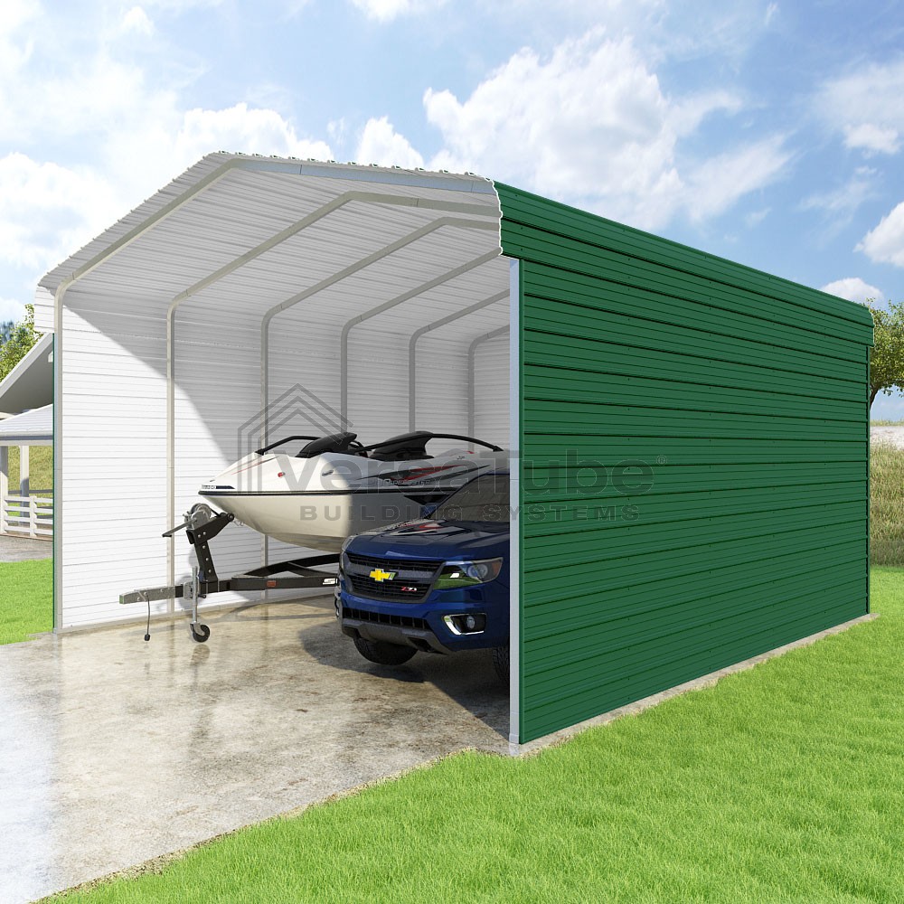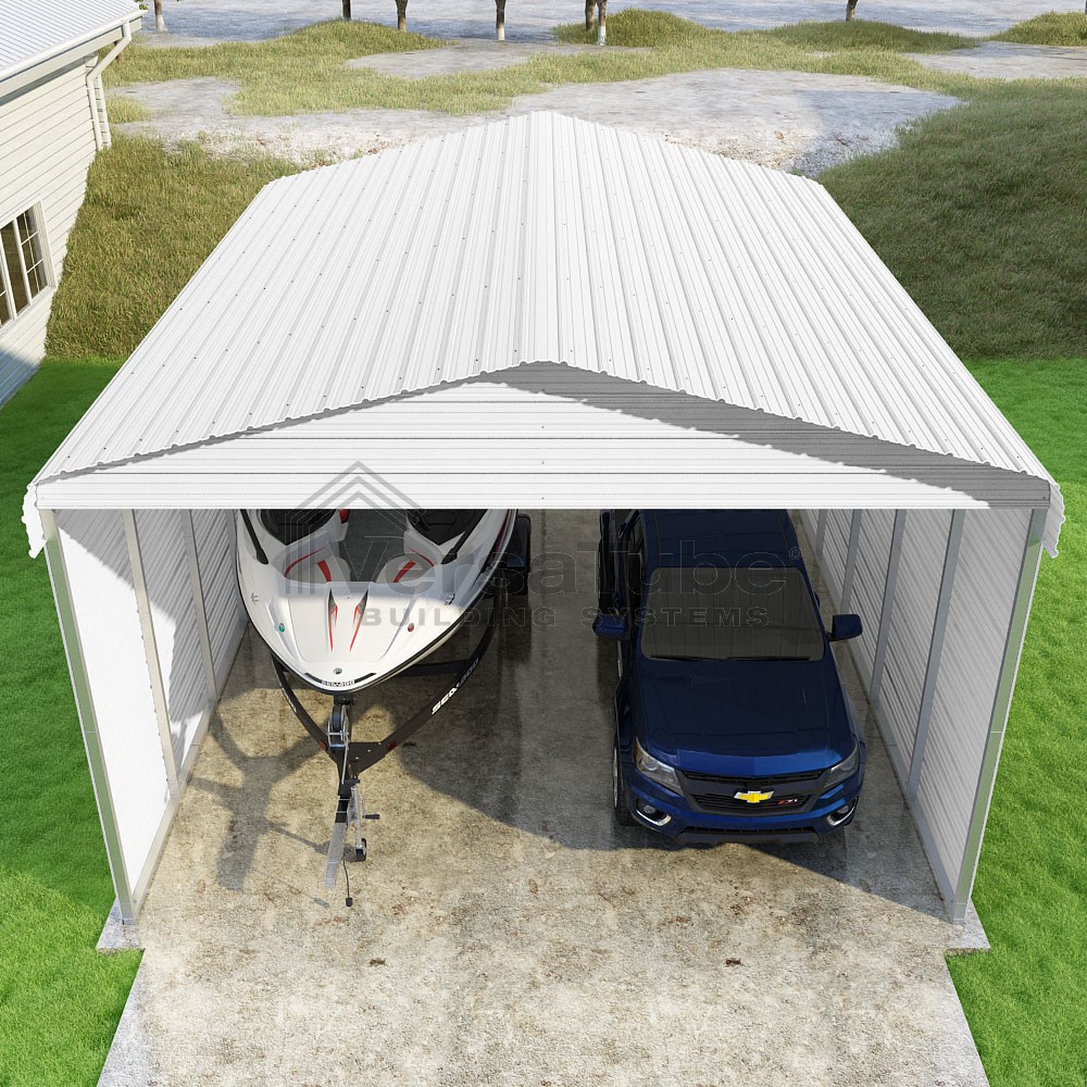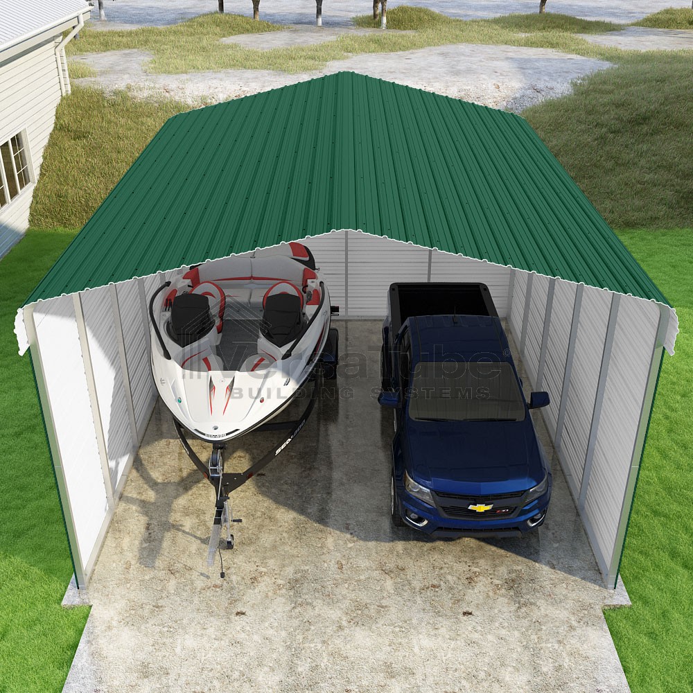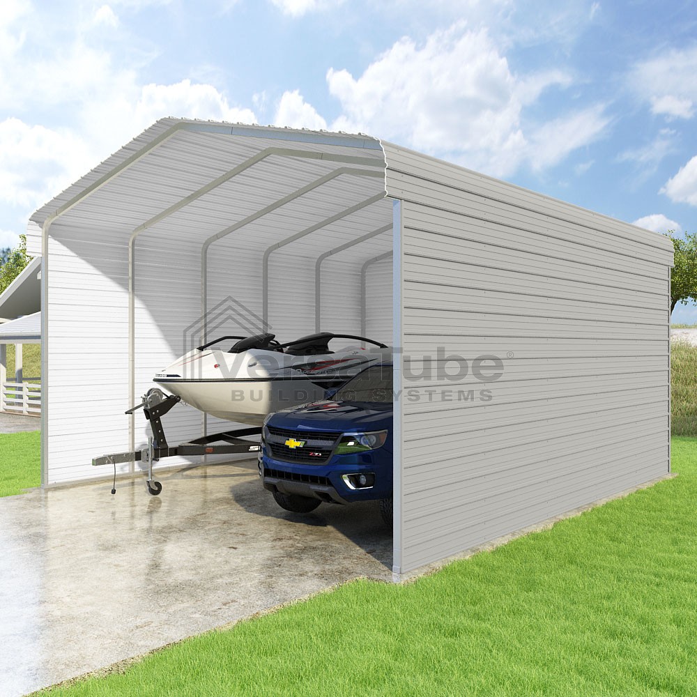 Classic Series DIY carport kit features horizontal application of sheet metal panels with the extra protection of rounded eaves.