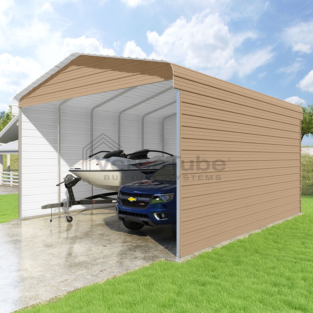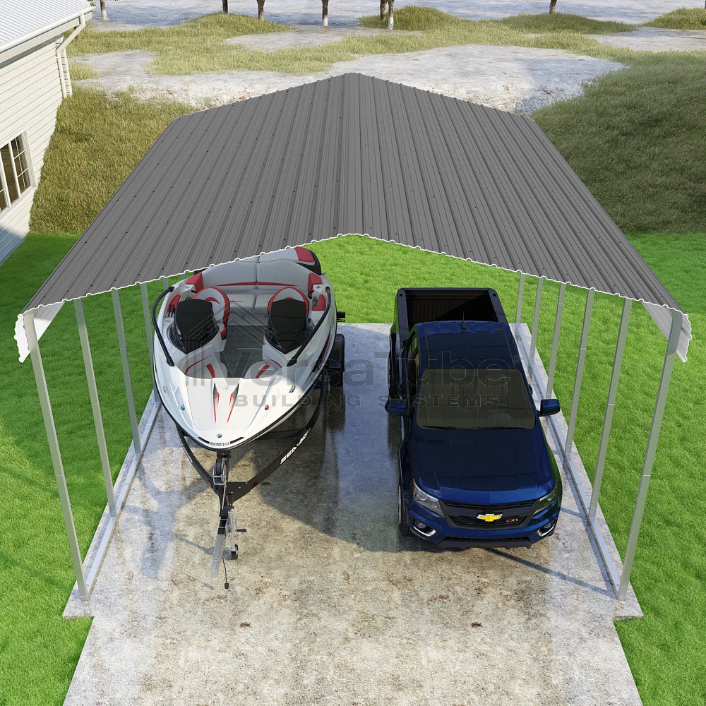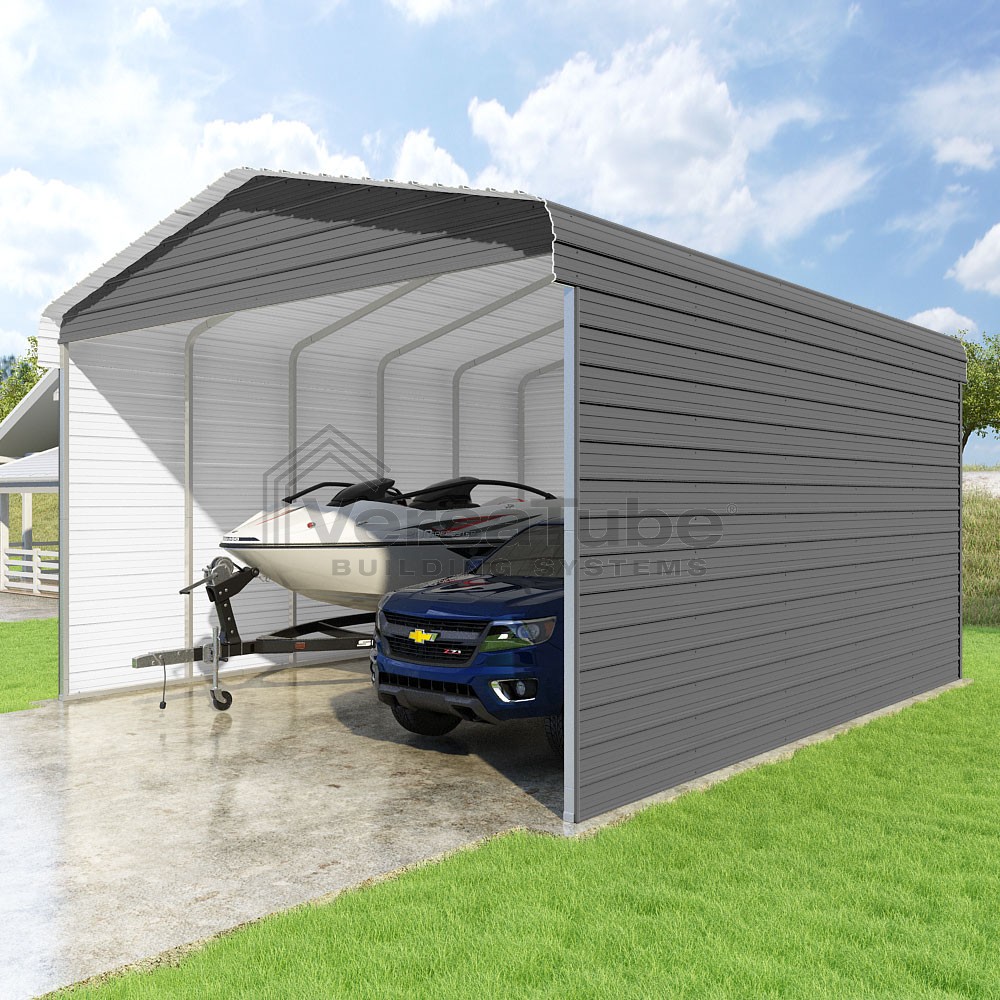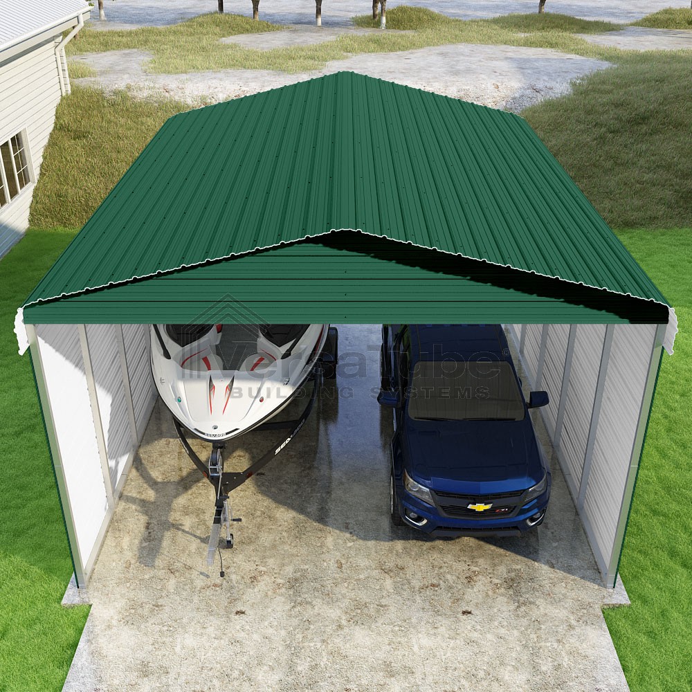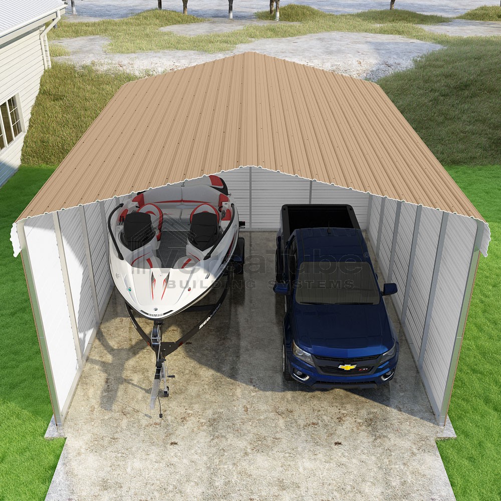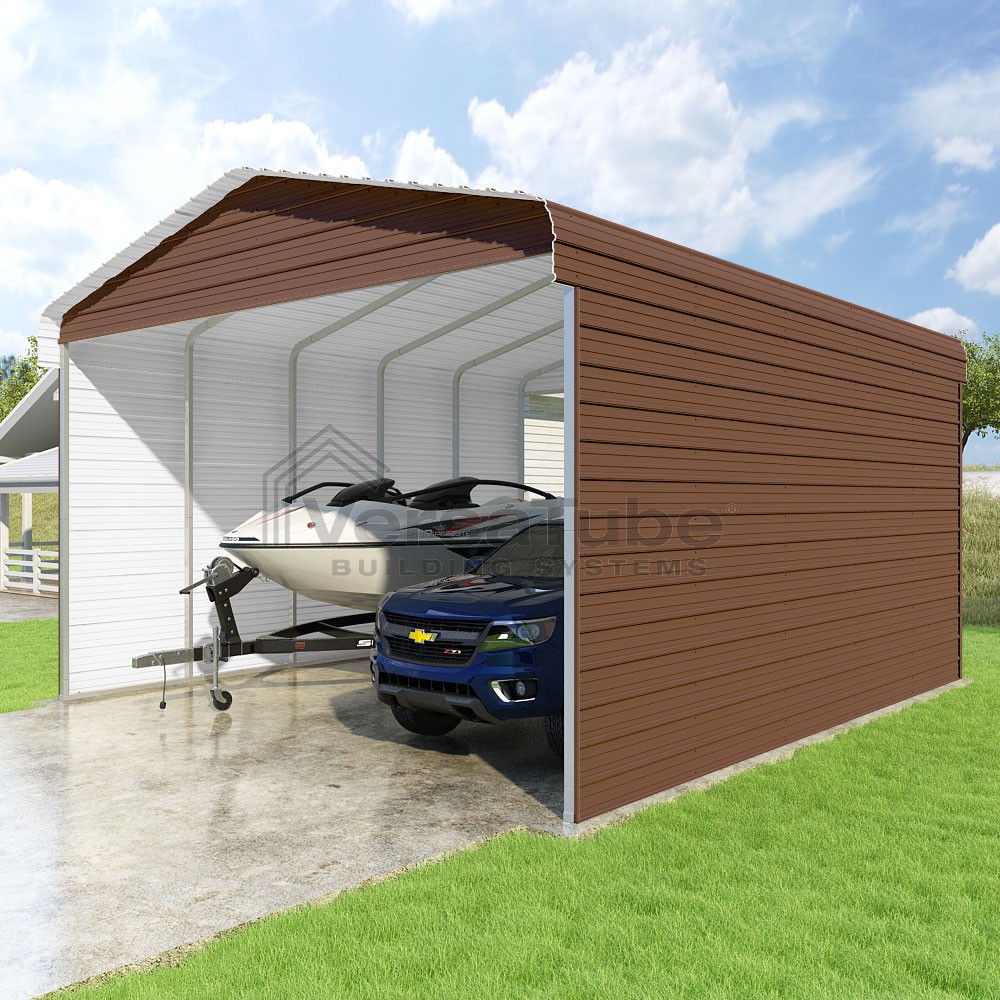 Classic Series DIY carport kit features horizontal application of sheet metal panels with the extra protection of rounded eaves.