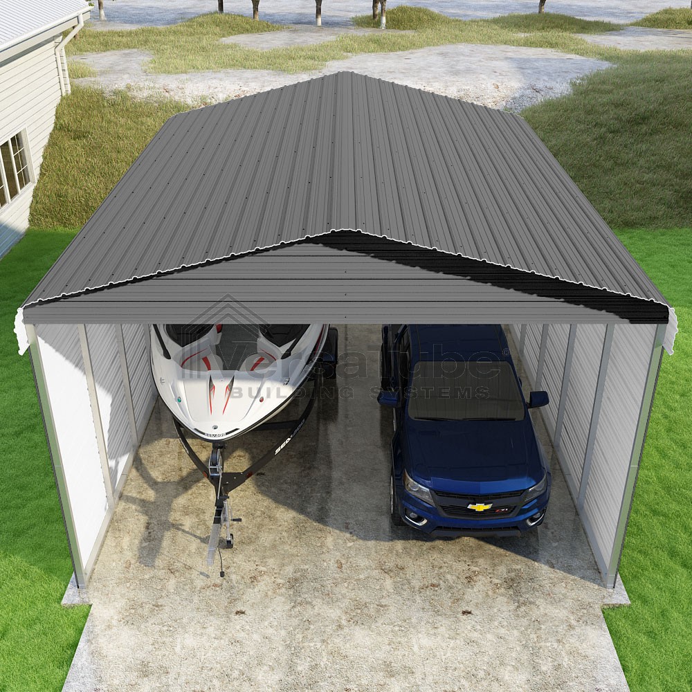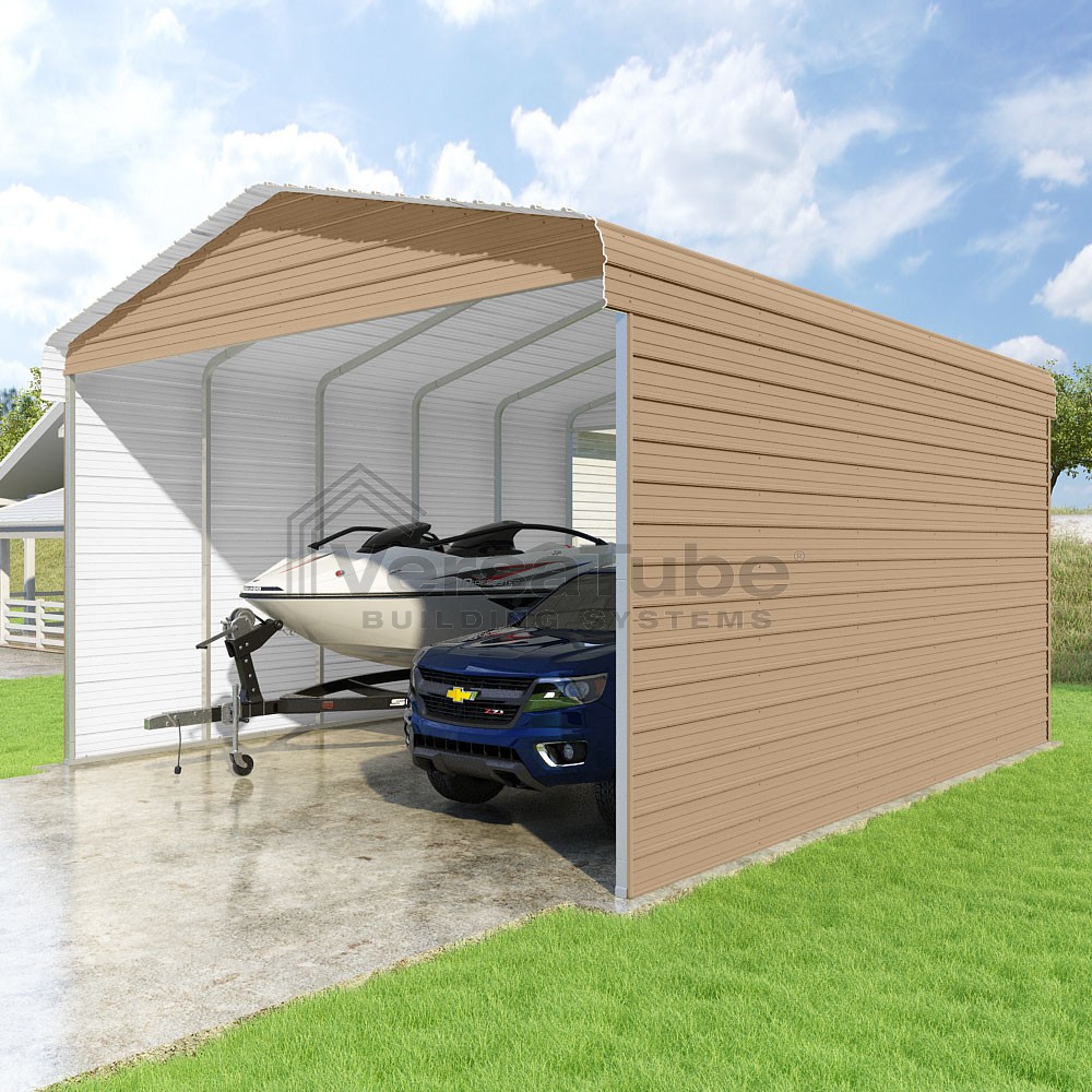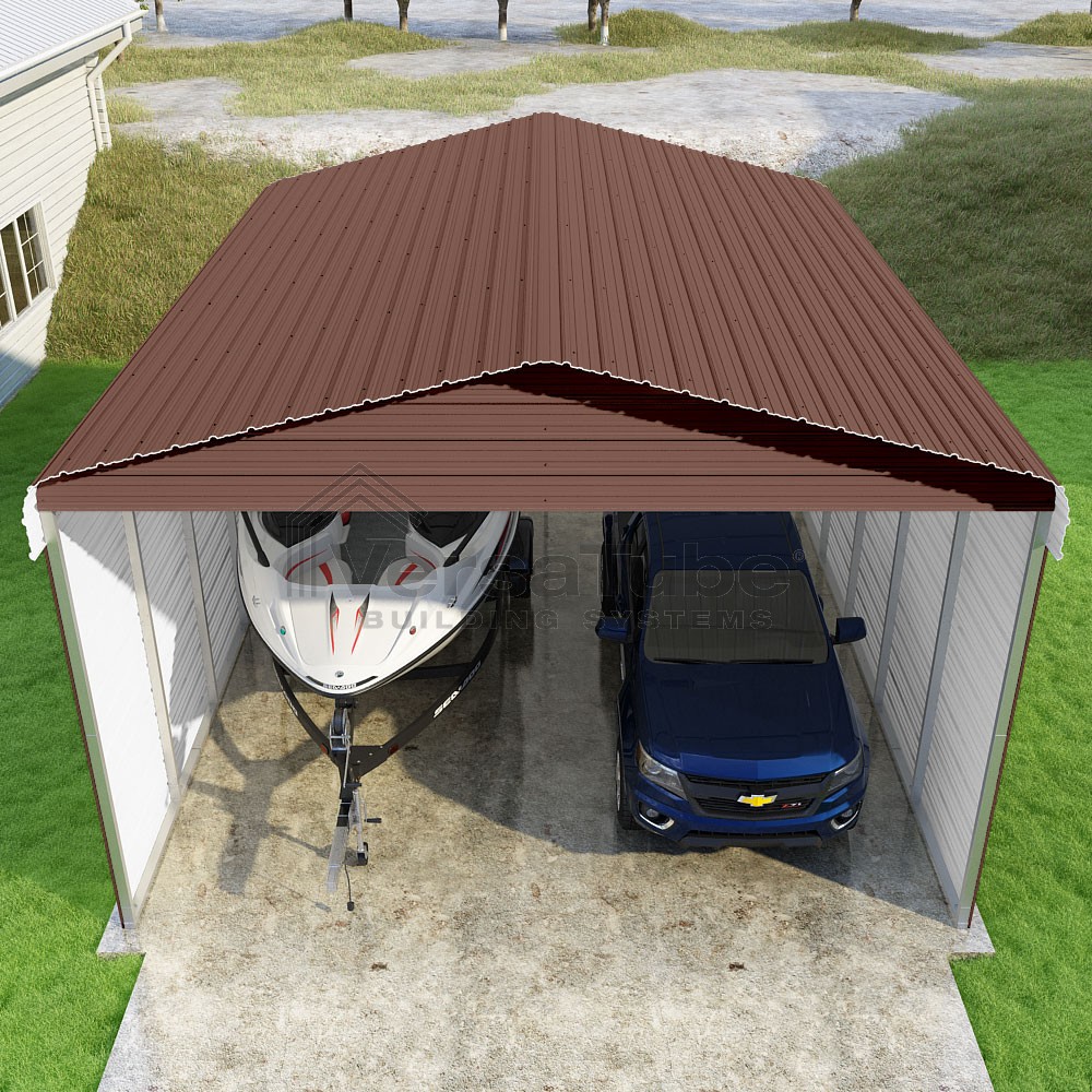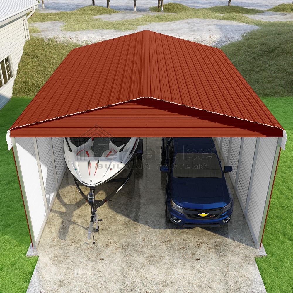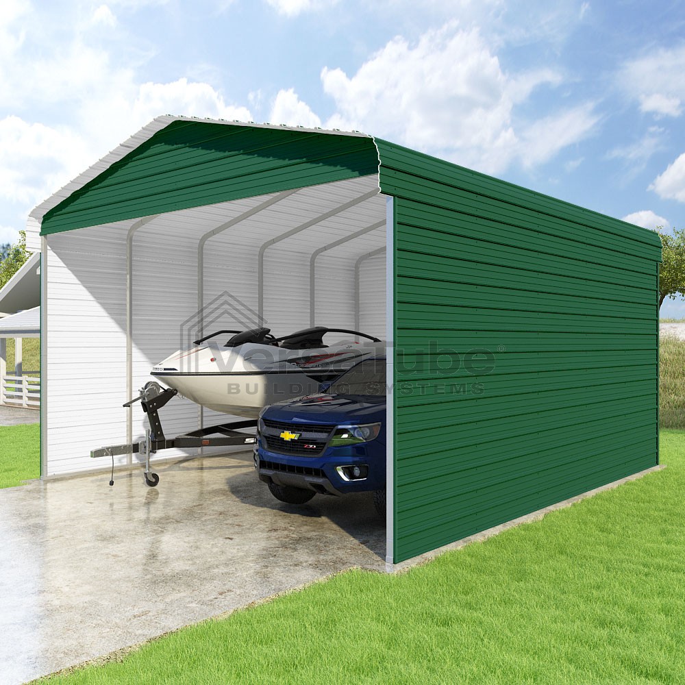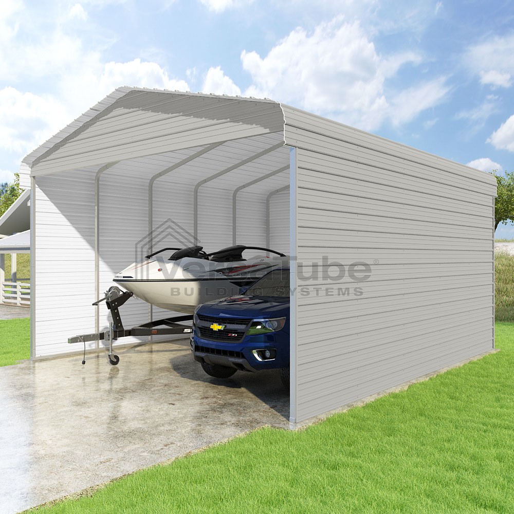 Classic Series DIY carport kit features horizontal application of sheet metal panels with the extra protection of rounded eaves.