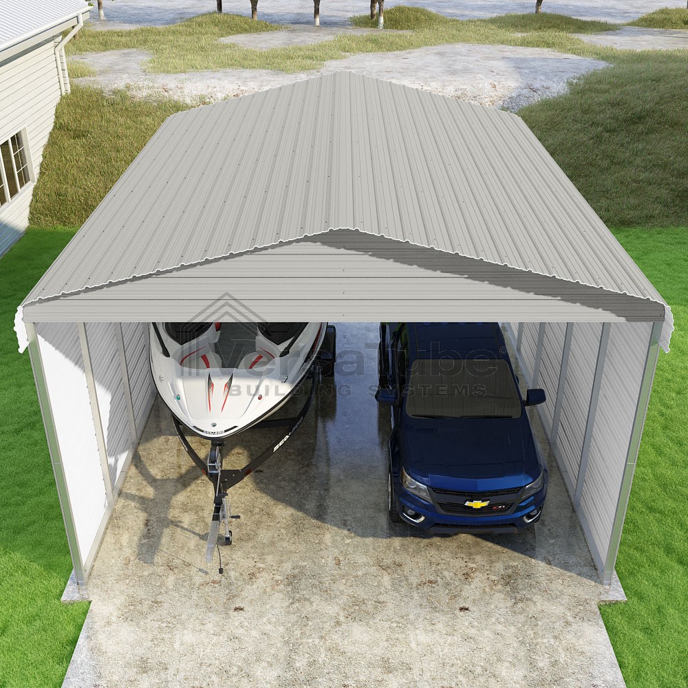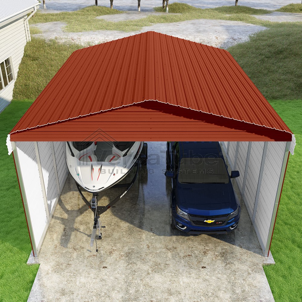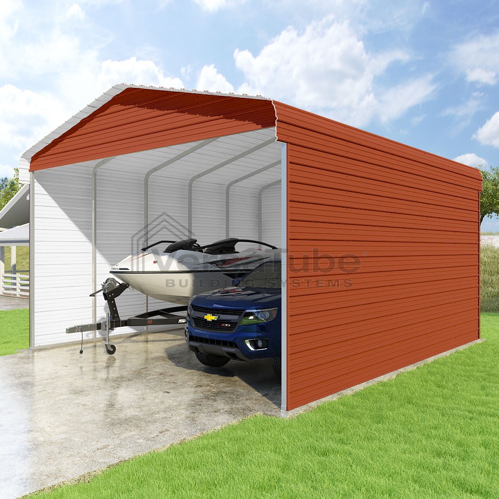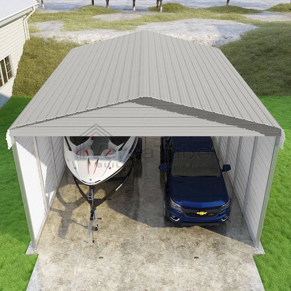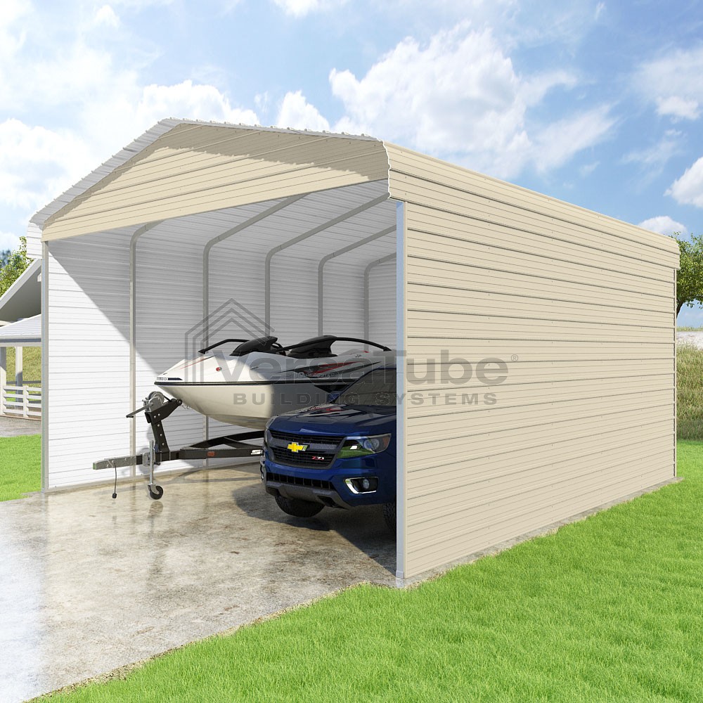 Classic Series DIY carport kit features horizontal application of sheet metal panels with the extra protection of rounded eaves.