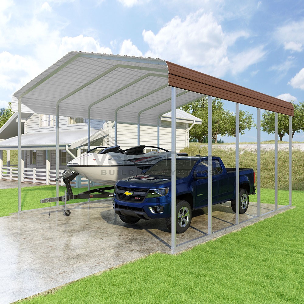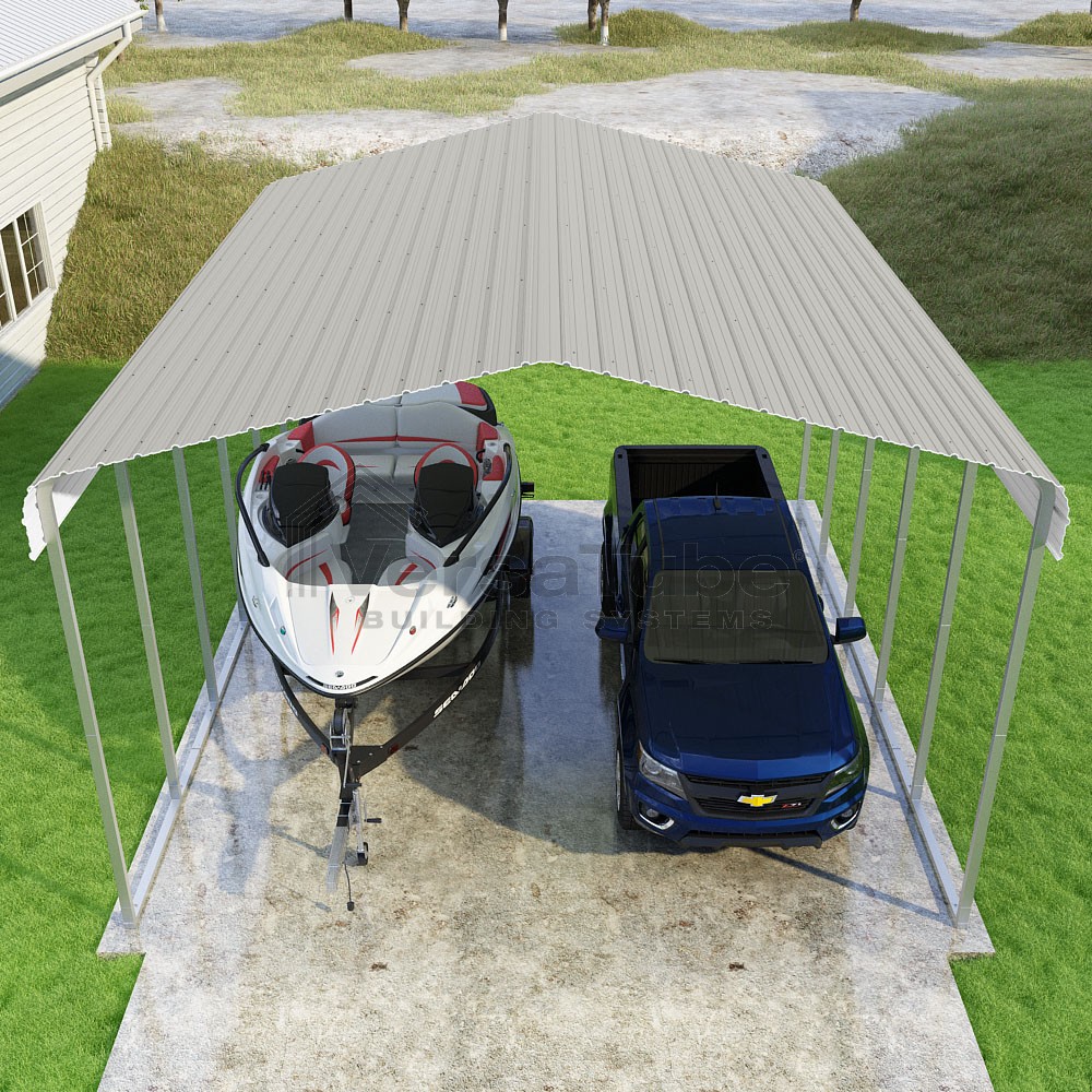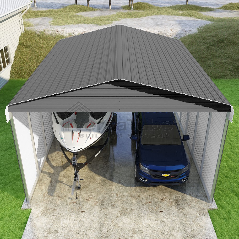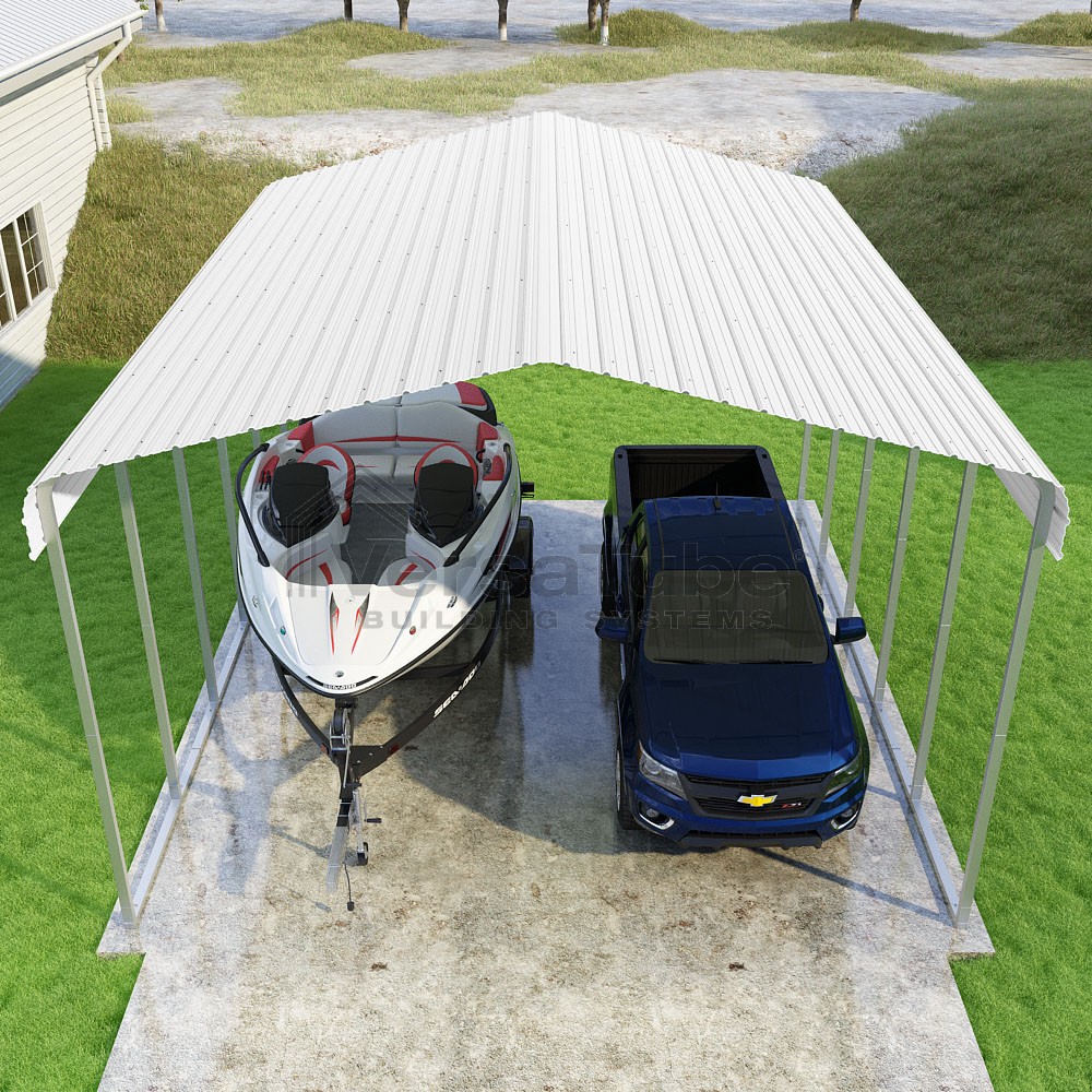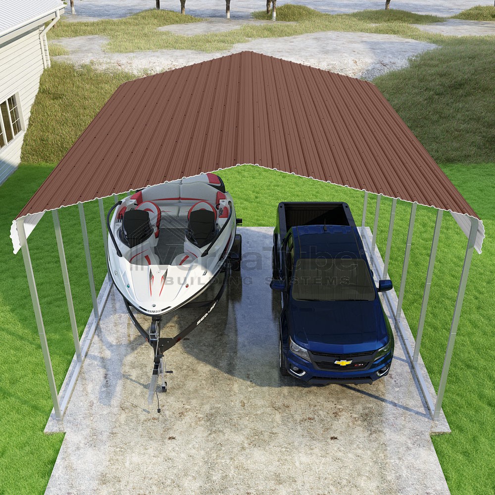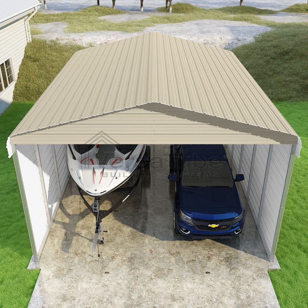 Classic Series DIY carport kit features horizontal application of sheet metal panels with the extra protection of rounded eaves.